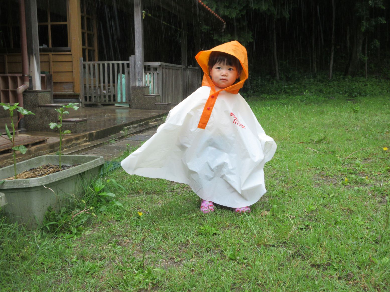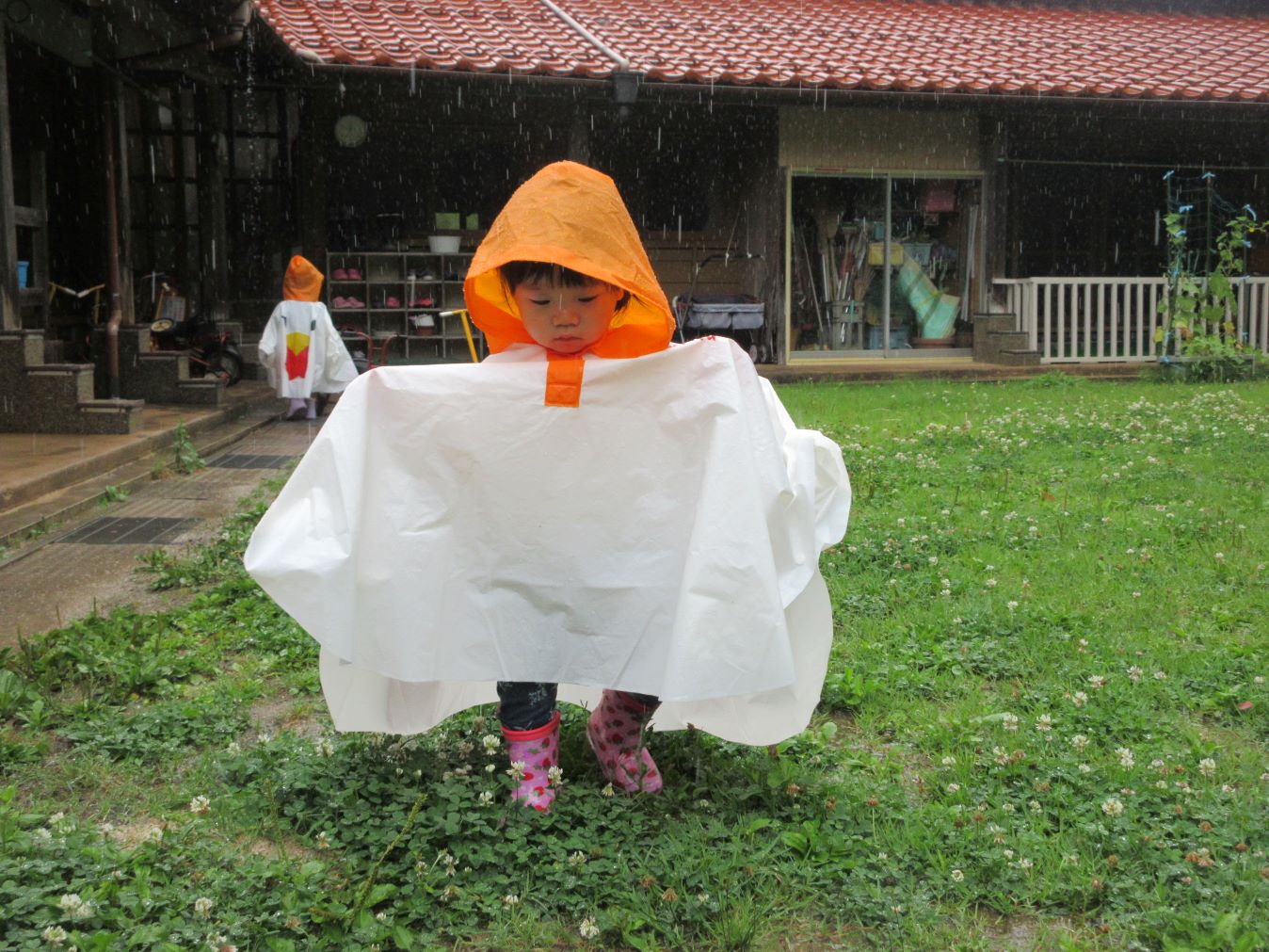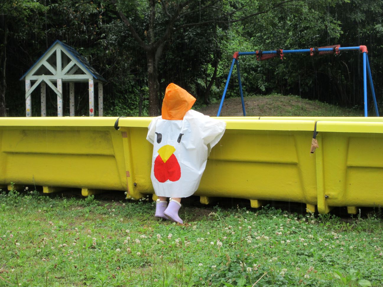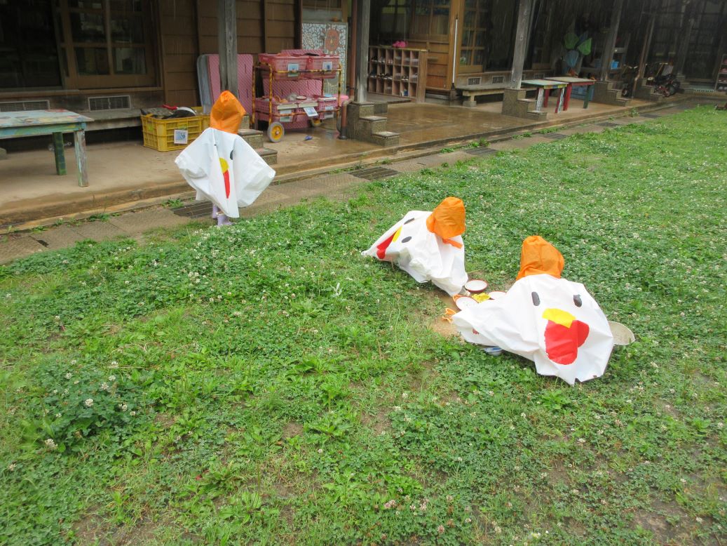 梅雨の時期も楽しもう!ということで、にわとり(ポンチョ)に変身して、雨の所庭に出かけました。