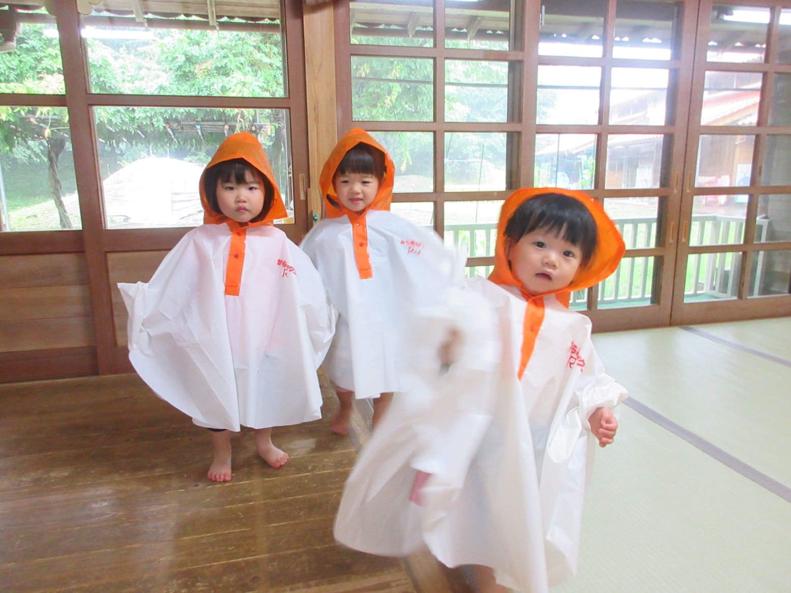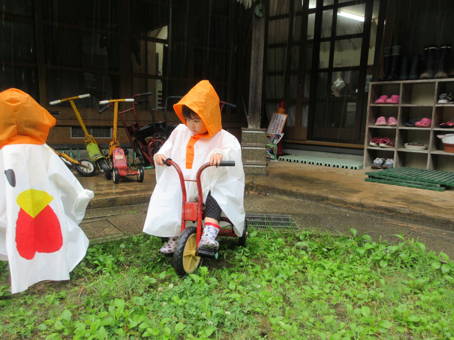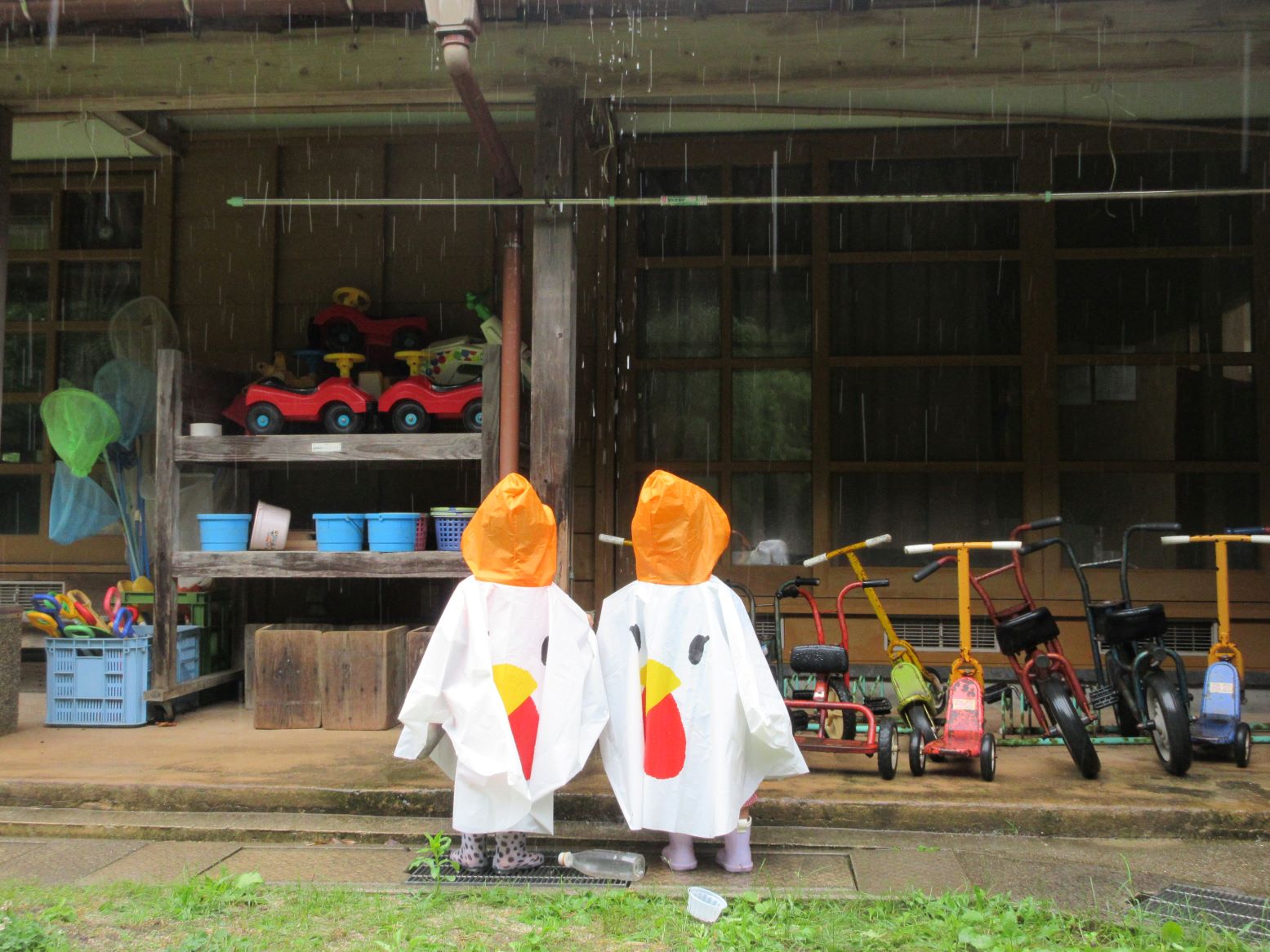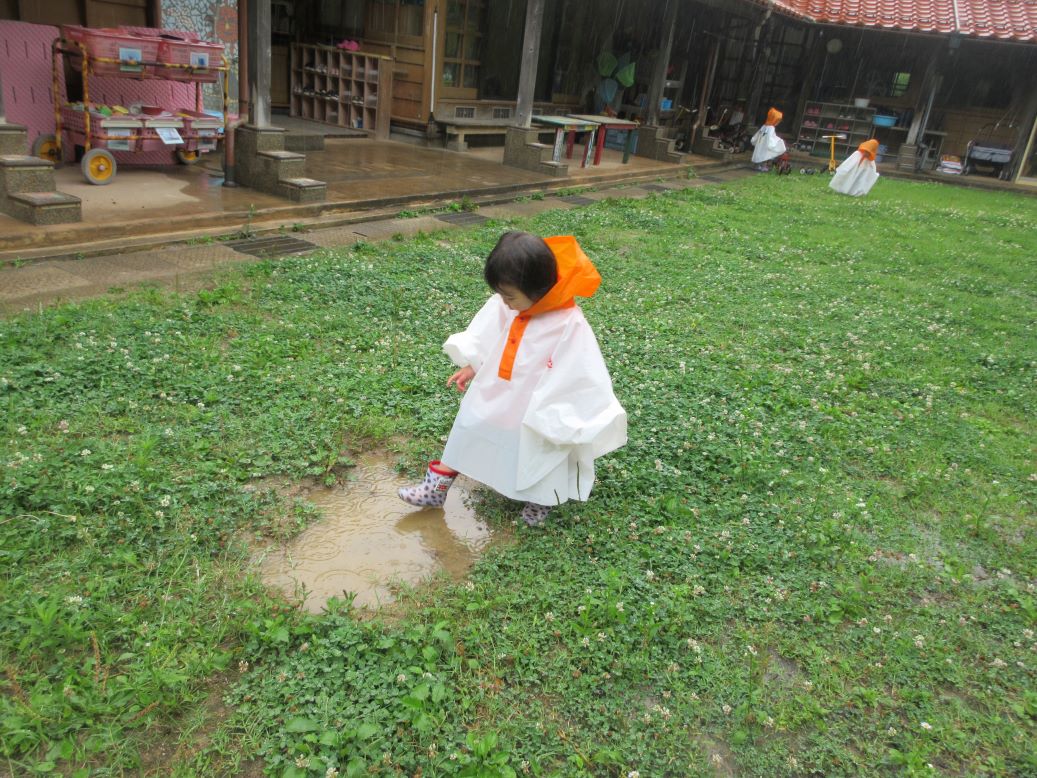梅雨の時期も楽しもう!ということで、にわとり(ポンチョ)に変身して、雨の所庭に出かけました。