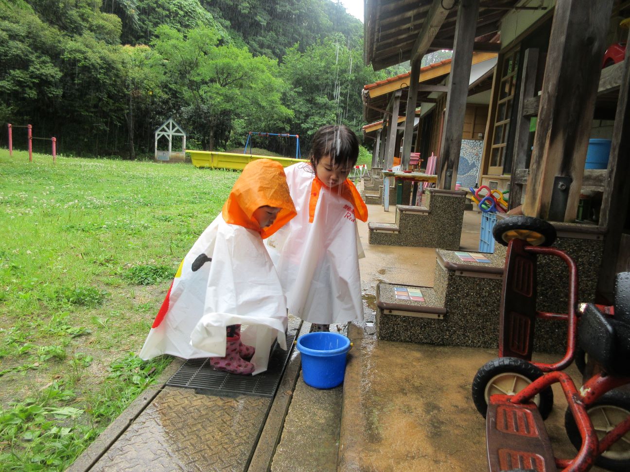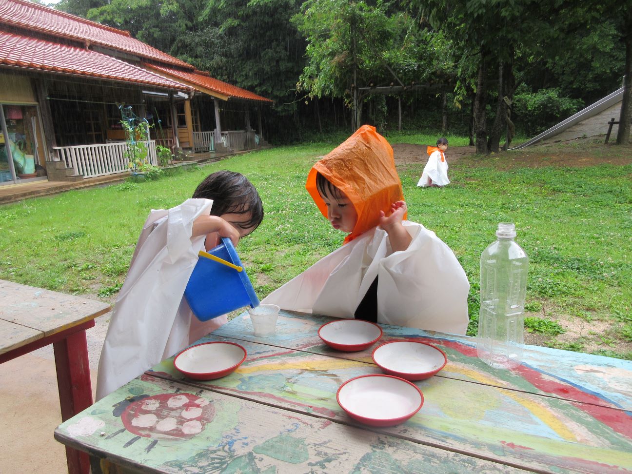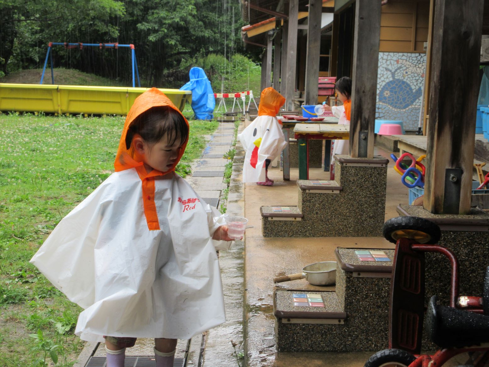 始めは雨のしぶきに体の動きが止まってしまう子どもいましたが、雨どいから流れ落ちる雨水に興味津々…。カップで受け止めておままごとをしました。
