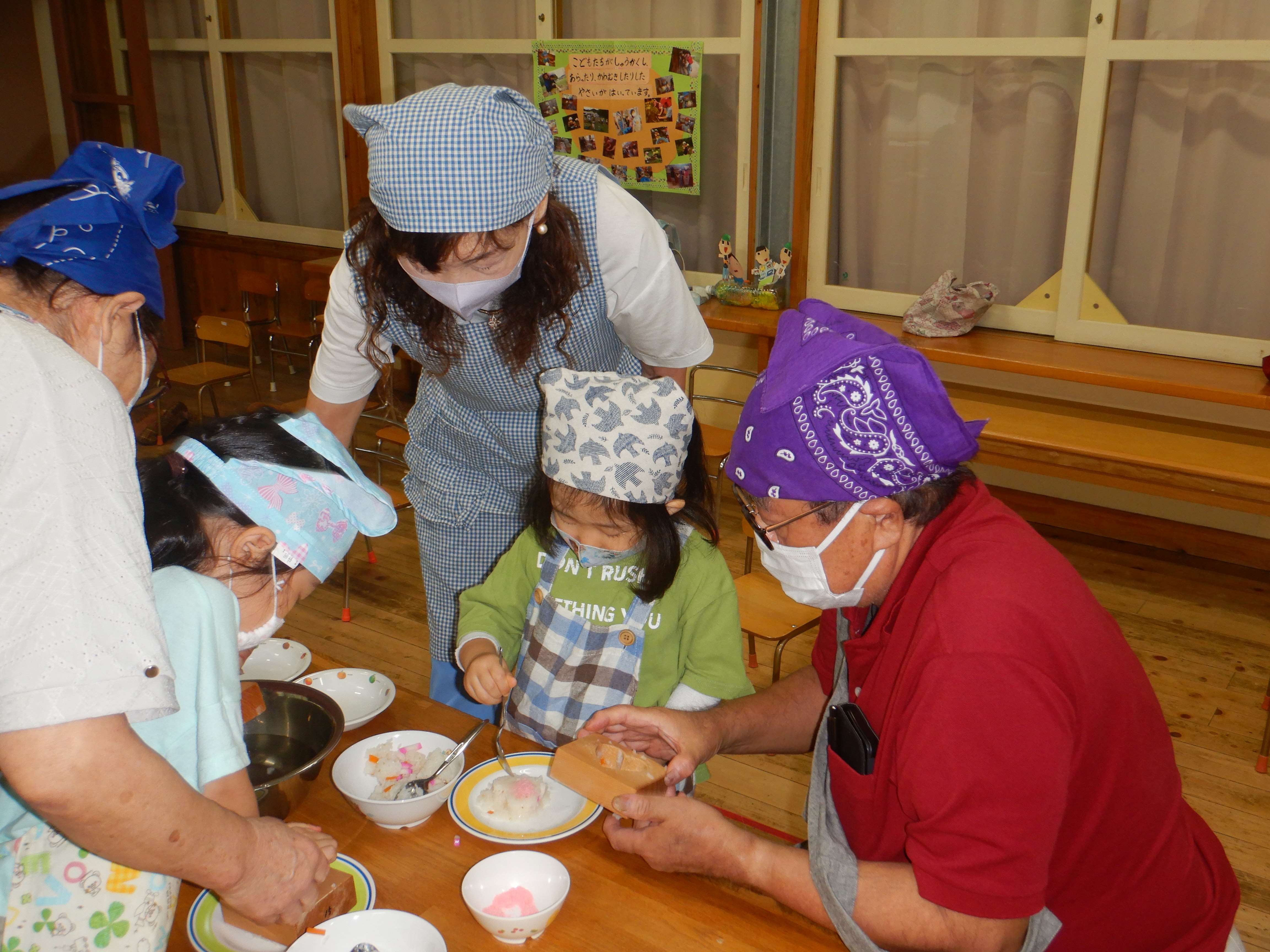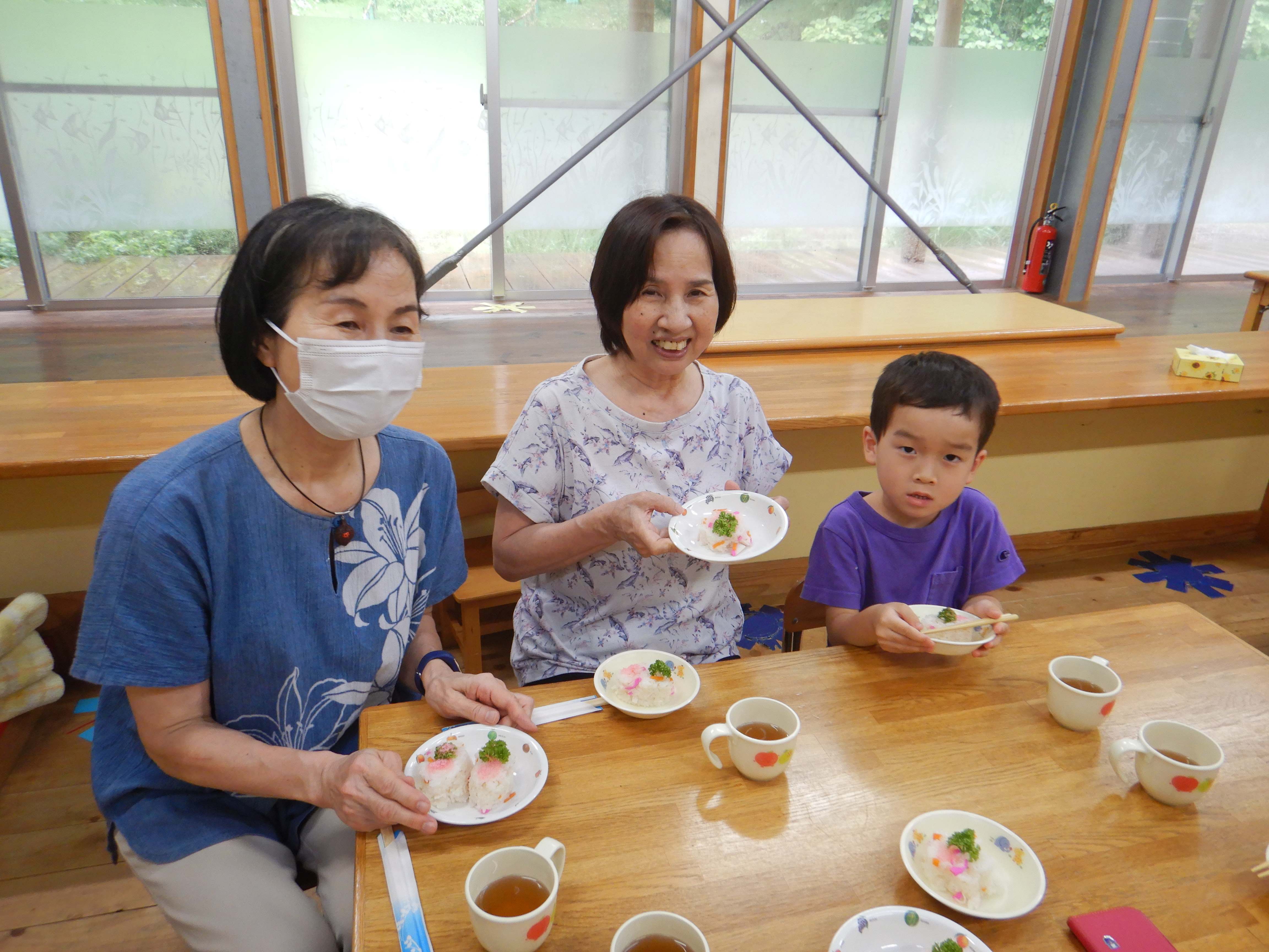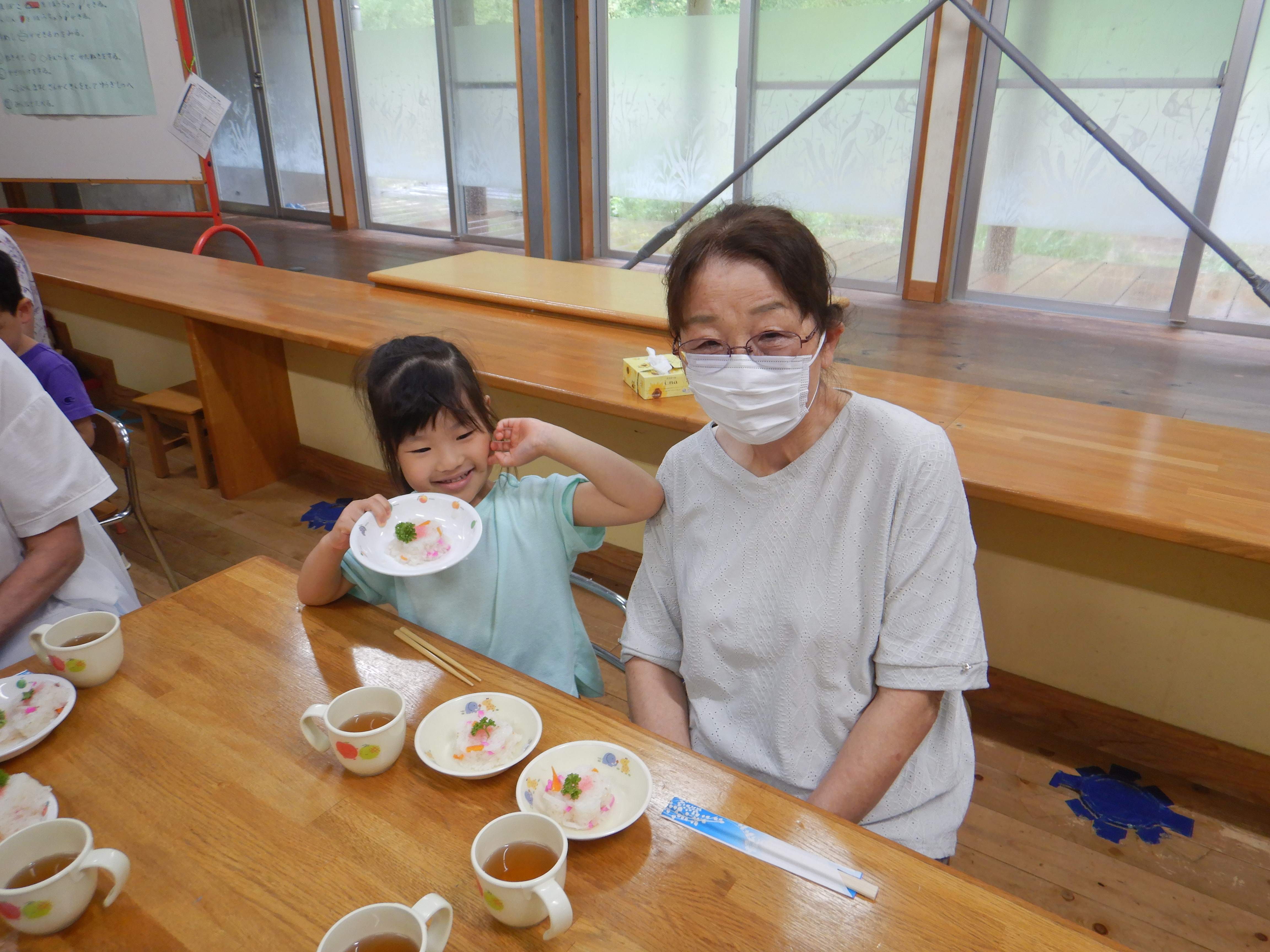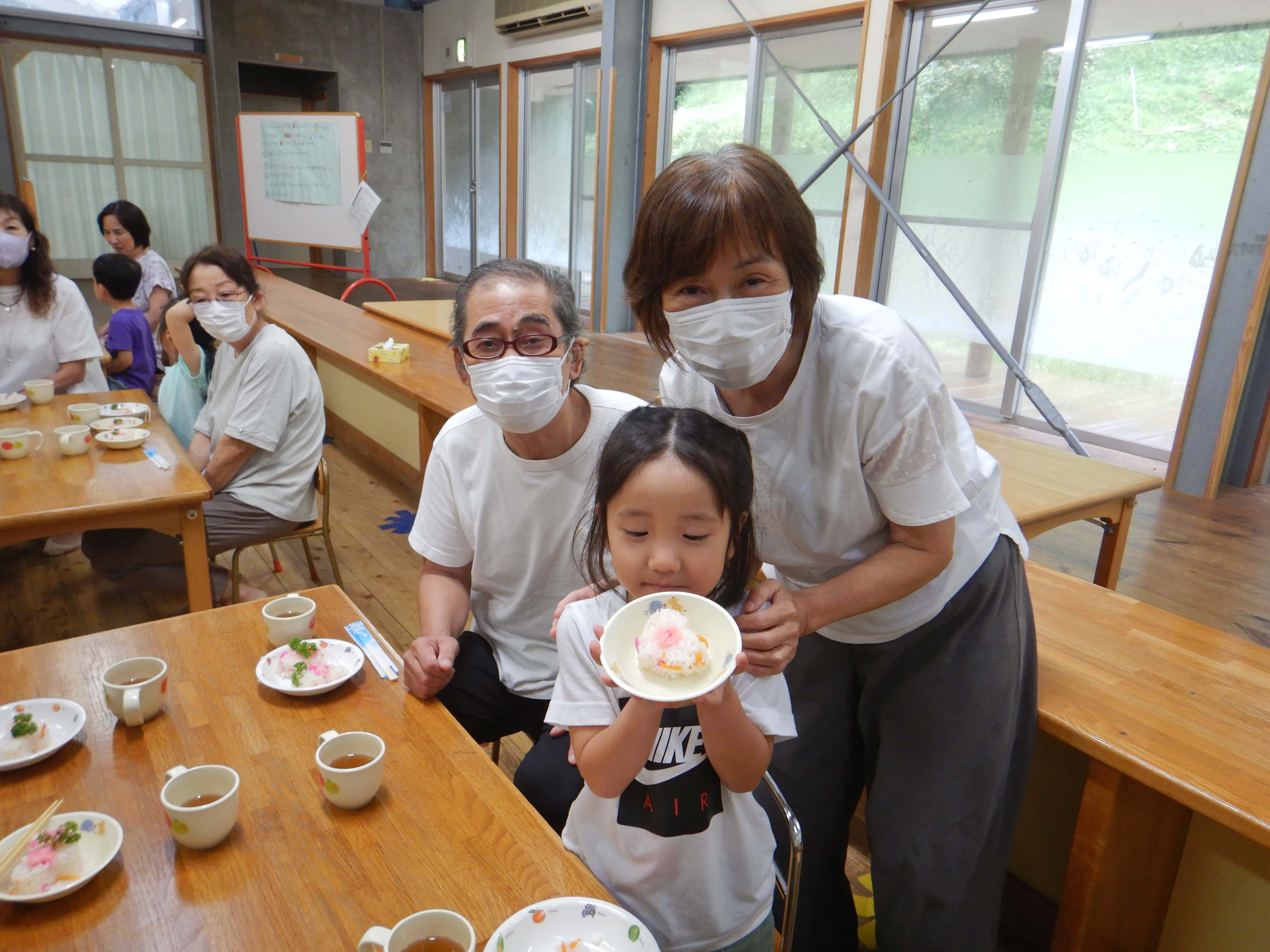 今日作るのは「花嫁寿司」野波地区の伝統食で、婚礼の際に「嬉しい事のおすそ分け」で配る、とても縁起の良い食べ物です。おじいちゃん・おばあちゃんに見守られながら包丁やピーラーを使ったり、一緒に型抜きや飾りつけをしたりし、見つめ合ってほほ笑む表情がたくさん見られました。みんなでテーブルを囲んで食べると、あちこちで楽しいおしゃべりも聞こえ、嬉しそうにできたての花嫁寿司を頬張っていました。ミニミニ発表会では、季節の歌や、サマーフェスティバルでも披露した竹太鼓を見てもらい、「かっこよかったよ」「じょうずだったね」と声をかけてもらっていました。少しの時間でしたが、楽しいひと時となりました。
