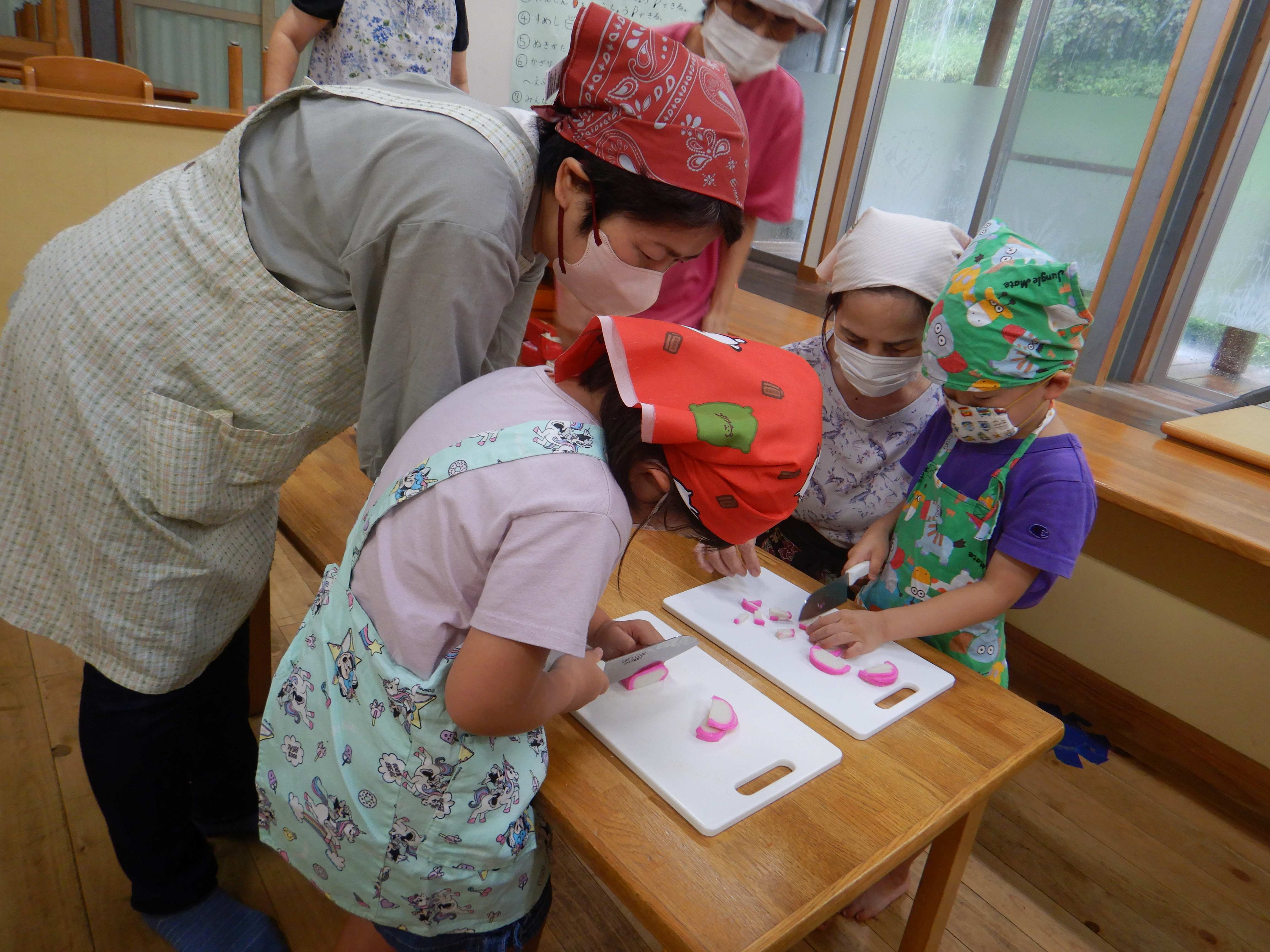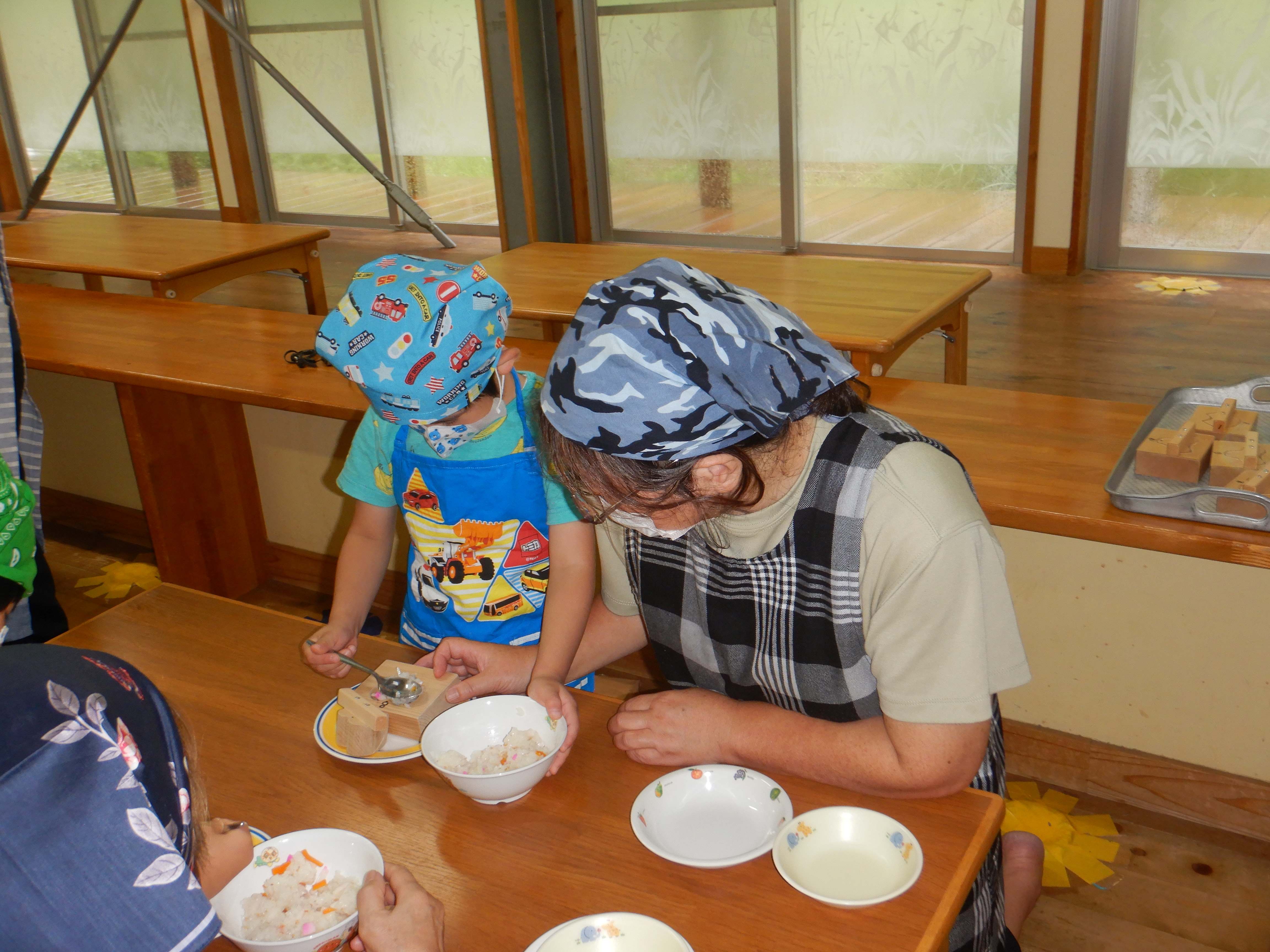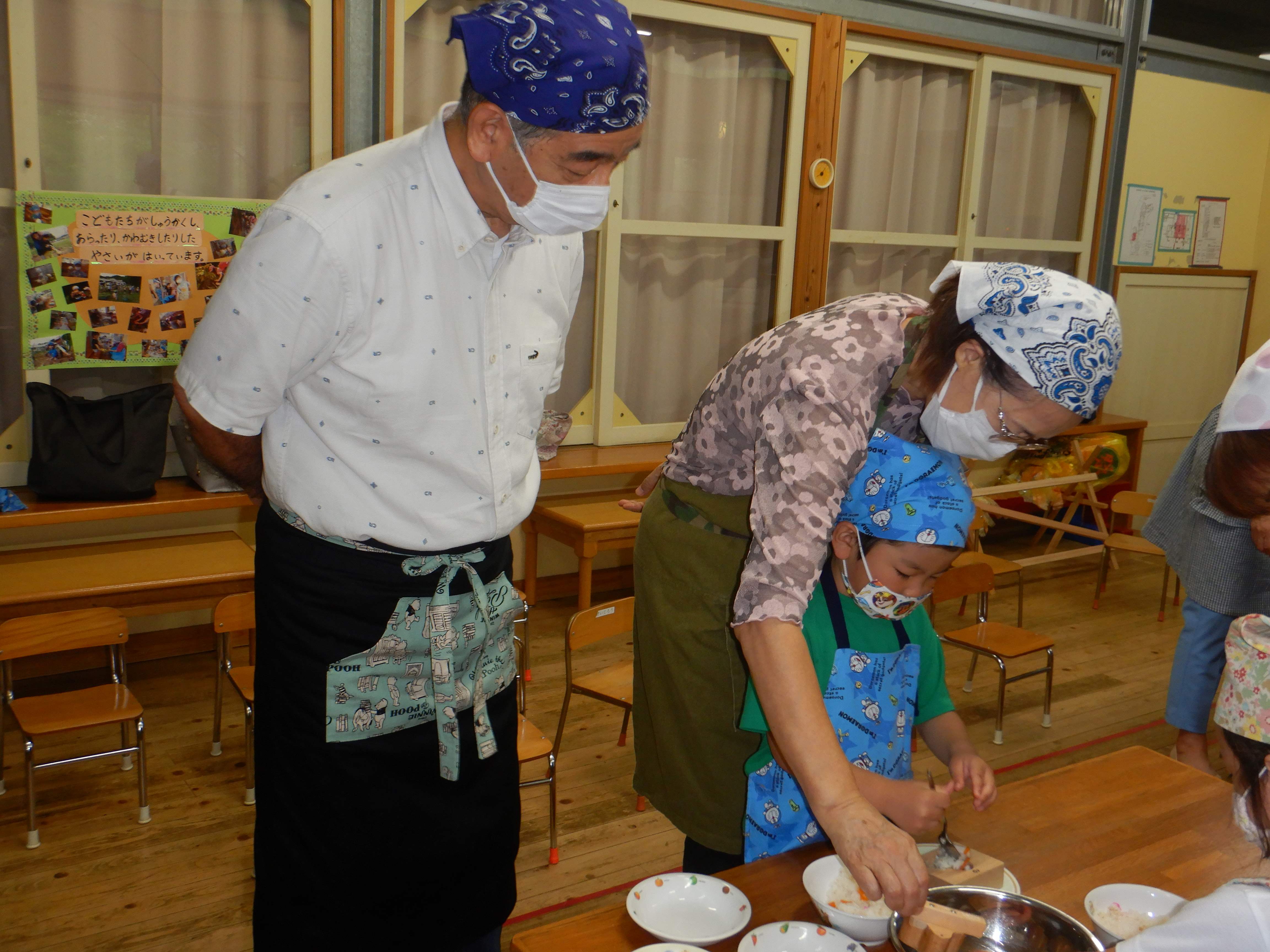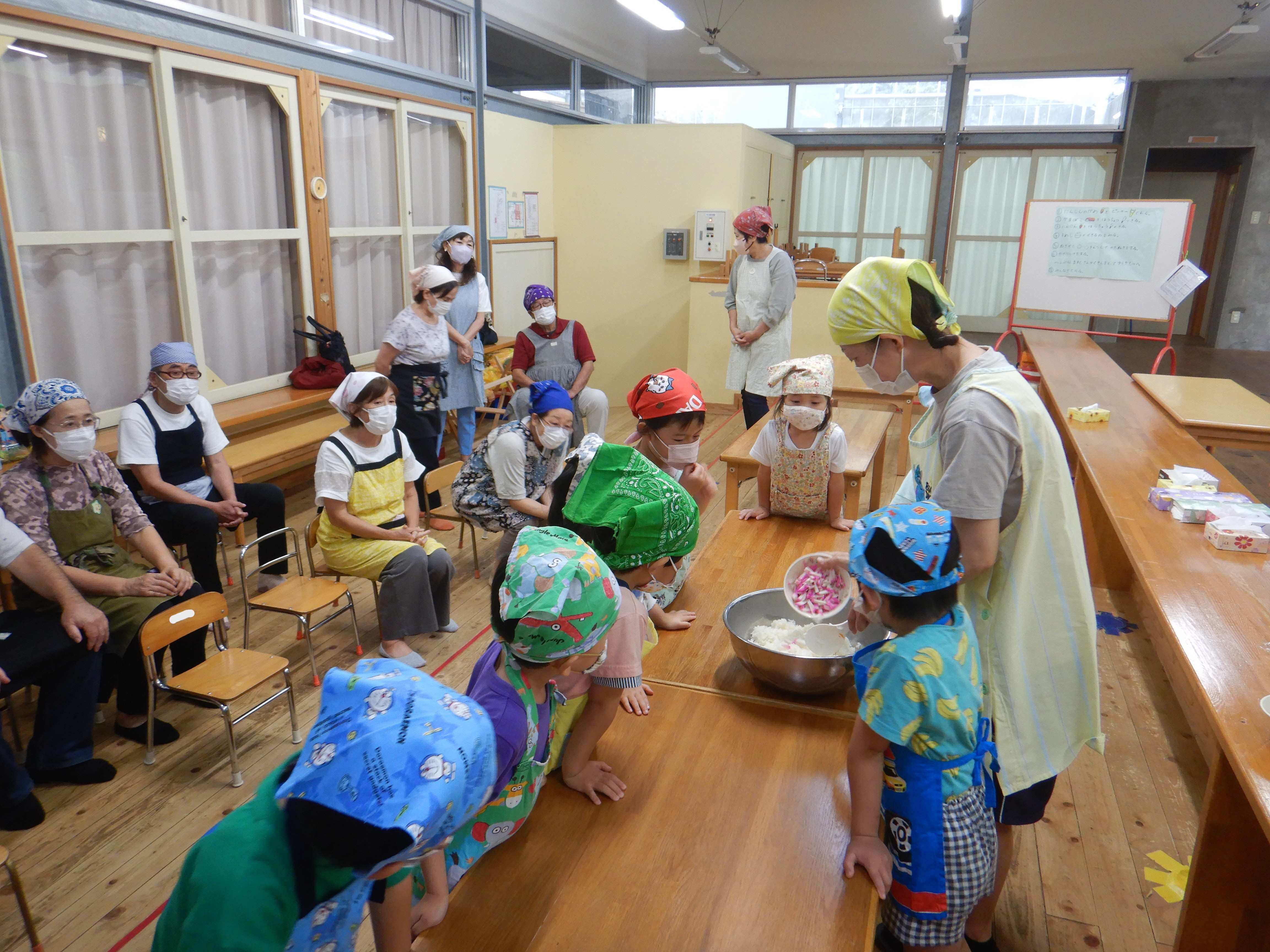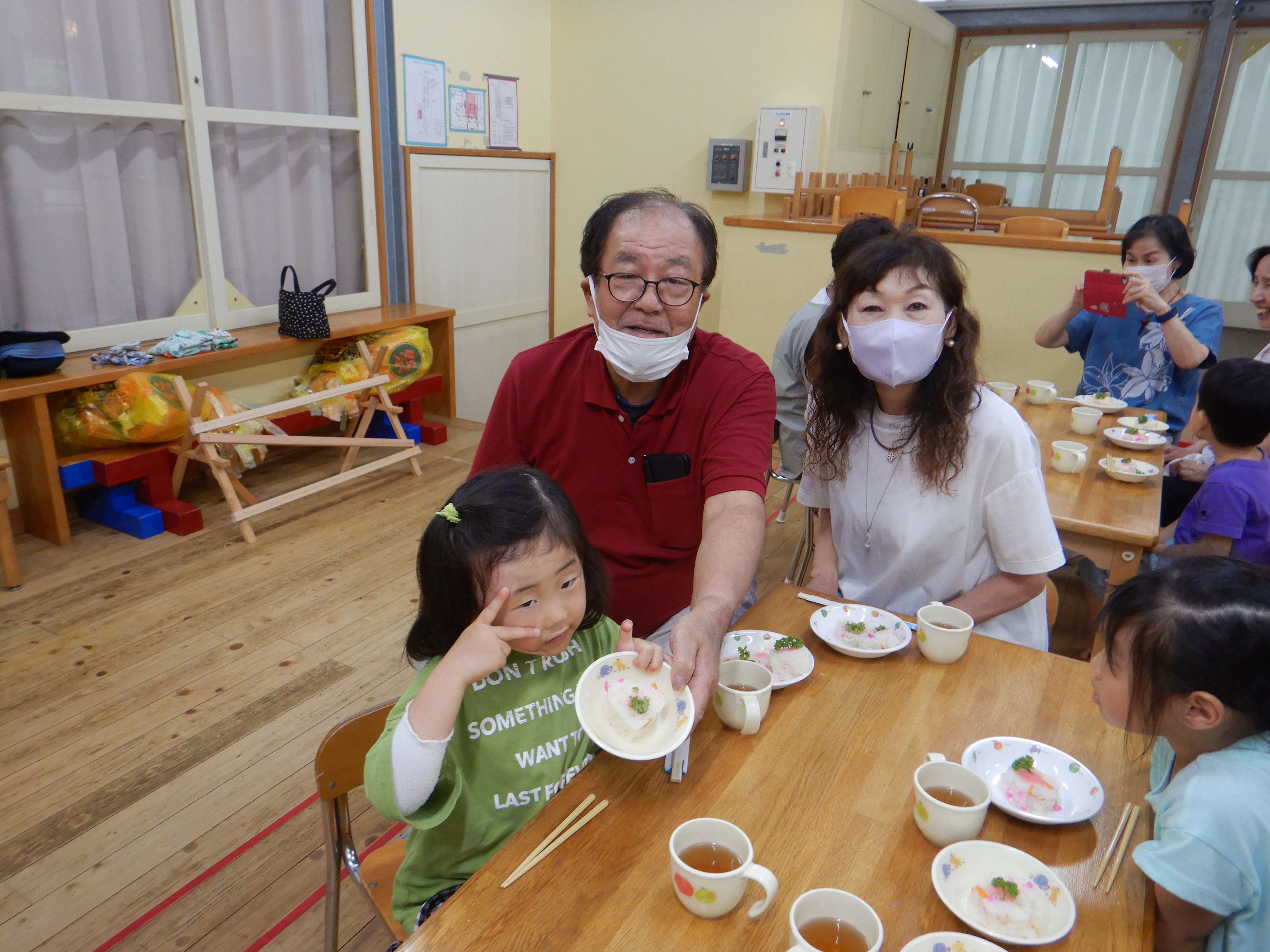 今日作るのは「花嫁寿司」野波地区の伝統食で、婚礼の際に「嬉しい事のおすそ分け」で配る、とても縁起の良い食べ物です。おじいちゃん・おばあちゃんに見守られながら包丁やピーラーを使ったり、一緒に型抜きや飾りつけをしたりし、見つめ合ってほほ笑む表情がたくさん見られました。みんなでテーブルを囲んで食べると、あちこちで楽しいおしゃべりも聞こえ、嬉しそうにできたての花嫁寿司を頬張っていました。ミニミニ発表会では、季節の歌や、サマーフェスティバルでも披露した竹太鼓を見てもらい、「かっこよかったよ」「じょうずだったね」と声をかけてもらっていました。少しの時間でしたが、楽しいひと時となりました。