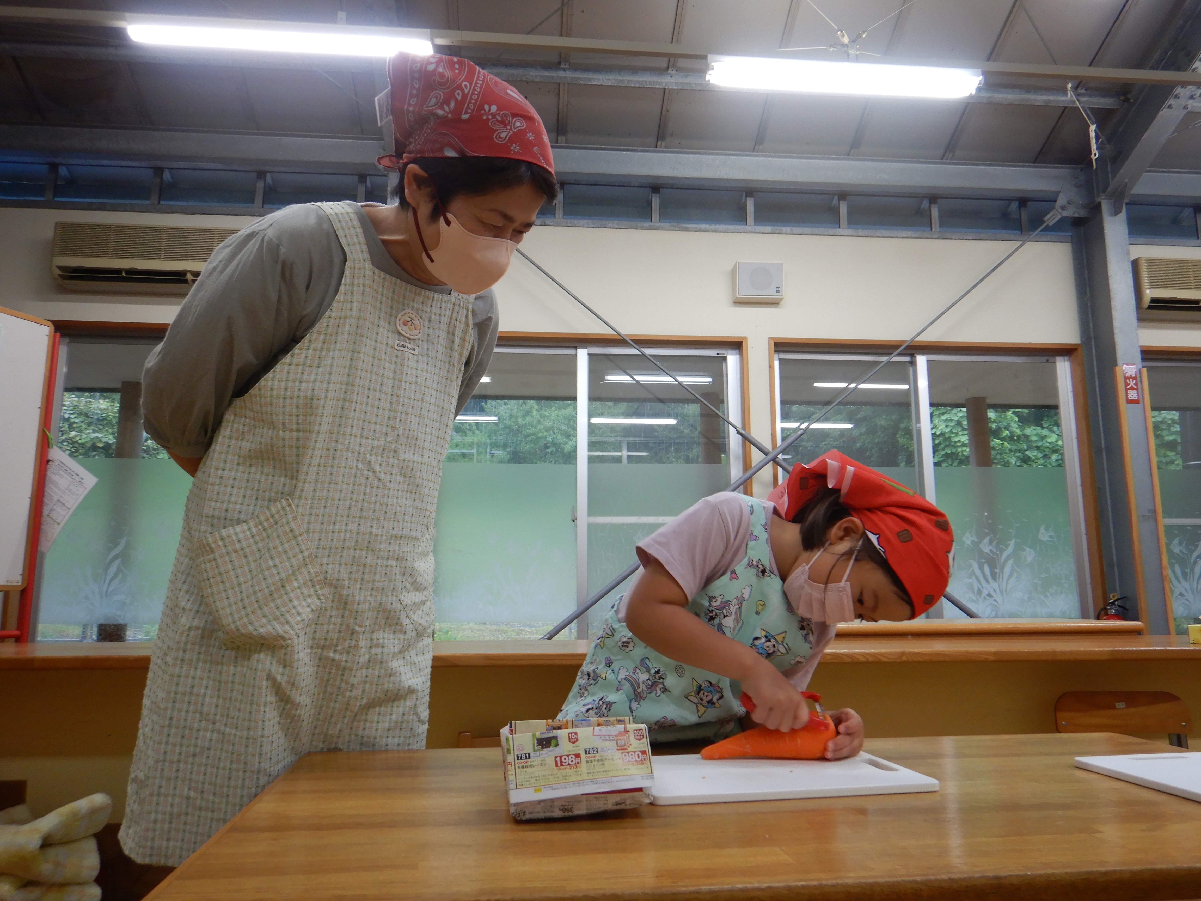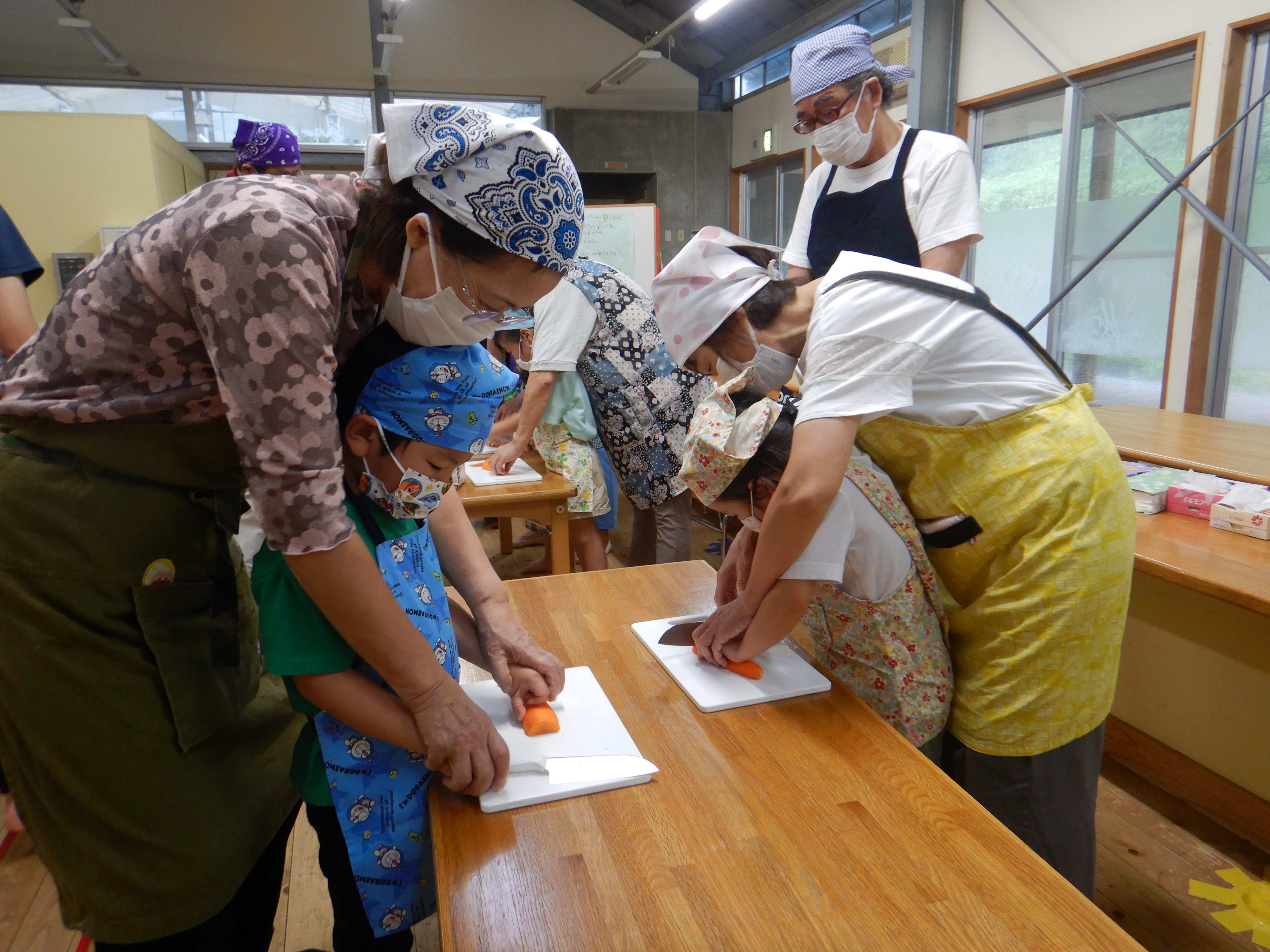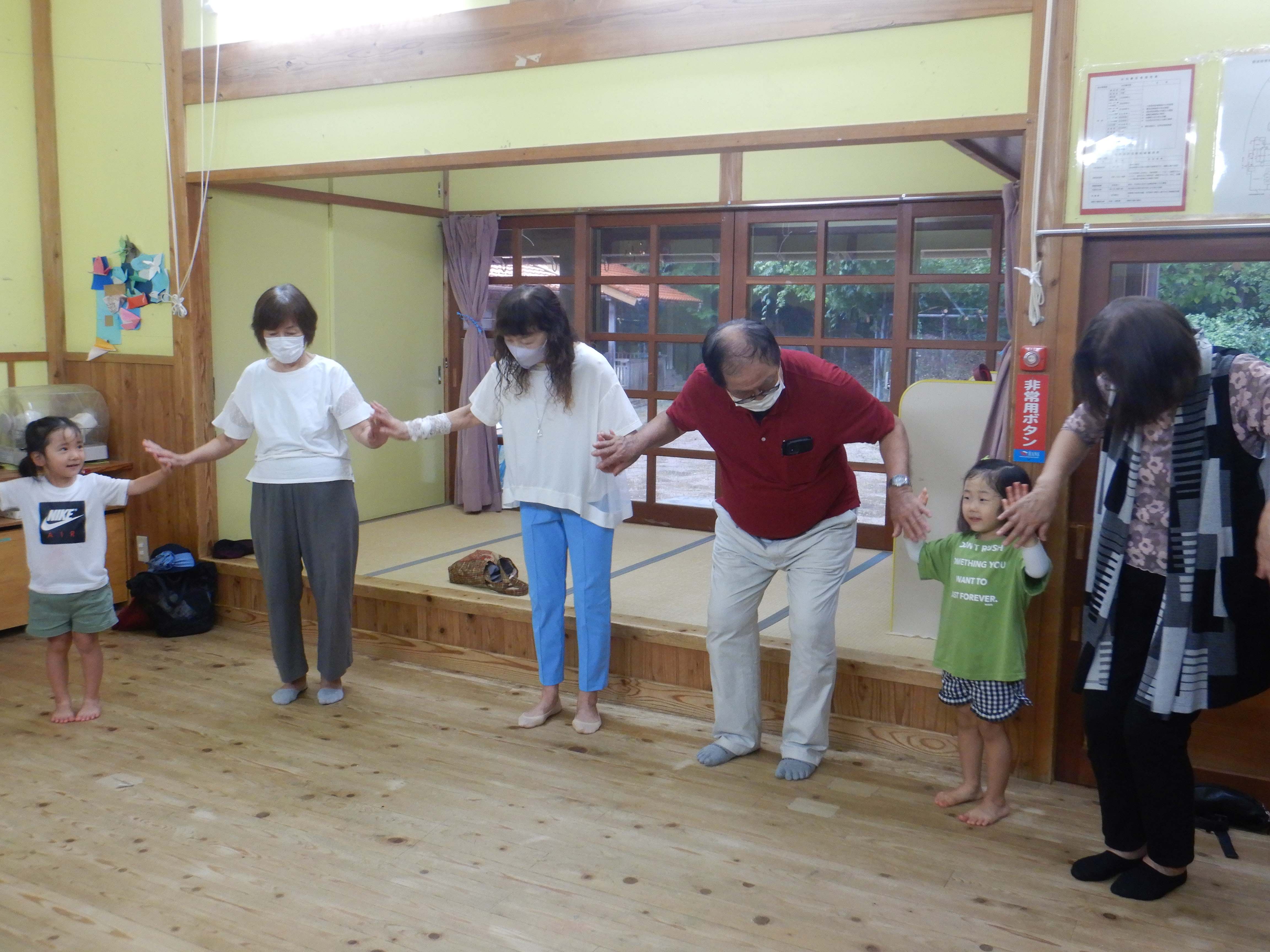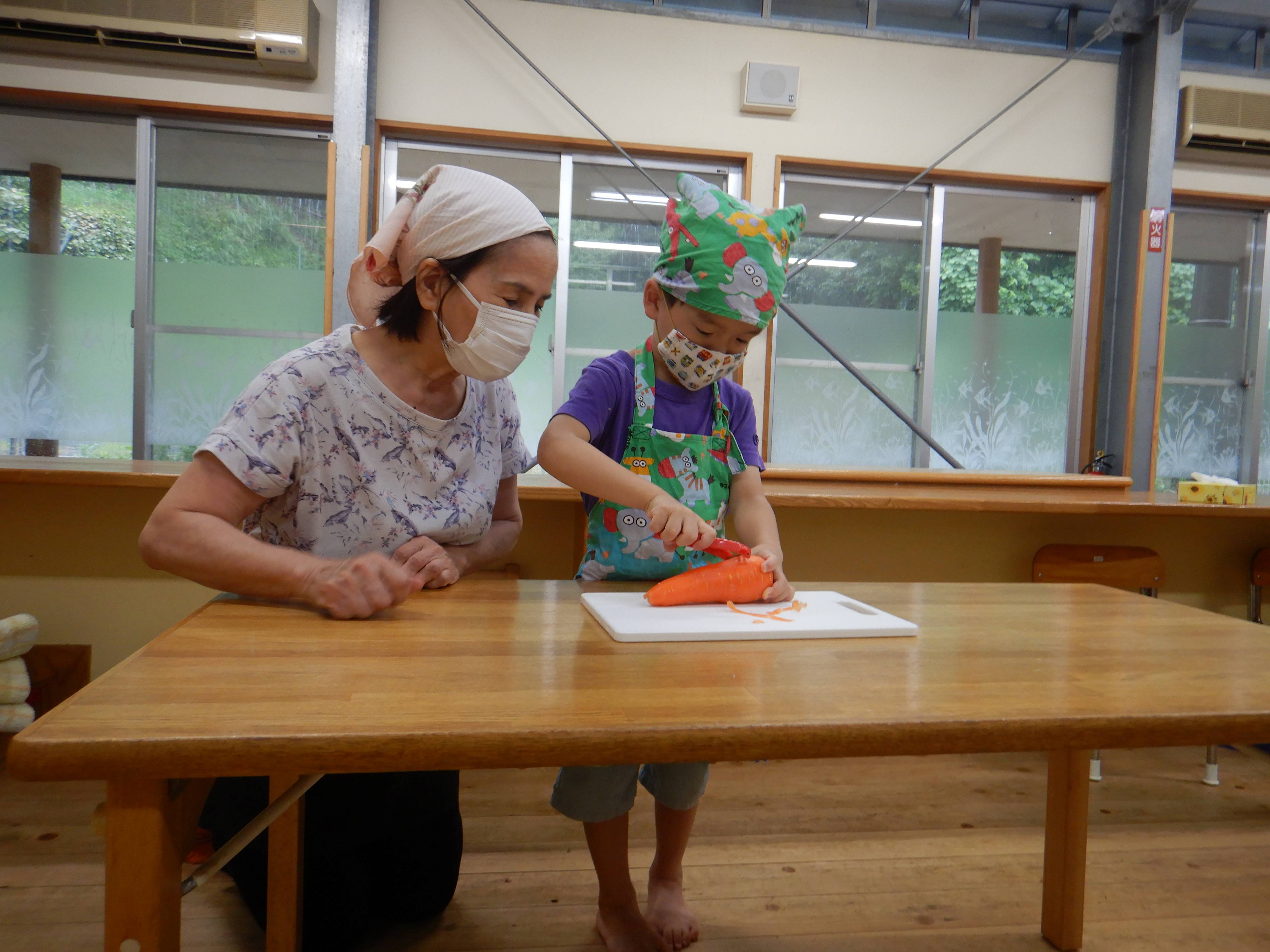 今日作るのは「花嫁寿司」野波地区の伝統食で、婚礼の際に「嬉しい事のおすそ分け」で配る、とても縁起の良い食べ物です。おじいちゃん・おばあちゃんに見守られながら包丁やピーラーを使ったり、一緒に型抜きや飾りつけをしたりし、見つめ合ってほほ笑む表情がたくさん見られました。みんなでテーブルを囲んで食べると、あちこちで楽しいおしゃべりも聞こえ、嬉しそうにできたての花嫁寿司を頬張っていました。ミニミニ発表会では、季節の歌や、サマーフェスティバルでも披露した竹太鼓を見てもらい、「かっこよかったよ」「じょうずだったね」と声をかけてもらっていました。少しの時間でしたが、楽しいひと時となりました。