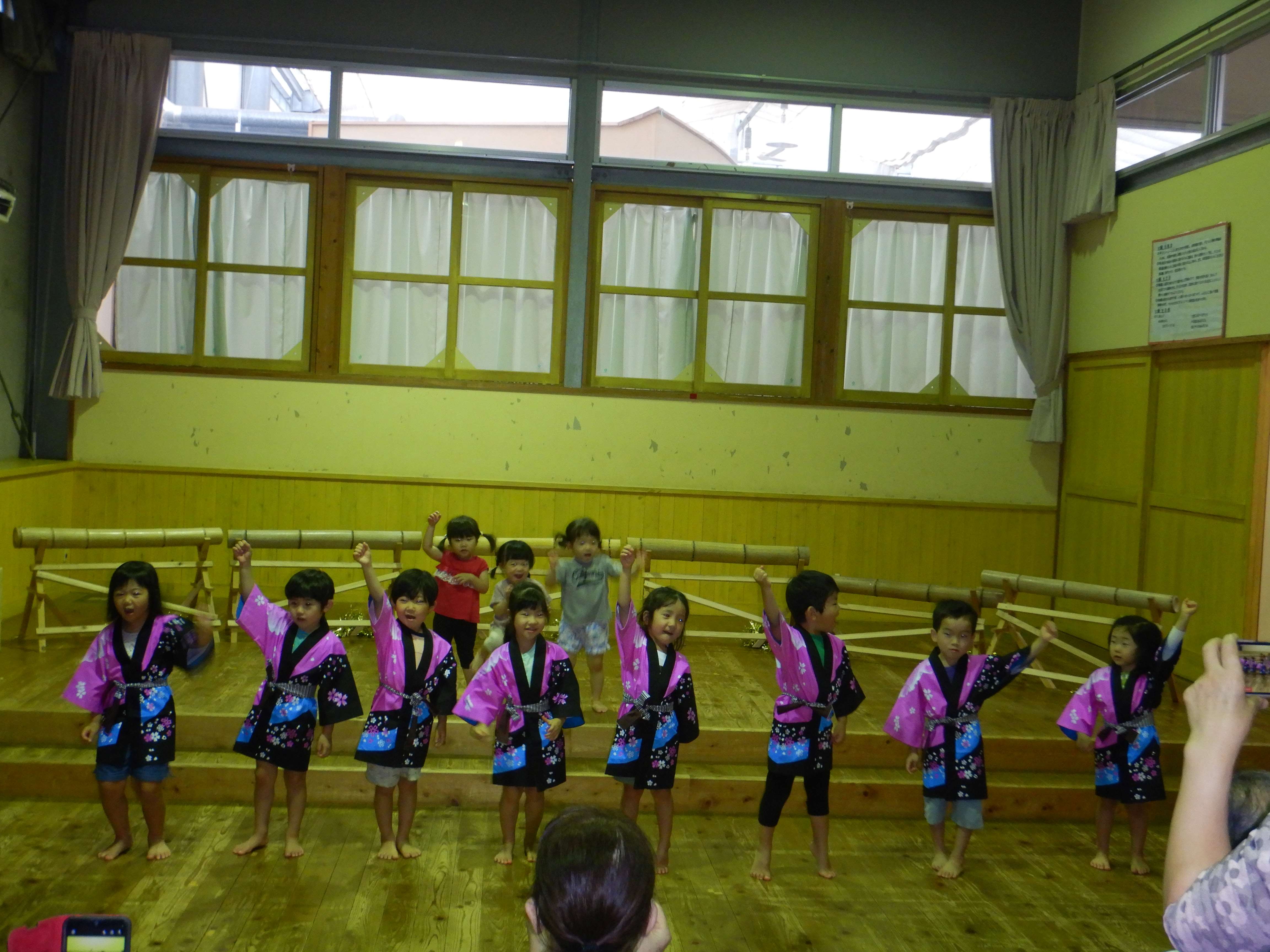 ミニミニ発表会。♪うんどうかいのうた、♪とんぼのめがねを歌いました。「えい、えい、おー!」