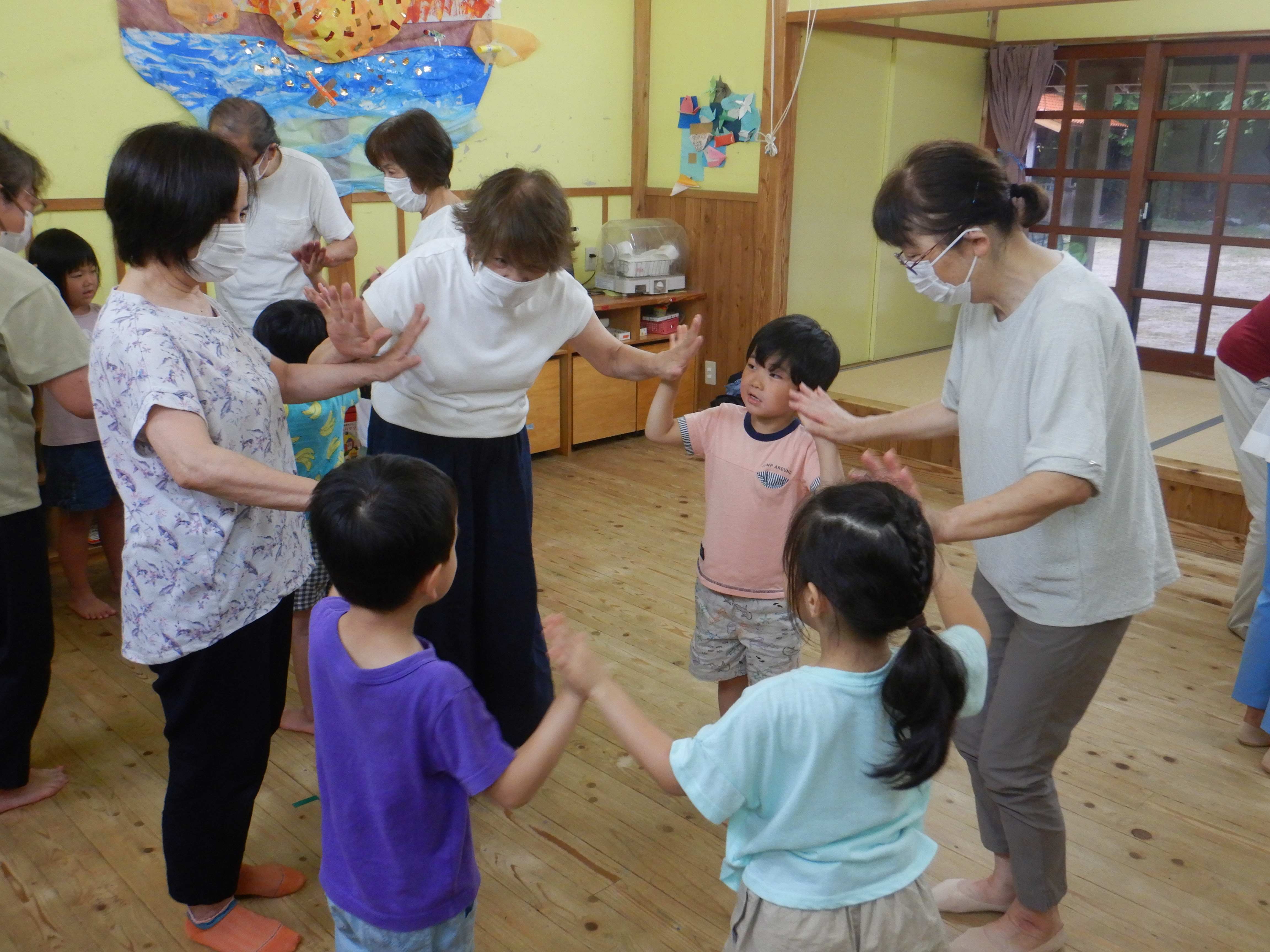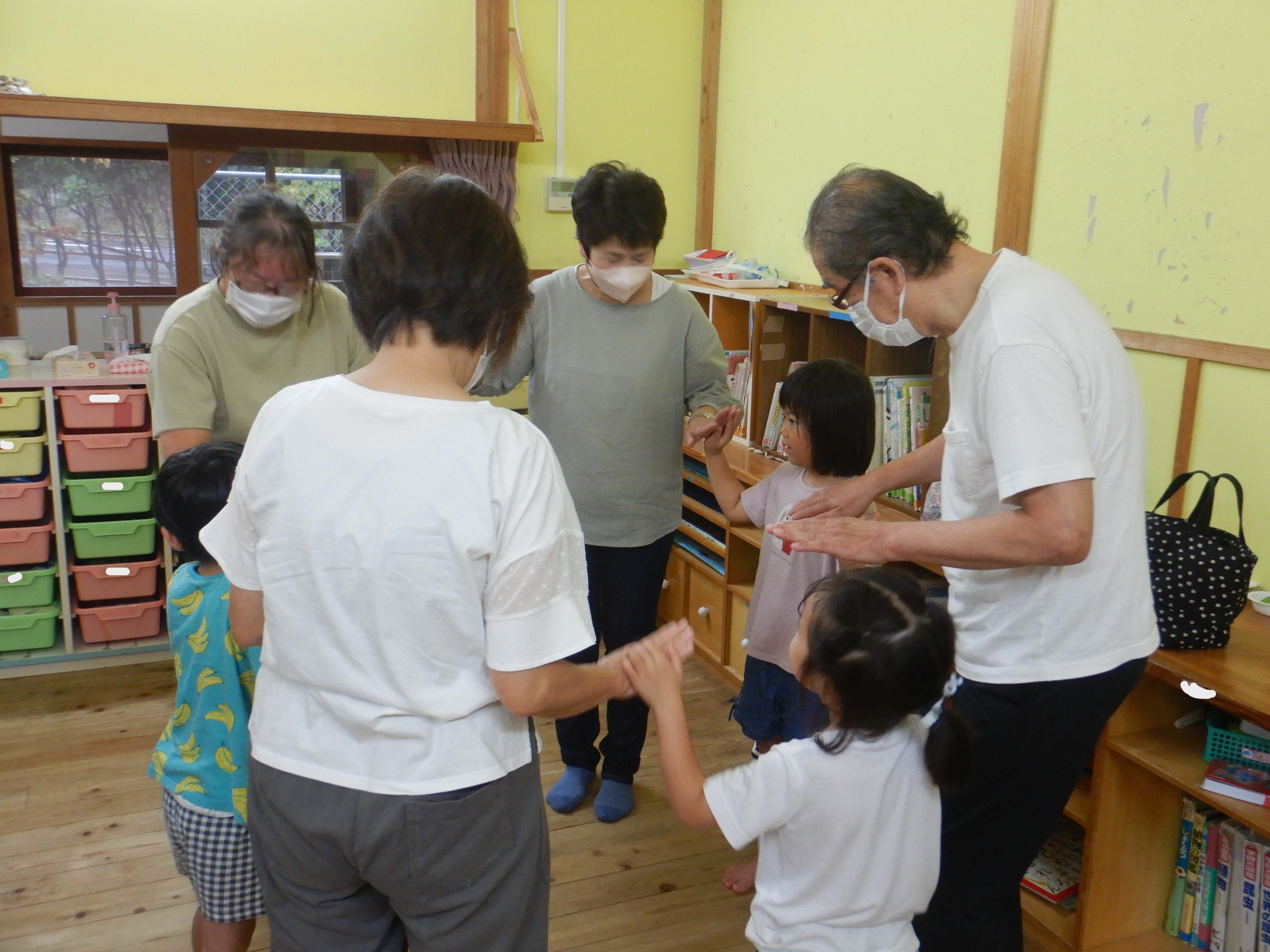 ♪ぶんぶんぶんの手遊びをしました。始めは2人や3人でしたが、徐々に人数が増えていき・・・。