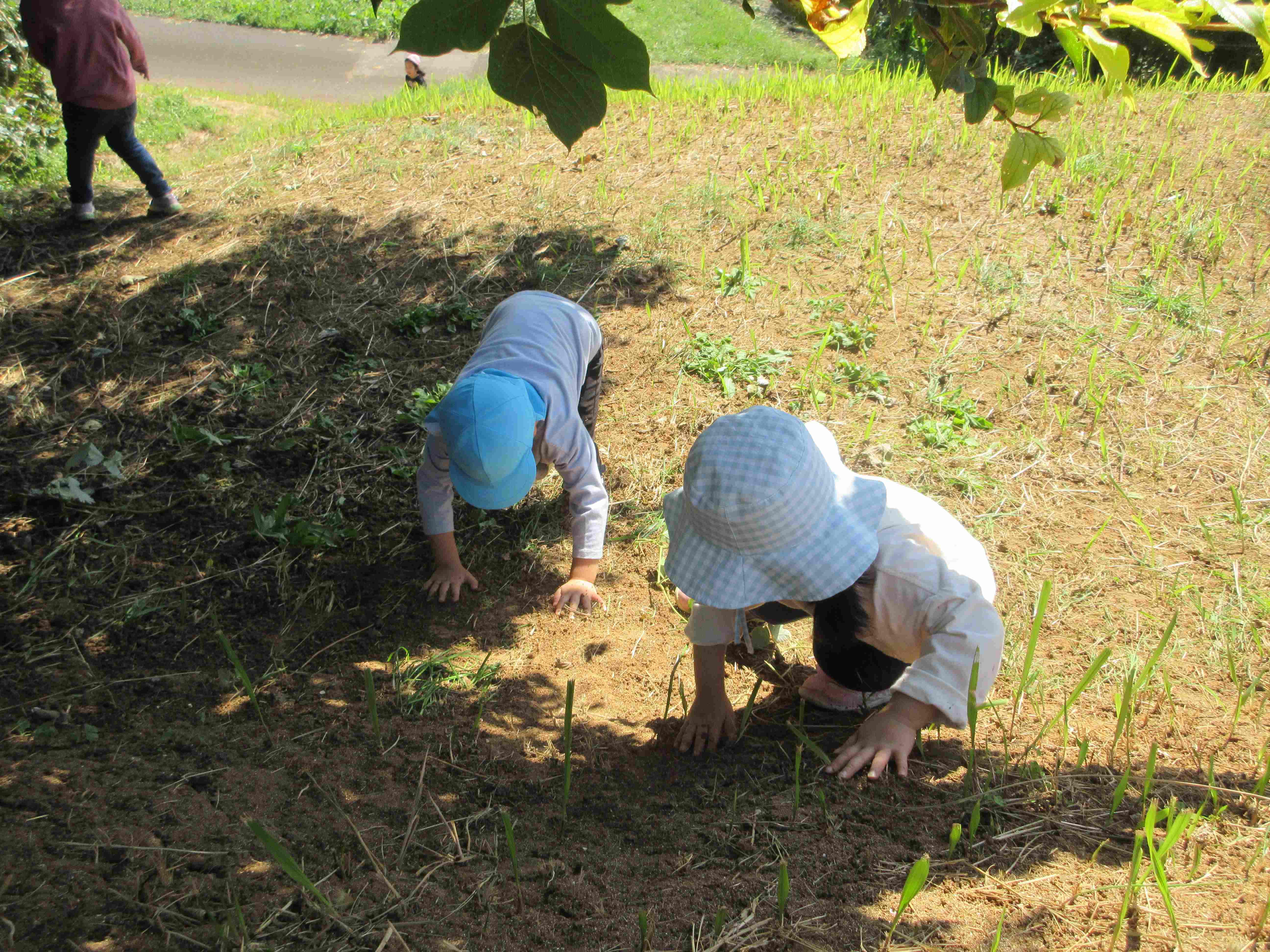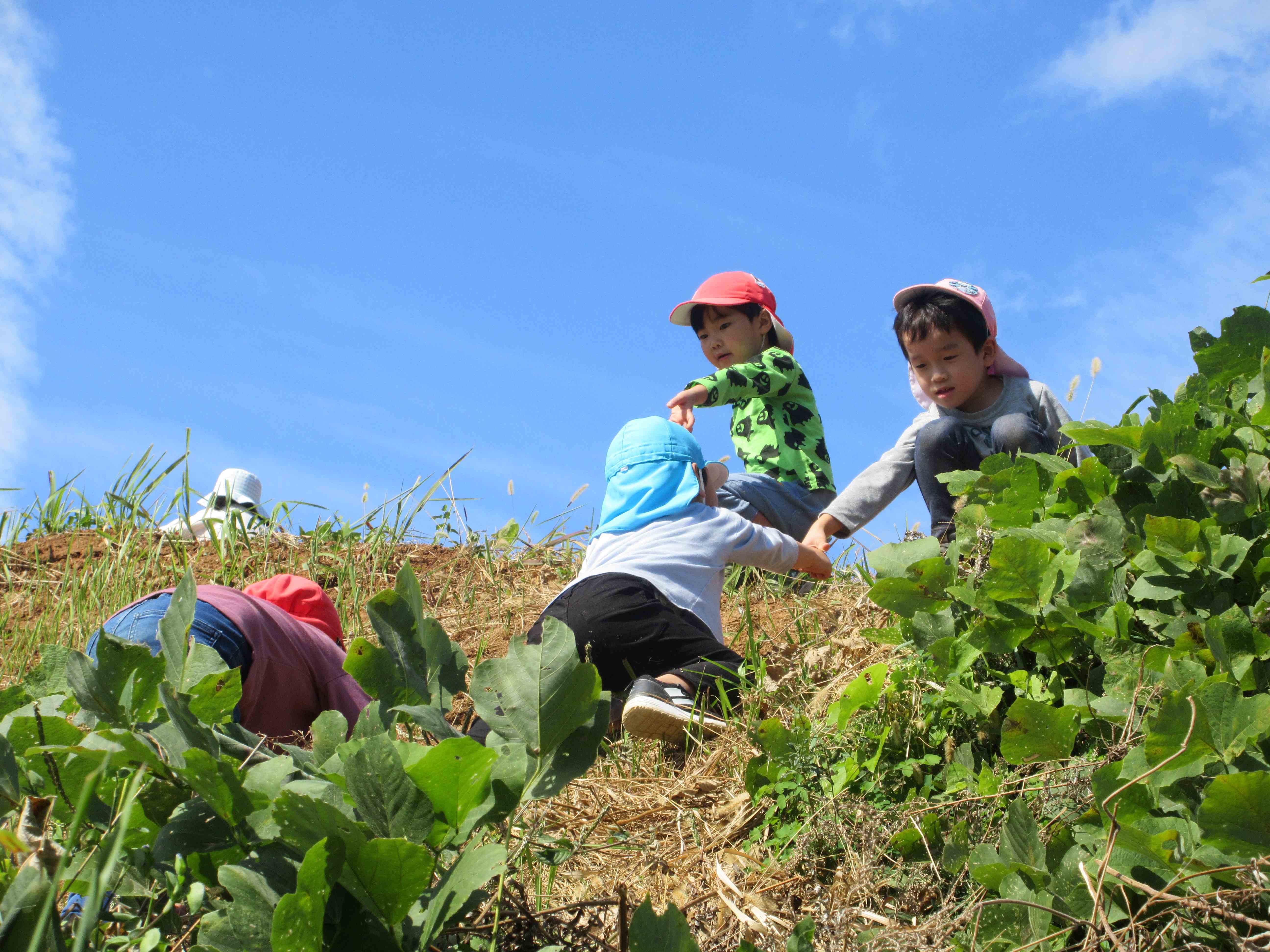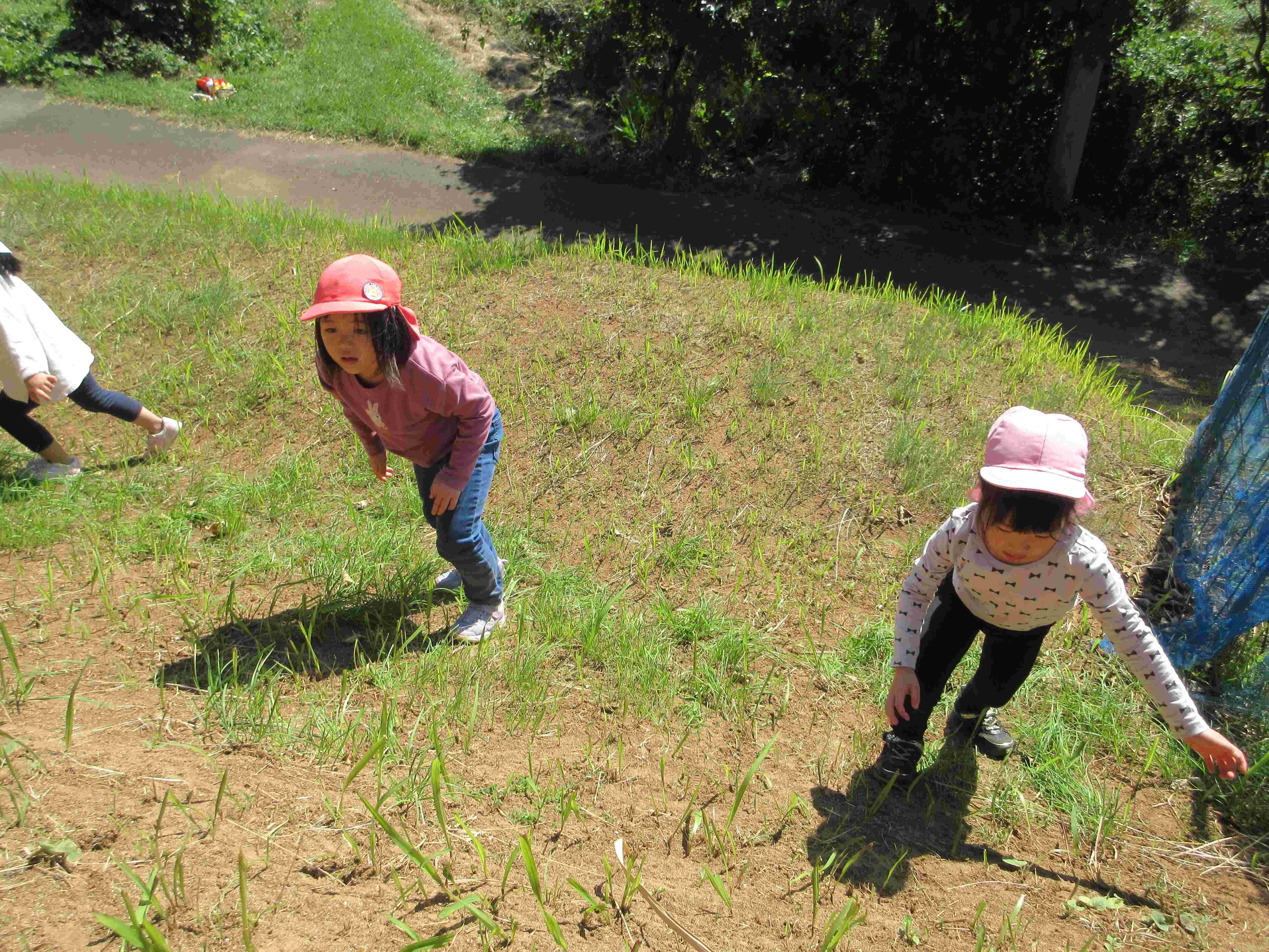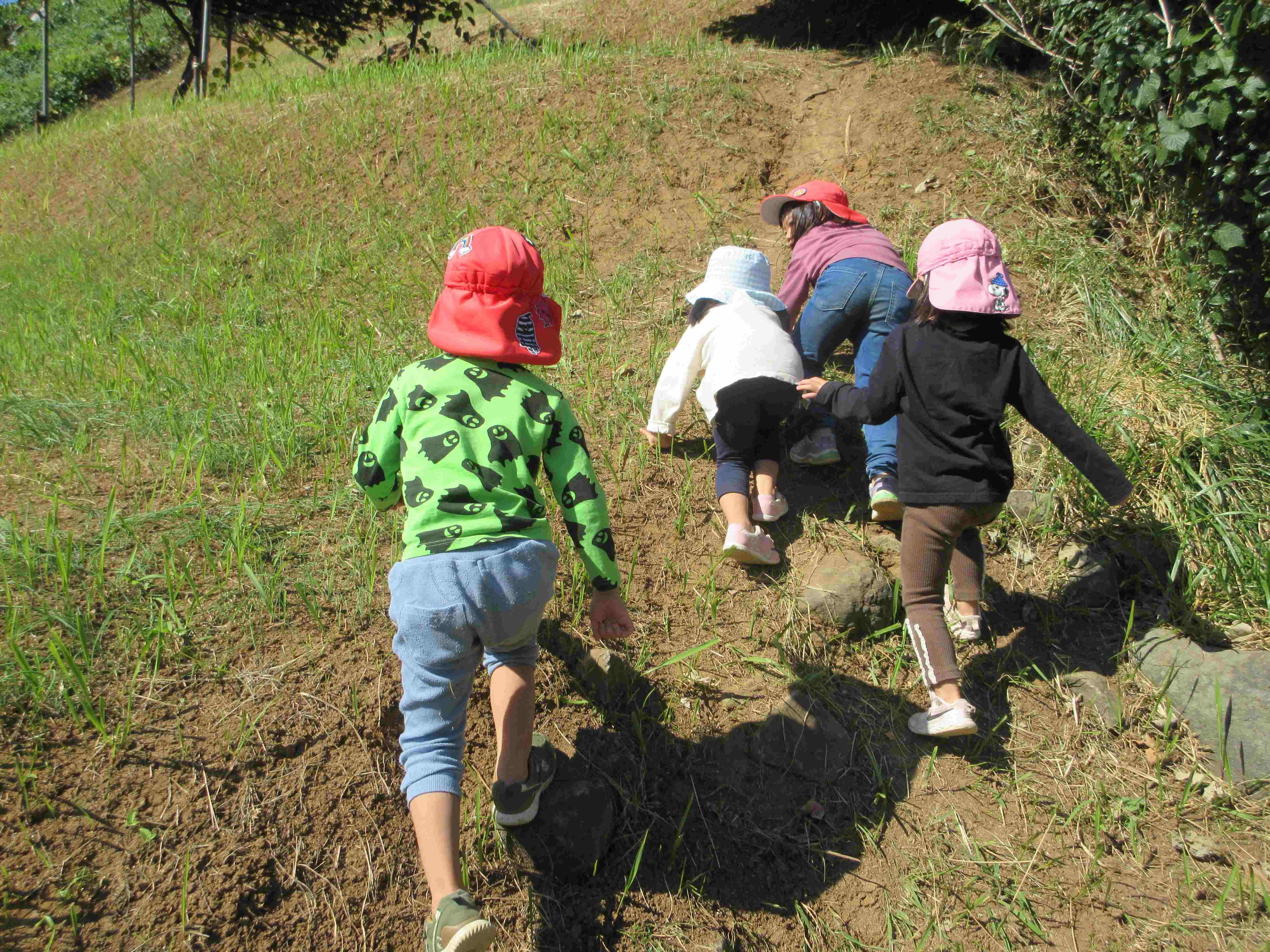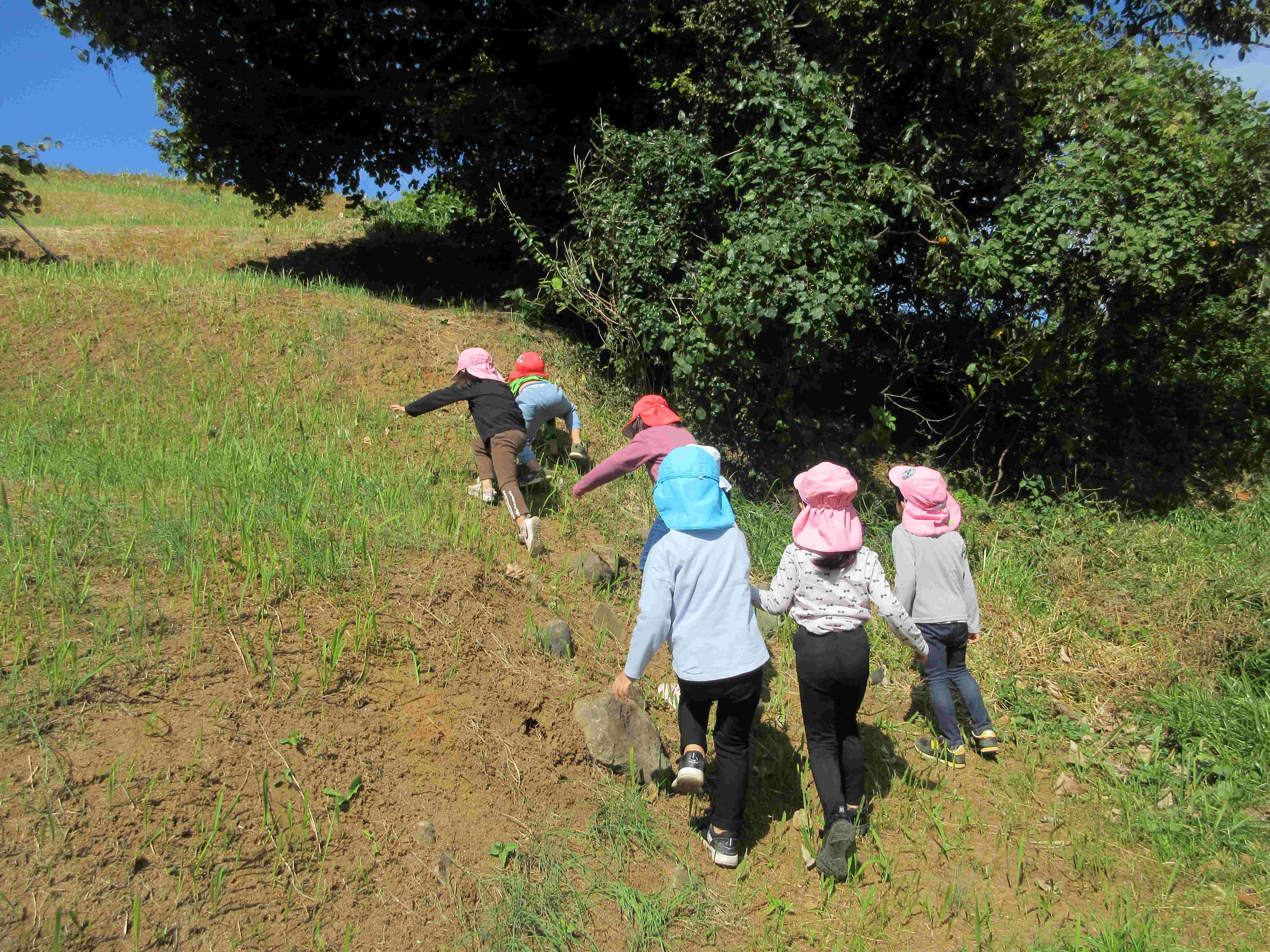 気持ちの良い秋晴れの下、コロコロ斜面に行きました。道中はススキやガマの穂(ソーセージと子ども達は呼んでいます)、雲などに目を向けて、秋の自然を感じながら歩いていました。斜面では、上がりやすいルートを見つけ友達に教えたり、「つかまって!」と言って手を差し伸べたりする姿も見られました。地域の方がきれいに整備して下さっていたので、滑り降りるのもとても気持ちが良さそうで、子ども達の笑顔が輝いていました。