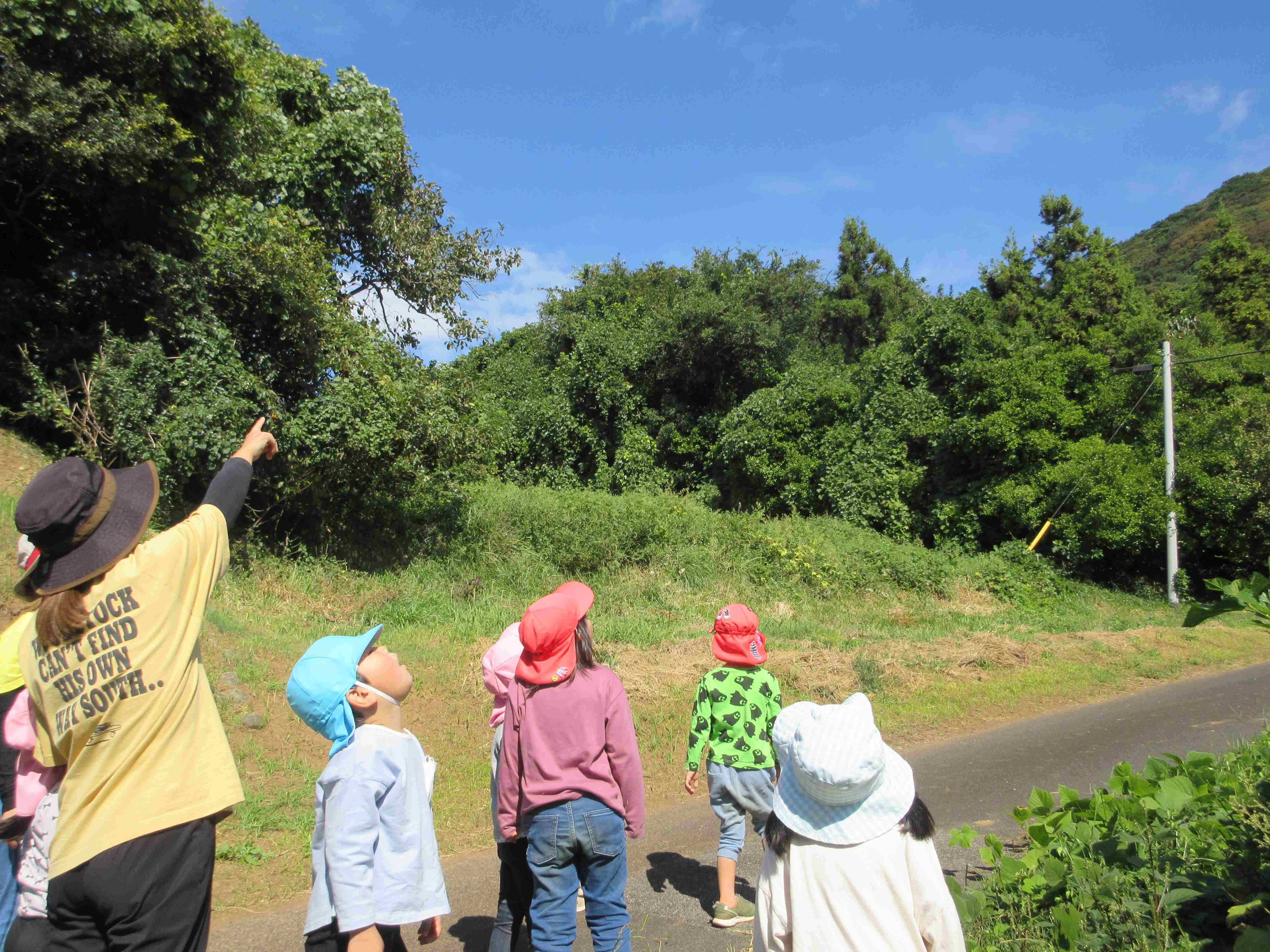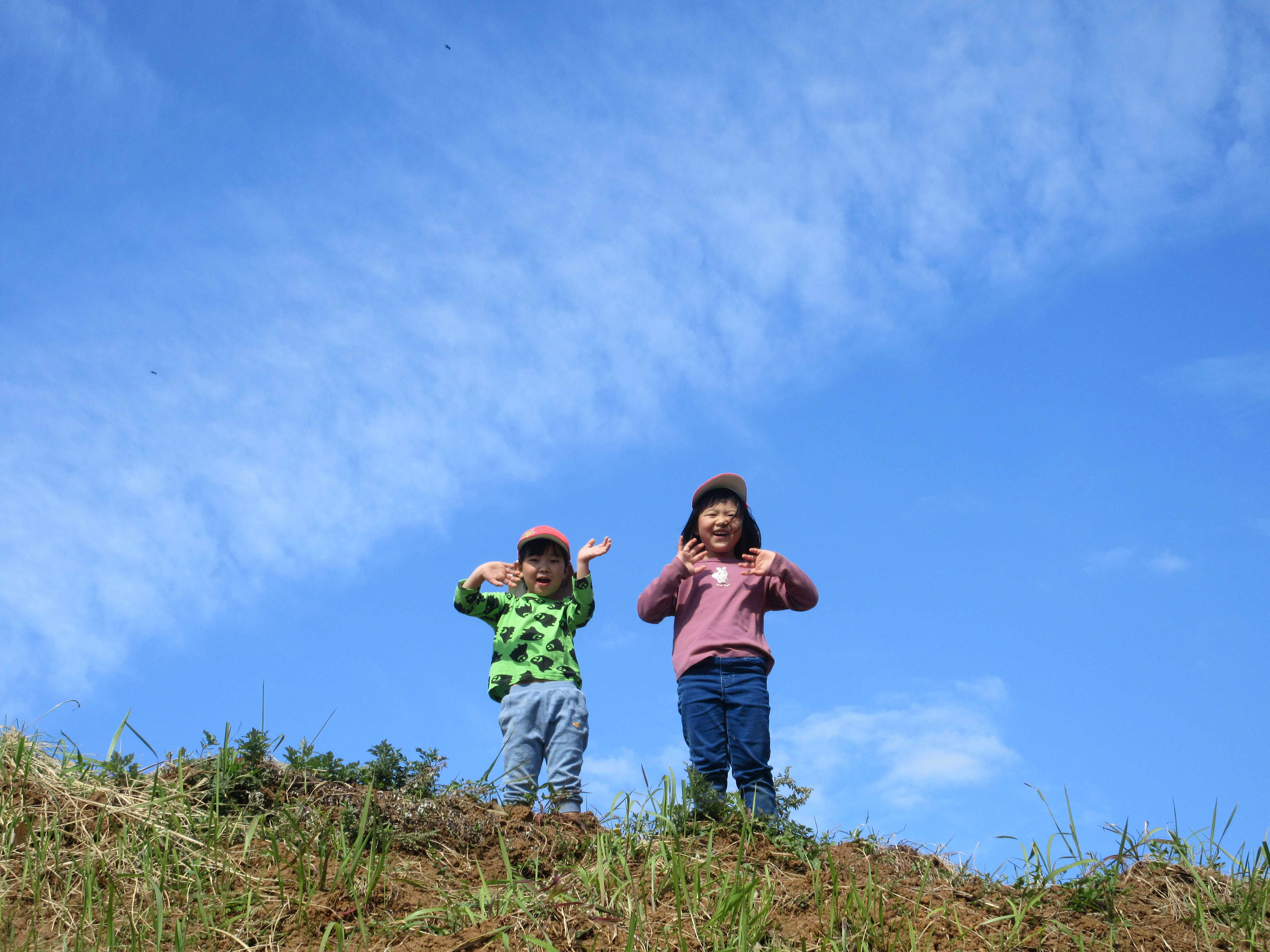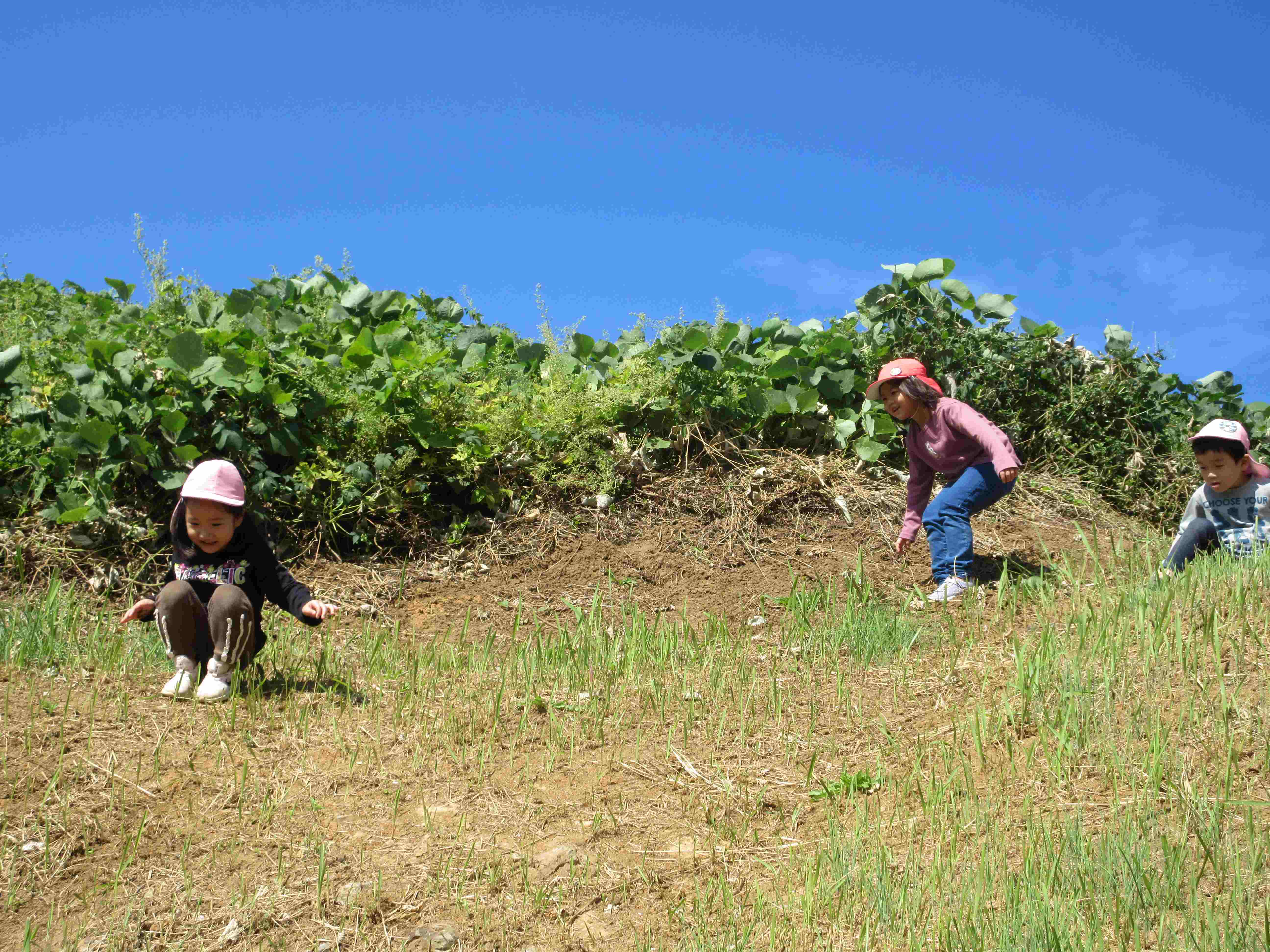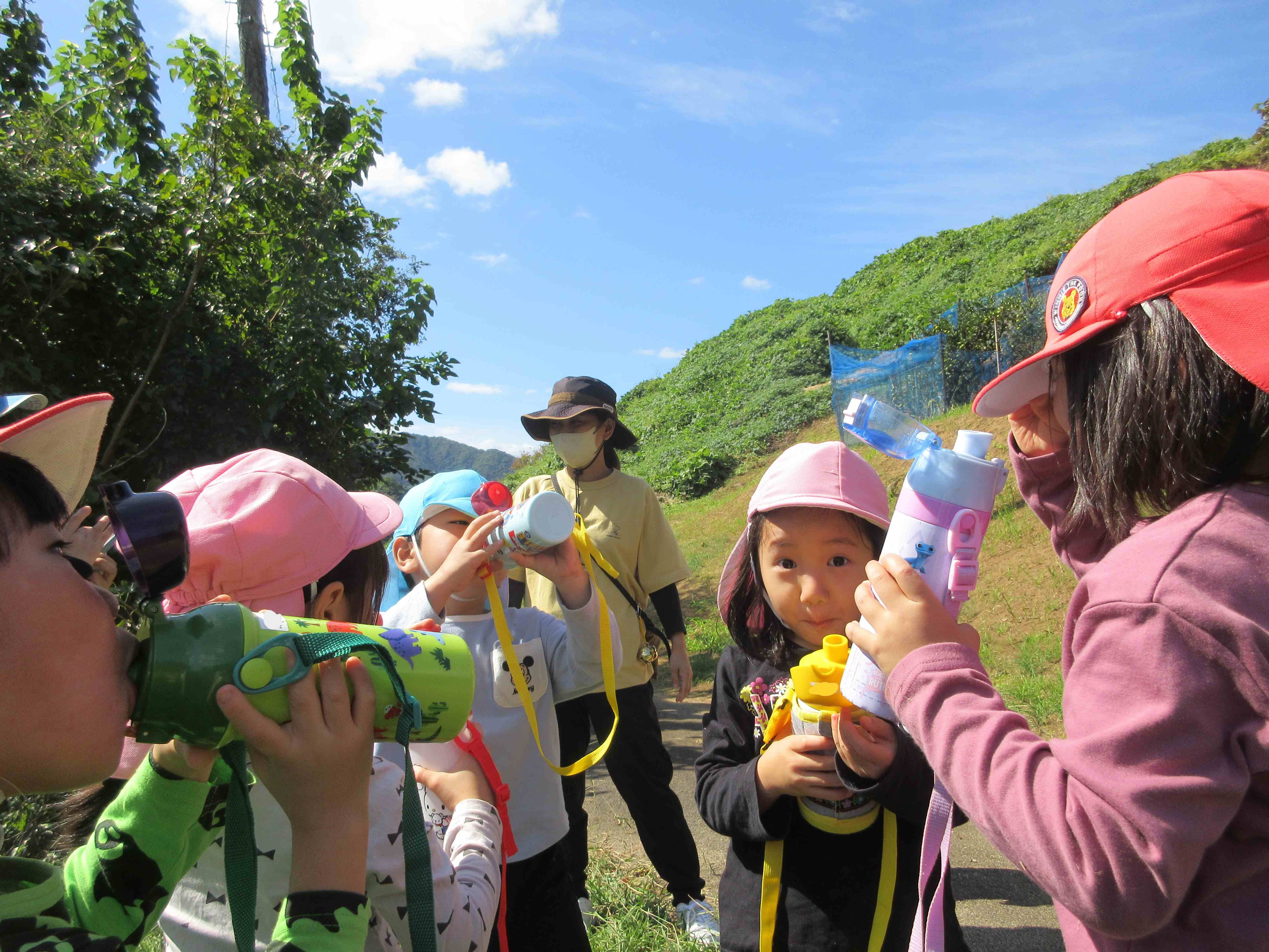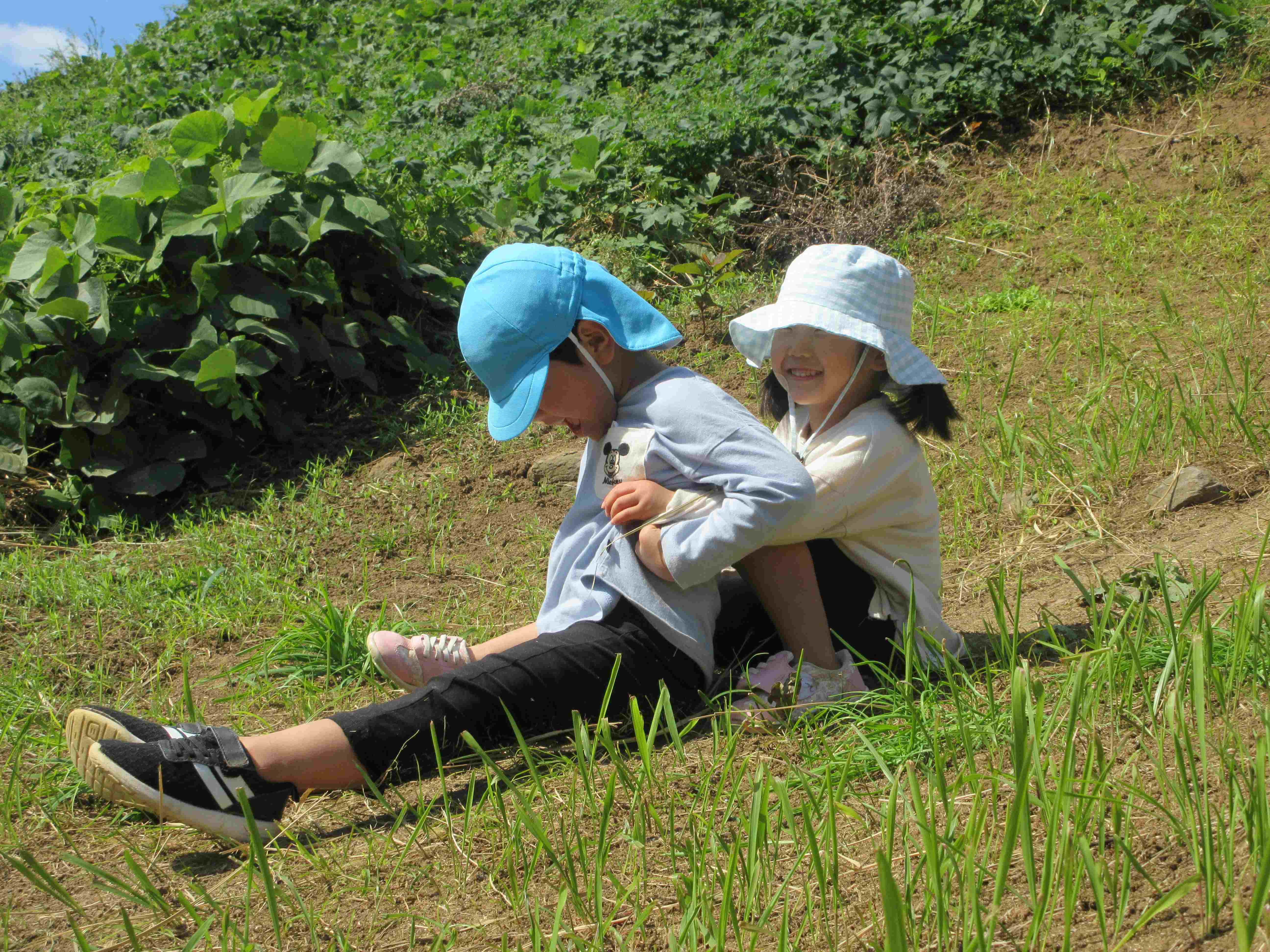 気持ちの良い秋晴れの下、コロコロ斜面に行きました。道中はススキやガマの穂(ソーセージと子ども達は呼んでいます)、雲などに目を向けて、秋の自然を感じながら歩いていました。斜面では、上がりやすいルートを見つけ友達に教えたり、「つかまって!」と言って手を差し伸べたりする姿も見られました。地域の方がきれいに整備して下さっていたので、滑り降りるのもとても気持ちが良さそうで、子ども達の笑顔が輝いていました。