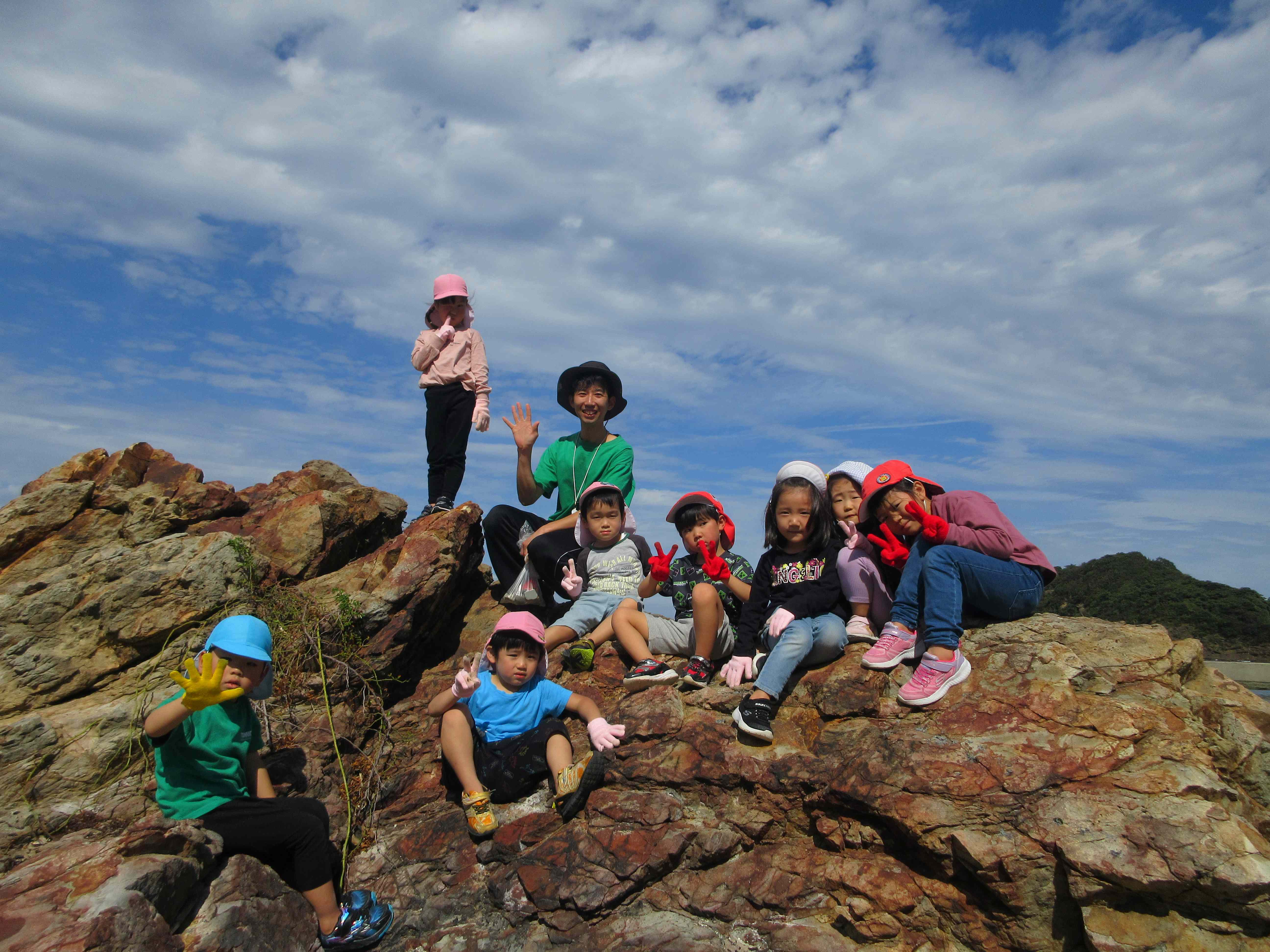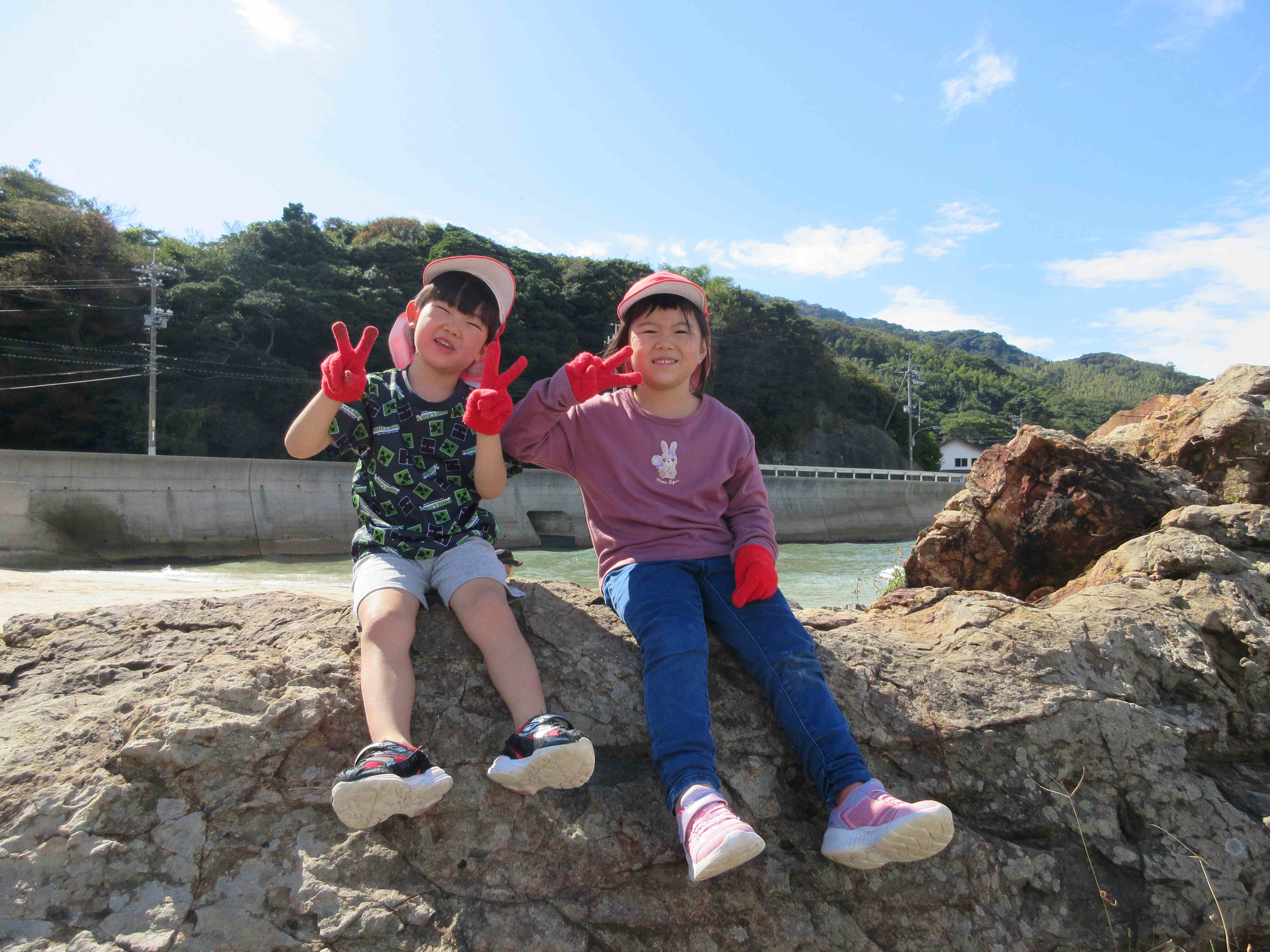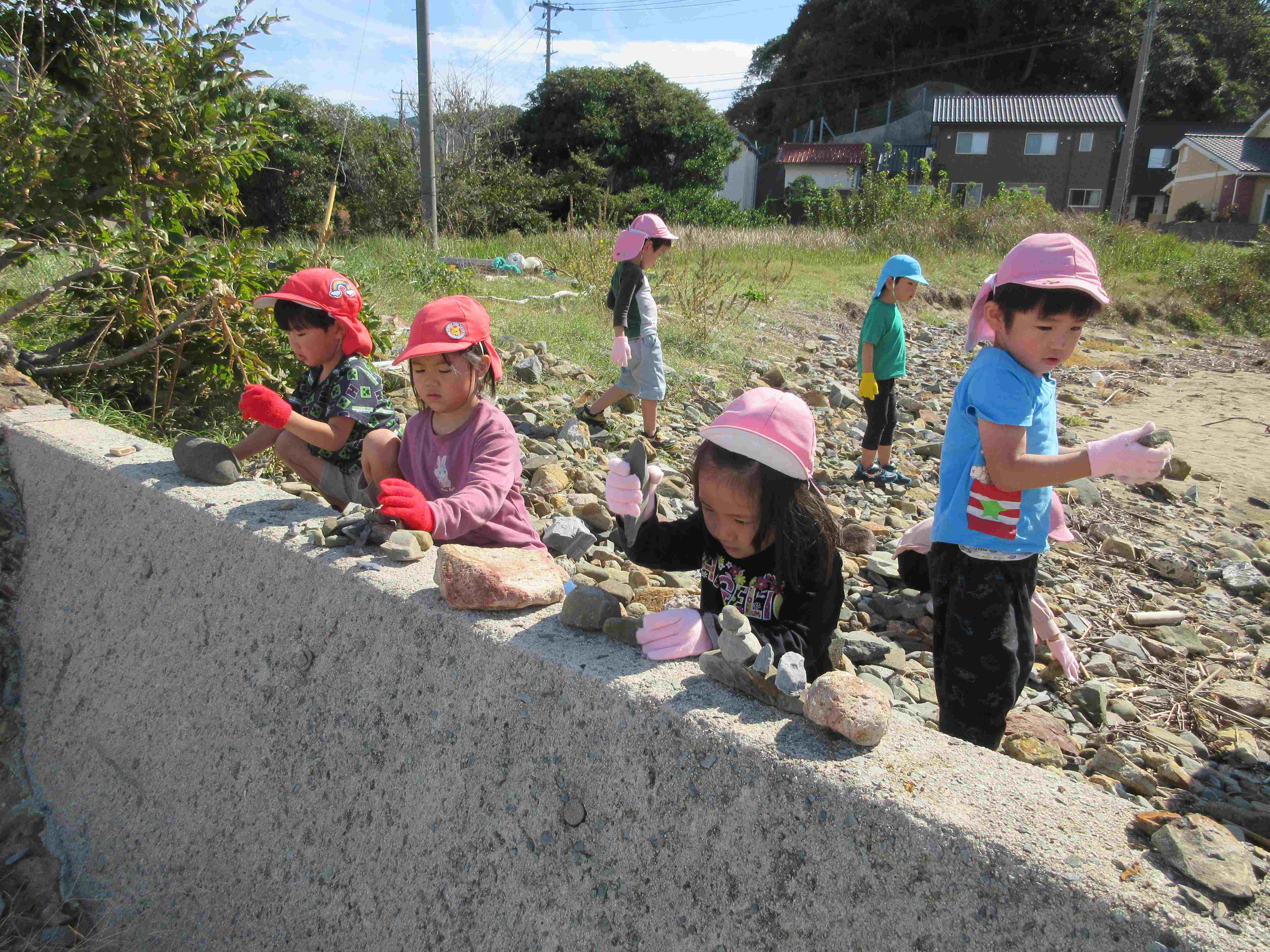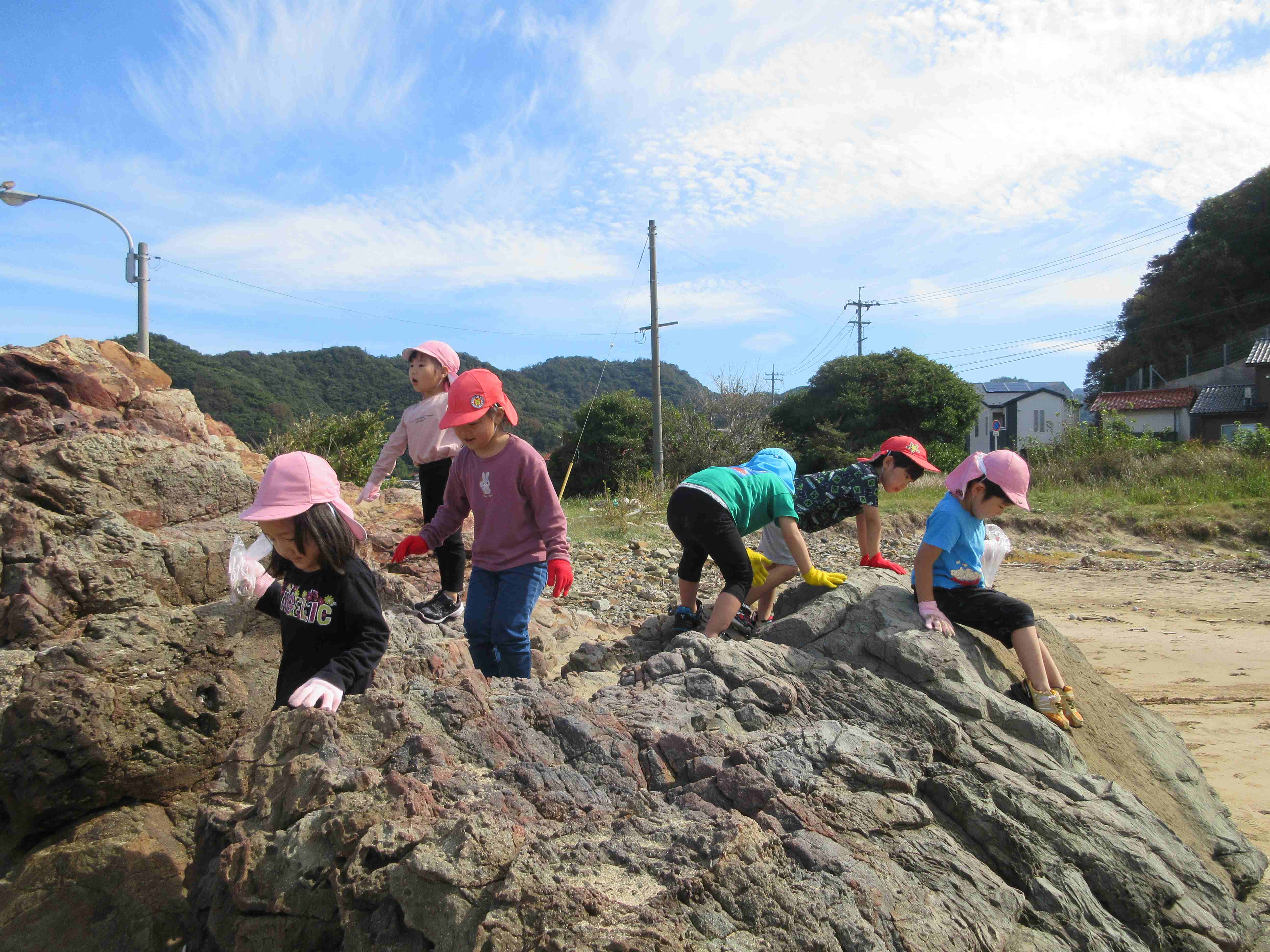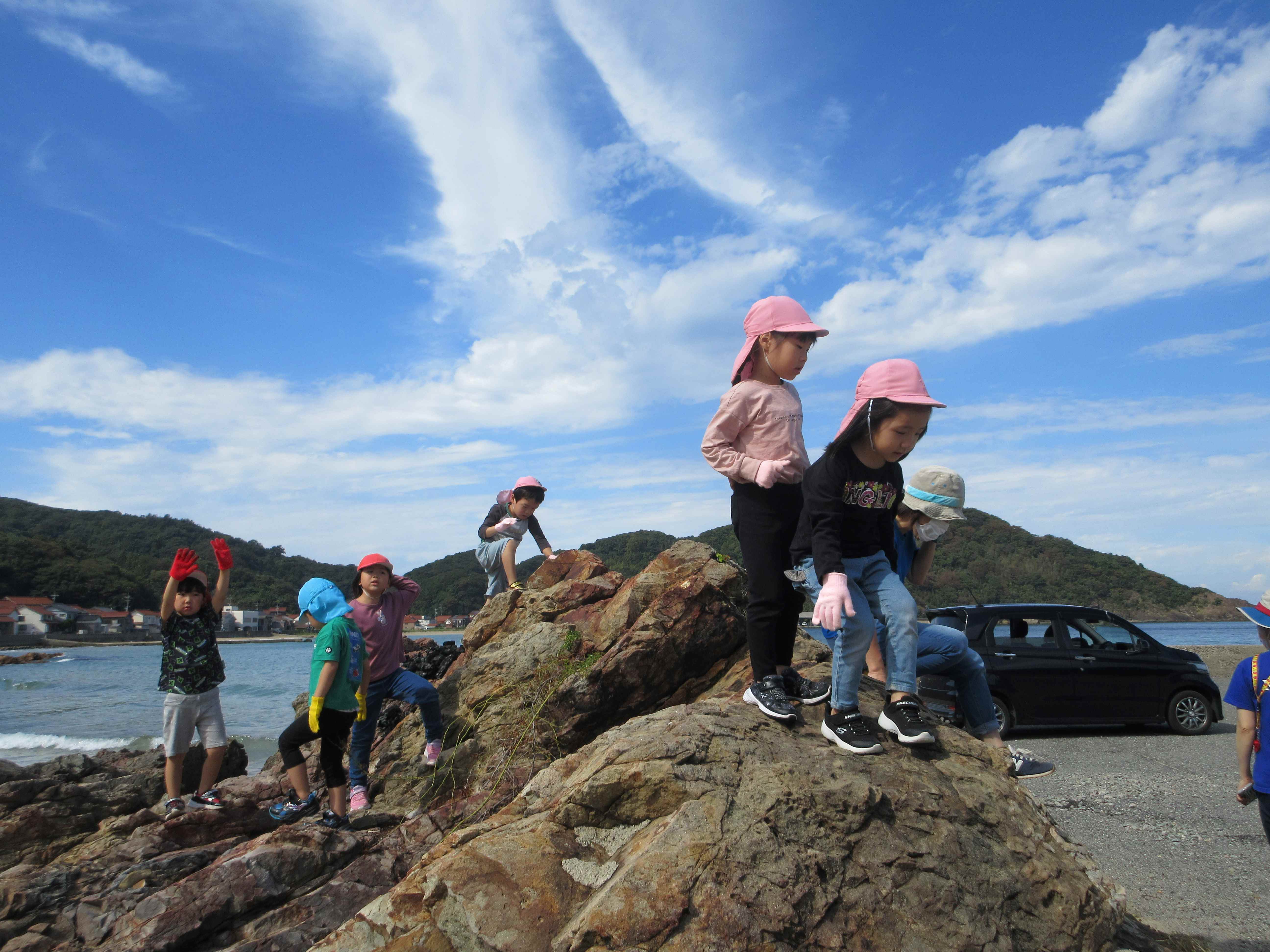 コミュニティバスに乗って、小具の浜へ秋の遠足に行きました。とても天気が良く、日光に照らされてキラキラと光る海を見つめ、「わぁー、きれい!」と大喜びする姿がありました。小具の浜に着くと、ペットボトルや発砲スチロールなどのゴミが落ちているのを子ども達が見つけたので、ゴミを拾いました。ゴミを拾っているうちに綺麗な貝殻や丸い石を見つけていたので、終わってから見つけて集めることを楽しみました。他にも石で石を割り、色の違いや固さに驚いたり、岩山に上がって「やっほー!」と手を振ったり、砂浜に絵を描いたりし、じっくりと遊ぶ姿が見られました。