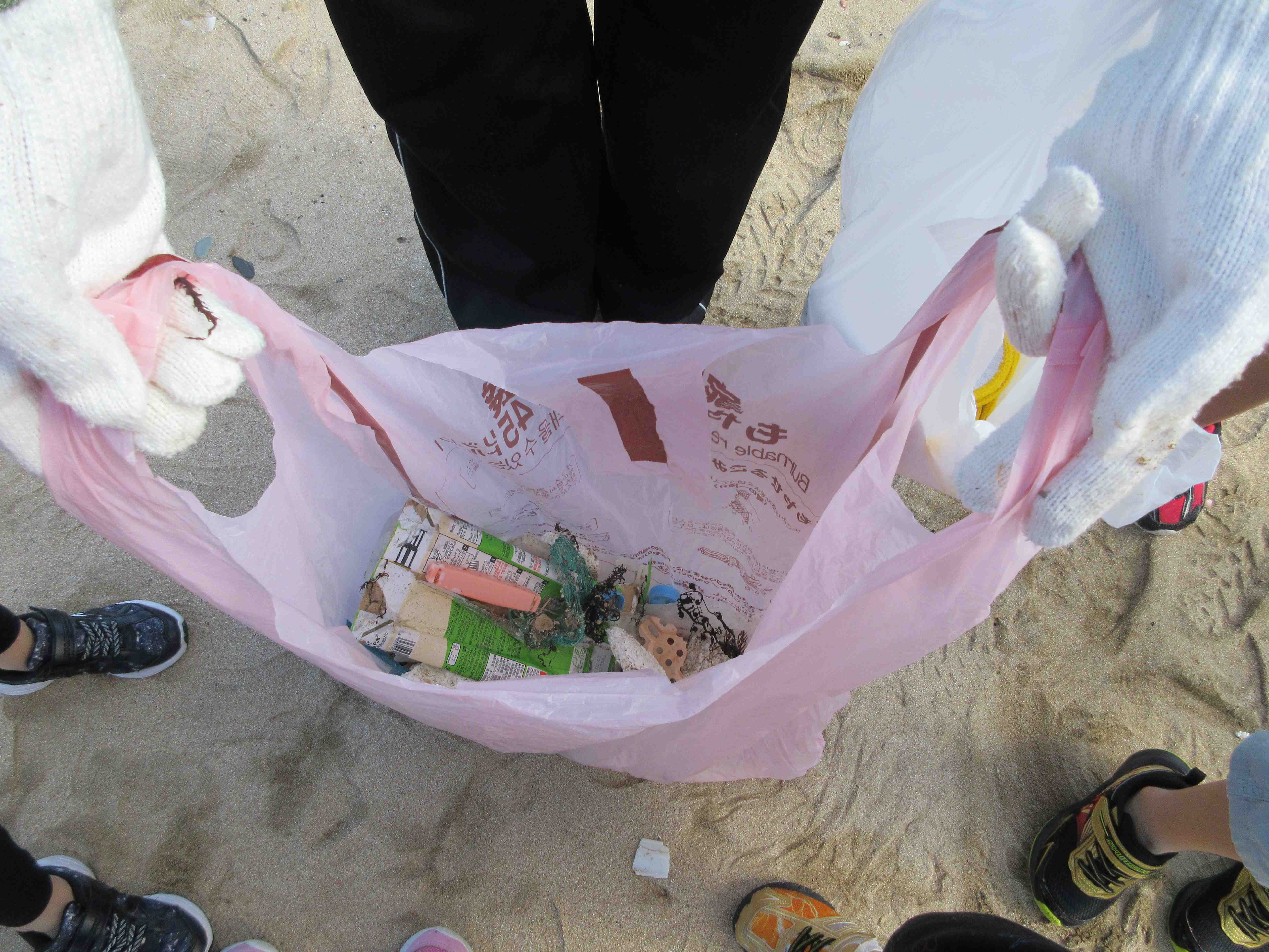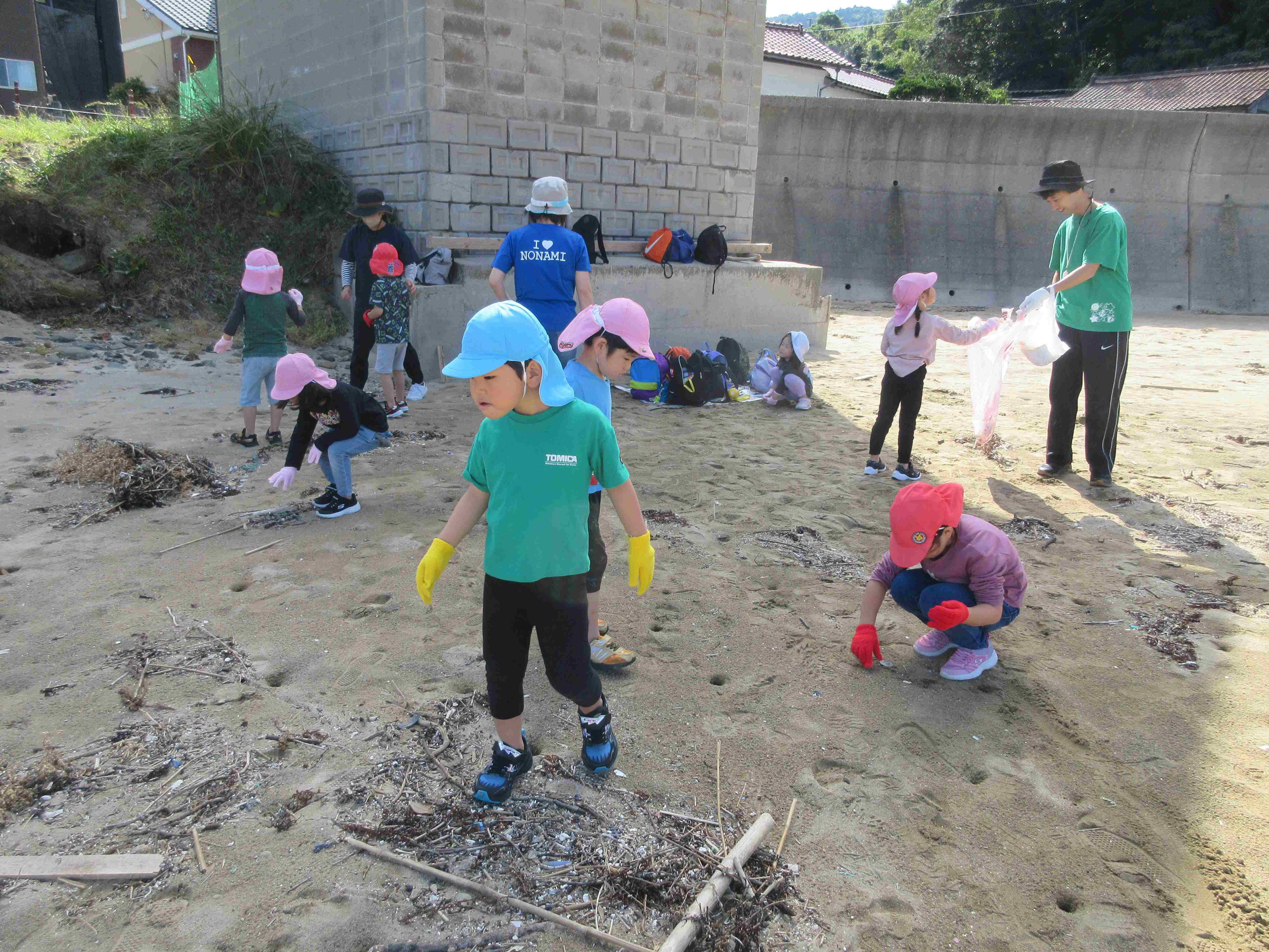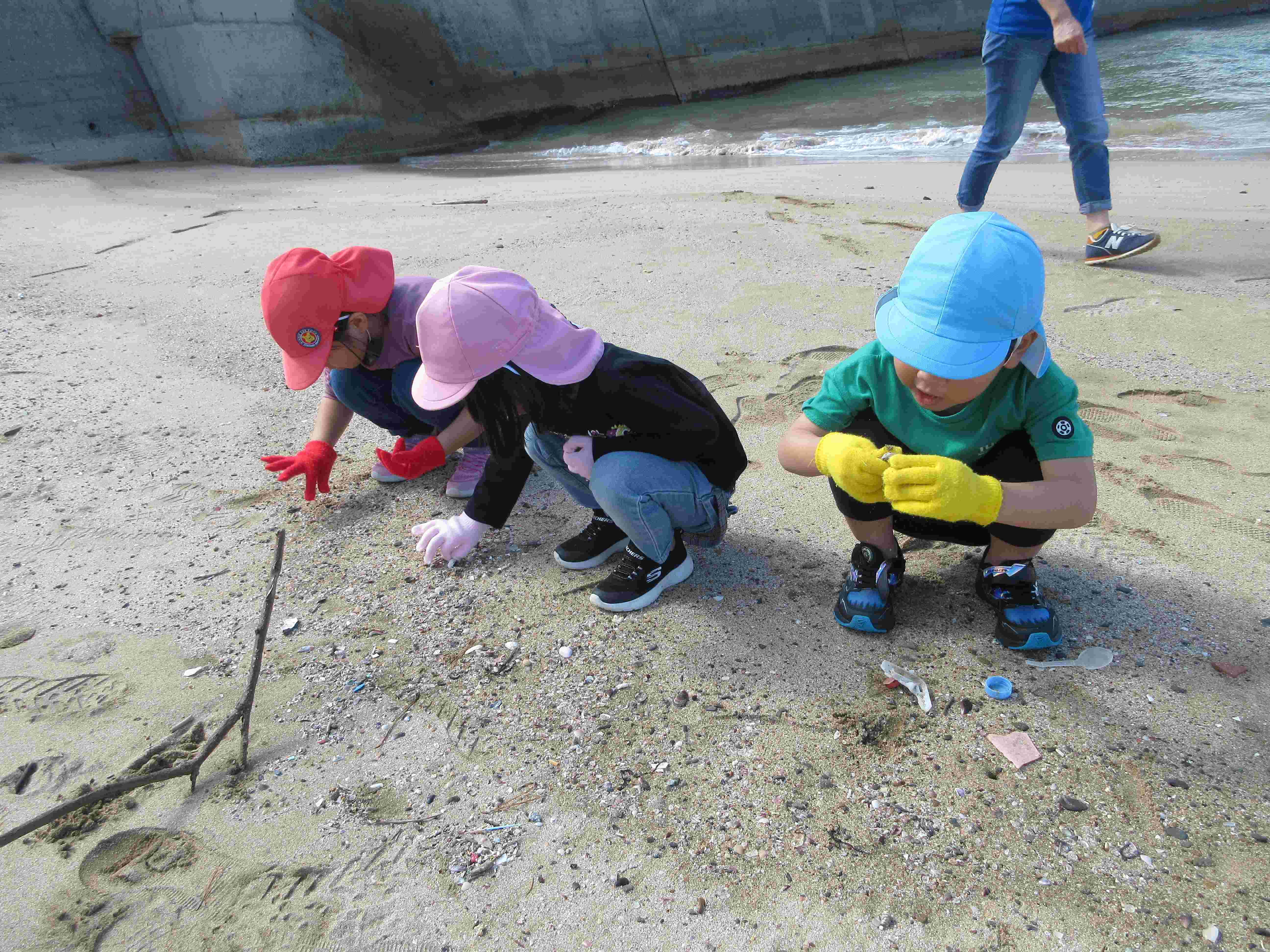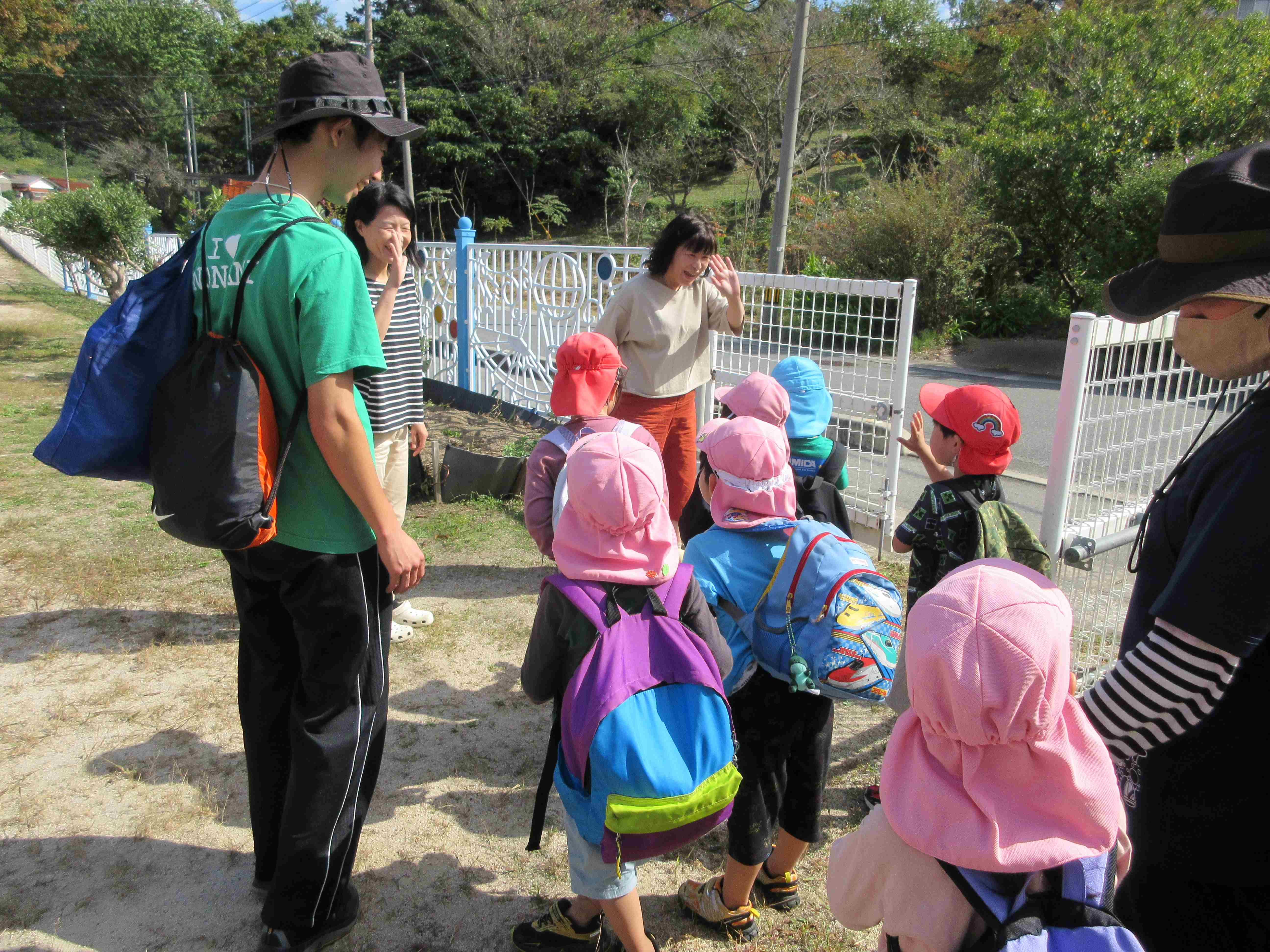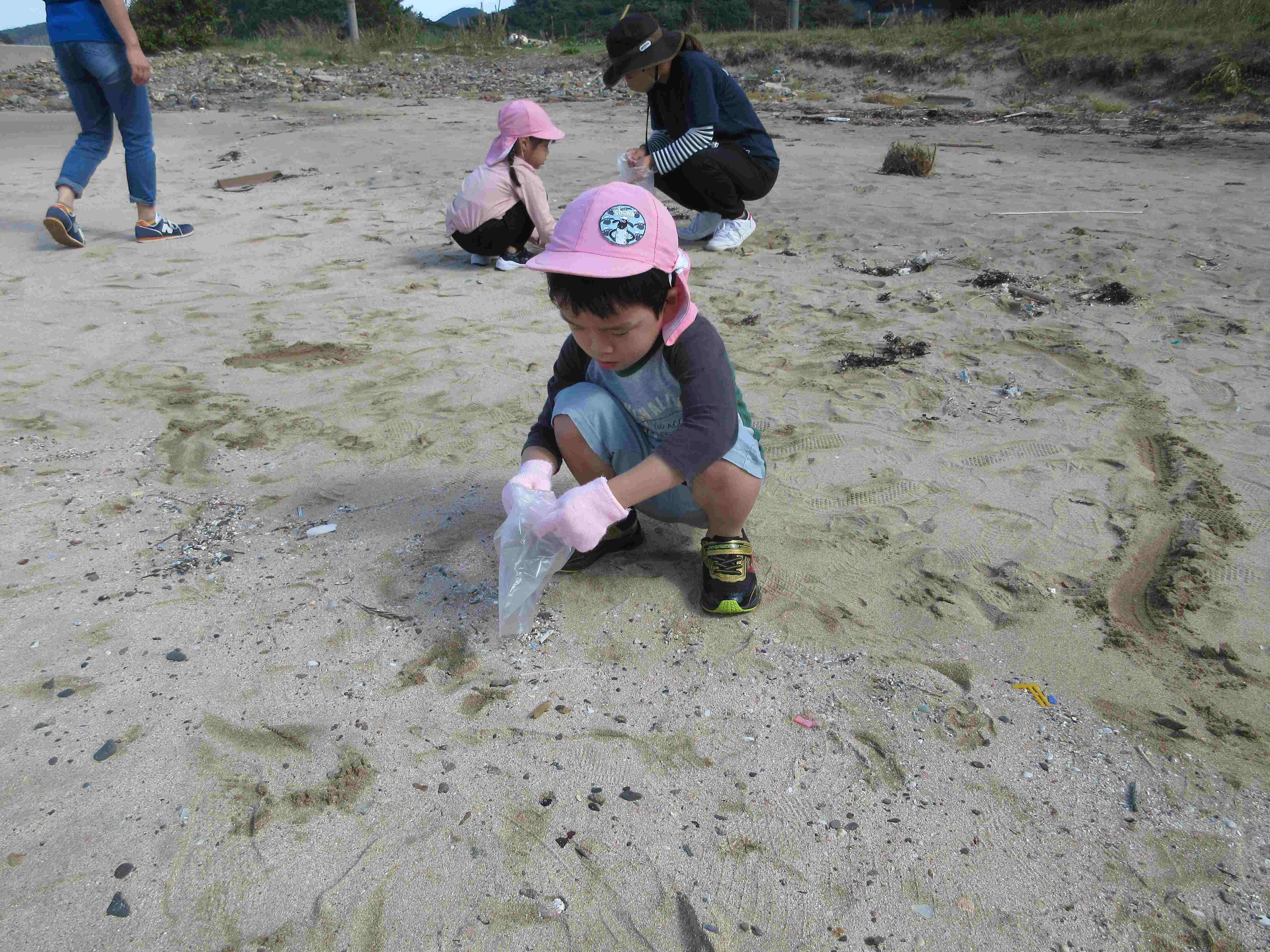 コミュニティバスに乗って、小具の浜へ秋の遠足に行きました。とても天気が良く、日光に照らされてキラキラと光る海を見つめ、「わぁー、きれい!」と大喜びする姿がありました。小具の浜に着くと、ペットボトルや発砲スチロールなどのゴミが落ちているのを子ども達が見つけたので、ゴミを拾いました。ゴミを拾っているうちに綺麗な貝殻や丸い石を見つけていたので、終わってから見つけて集めることを楽しみました。他にも石で石を割り、色の違いや固さに驚いたり、岩山に上がって「やっほー!」と手を振ったり、砂浜に絵を描いたりし、じっくりと遊ぶ姿が見られました。