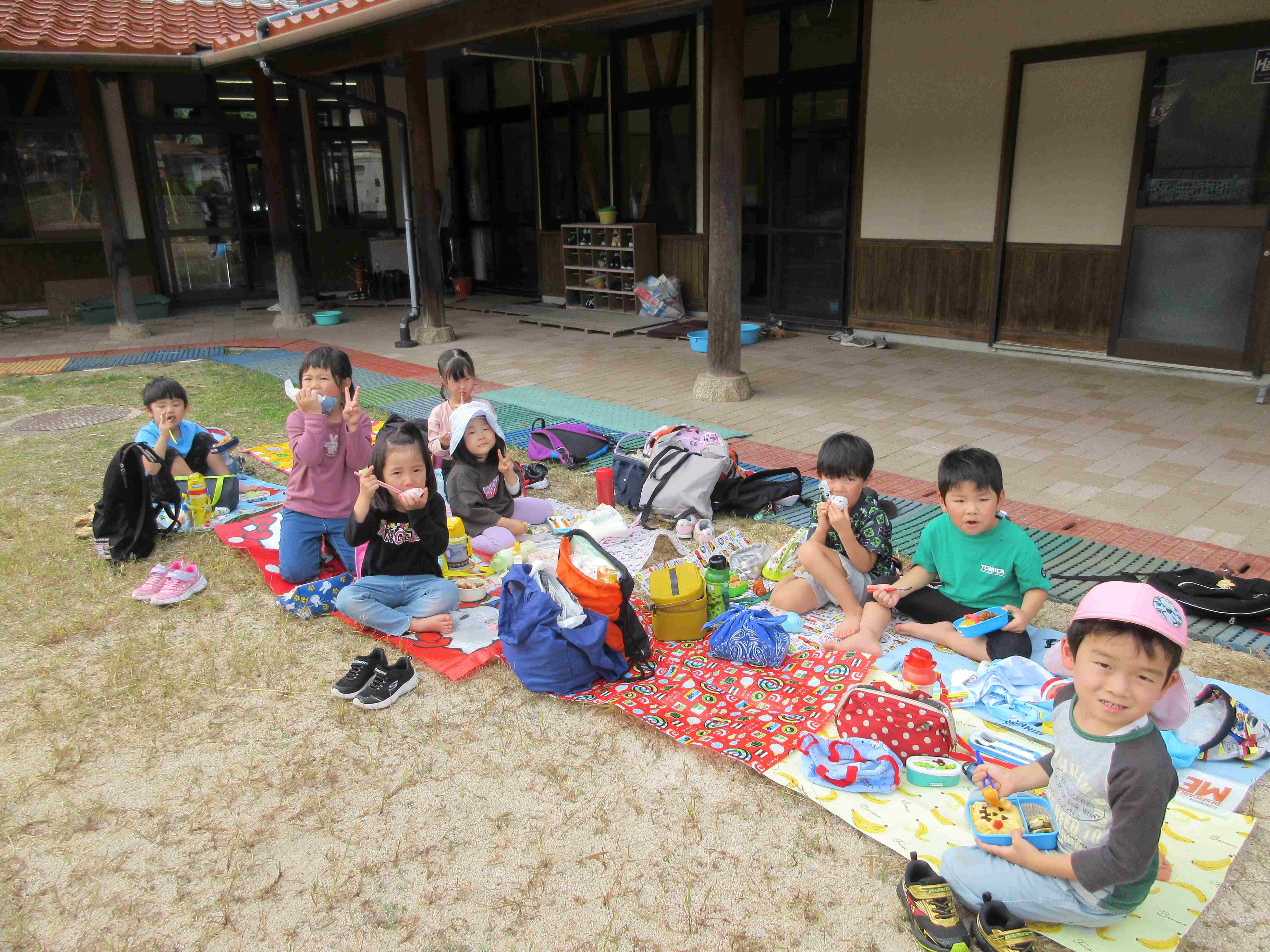 楽しみにしていたお弁当は、マリン保育所の所庭で食べ、「わ!ブロッコリーいっしょ!」「おにぎりだよー、みてみて」と友達と見せ合って食べていました。