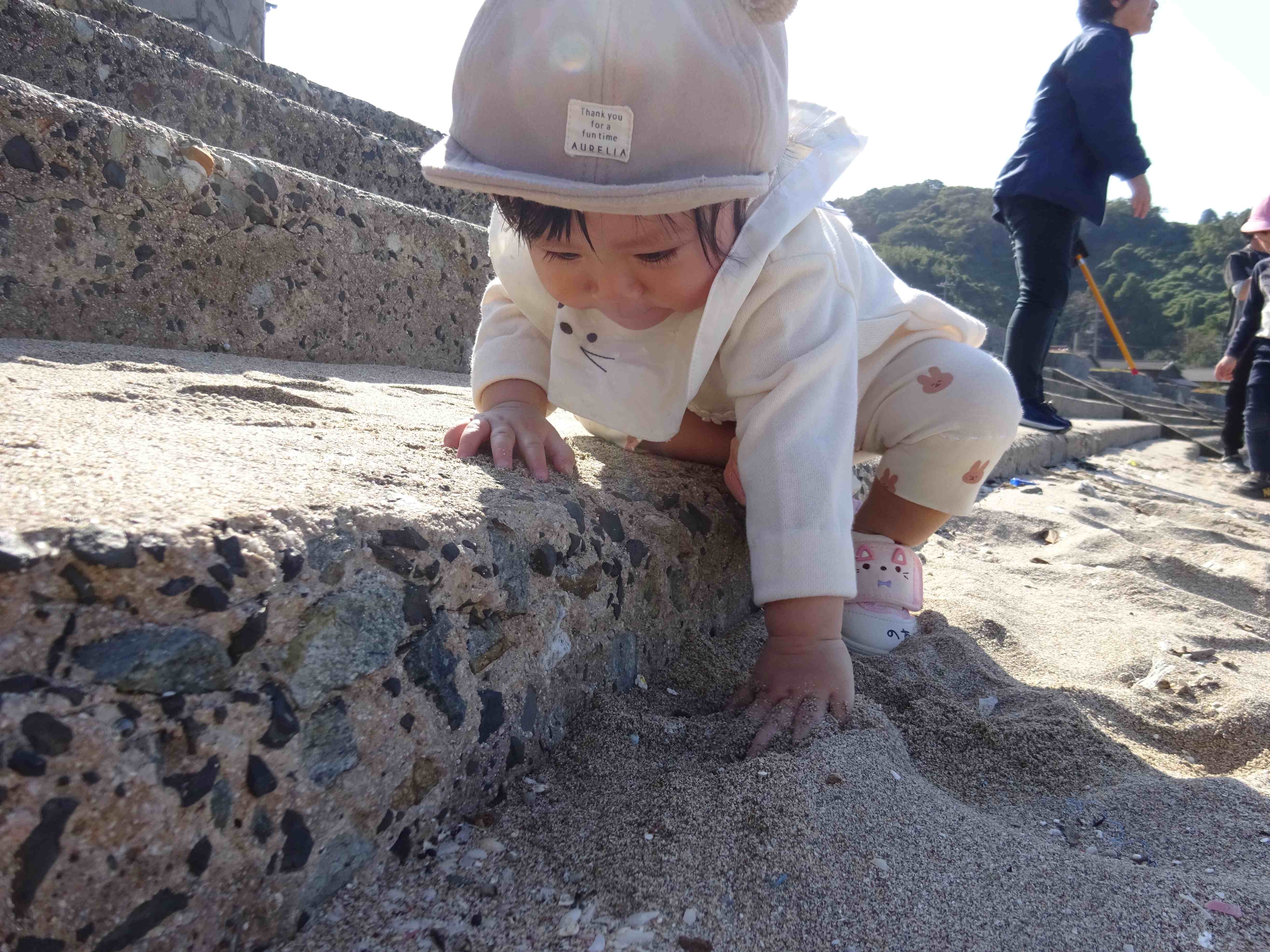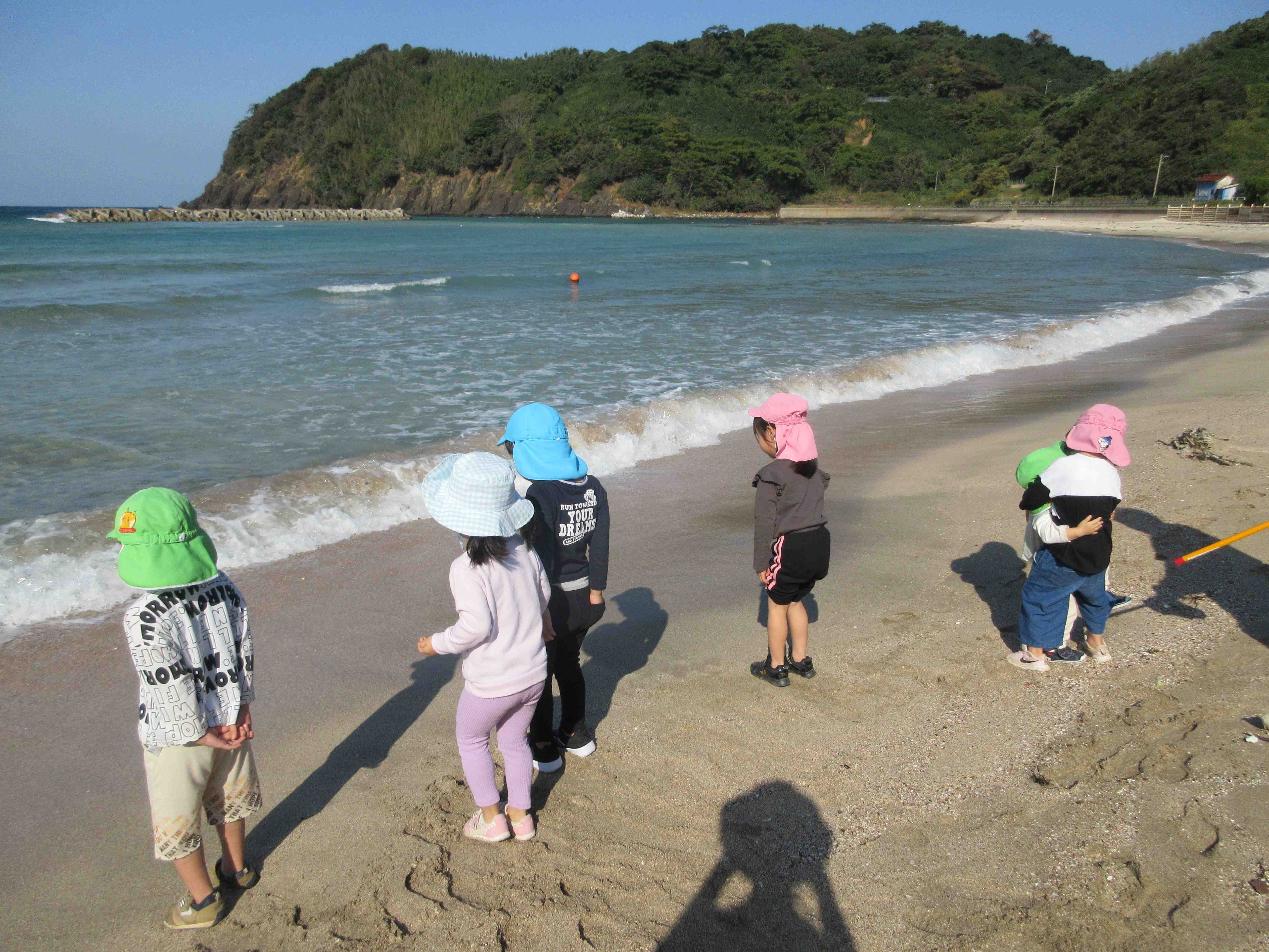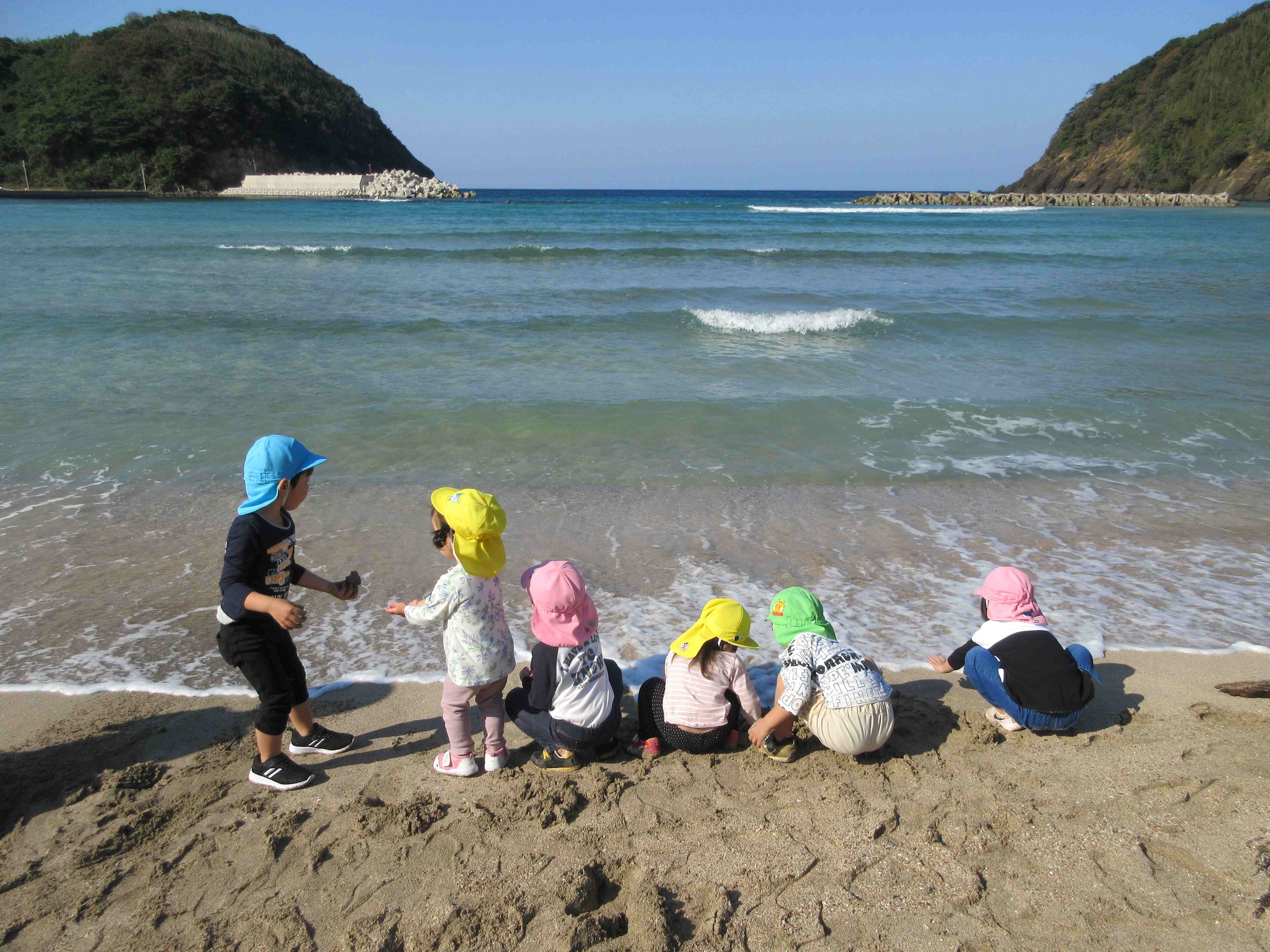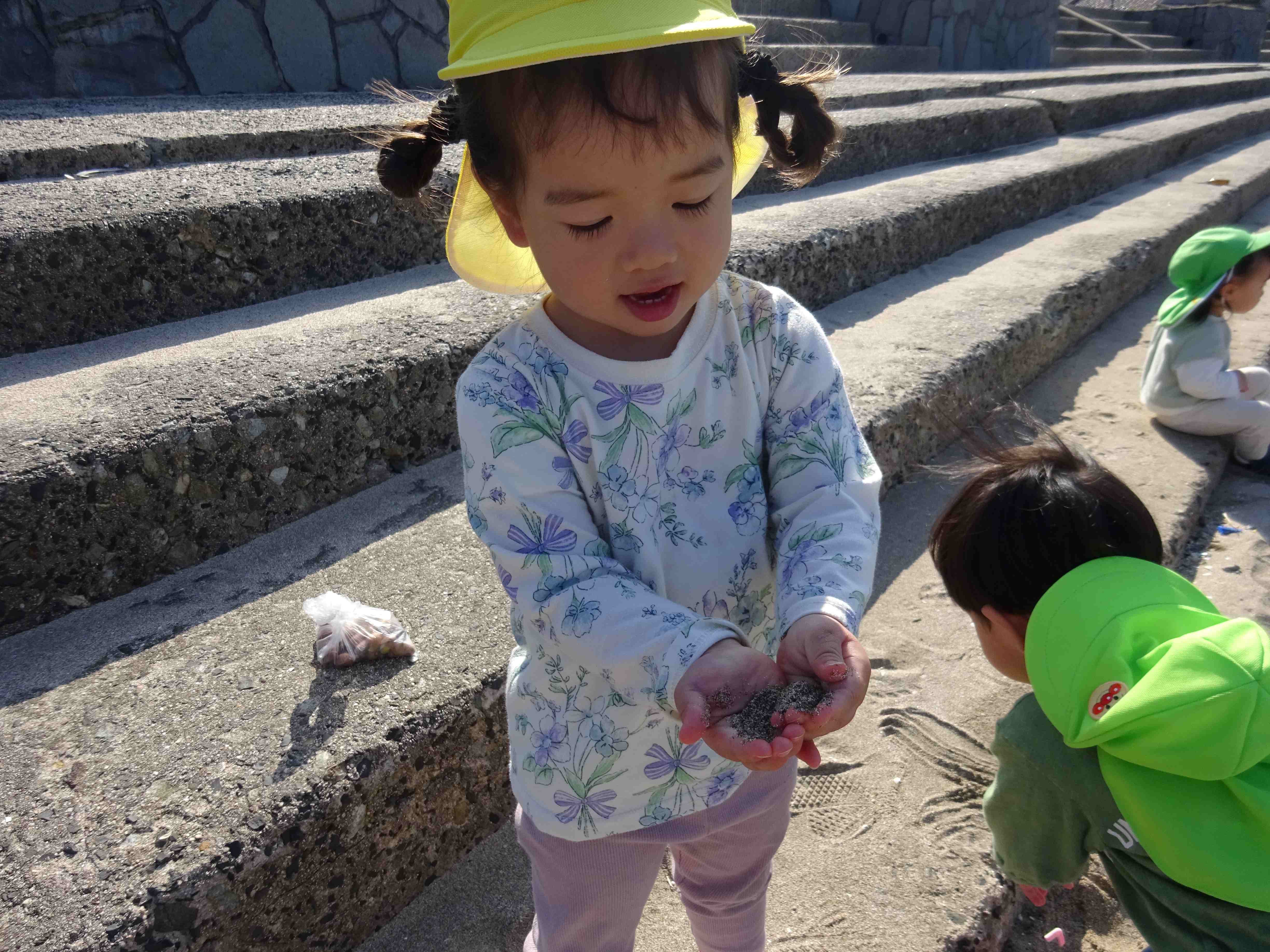 11月とは思えないほどの晴天に恵まれ、全園児で小波海岸へ散歩に行きました。この日は5歳児が就学前健診で欠席だったので、4歳児の子ども達が一番上のお兄さん・お姉さん!朝の会の時にその話をすると、「よーし、がんばるぞ」「やさしくしてあげないとね」と、嬉しそうにつぶやく声が聞こえました。道中は二人一組で手を繋いで歩き、車道側は4歳児さんが歩いてくれ、優しく手を引く姿が見られました。海岸では、波打ち際ギリギリ(数人入っている子もいましたが・・・)で穴を掘ったり、「キャー」と言って波から逃げたりして楽しんでいました。