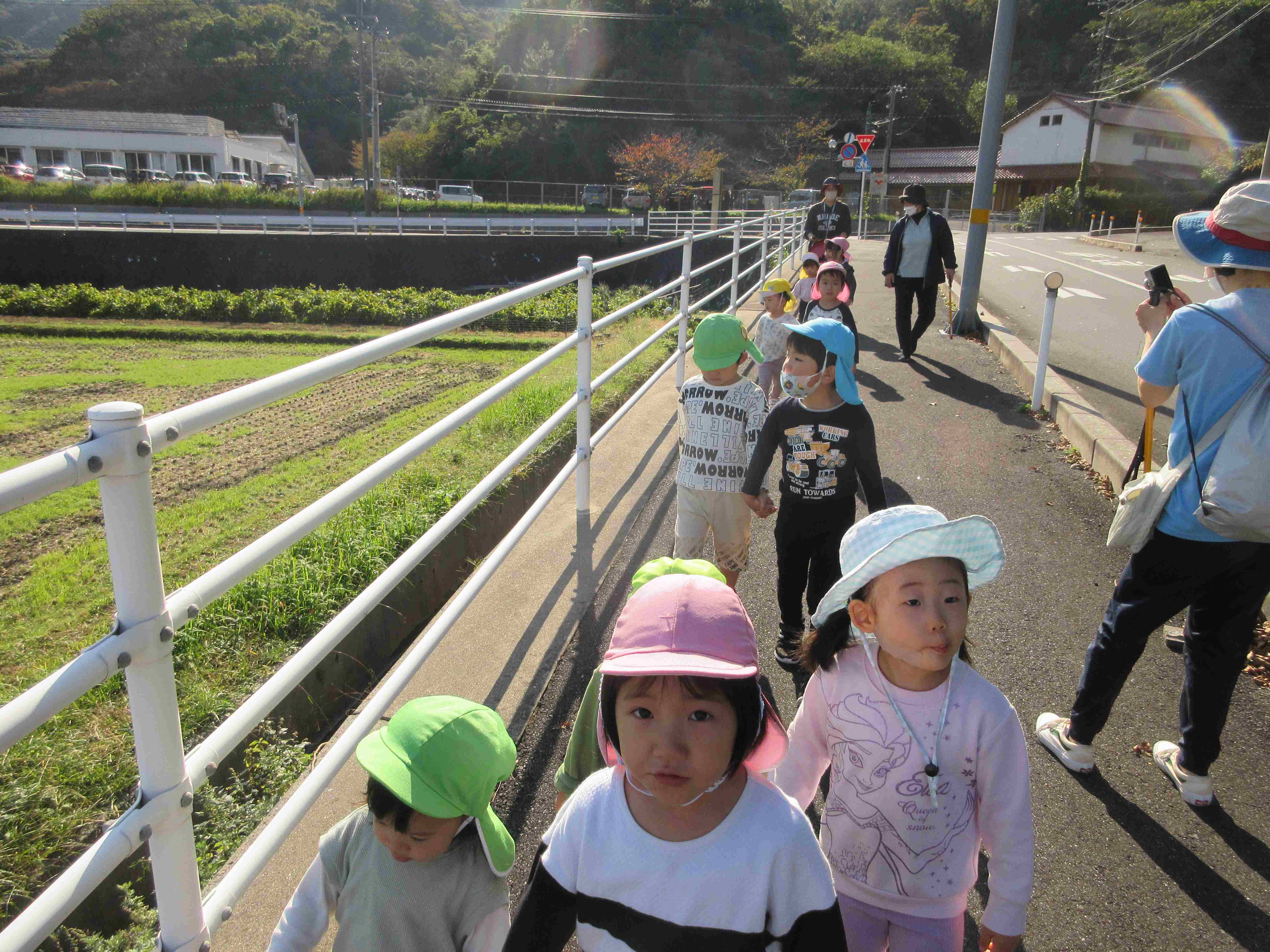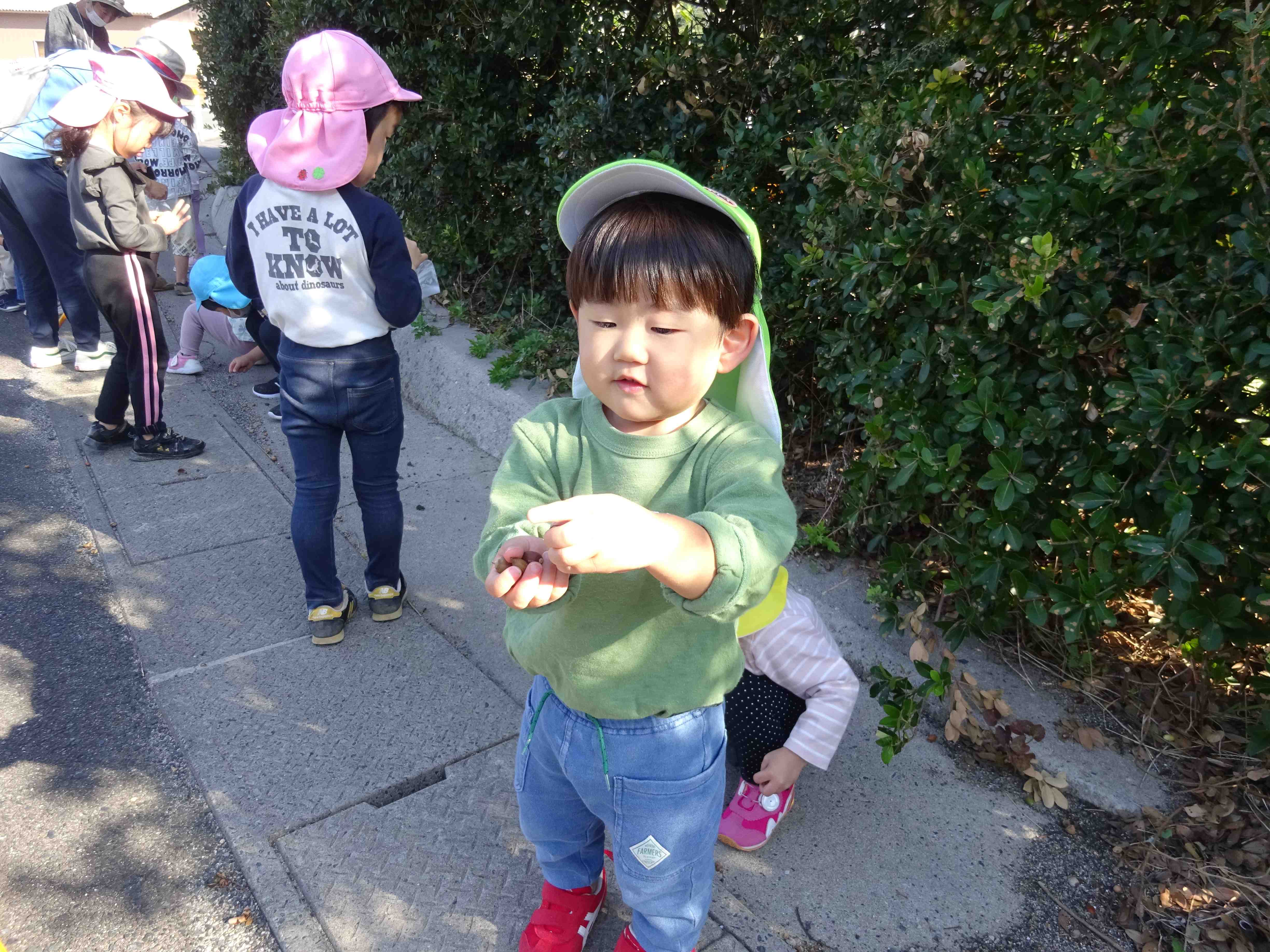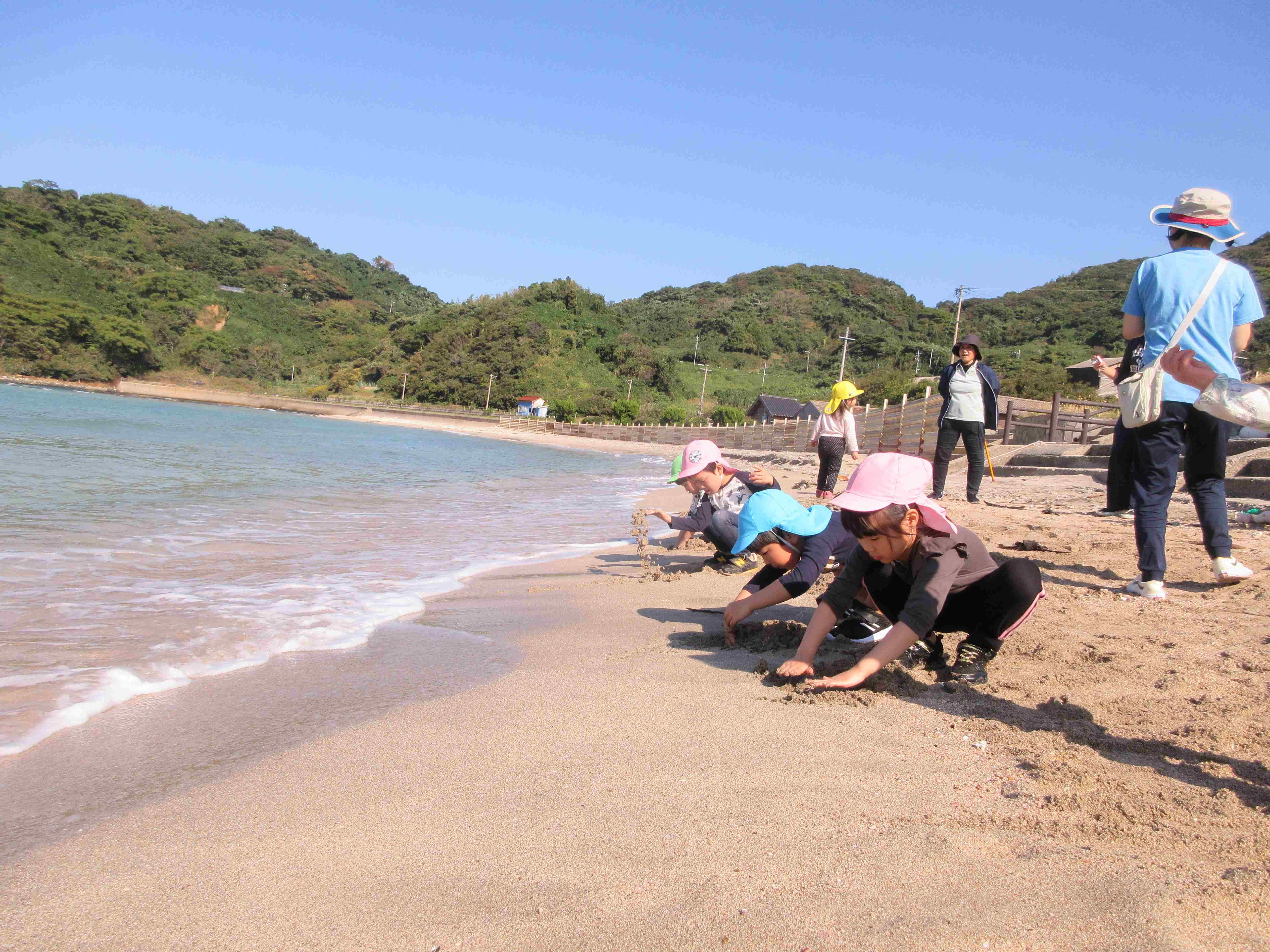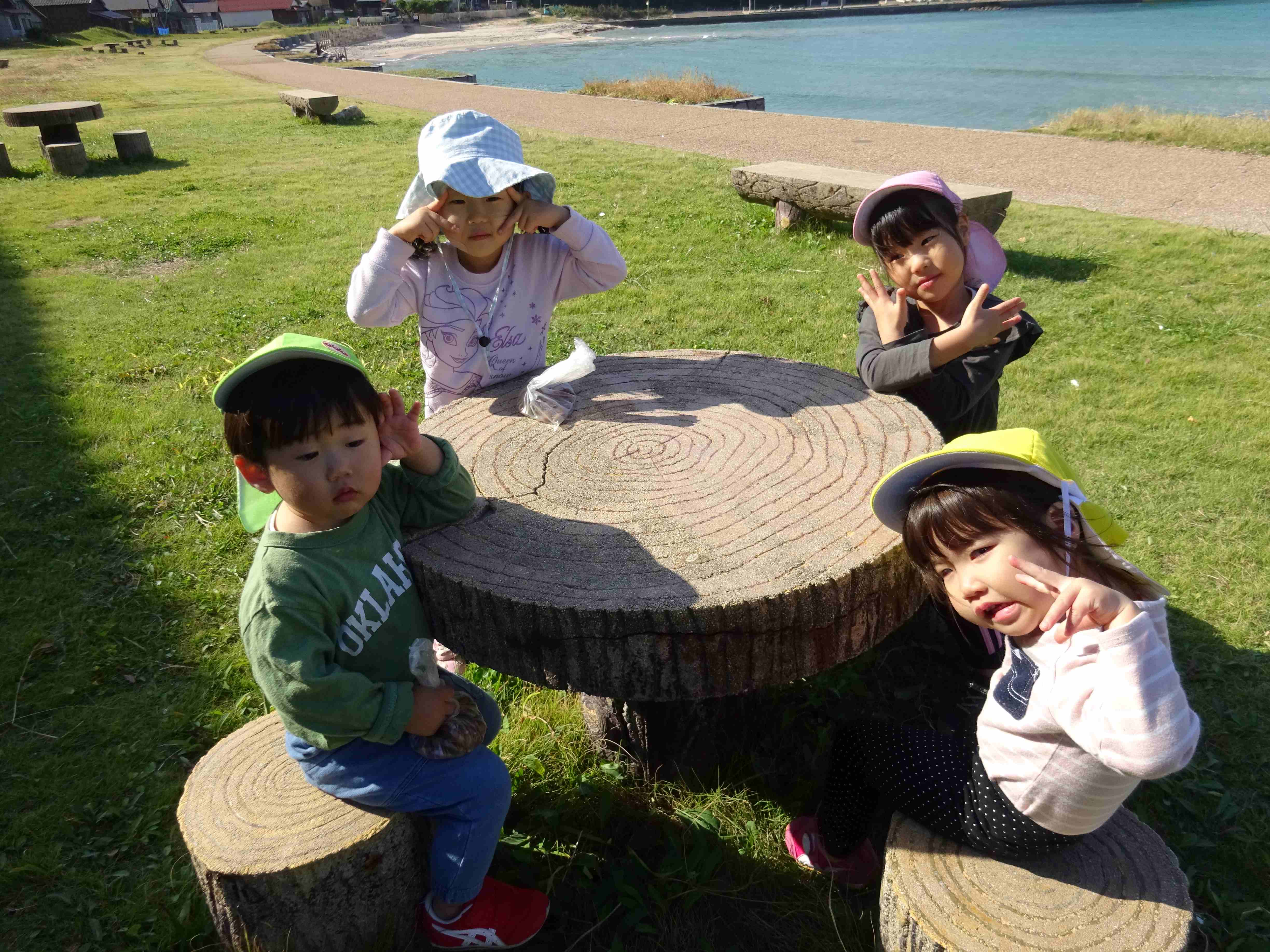 11月とは思えないほどの晴天に恵まれ、全園児で小波海岸へ散歩に行きました。この日は5歳児が就学前健診で欠席だったので、4歳児の子ども達が一番上のお兄さん・お姉さん!朝の会の時にその話をすると、「よーし、がんばるぞ」「やさしくしてあげないとね」と、嬉しそうにつぶやく声が聞こえました。道中は二人一組で手を繋いで歩き、車道側は4歳児さんが歩いてくれ、優しく手を引く姿が見られました。海岸では、波打ち際ギリギリ(数人入っている子もいましたが・・・)で穴を掘ったり、「キャー」と言って波から逃げたりして楽しんでいました。