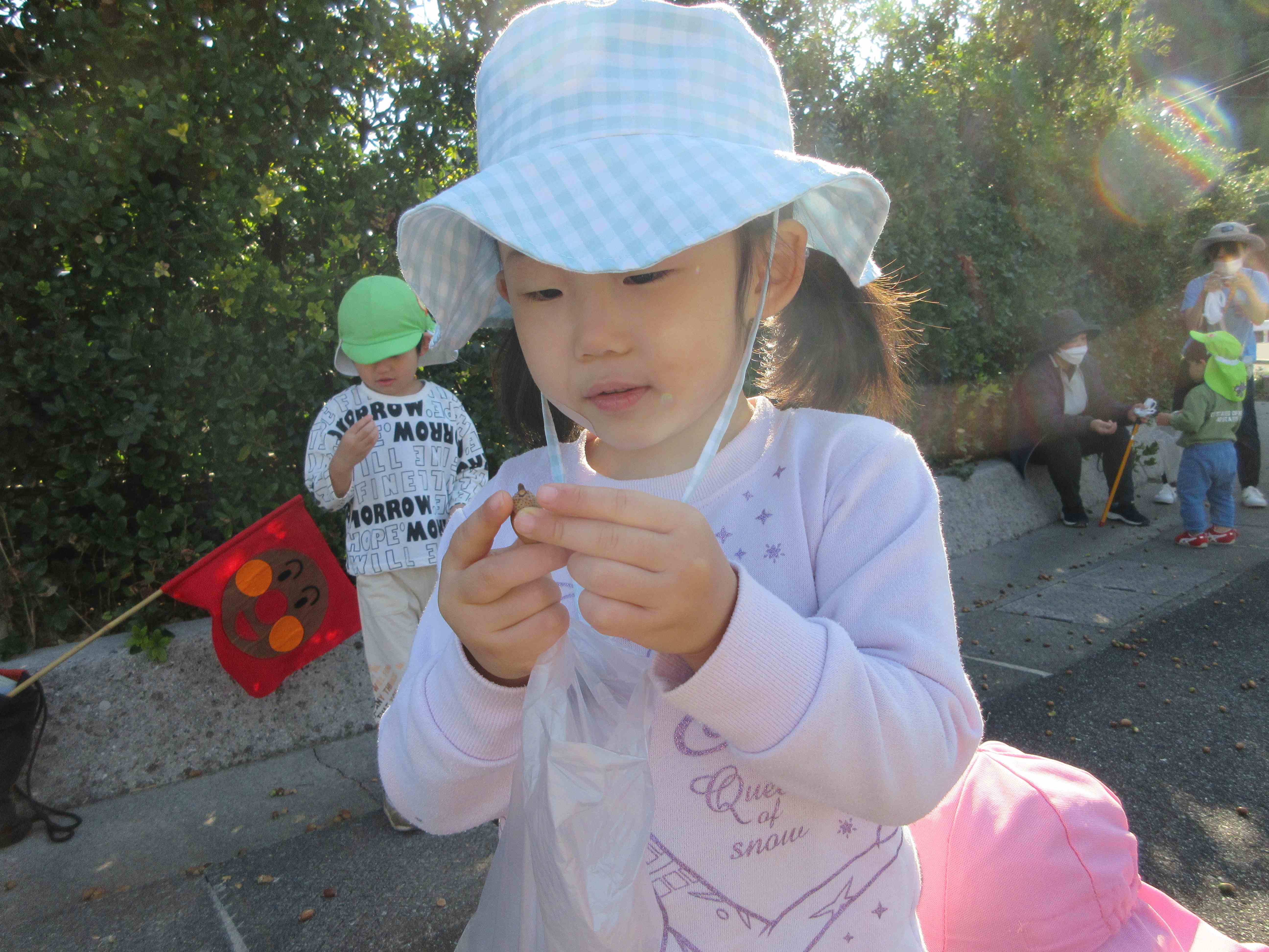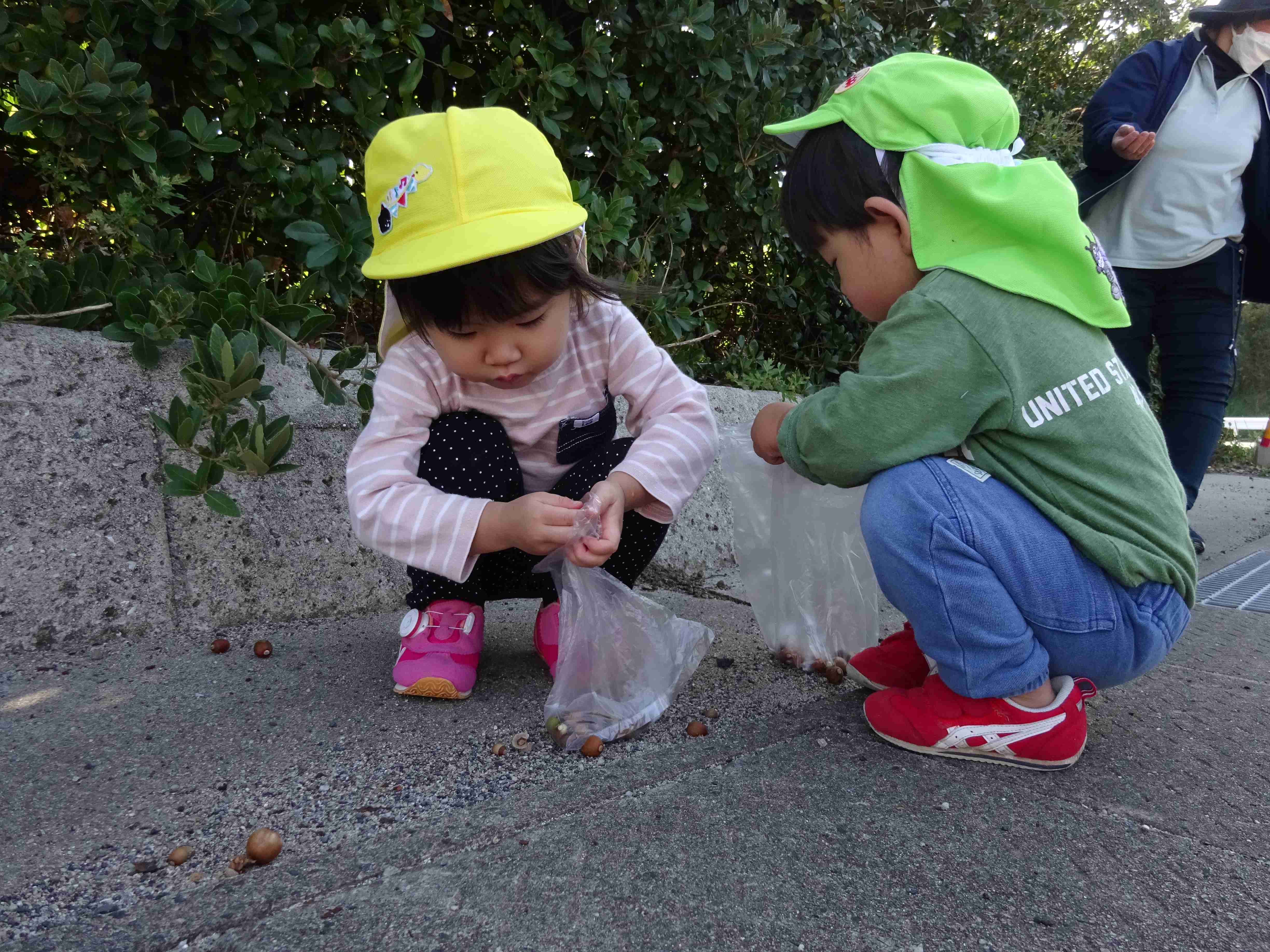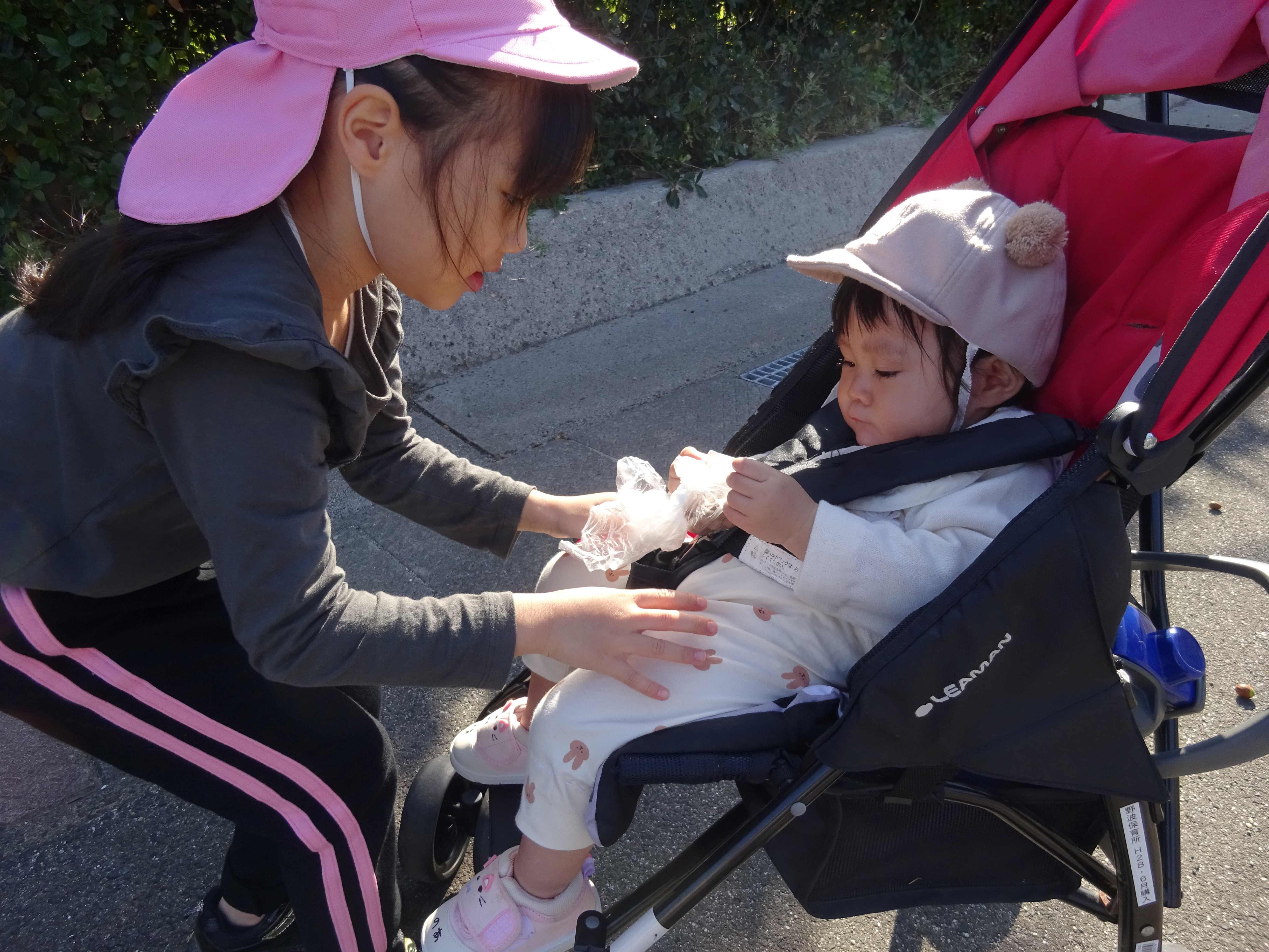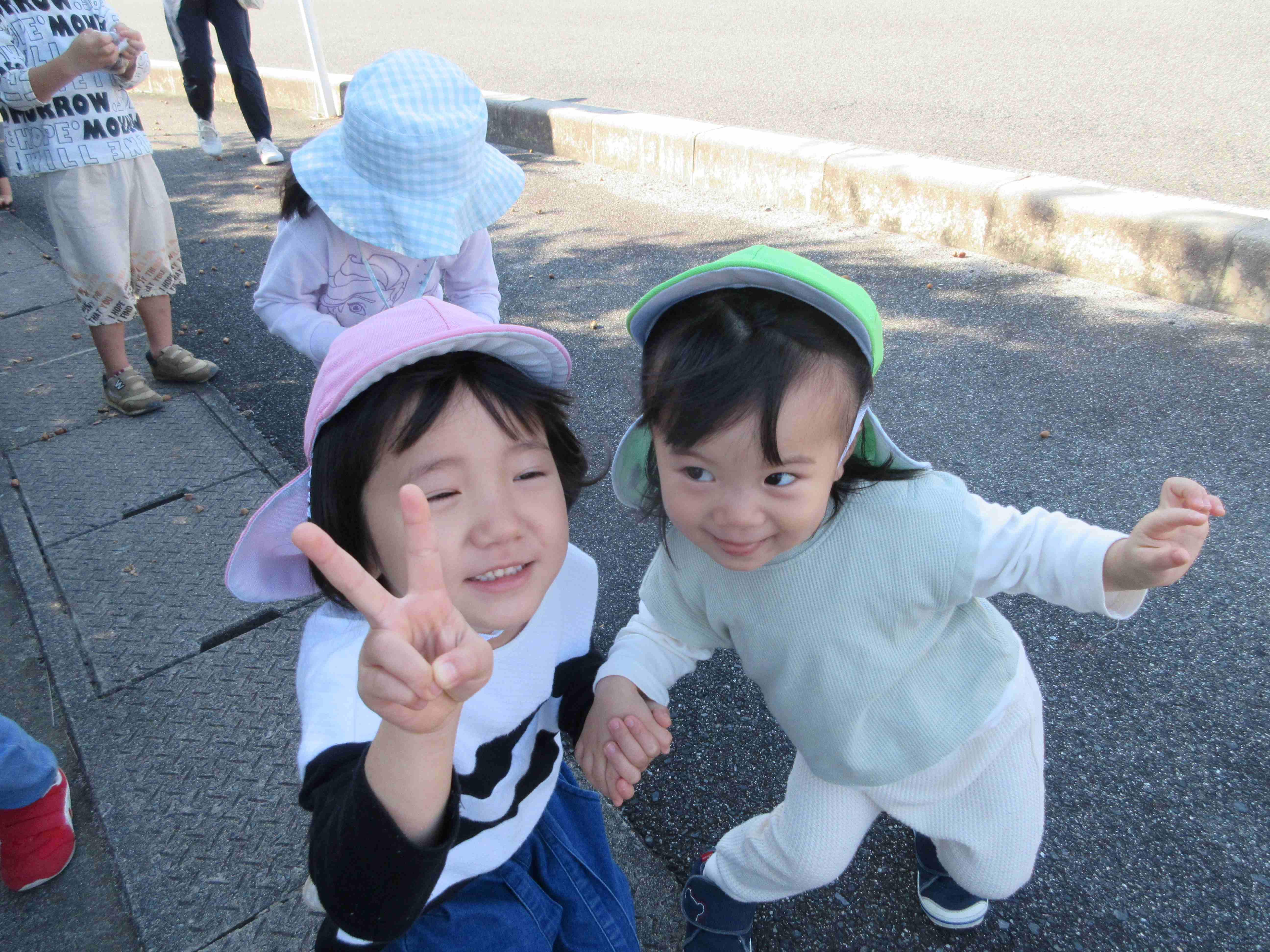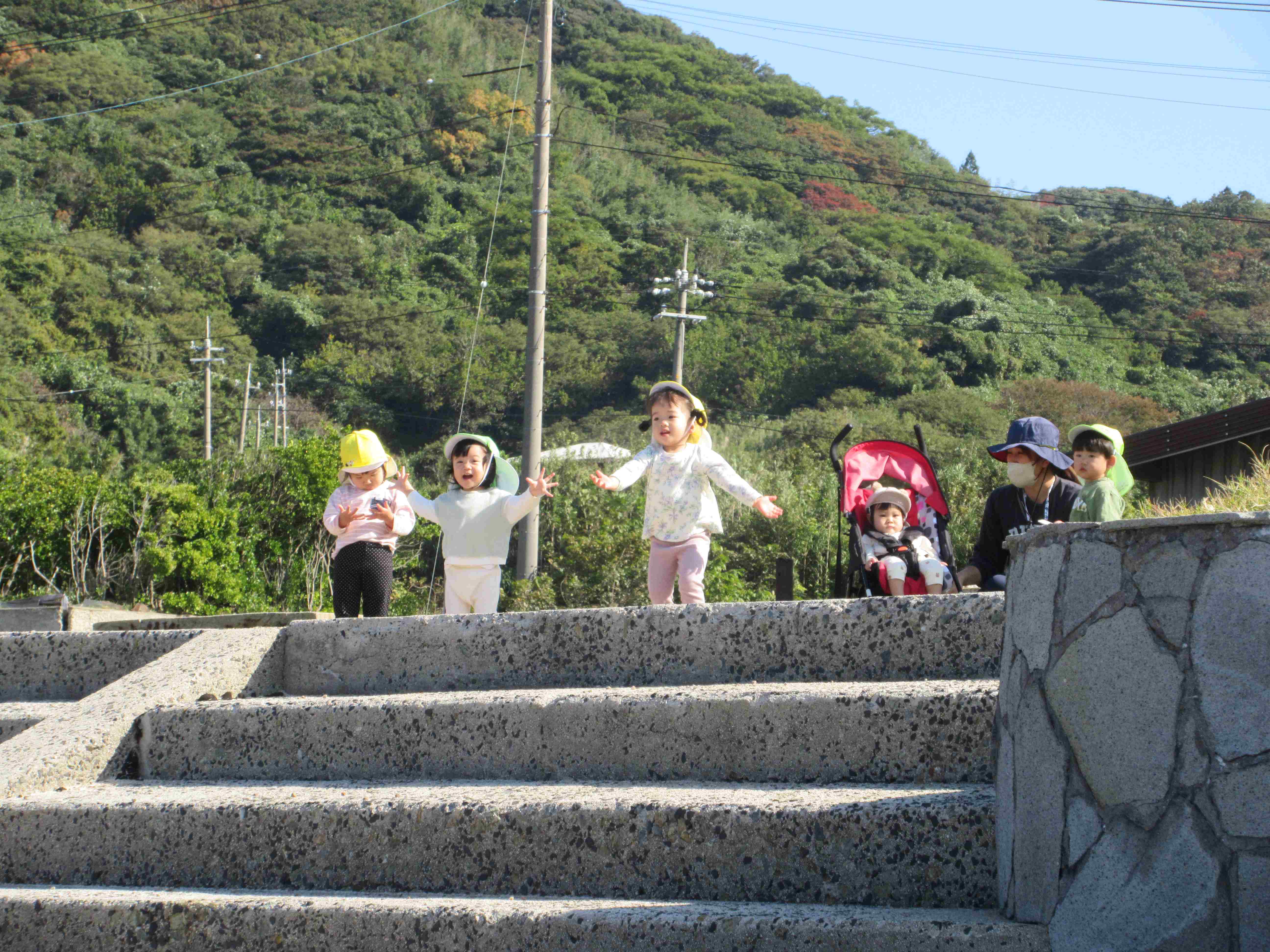 11月とは思えないほどの晴天に恵まれ、全園児で小波海岸へ散歩に行きました。この日は5歳児が就学前健診で欠席だったので、4歳児の子ども達が一番上のお兄さん・お姉さん!朝の会の時にその話をすると、「よーし、がんばるぞ」「やさしくしてあげないとね」と、嬉しそうにつぶやく声が聞こえました。道中は二人一組で手を繋いで歩き、車道側は4歳児さんが歩いてくれ、優しく手を引く姿が見られました。海岸では、波打ち際ギリギリ(数人入っている子もいましたが・・・)で穴を掘ったり、「キャー」と言って波から逃げたりして楽しんでいました。