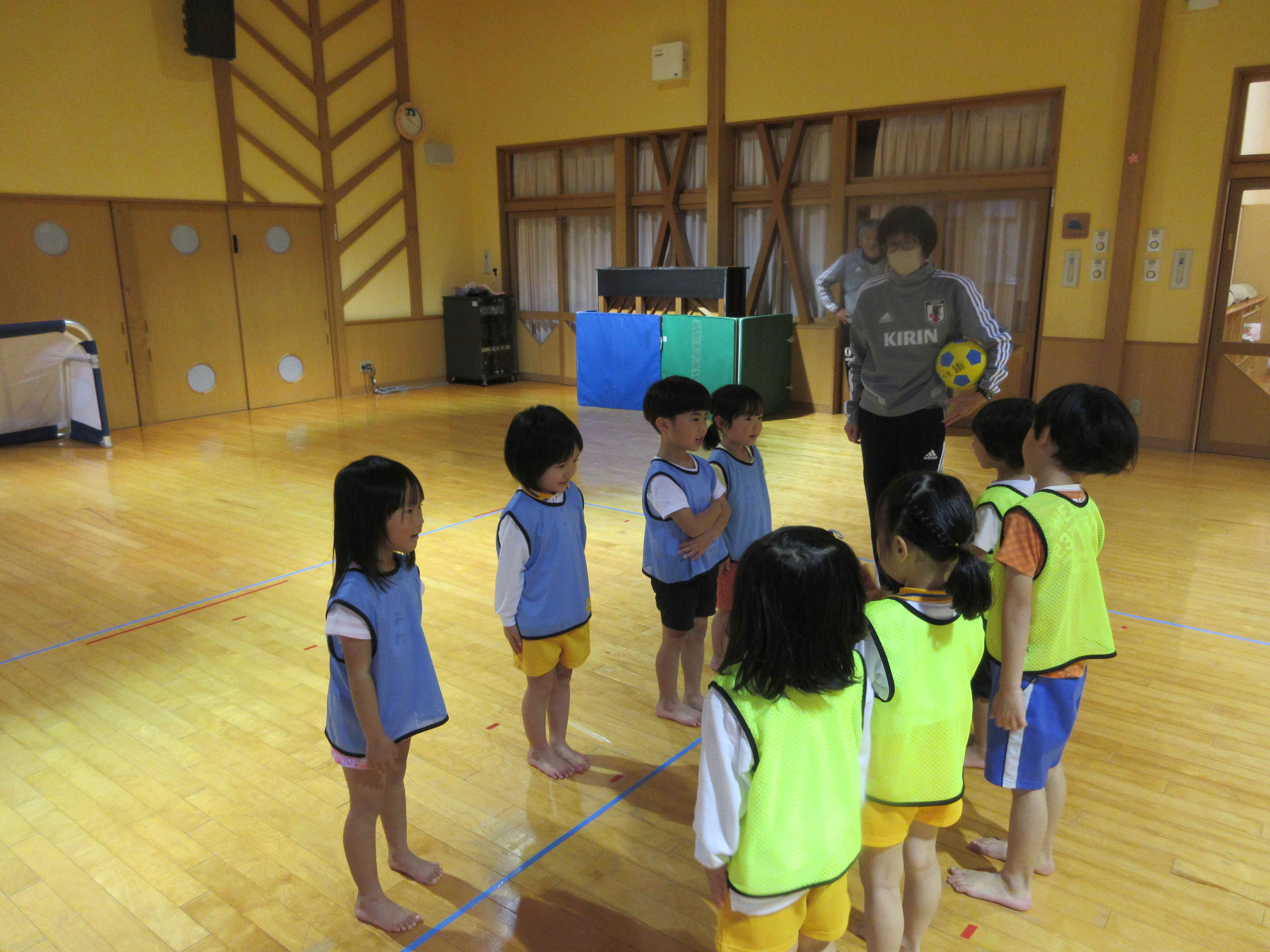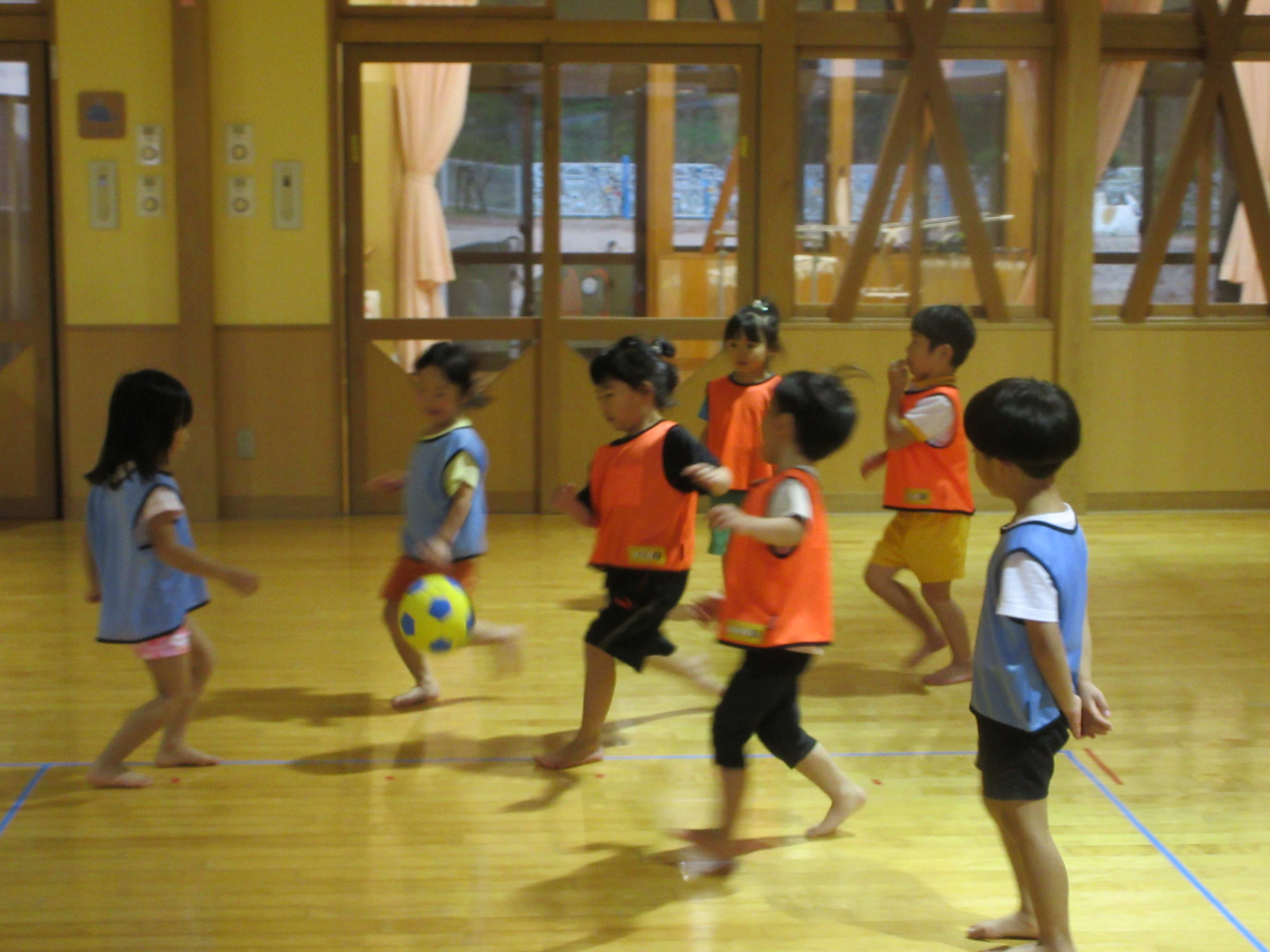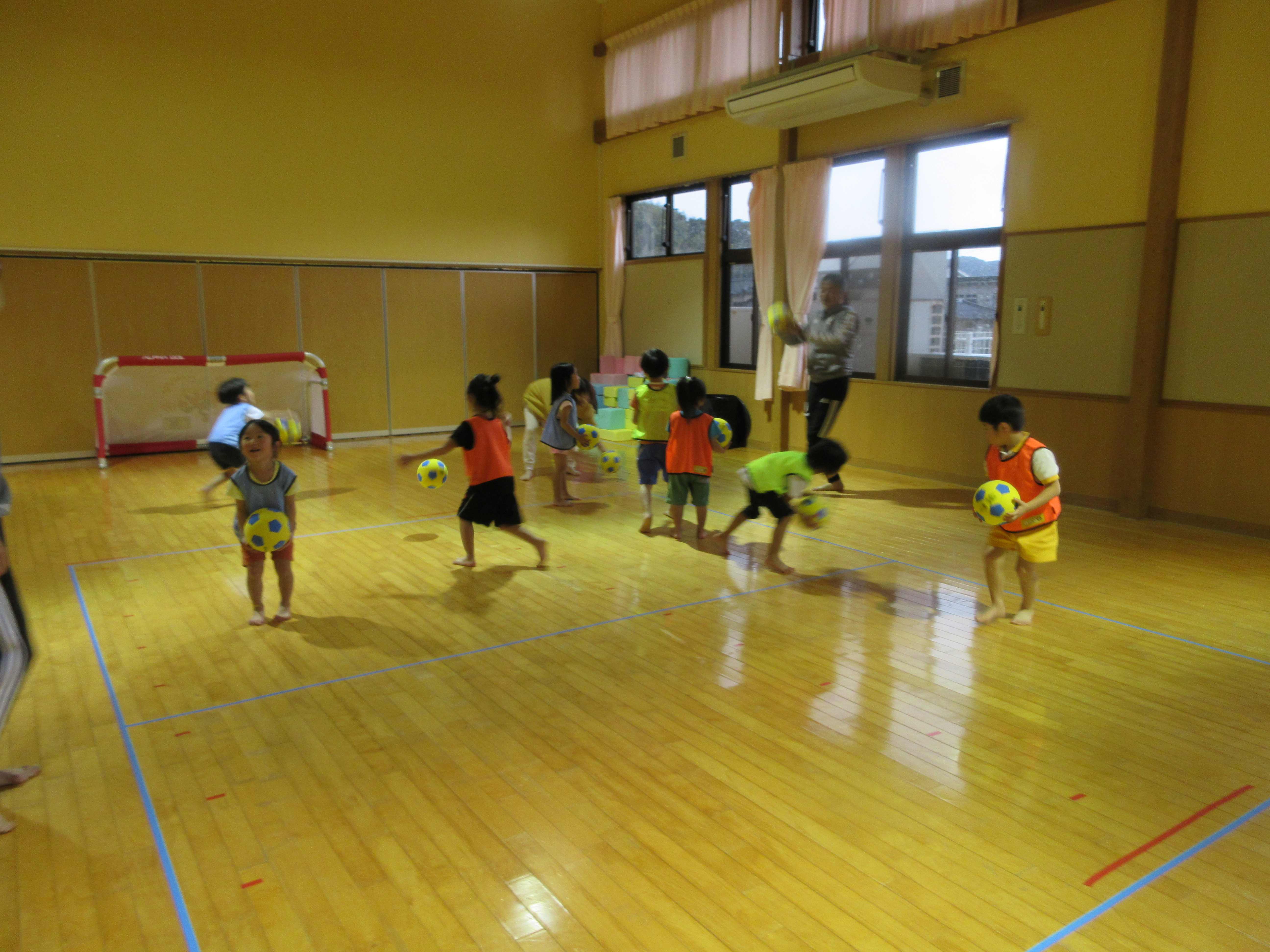 マリン保育所のいるか組の子ども達と交流をしました。ルールのあるボール遊びをしたり、チームに分かれて体を動かしたりして、楽しんでいました。3チームでの総当たり戦では、シュートが決まったりシュートを防いだりした時は「やった!」と大喜びし、大盛り上がりでした。