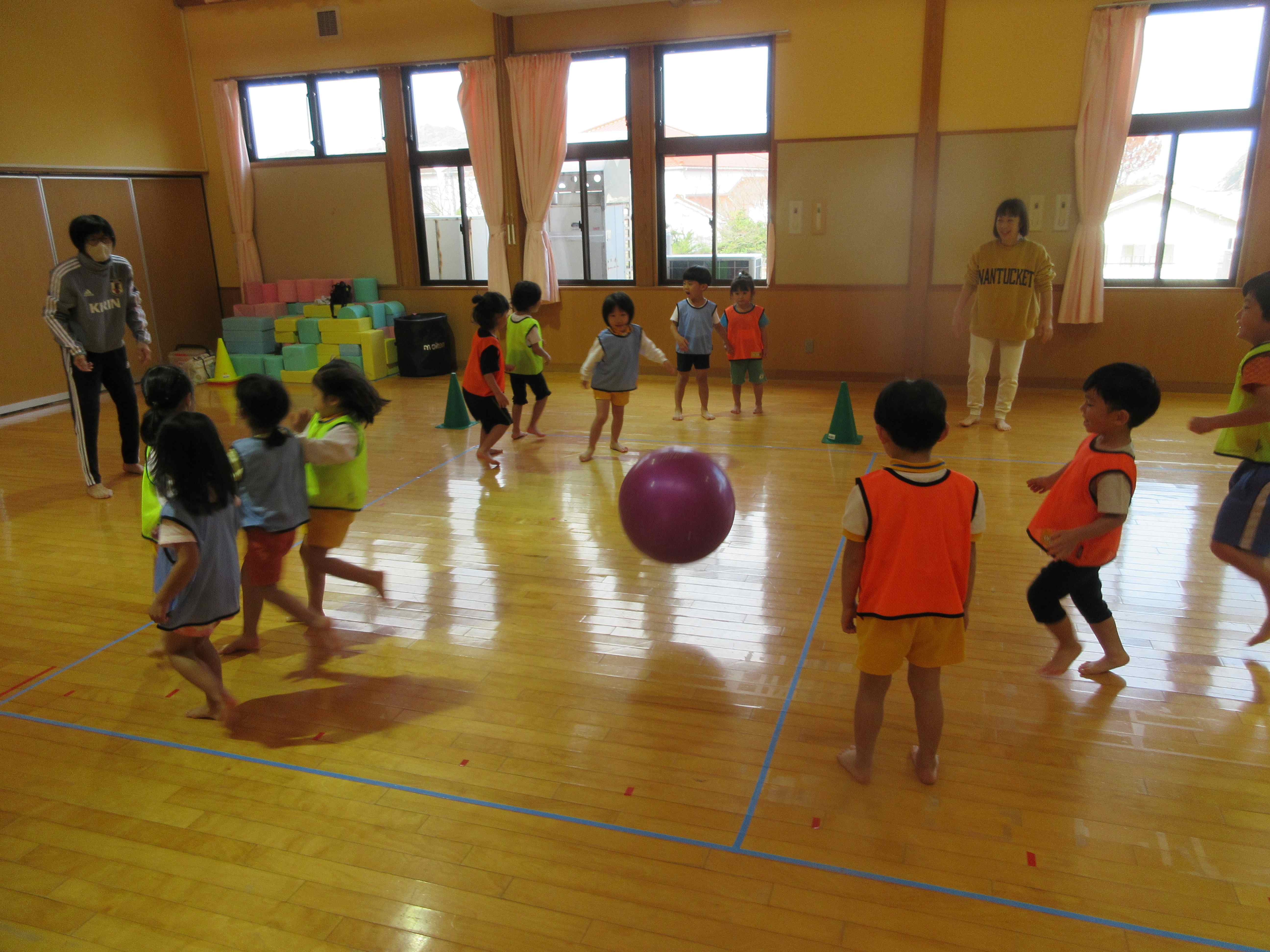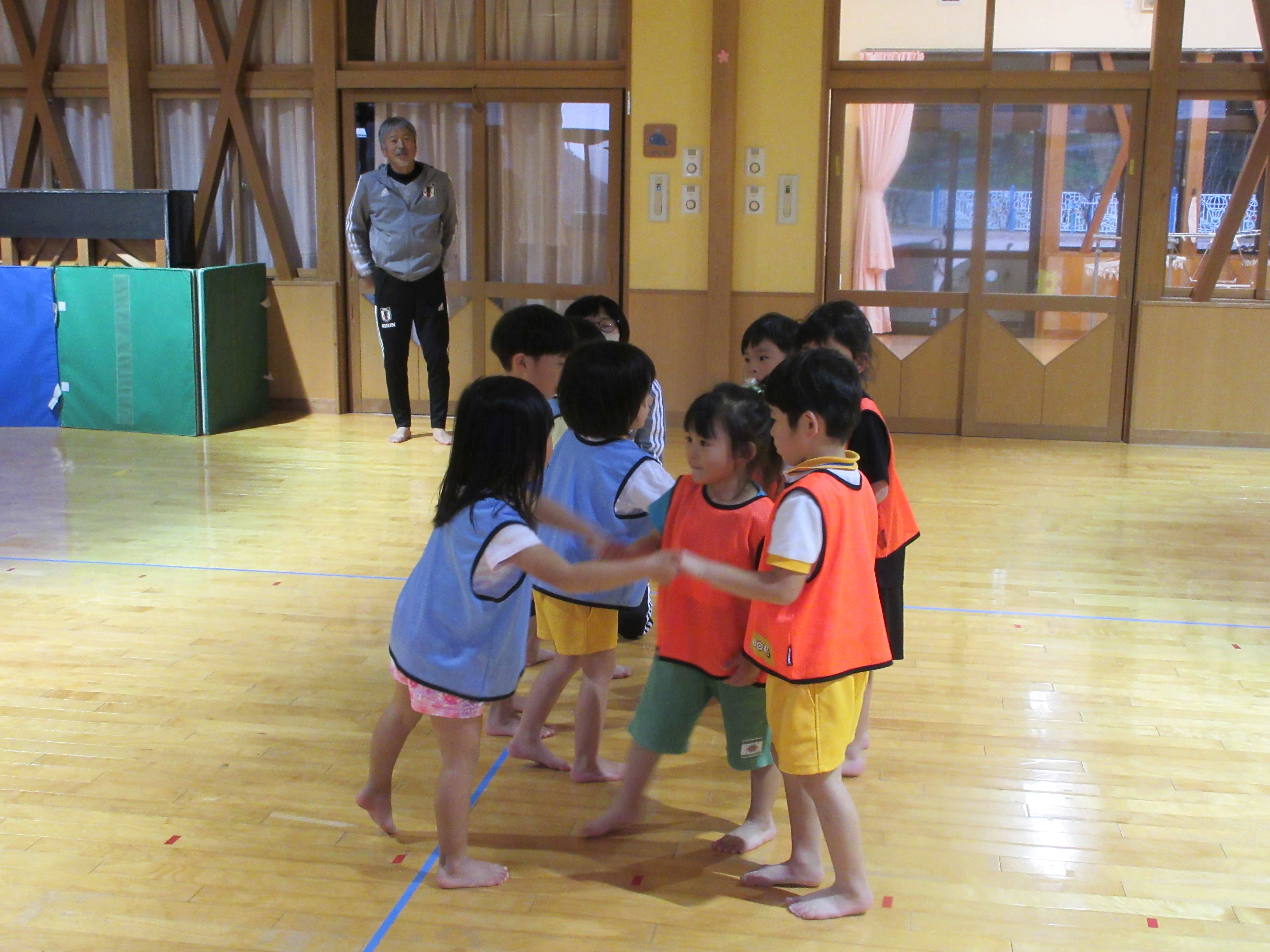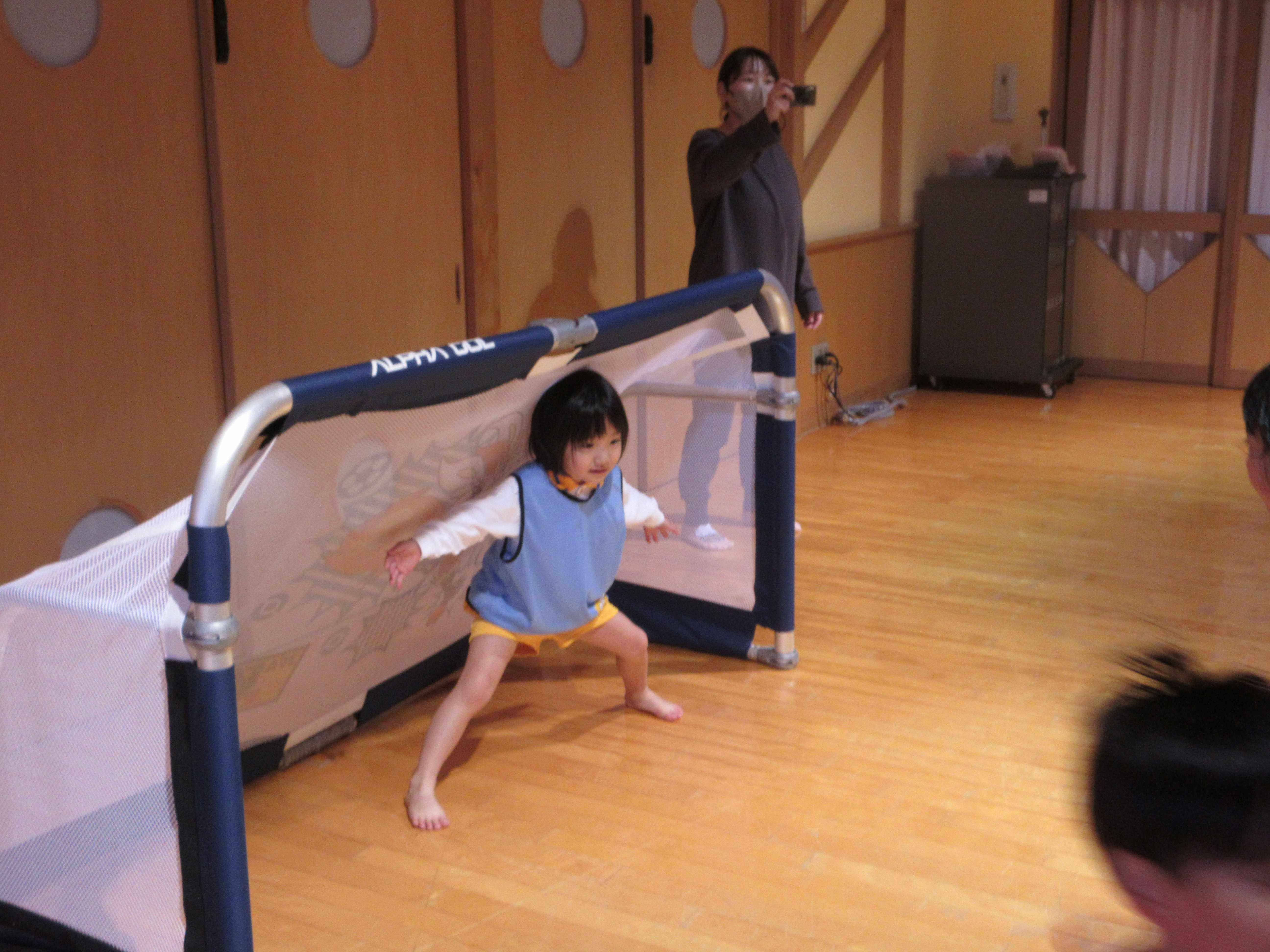 マリン保育所のいるか組の子ども達と交流をしました。ルールのあるボール遊びをしたり、チームに分かれて体を動かしたりして、楽しんでいました。3チームでの総当たり戦では、シュートが決まったりシュートを防いだりした時は「やった!」と大喜びし、大盛り上がりでした。