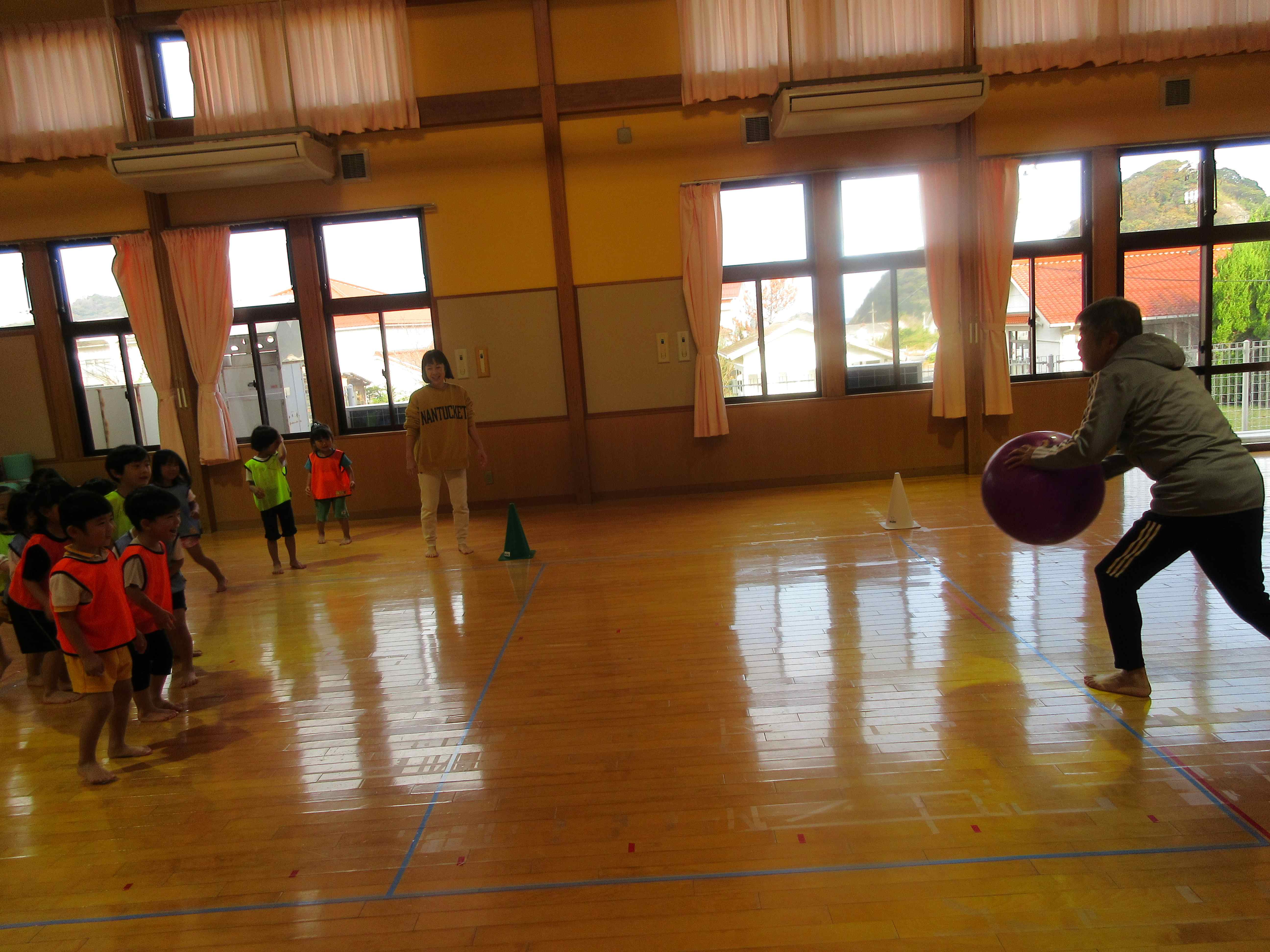 大玉を使ったコロコロドッヂ!「きゃー」「あたるー!」