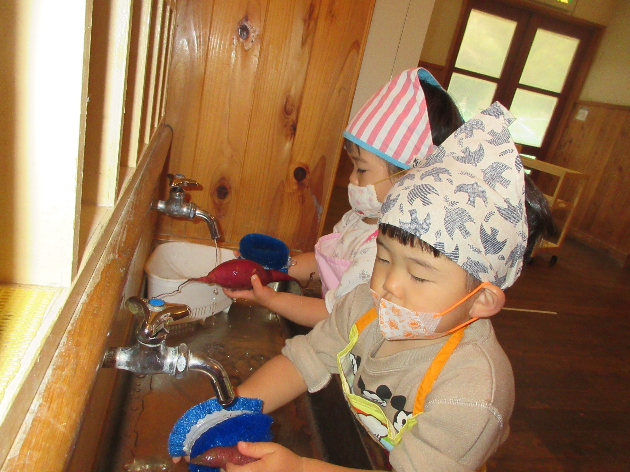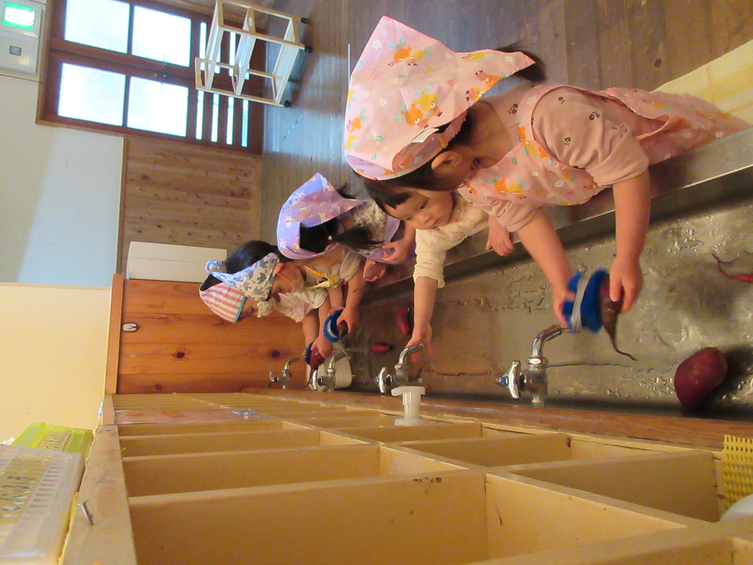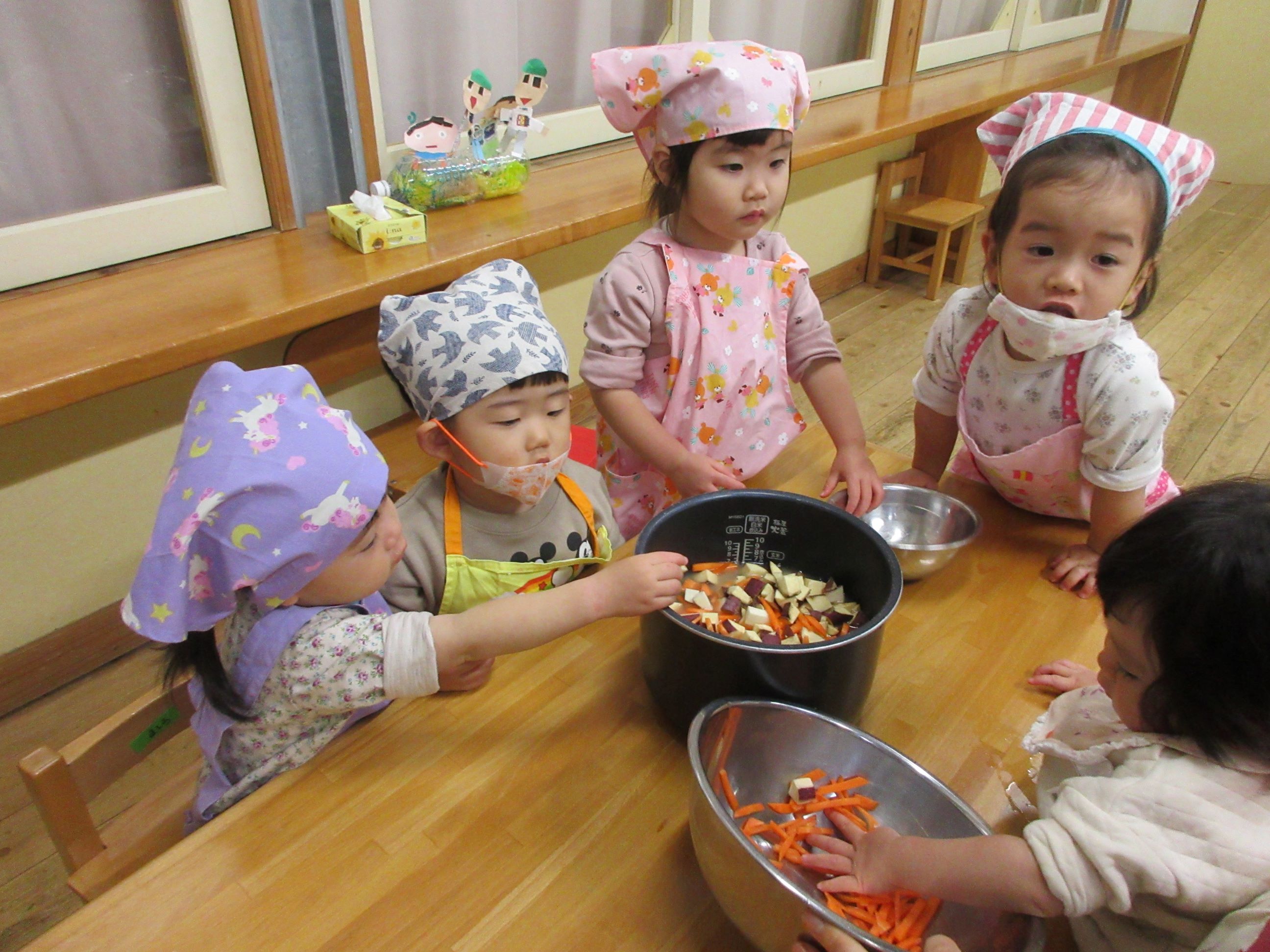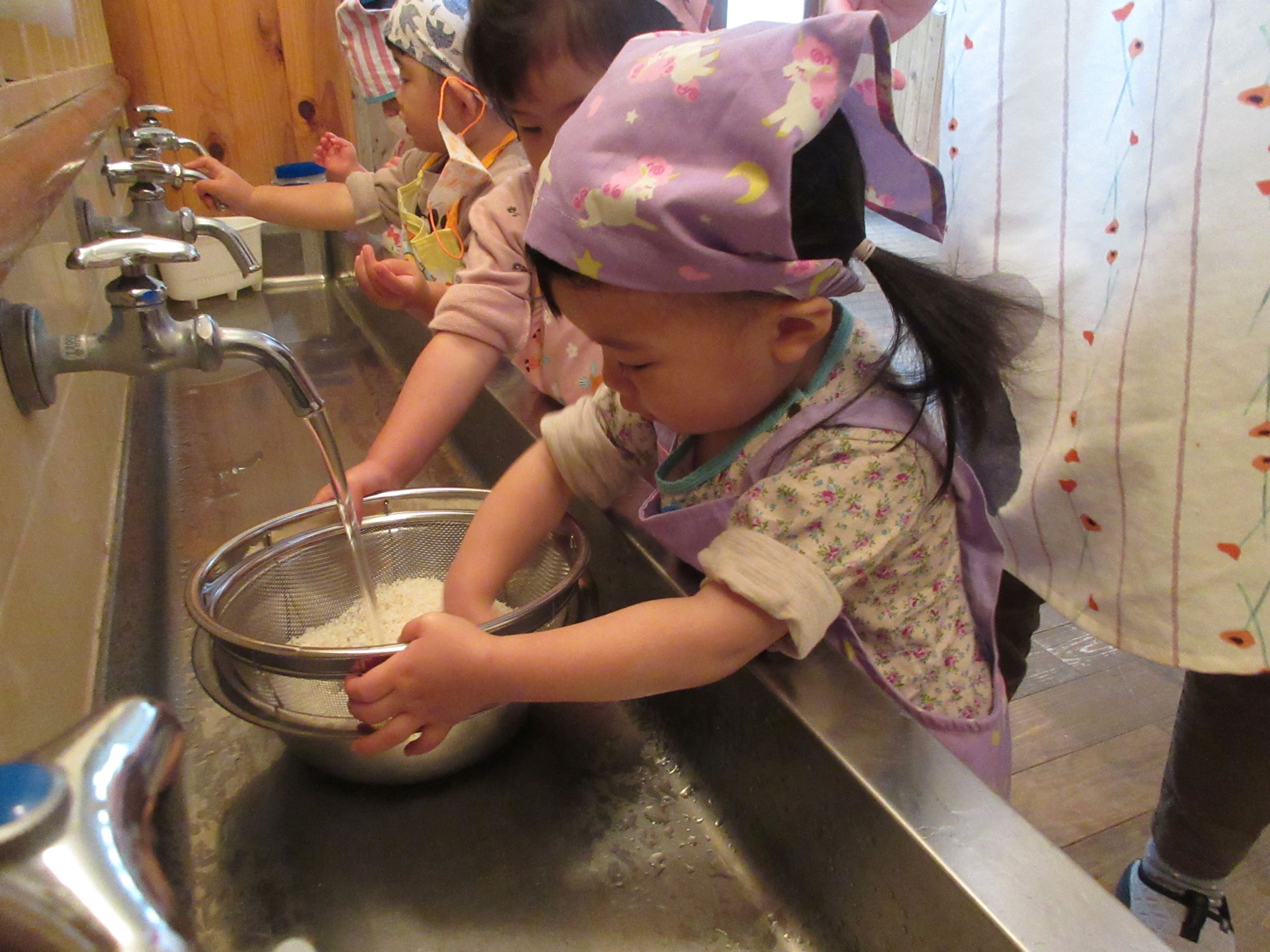 0,1,2歳児なので、芋を洗ったり、お米をといだり、切った材料を入れたりすることが主なお手伝いになりましたが、とても楽しそうにしていました。