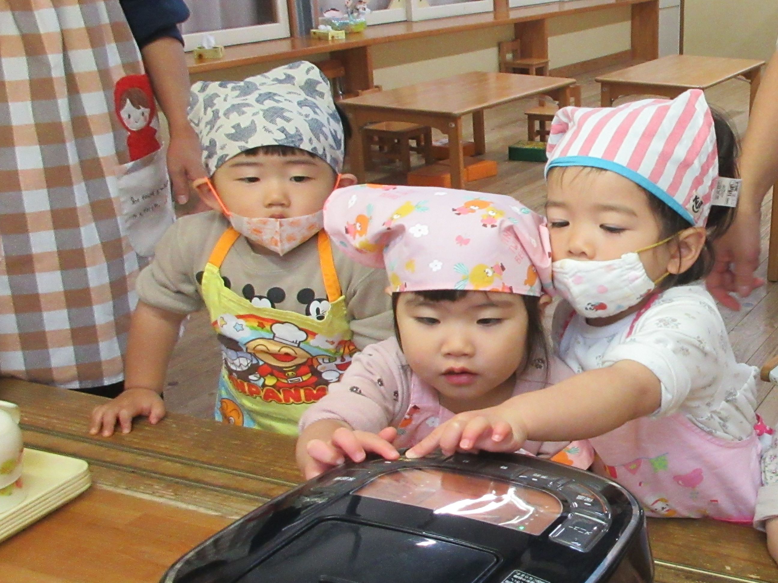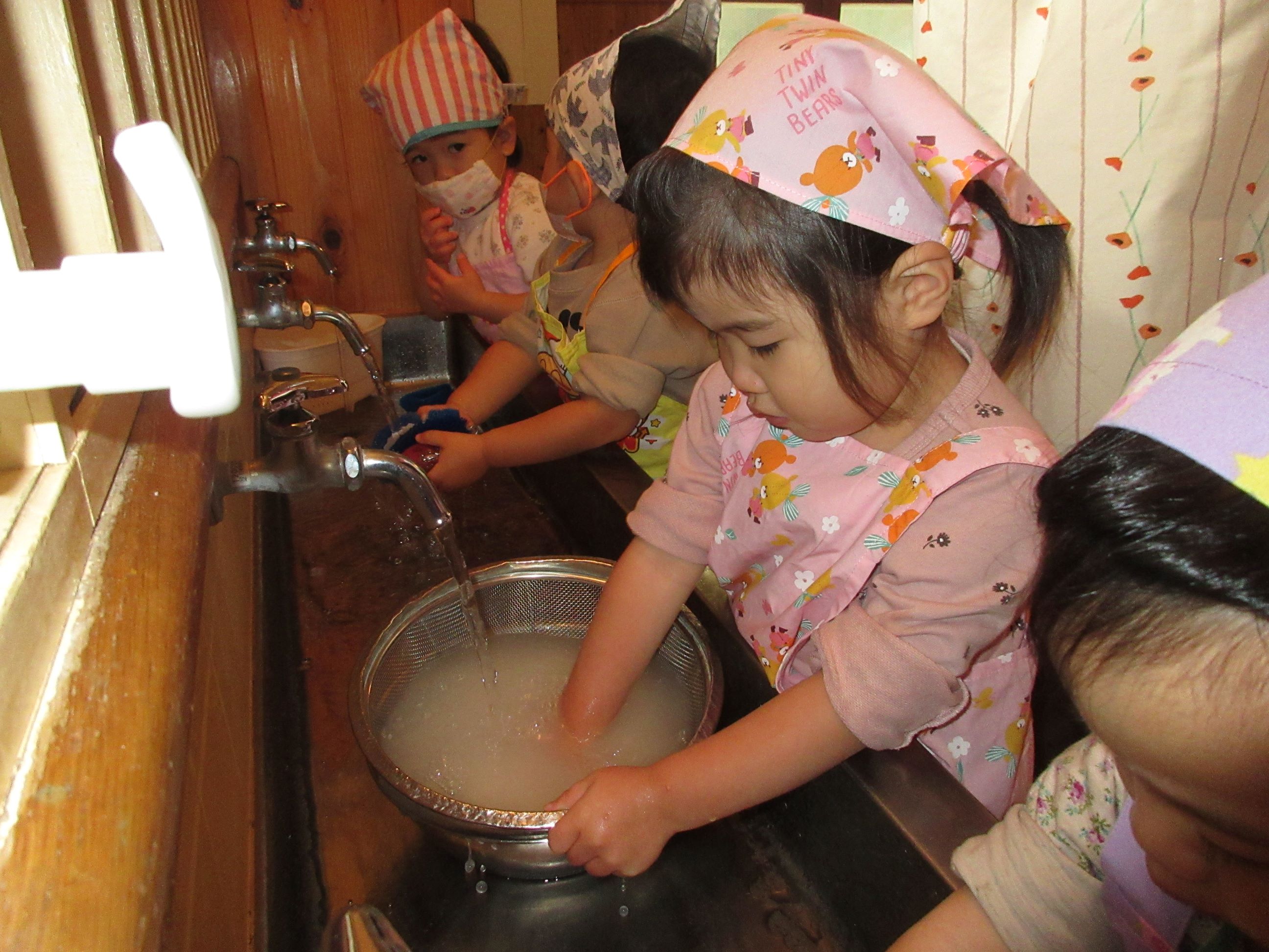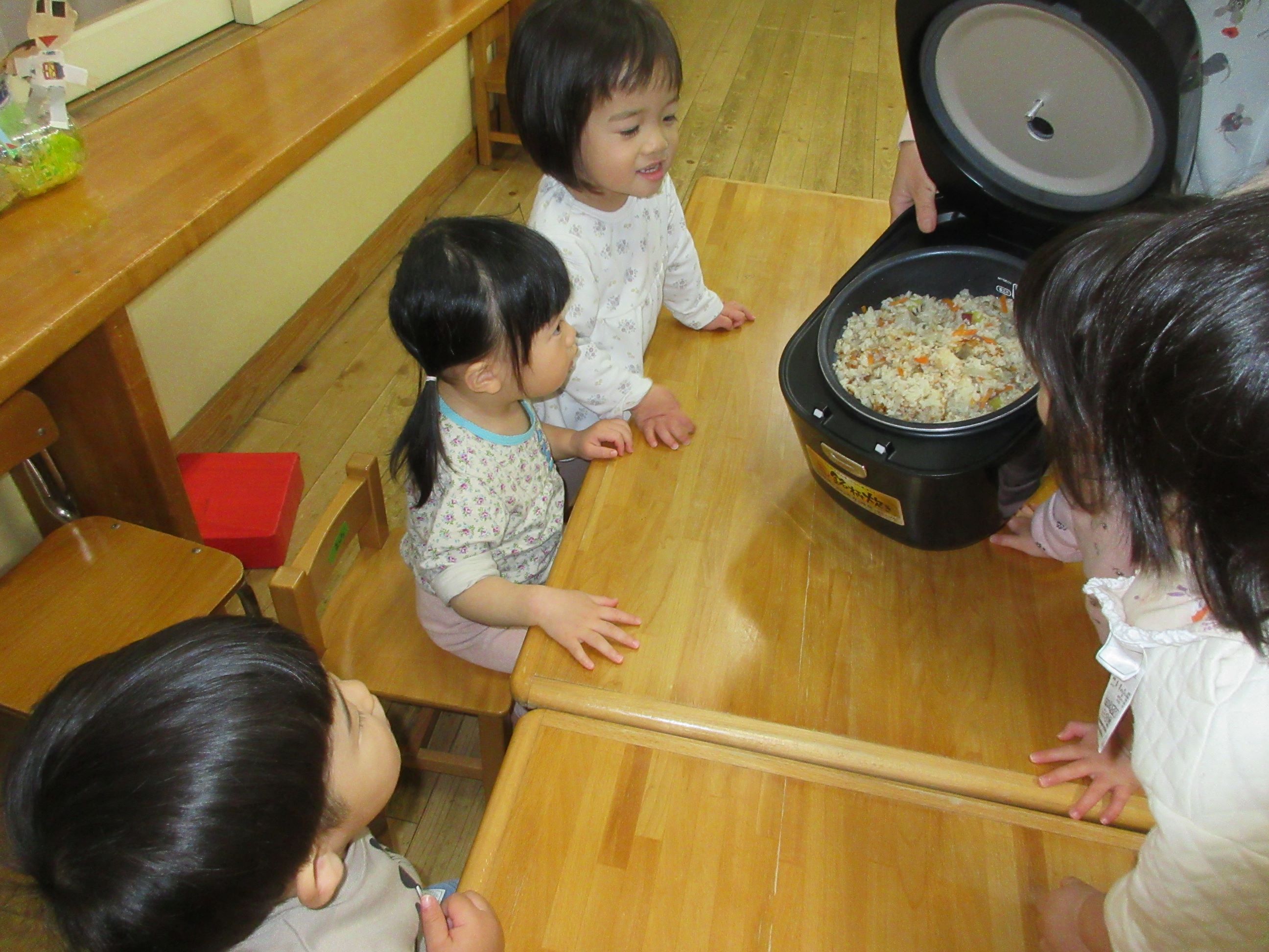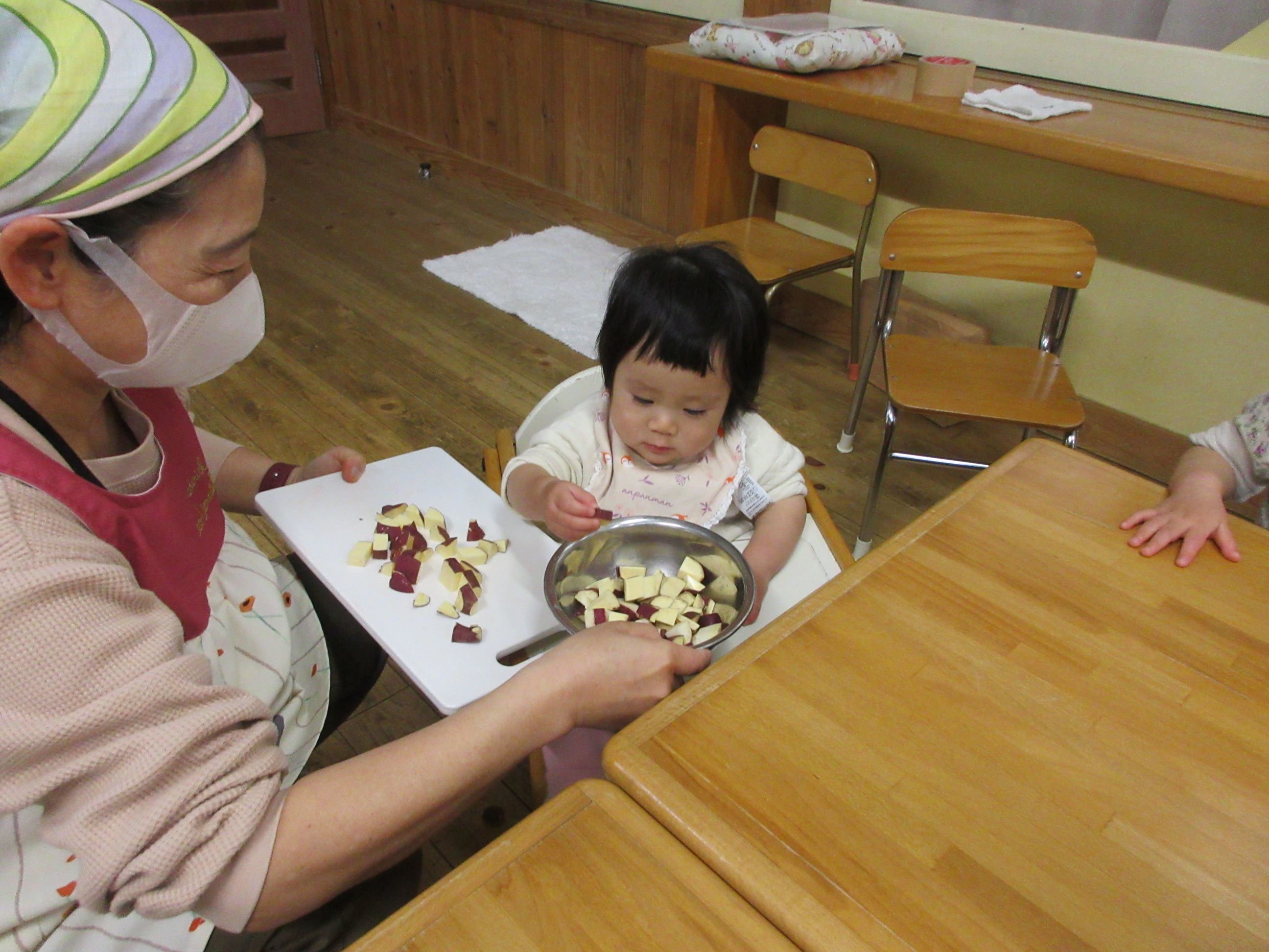 0,1,2歳児なので、芋を洗ったり、お米をといだり、切った材料を入れたりすることが主なお手伝いになりましたが、とても楽しそうにしていました。