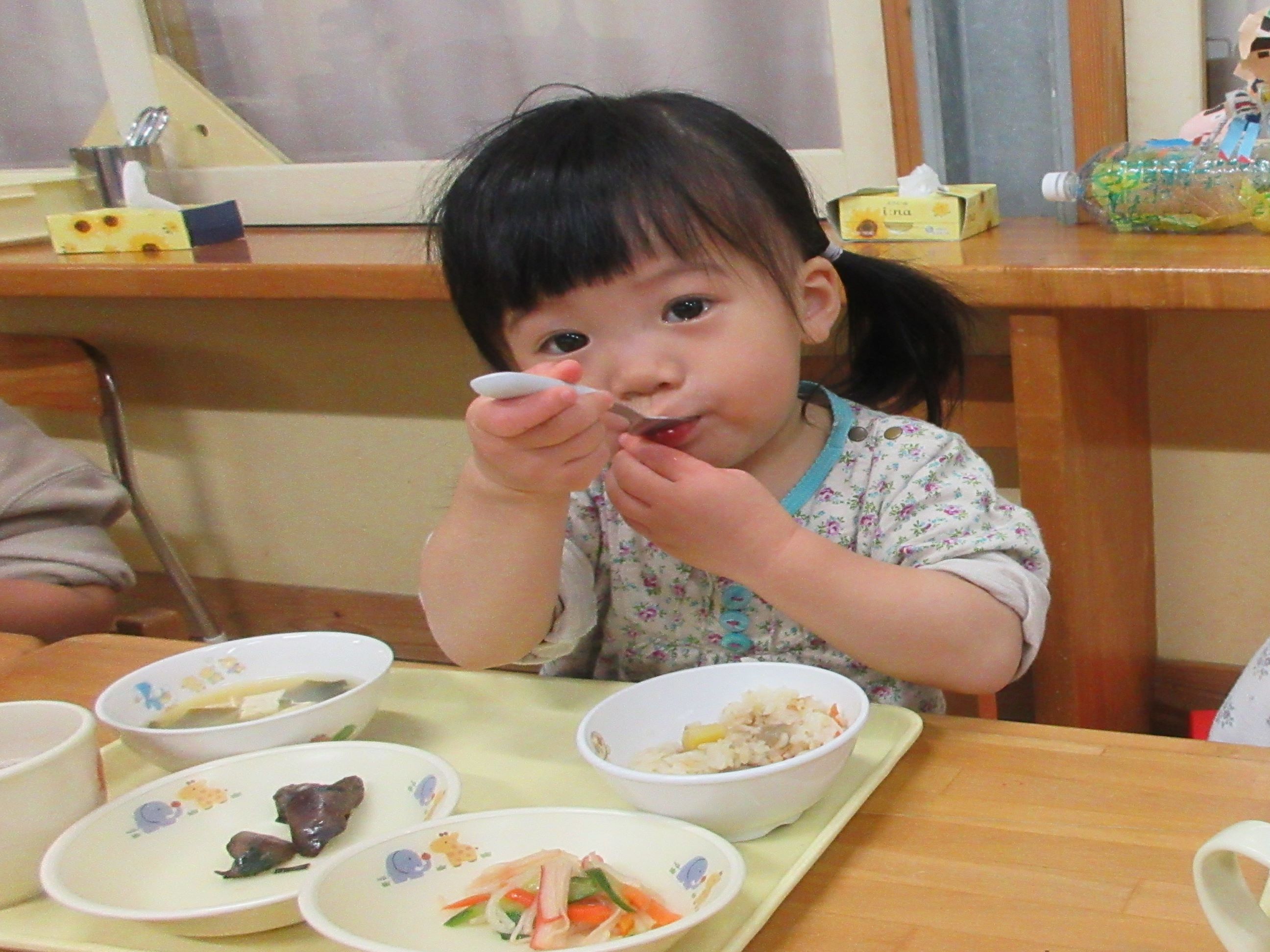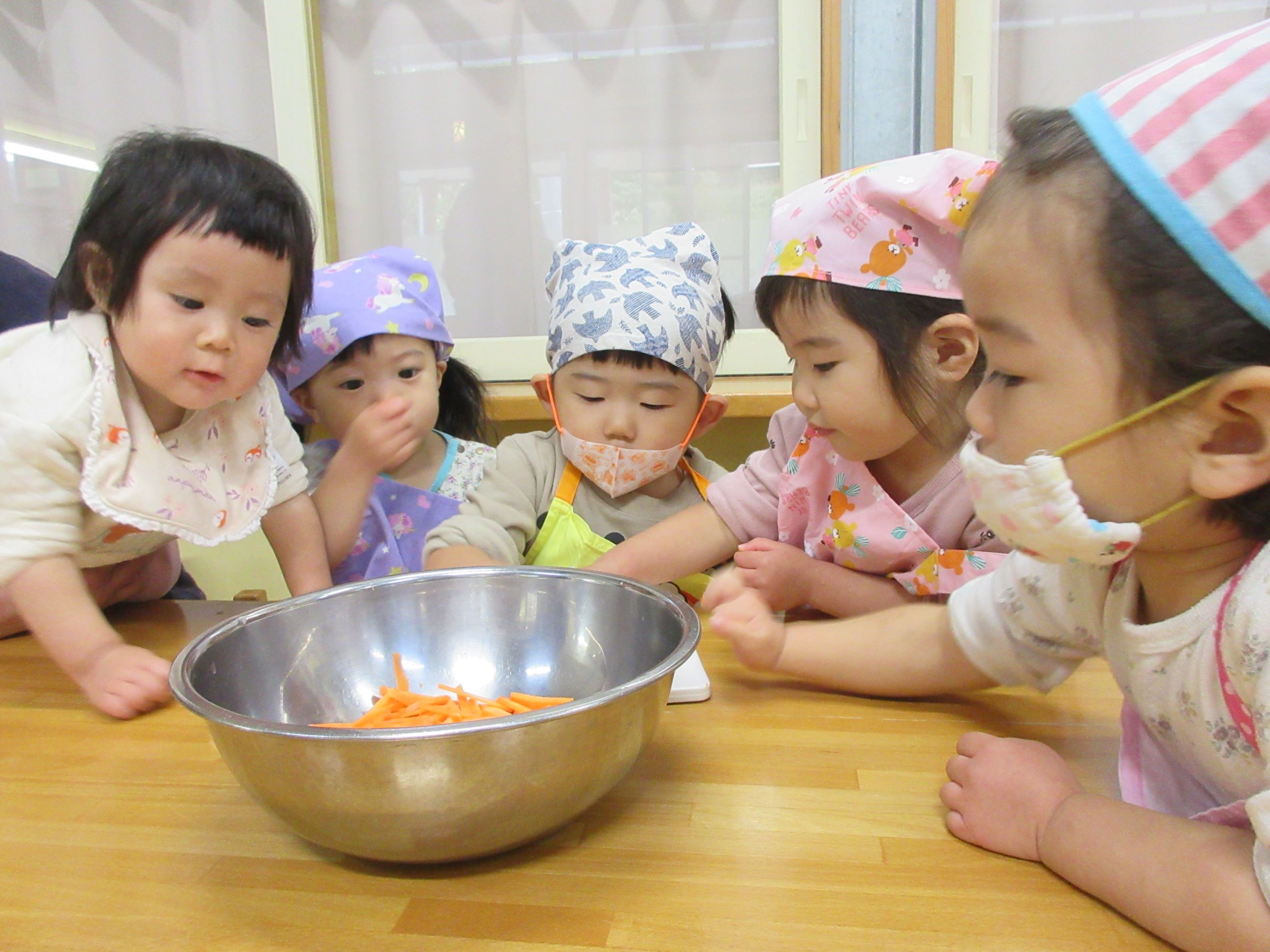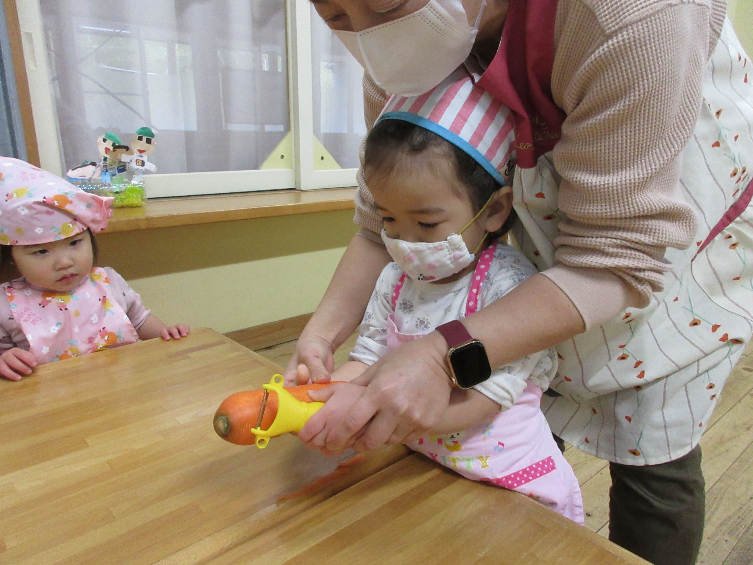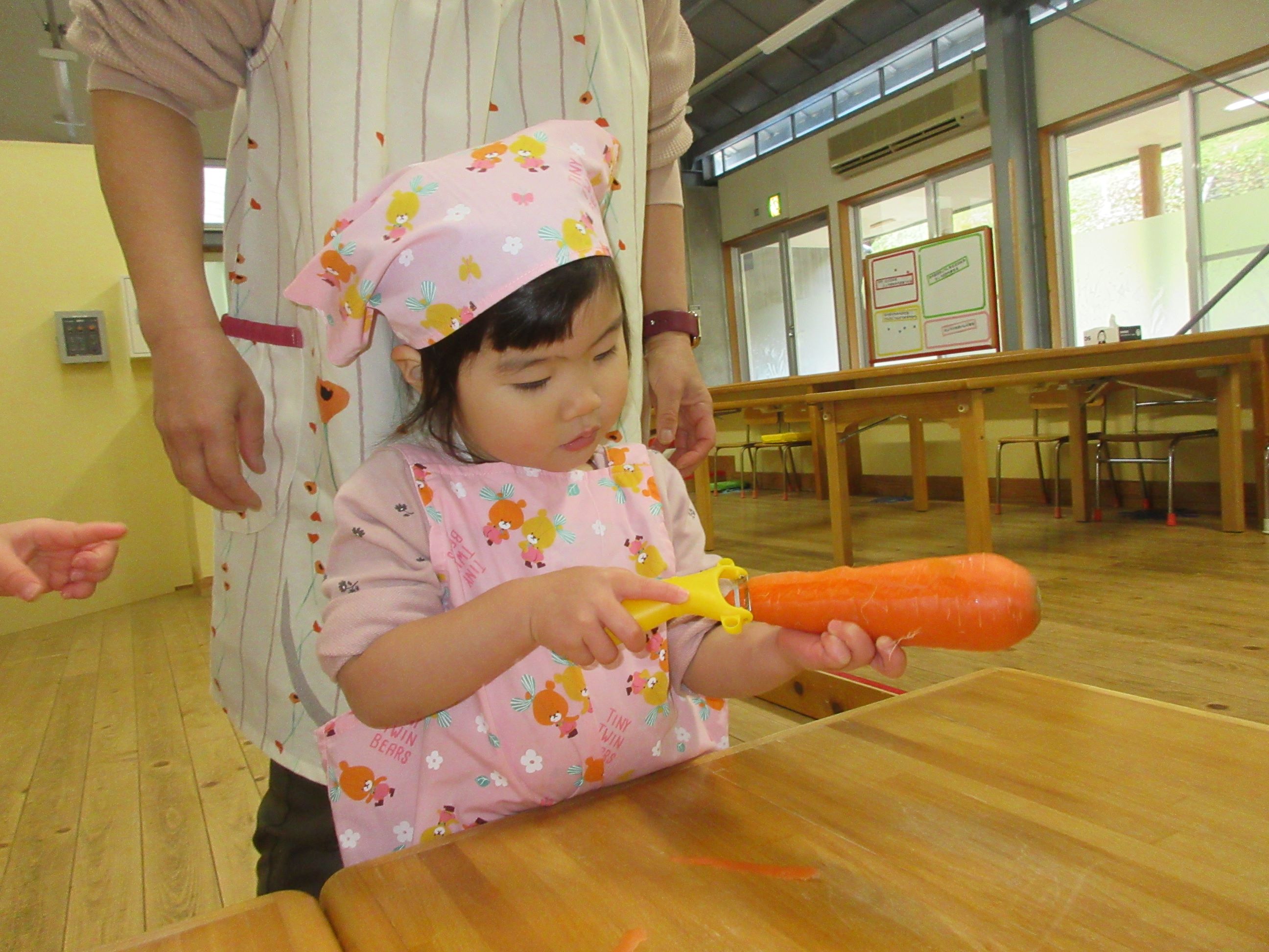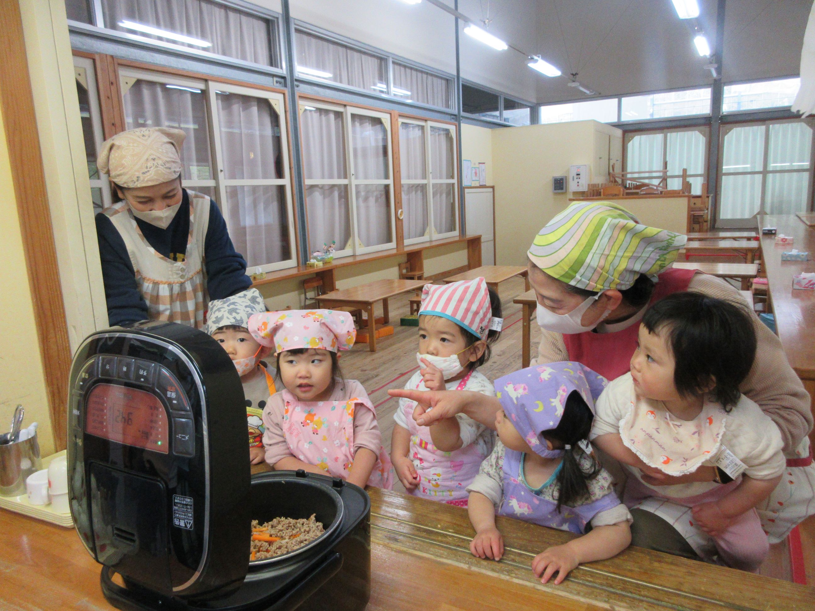 0,1,2歳児なので、芋を洗ったり、お米をといだり、切った材料を入れたりすることが主なお手伝いになりましたが、とても楽しそうにしていました。