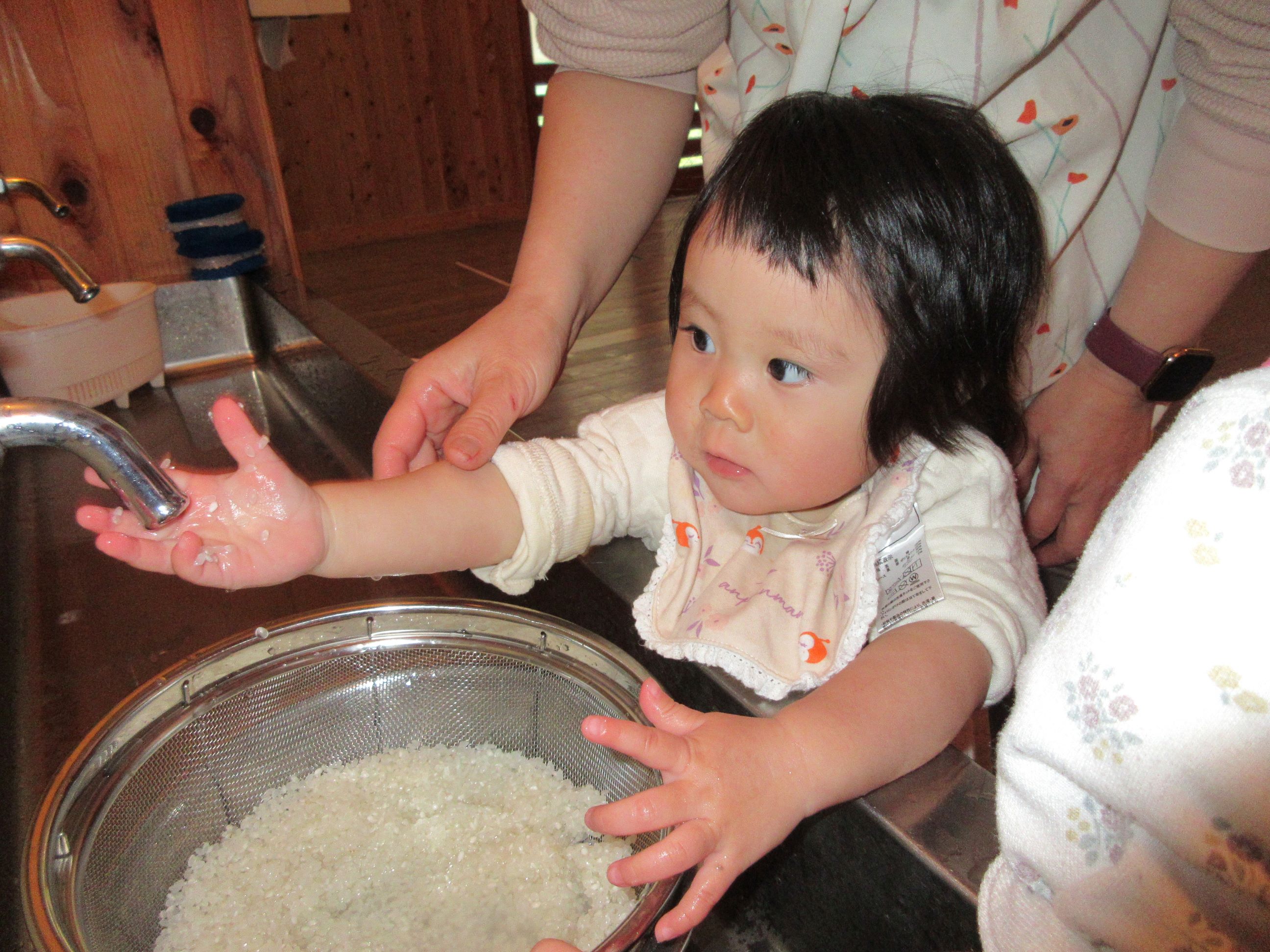 ちっちゃな手でも洗ったよ 手に付いたお米に?の表情でした