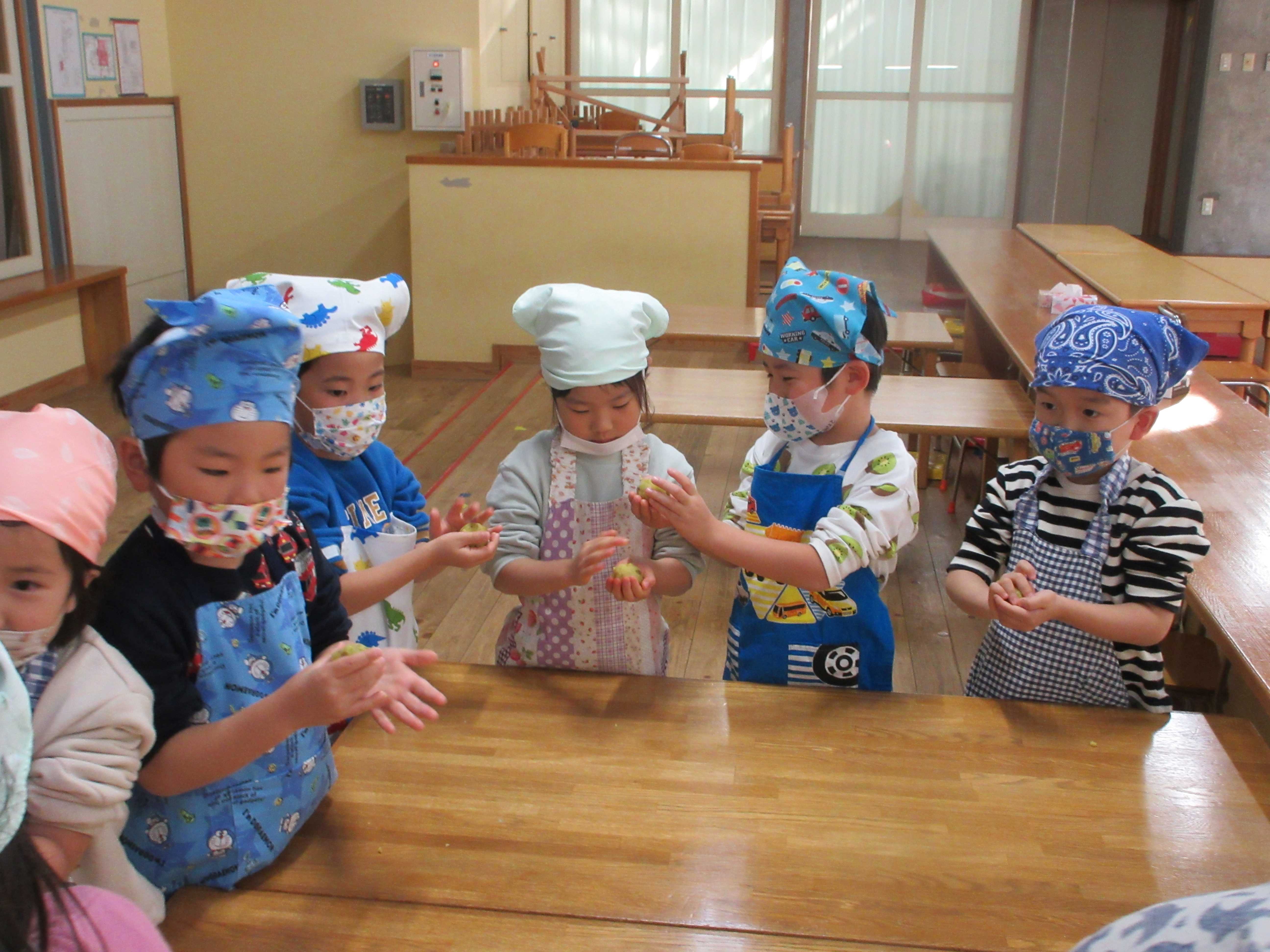 収穫したさつま芋を使って、スイートポテトを作りました。下処理はお昼寝の時間に年長児が行い、皮むきや包丁で切ることなどを頑張っていました。