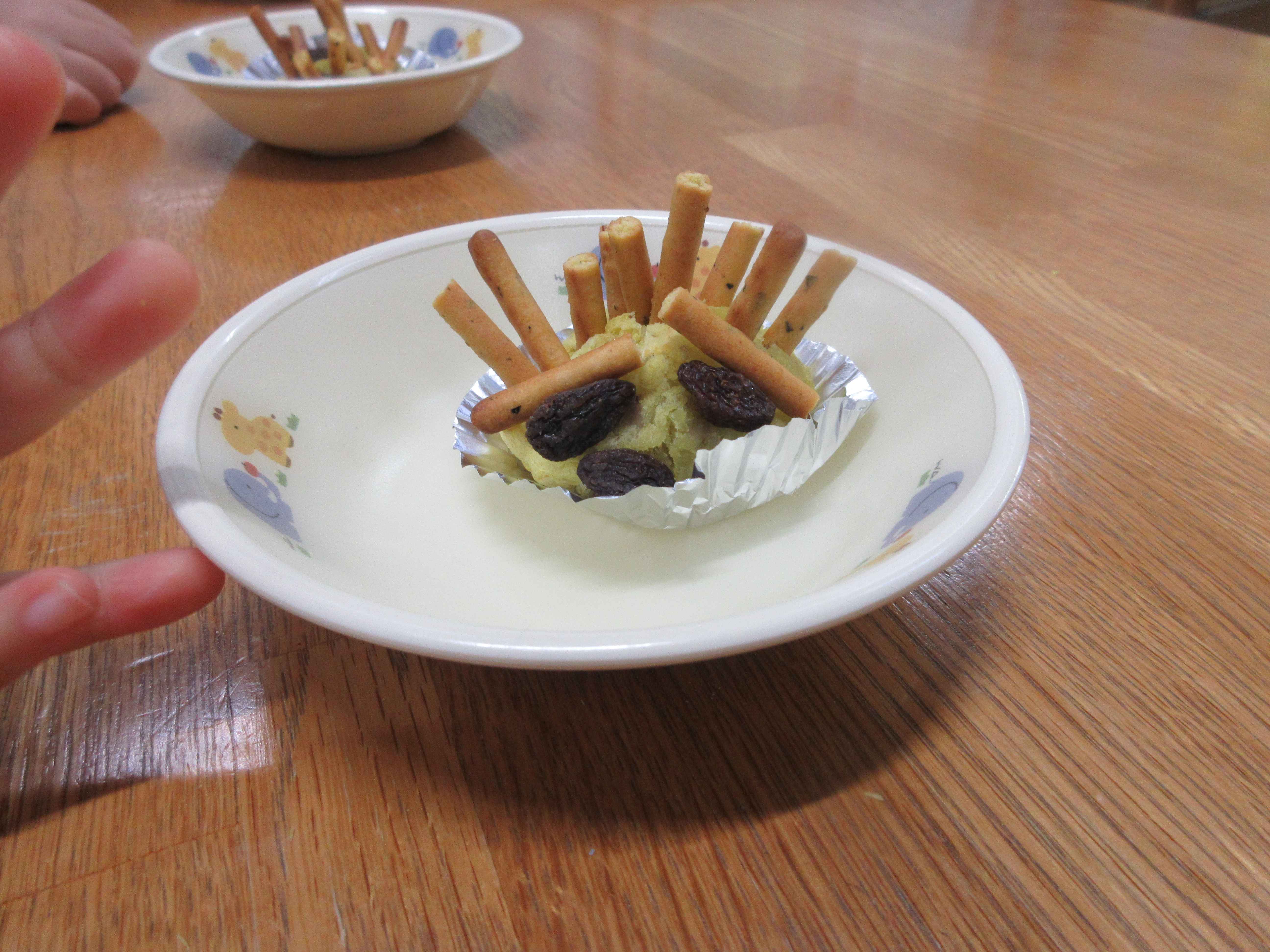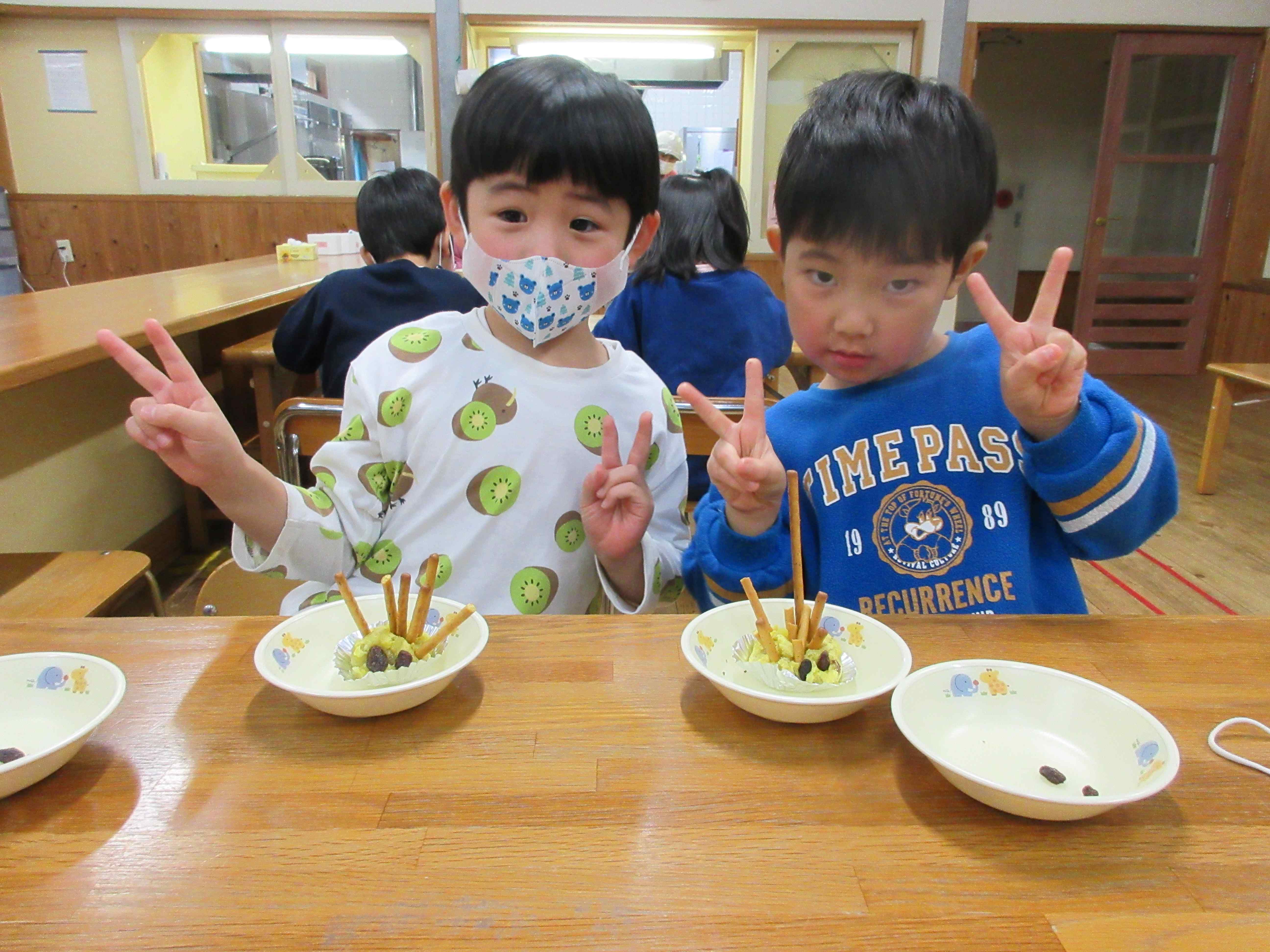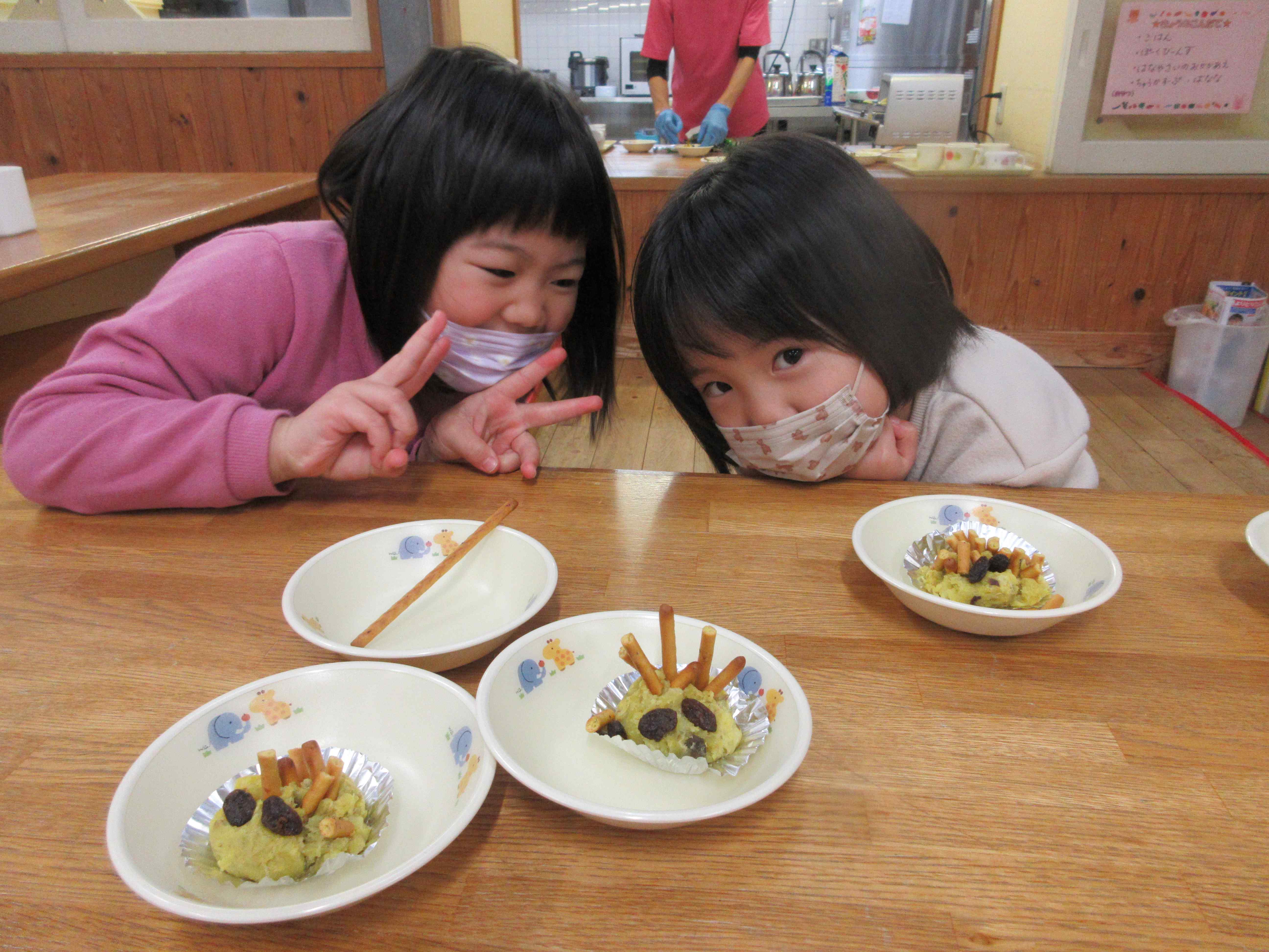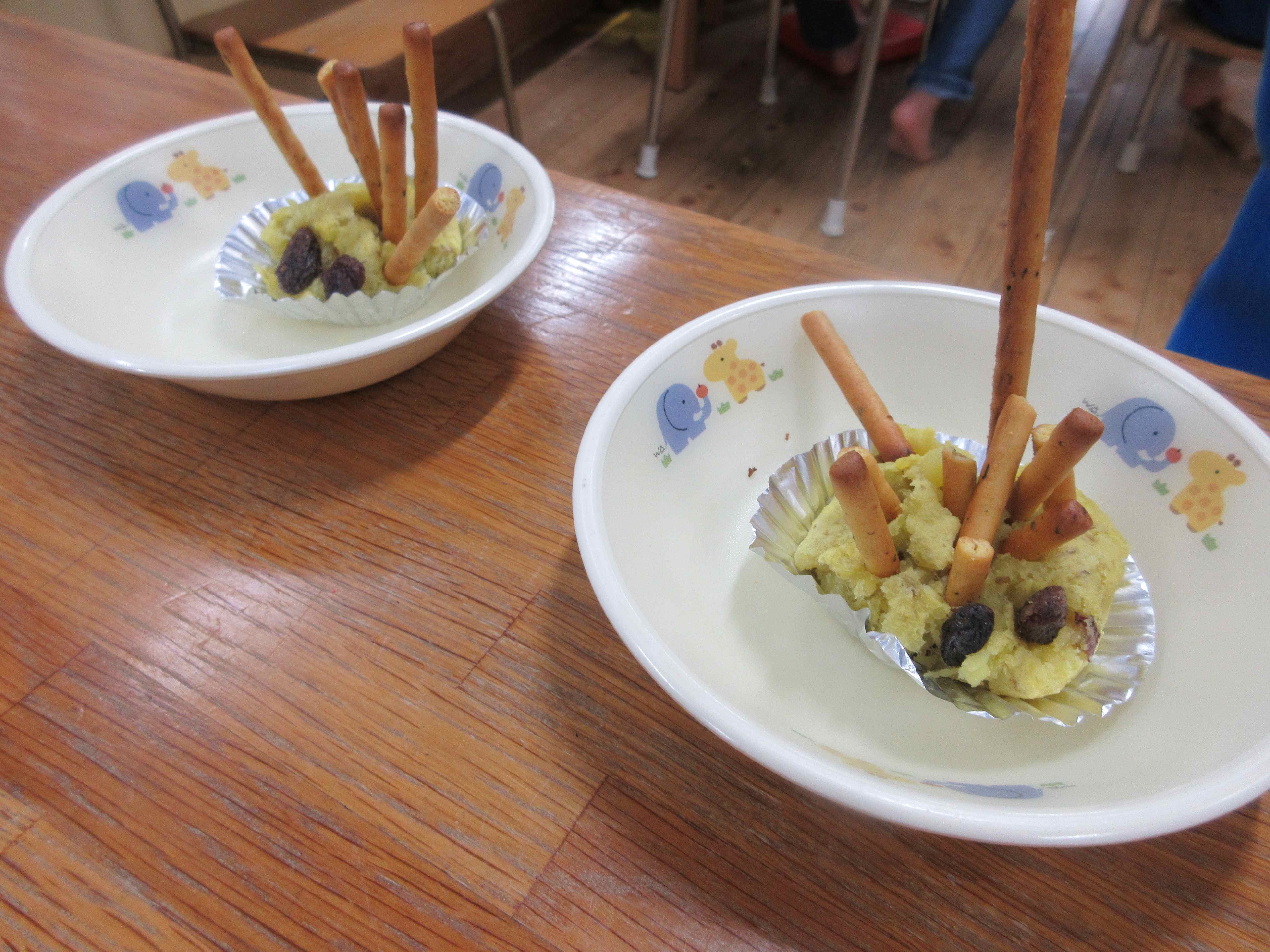 お昼寝後からは3,4歳児も合流し、茹でておいてもらったさつま芋をつぶし、形を整えました。トースターで焼くと、さつま芋やバターの良い匂いが漂い、子ども達は「はやくたべたーい」と、じーっと見つめていました。このままでも美味しいスイートポテトですが、今回はプリッツをトゲに、レーズンを目にして「ハリネズミスイートポテト」にしました。思い思いにトゲや目をつけて、目でも口でも楽しんでいましたよ。