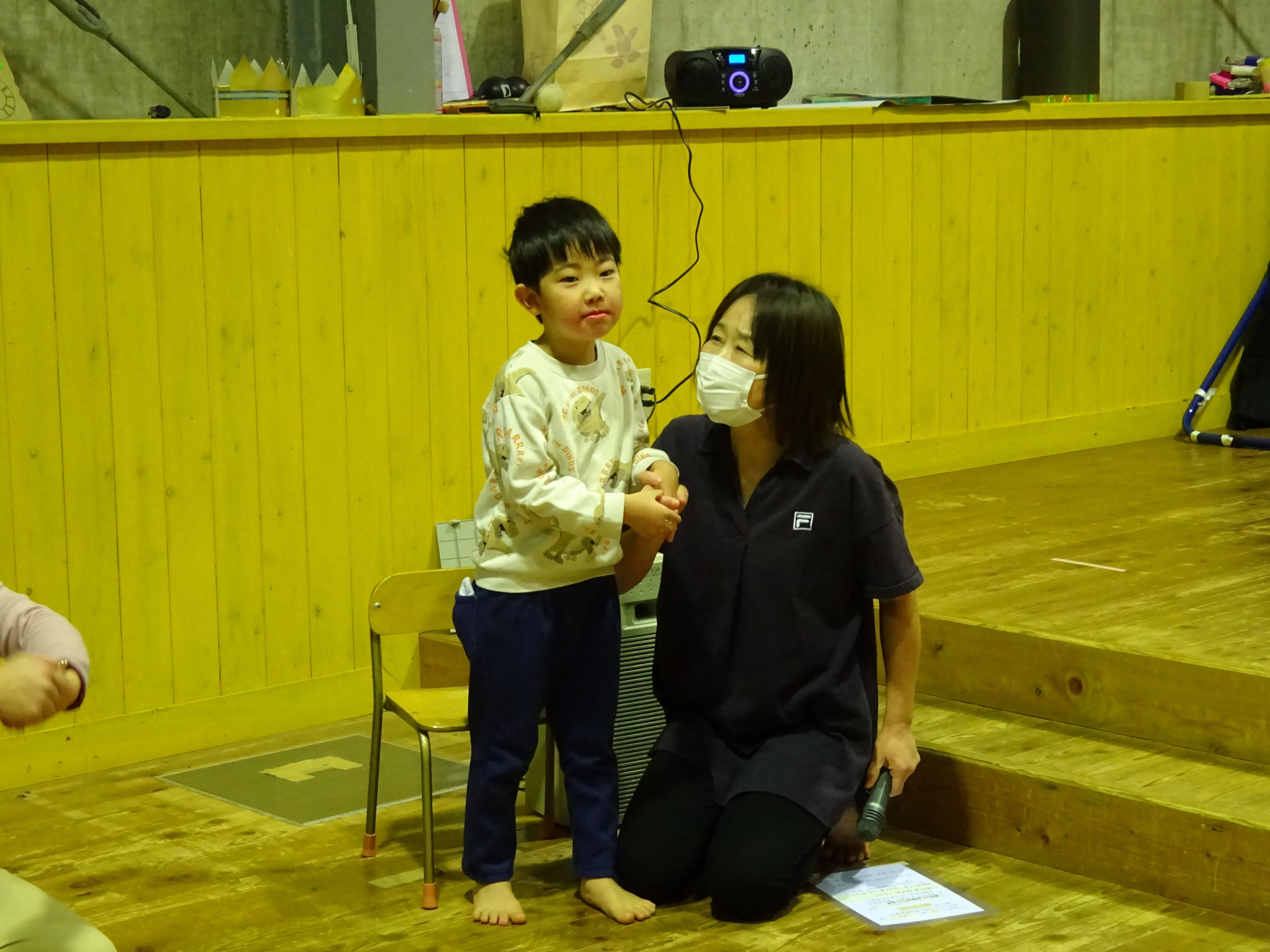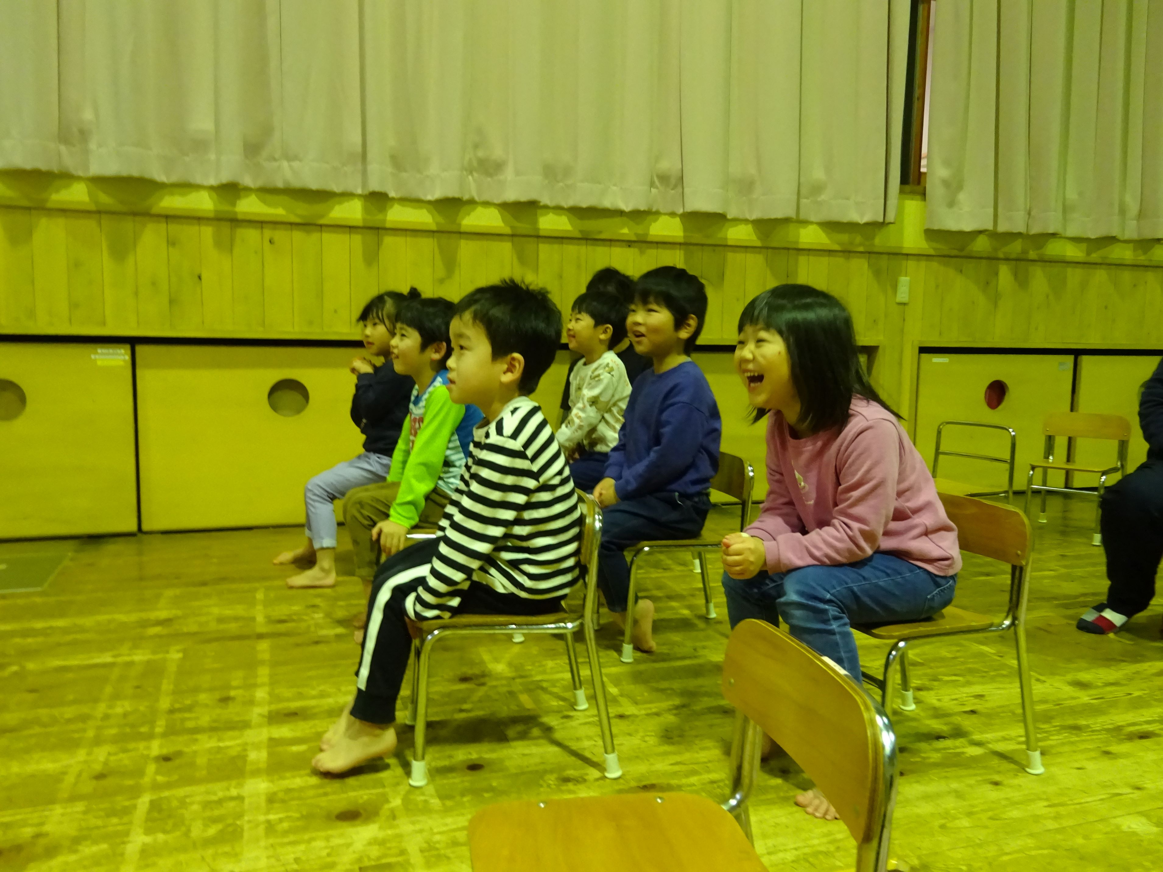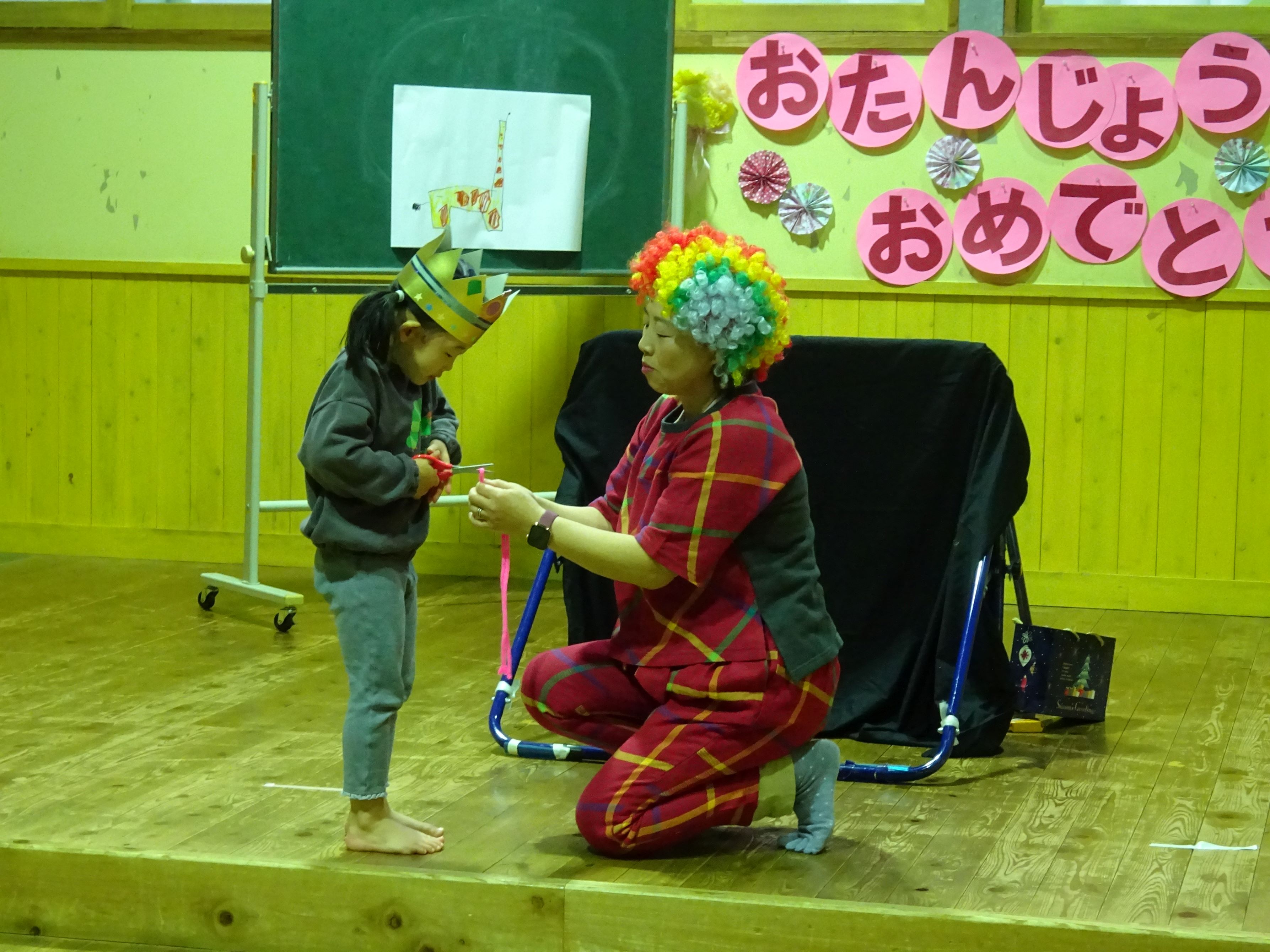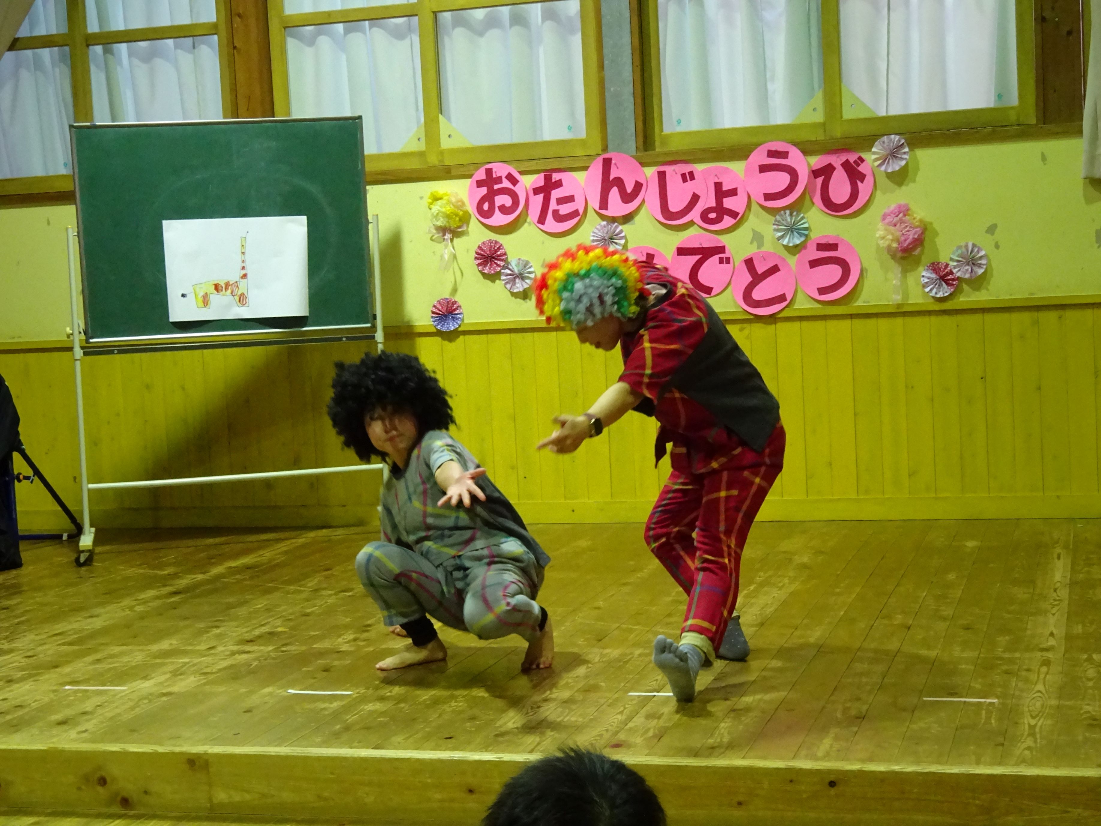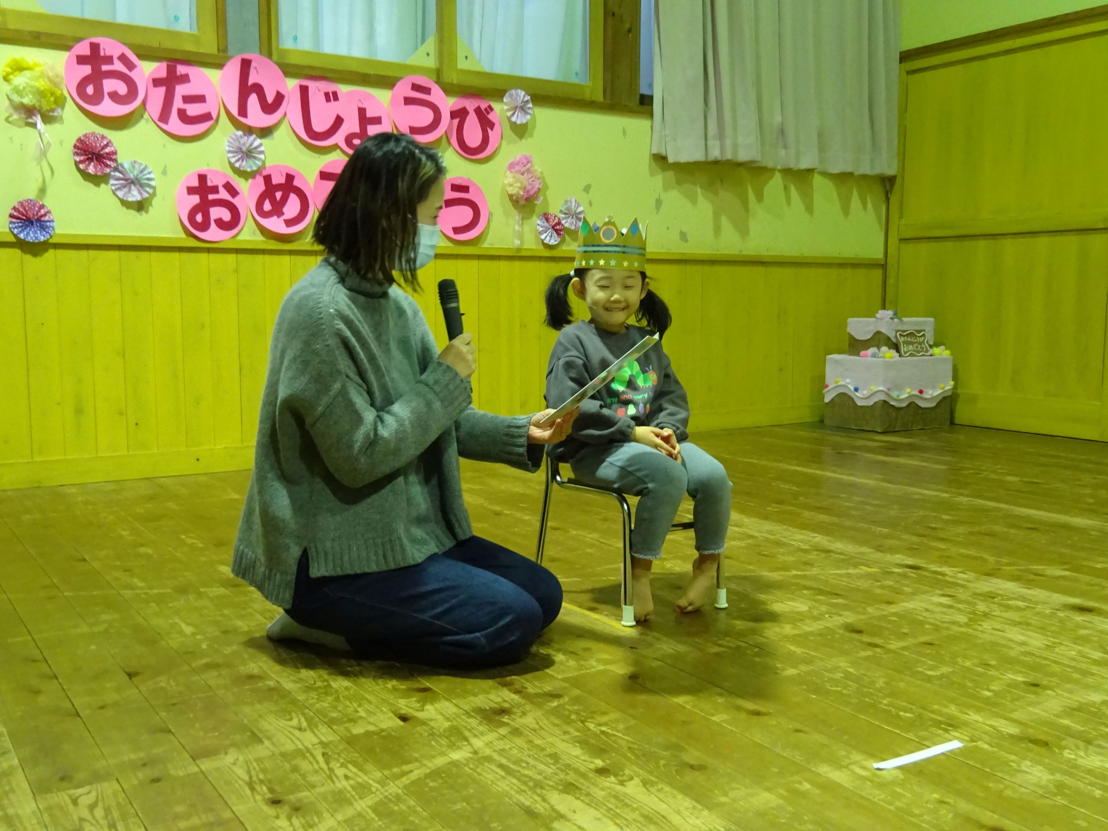 誕生児のお母さんを招いて一緒にお祝いをしました。お母さんから誕生日のメッセージを読んでもらい、生まれた時の話もしてもらいました。家族だけでなく、親戚の方々からも誕生を心待ちにされ、たくさんの愛情を注がれていることが伝わってきました。お楽しみ会では、絵やジェスチャーをみてお題を当てる『あてっこゲーム』と怪しい2人組による『マジックショー』で盛り上がりました。