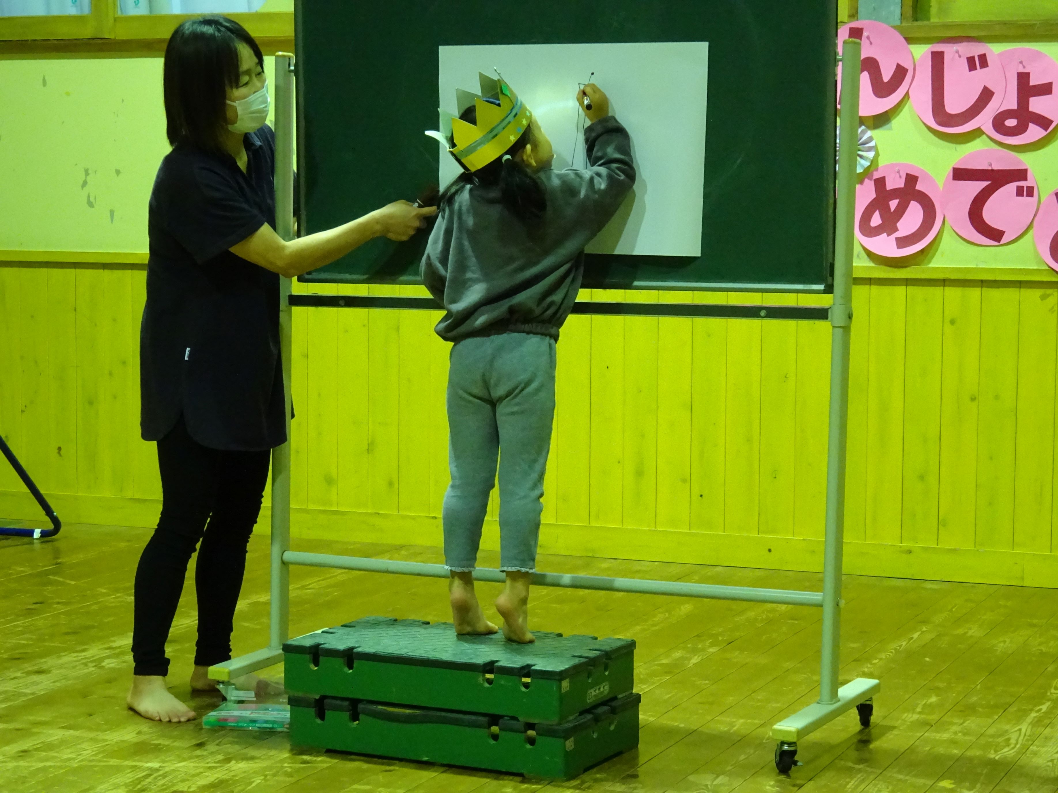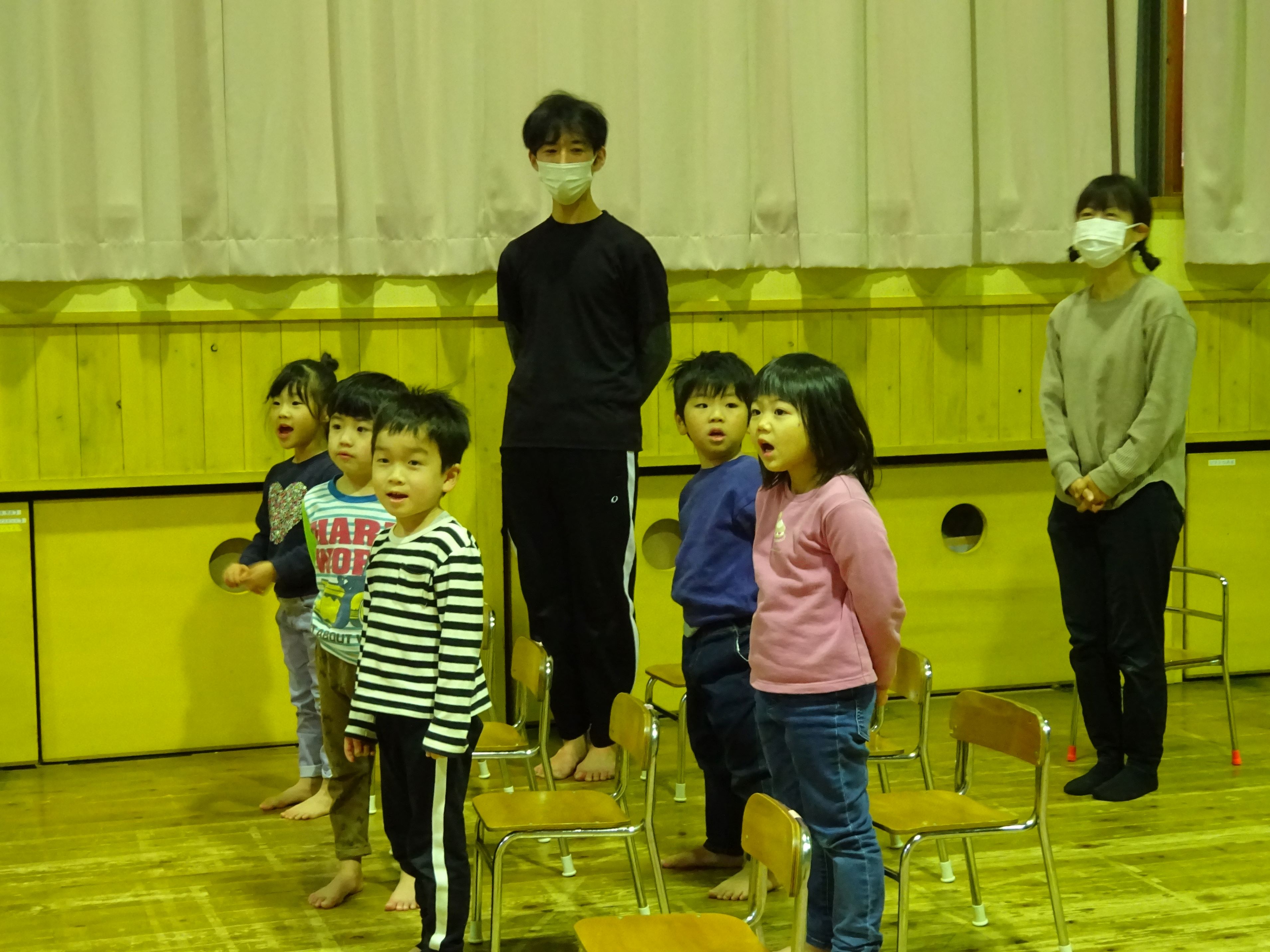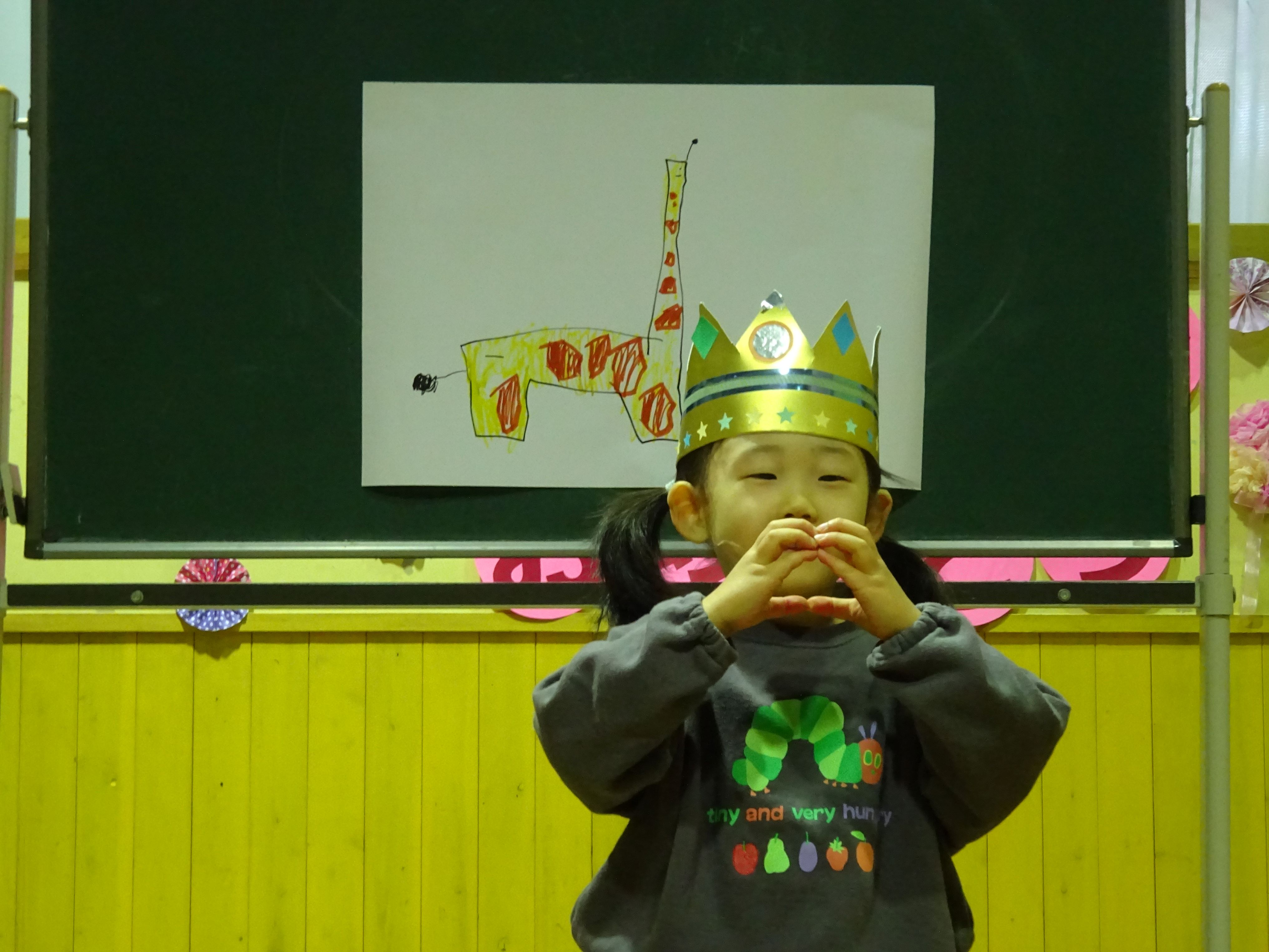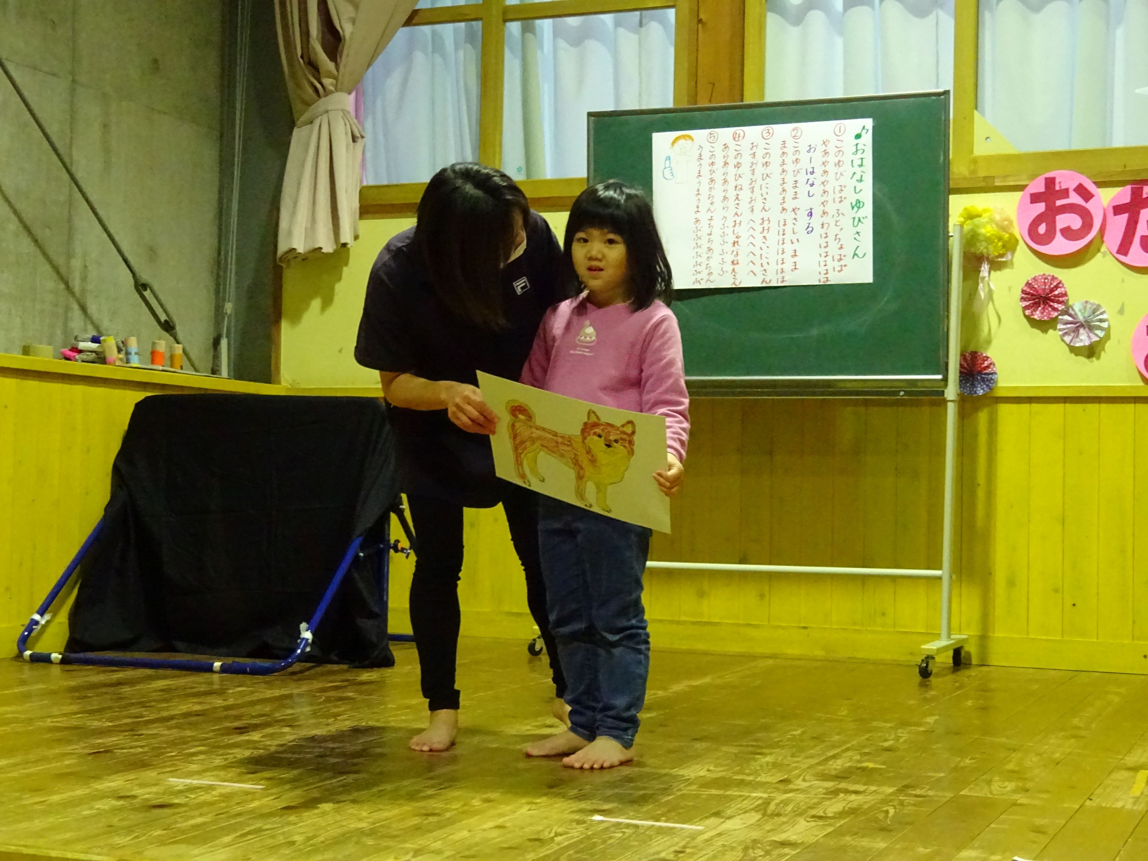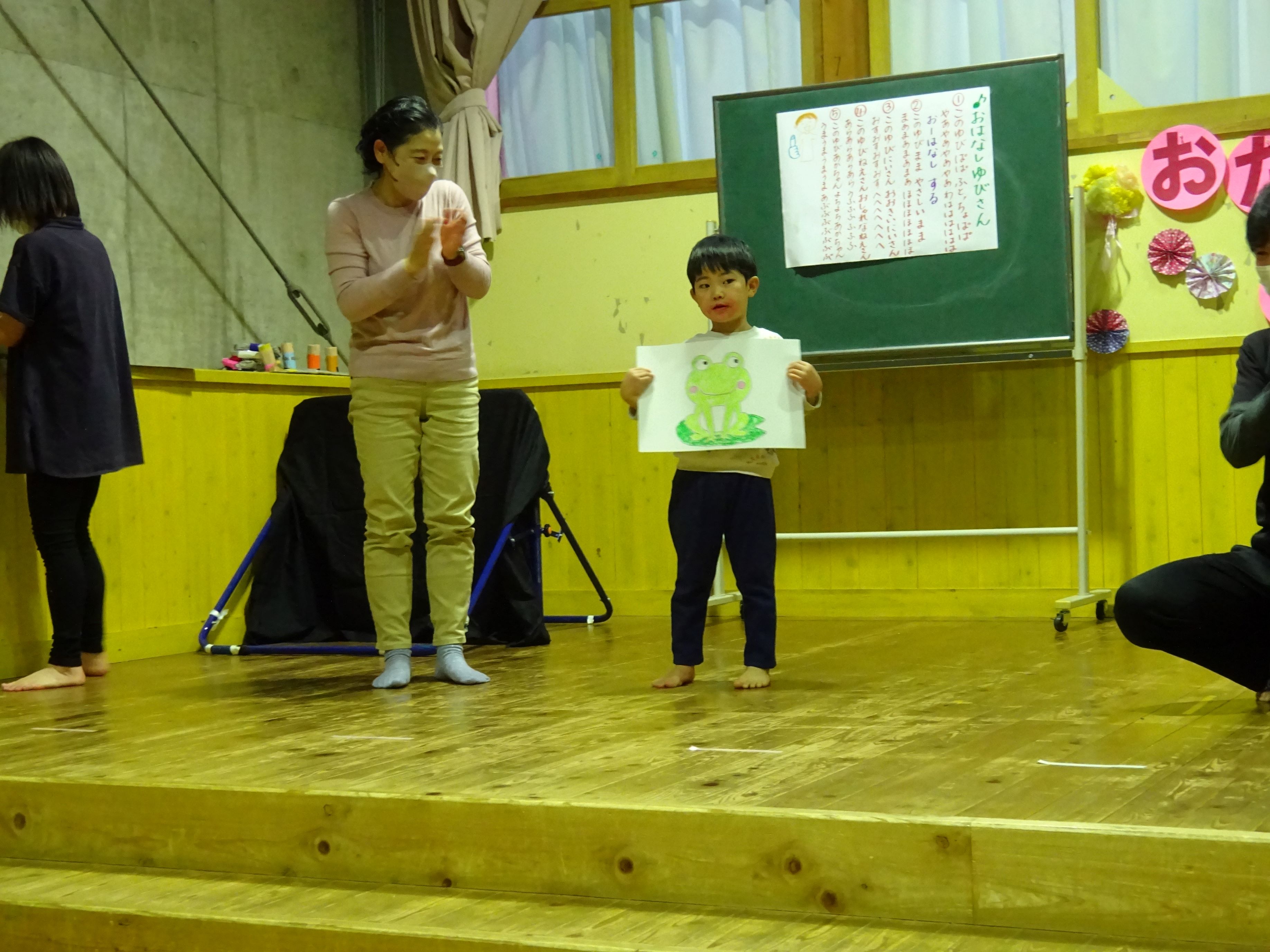 誕生児のお母さんを招いて一緒にお祝いをしました。お母さんから誕生日のメッセージを読んでもらい、生まれた時の話もしてもらいました。家族だけでなく、親戚の方々からも誕生を心待ちにされ、たくさんの愛情を注がれていることが伝わってきました。お楽しみ会では、絵やジェスチャーをみてお題を当てる『あてっこゲーム』と怪しい2人組による『マジックショー』で盛り上がりました。