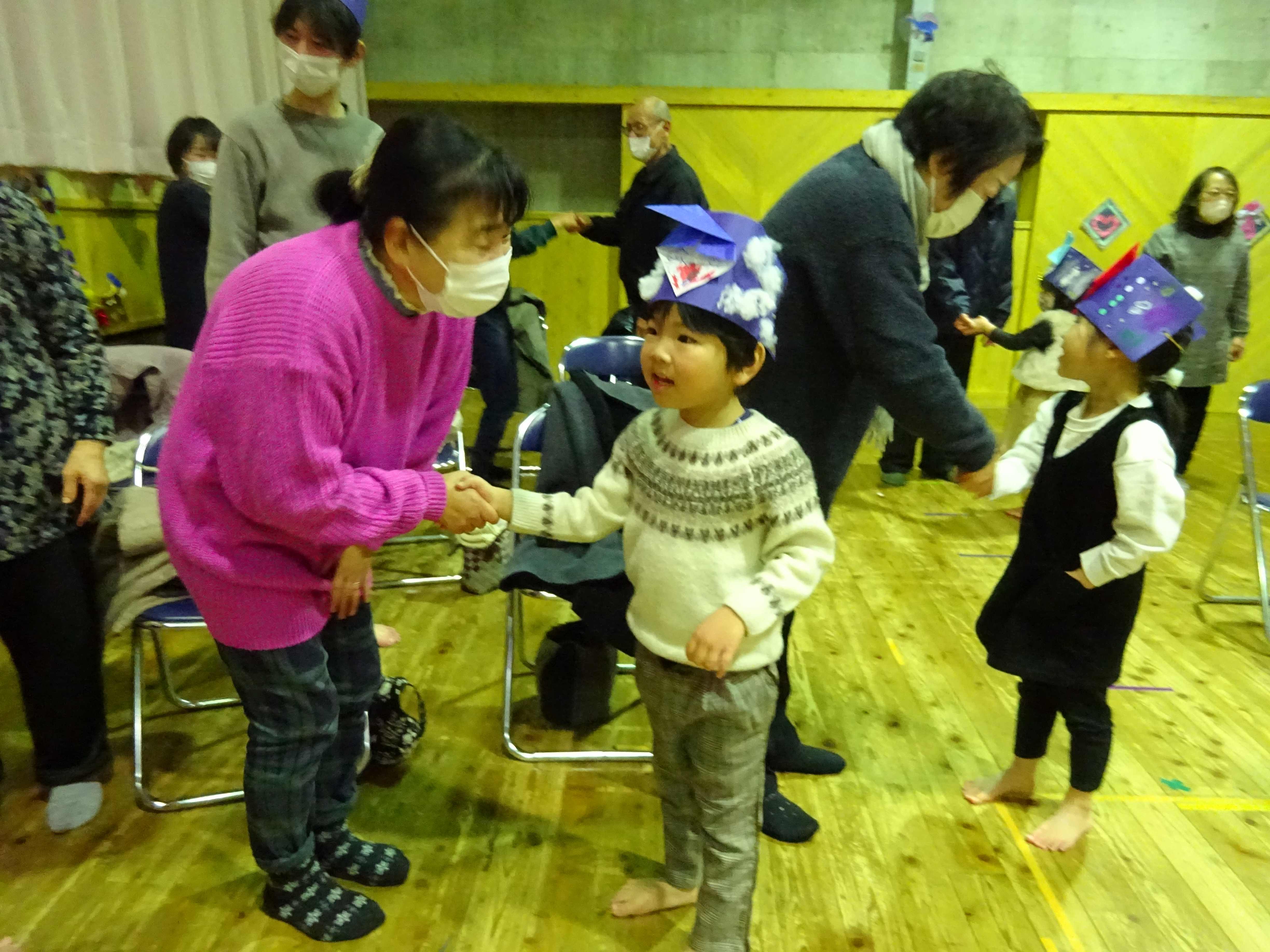 地域の方と2人1組になり、歌に合わせて握手をしたり、肩を組んだりしました。「よろしくね」