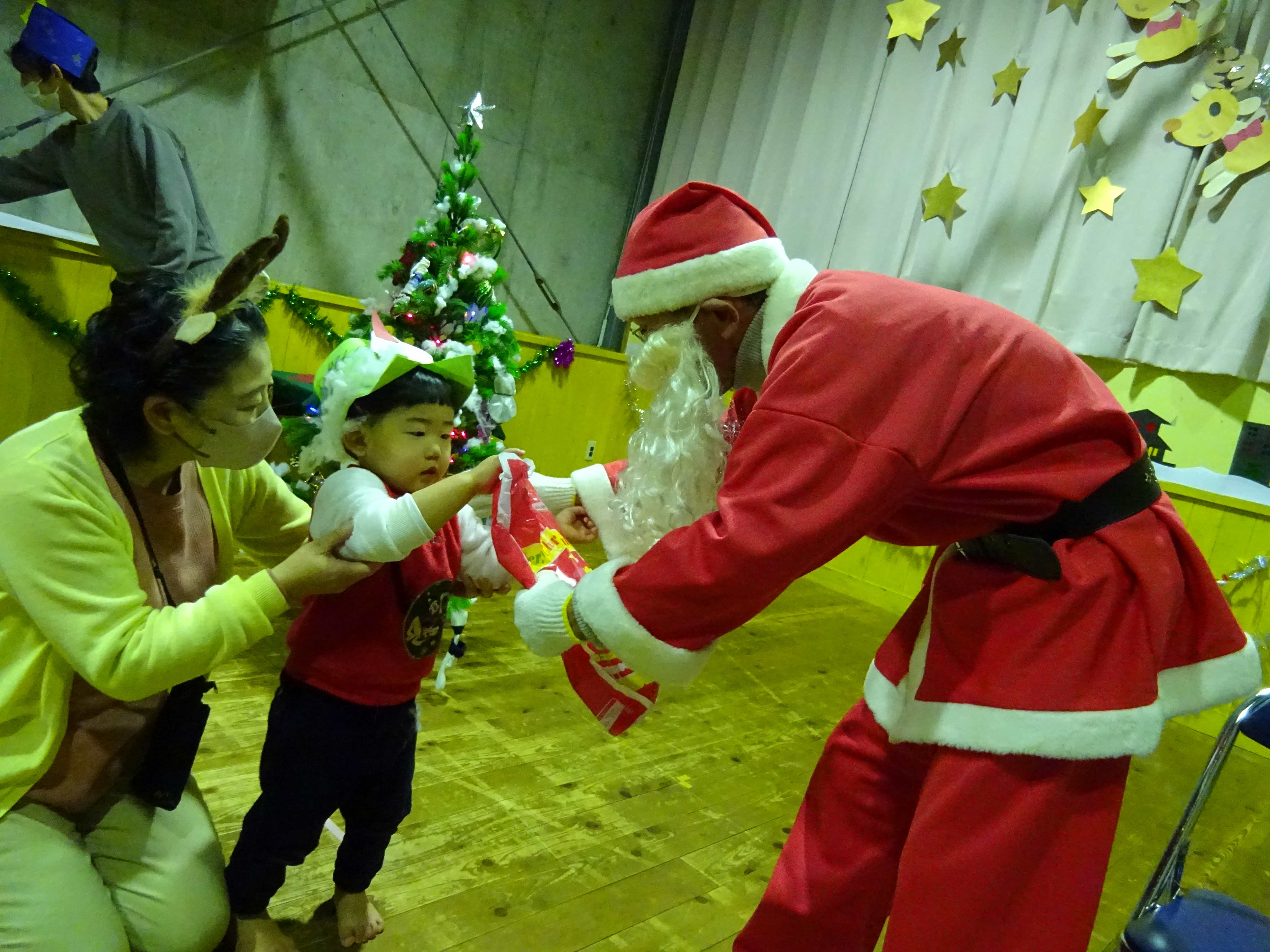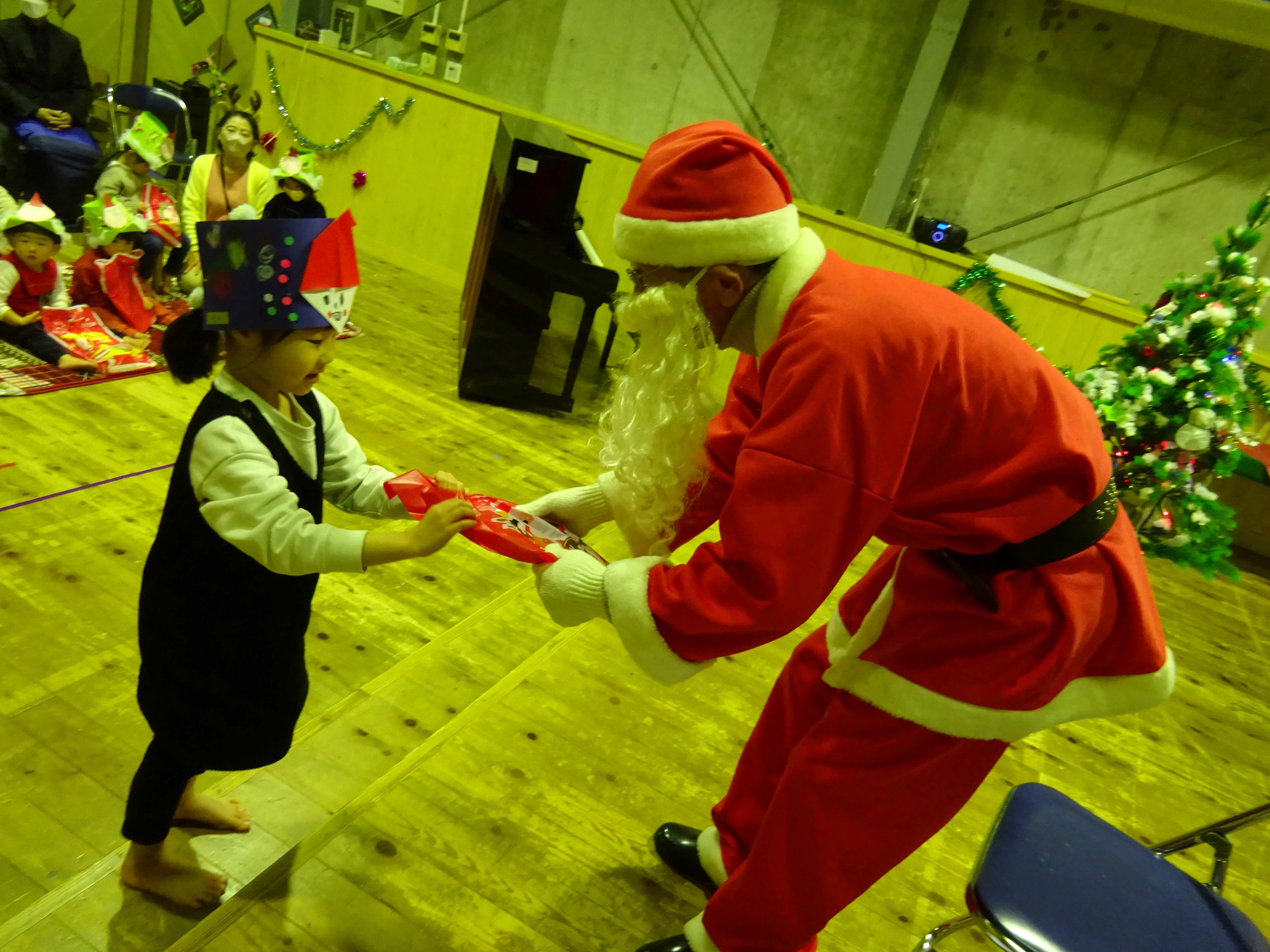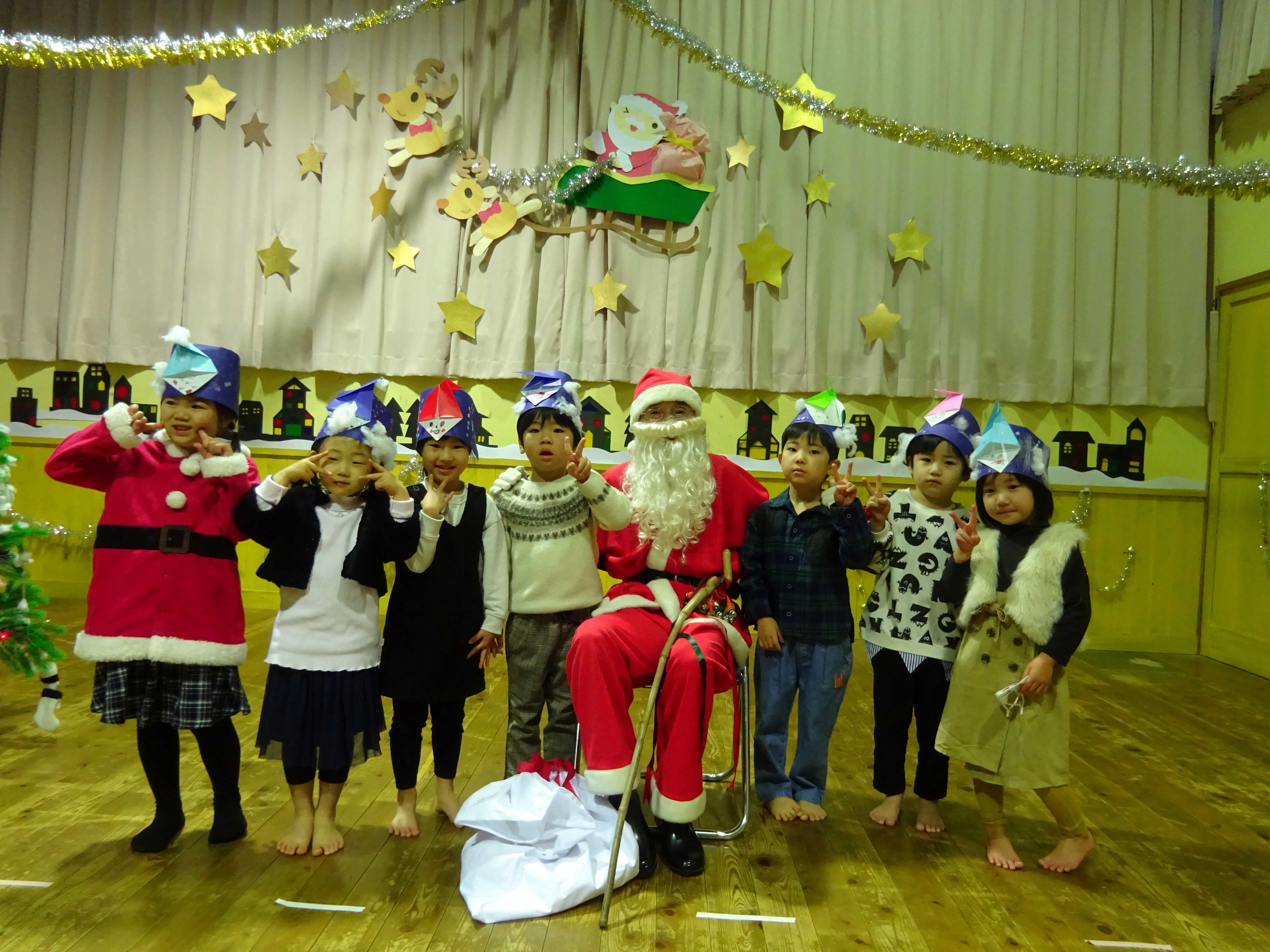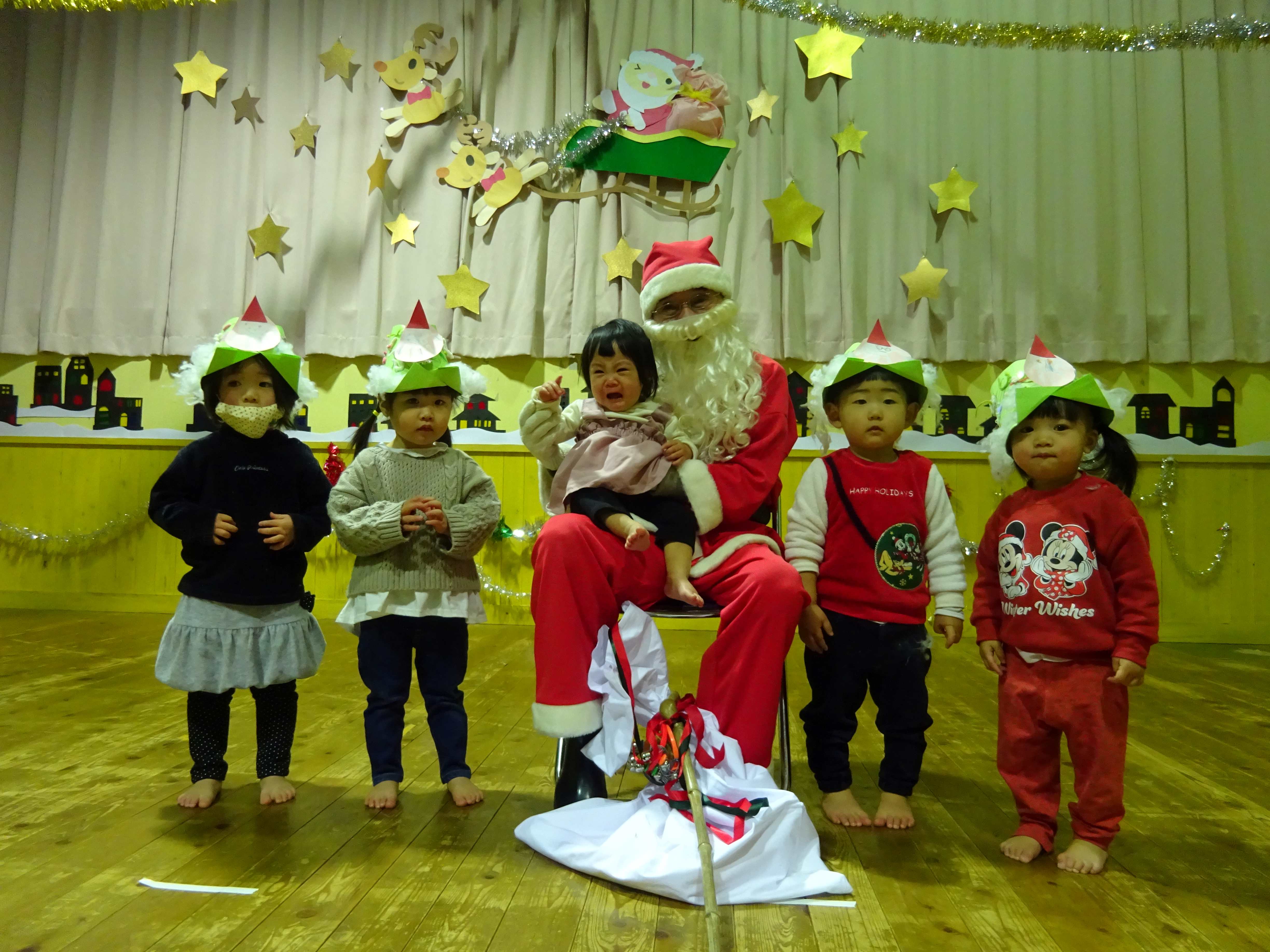 今年はいつもお世話になっている地域の方をお呼びして、一緒にクリスマス会を楽しみました。年長児のキャンドルサービスの後、鈴の音と共にサンタさんが登場し、子ども達は「わぁっ、サンタさんだ!」と大喜びでした。そして「おっくんバンド」の、おっくんとウッチーの2人によるクリスマスステージでは、ギターやピアノの音楽に合わせて、歌ったり踊ったりして大盛り上がりでした。