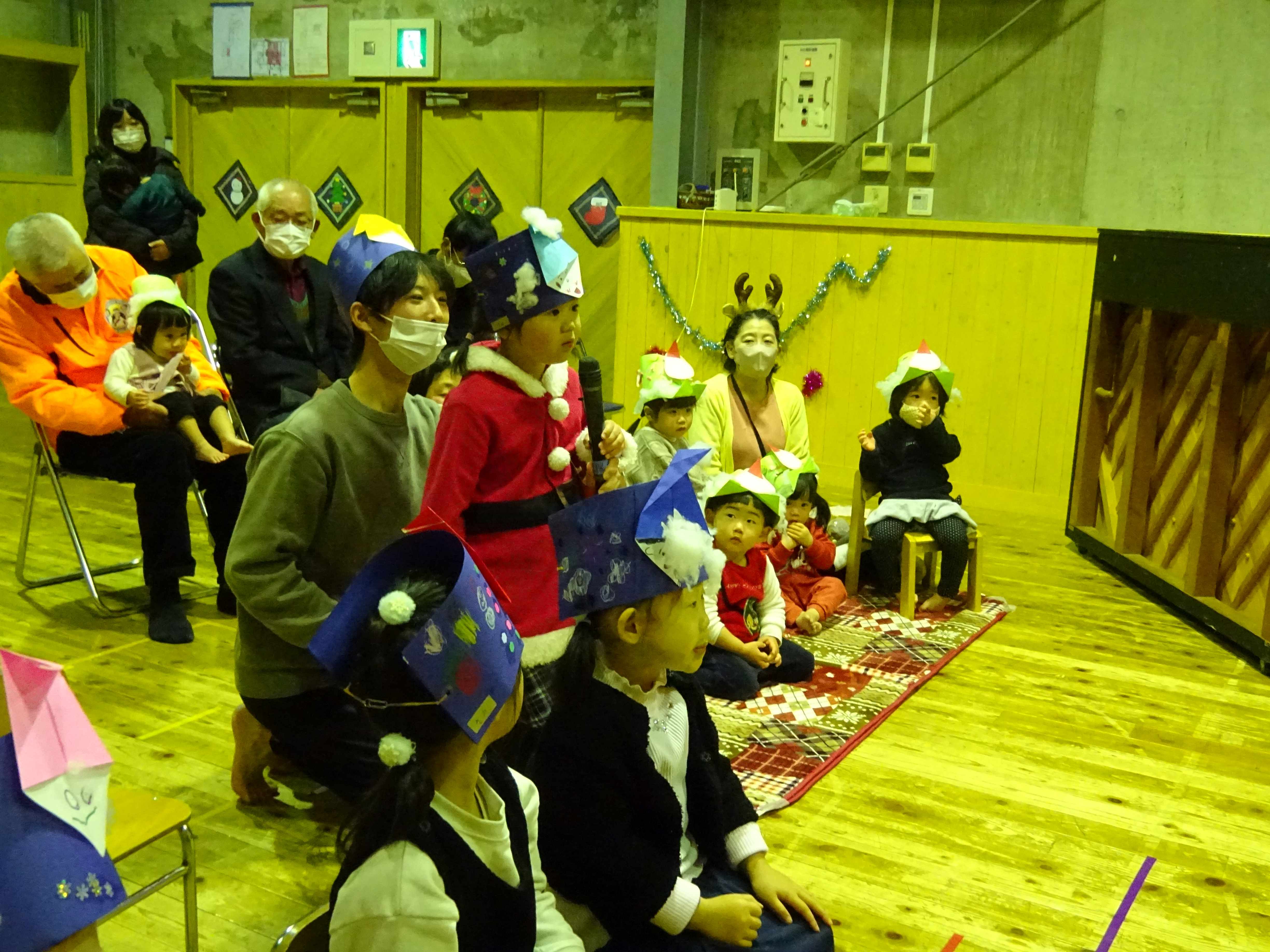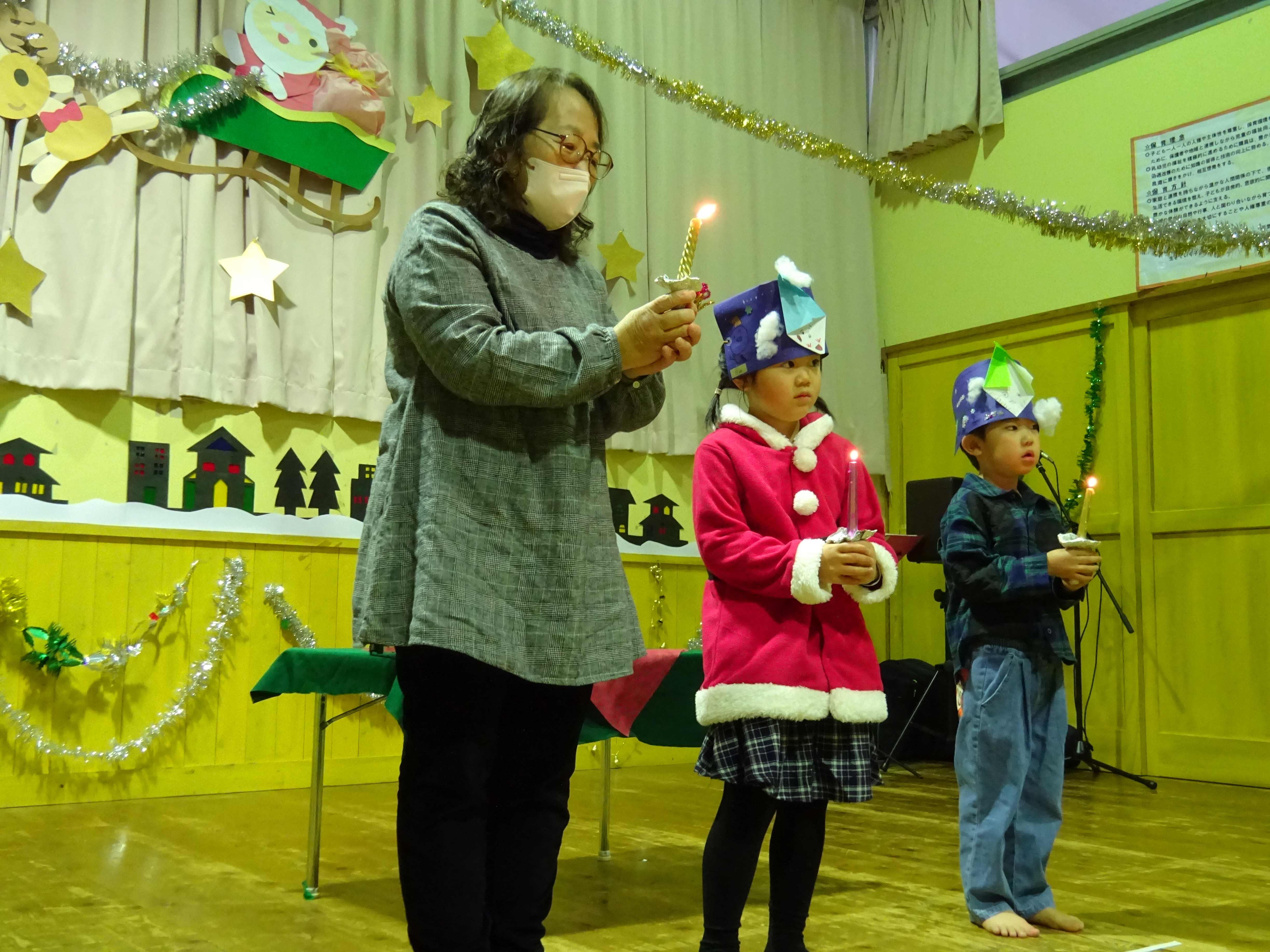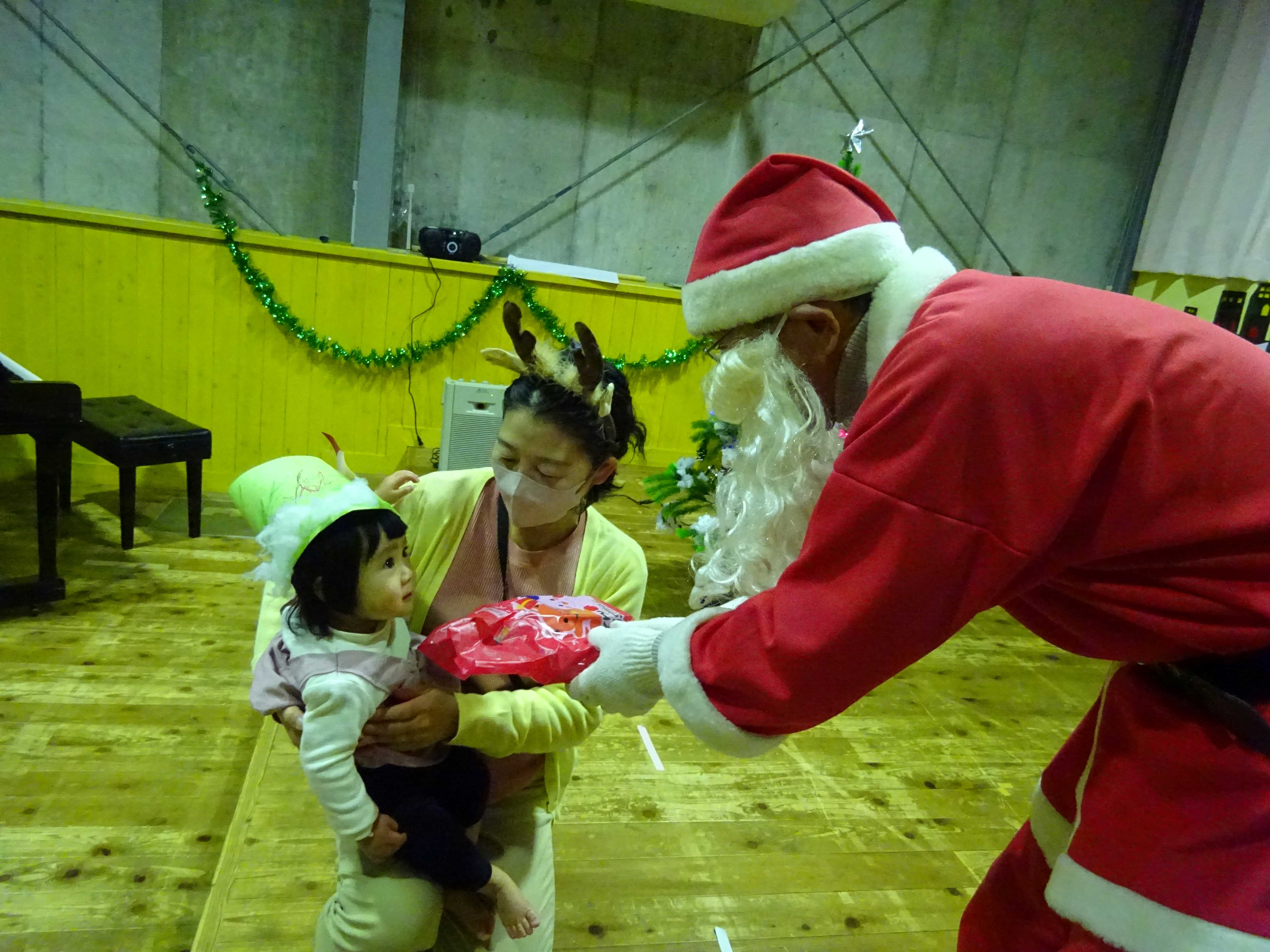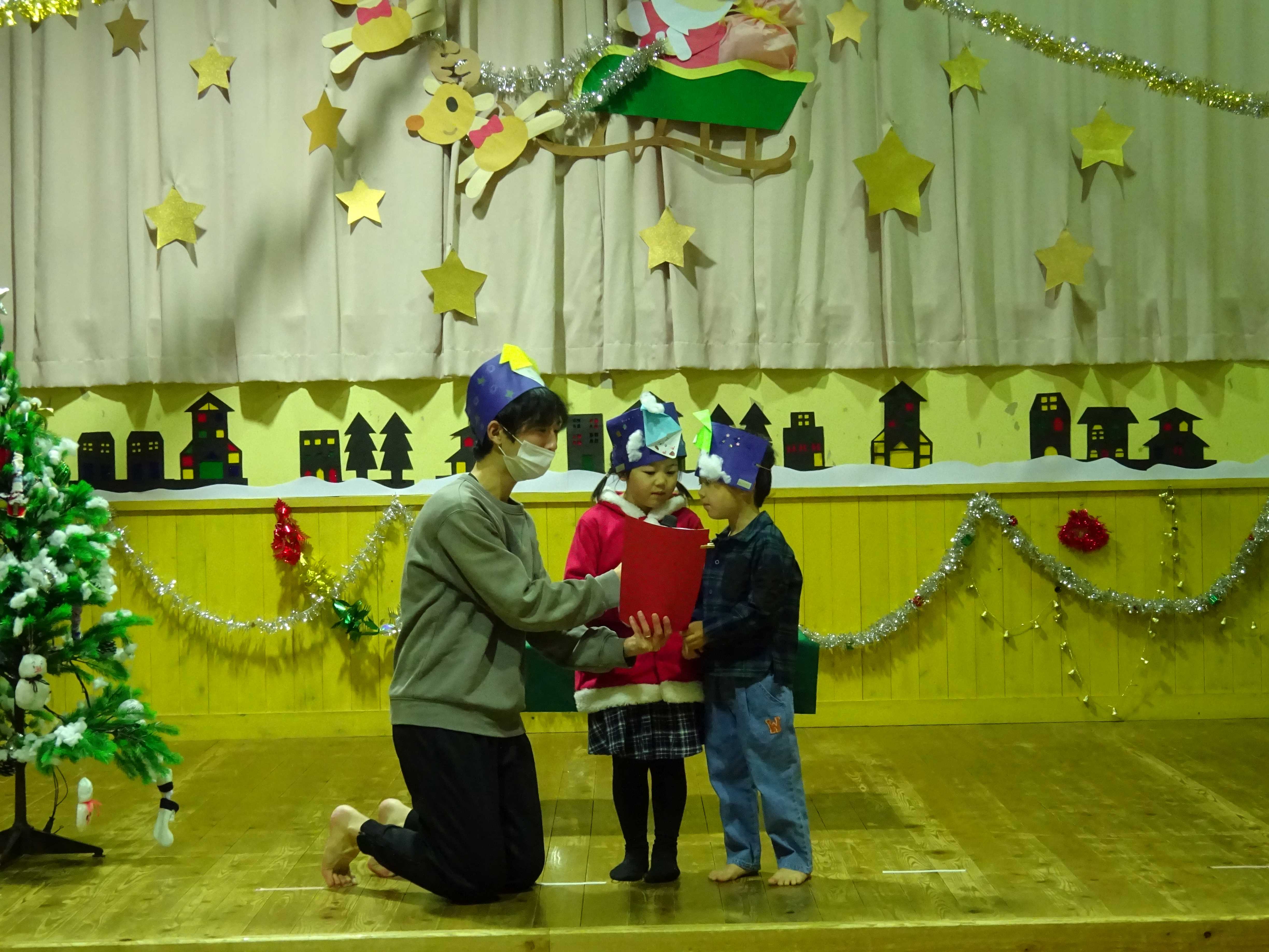 今年はいつもお世話になっている地域の方をお呼びして、一緒にクリスマス会を楽しみました。年長児のキャンドルサービスの後、鈴の音と共にサンタさんが登場し、子ども達は「わぁっ、サンタさんだ!」と大喜びでした。そして「おっくんバンド」の、おっくんとウッチーの2人によるクリスマスステージでは、ギターやピアノの音楽に合わせて、歌ったり踊ったりして大盛り上がりでした。