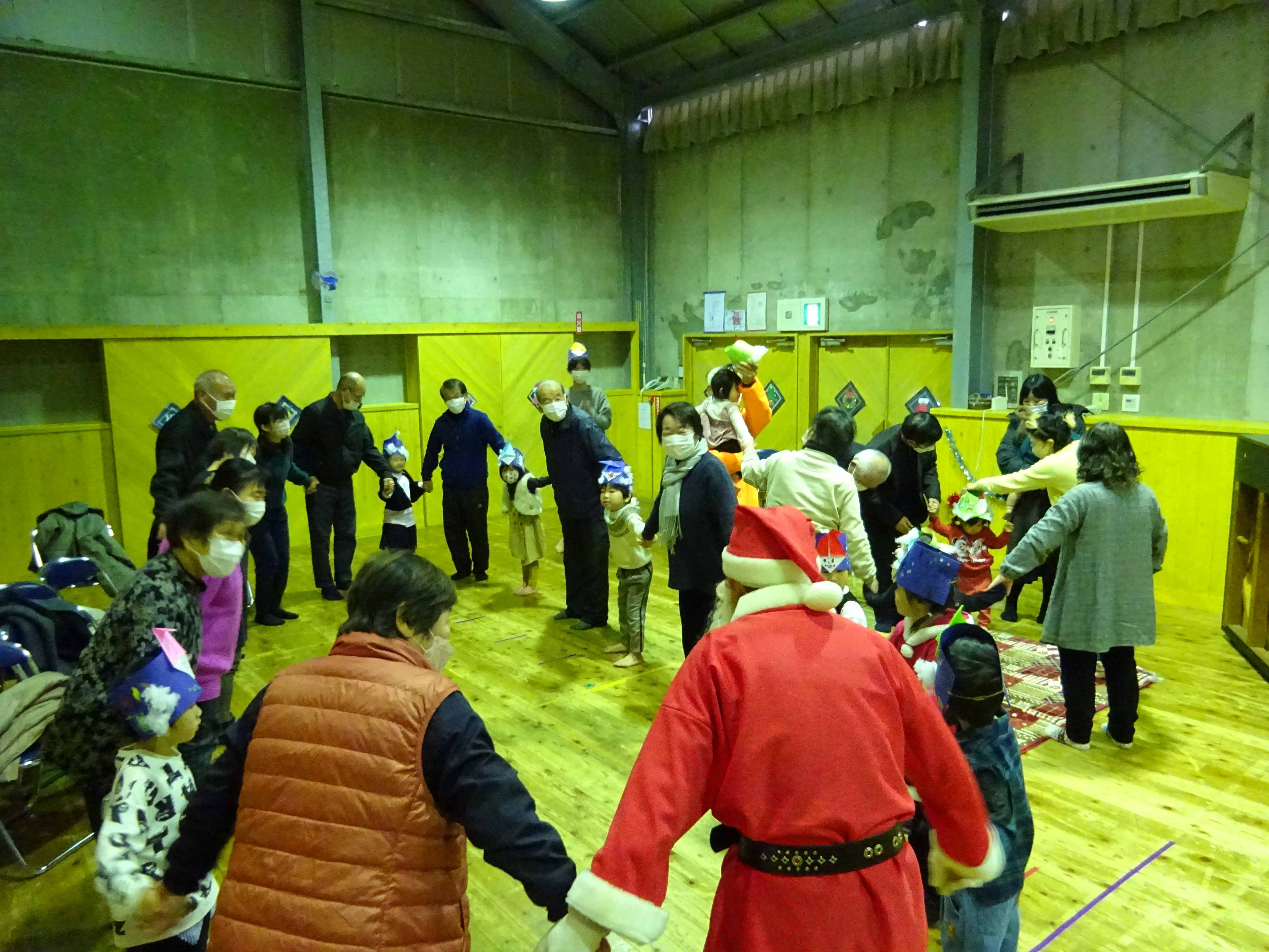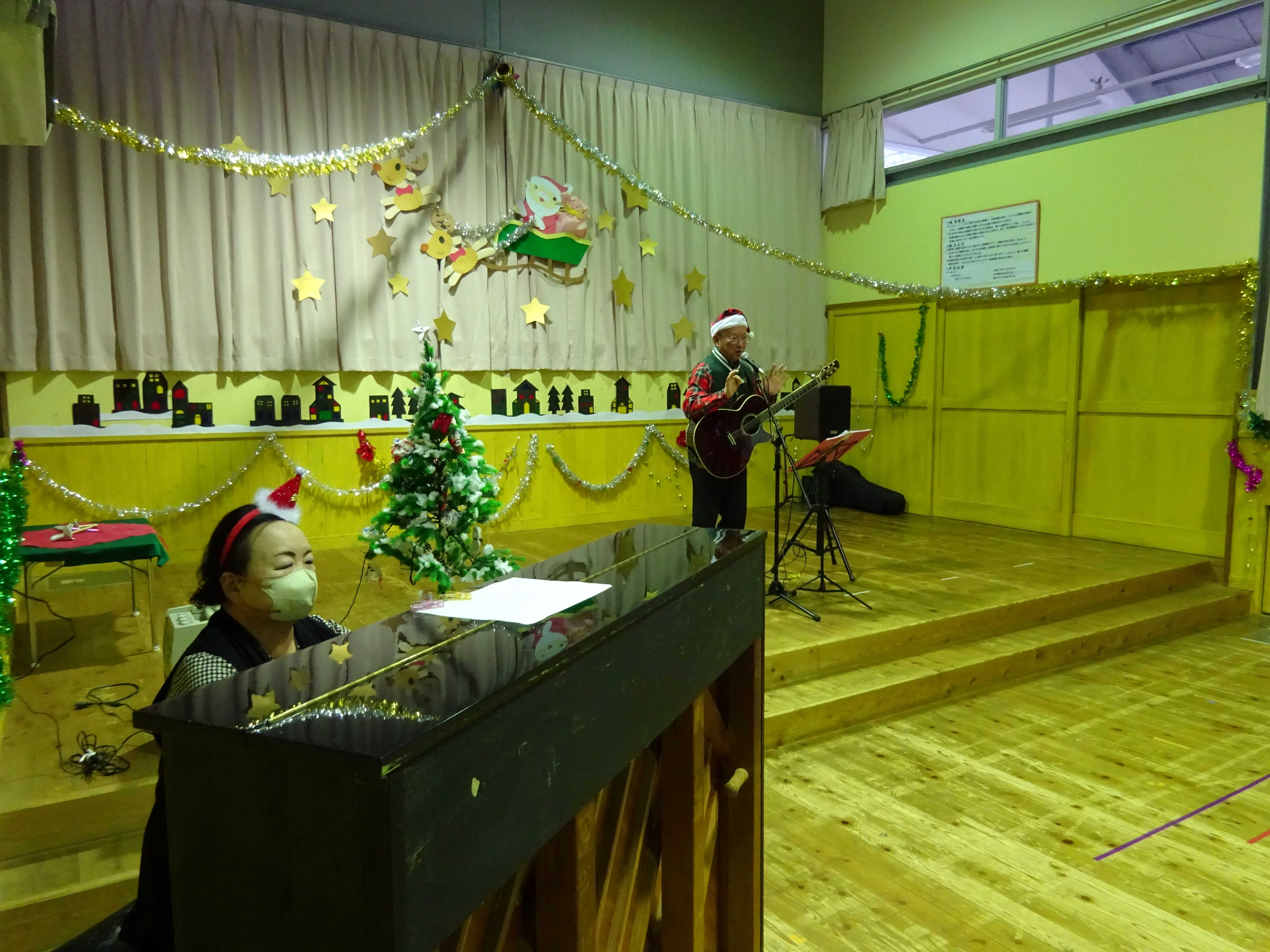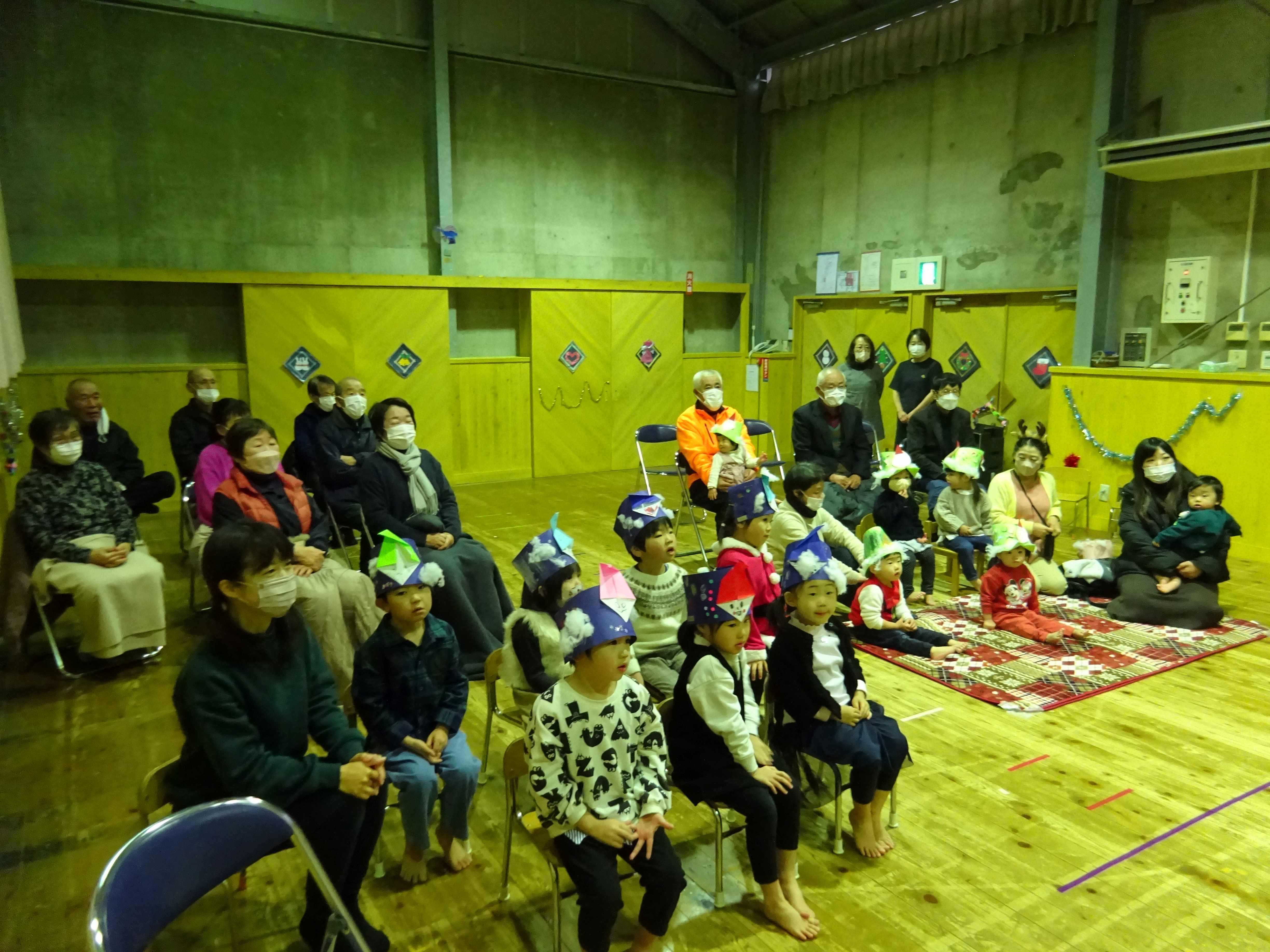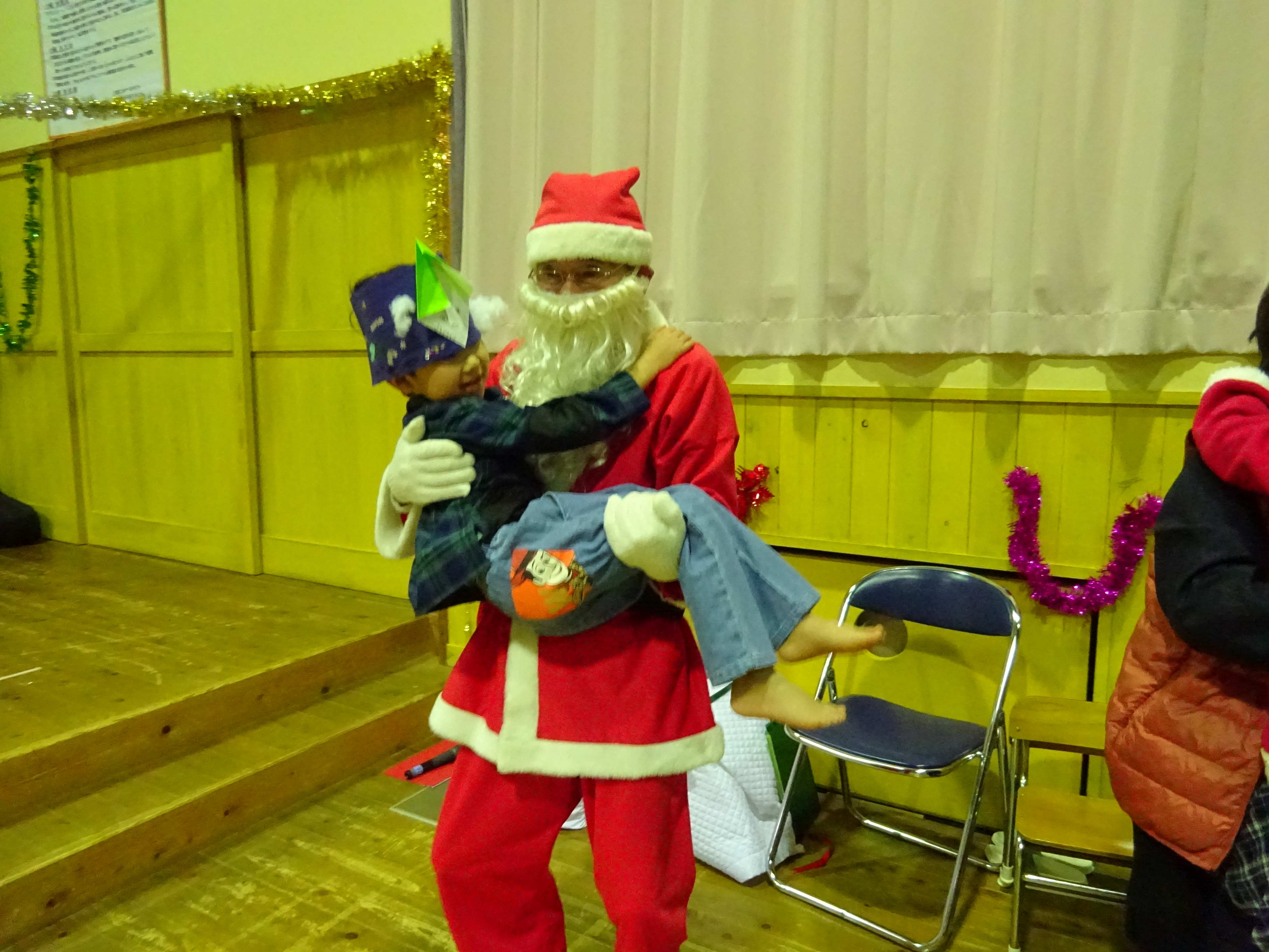 今年はいつもお世話になっている地域の方をお呼びして、一緒にクリスマス会を楽しみました。年長児のキャンドルサービスの後、鈴の音と共にサンタさんが登場し、子ども達は「わぁっ、サンタさんだ!」と大喜びでした。そして「おっくんバンド」の、おっくんとウッチーの2人によるクリスマスステージでは、ギターやピアノの音楽に合わせて、歌ったり踊ったりして大盛り上がりでした。