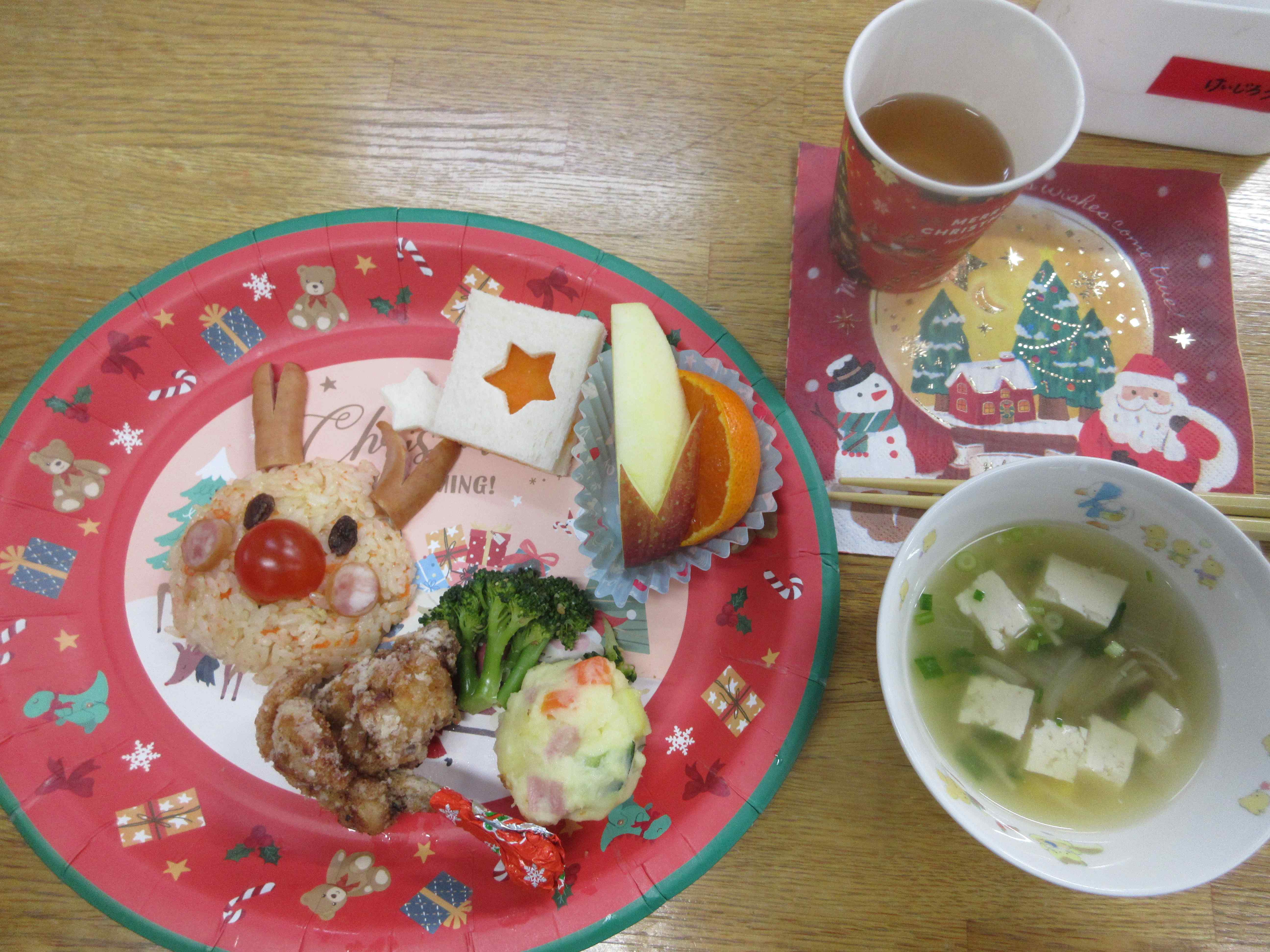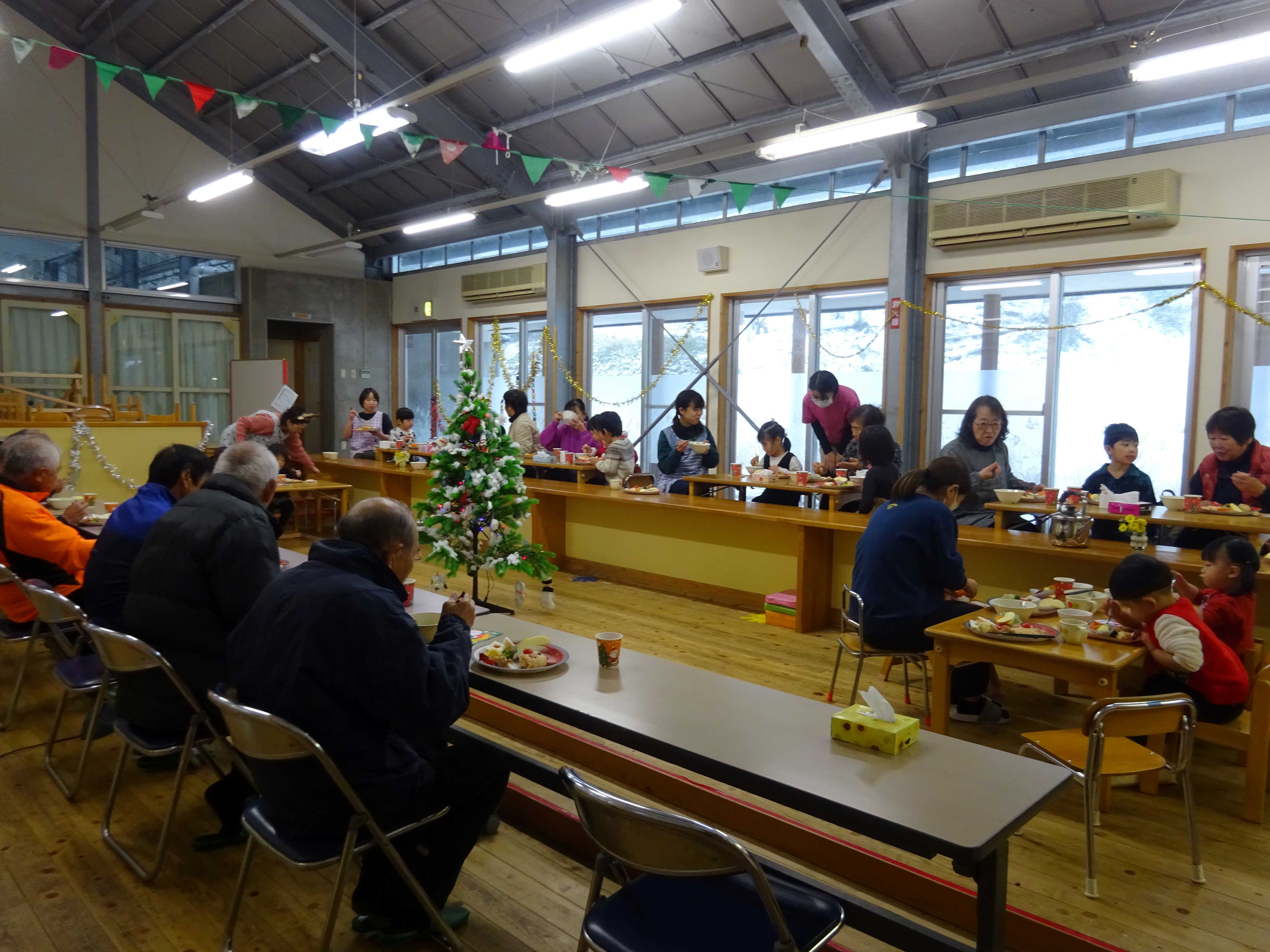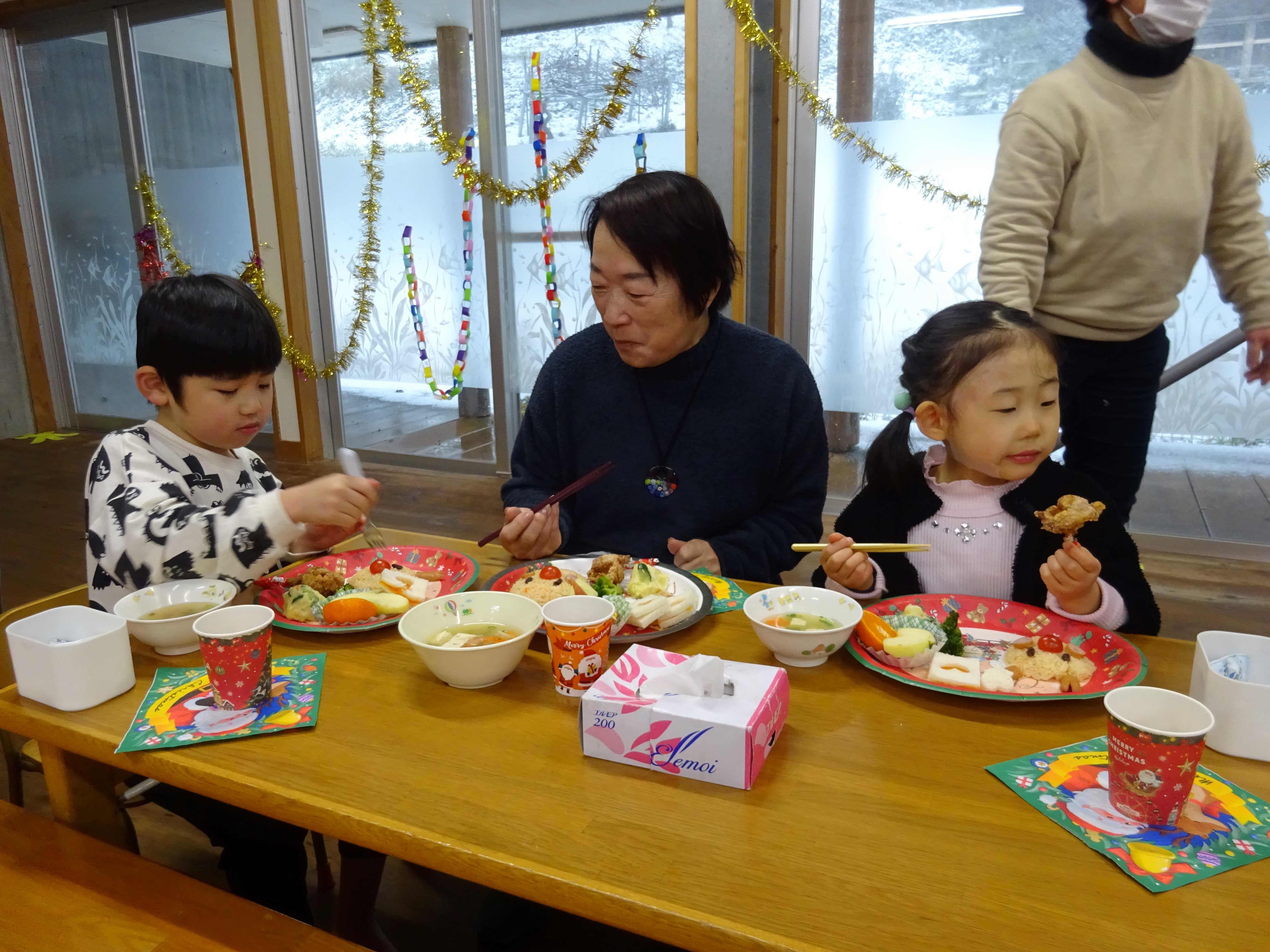 給食は可愛いトナカイプレートを、地域の方とおしゃべりを楽しみながら、嬉しそうに食べていました。