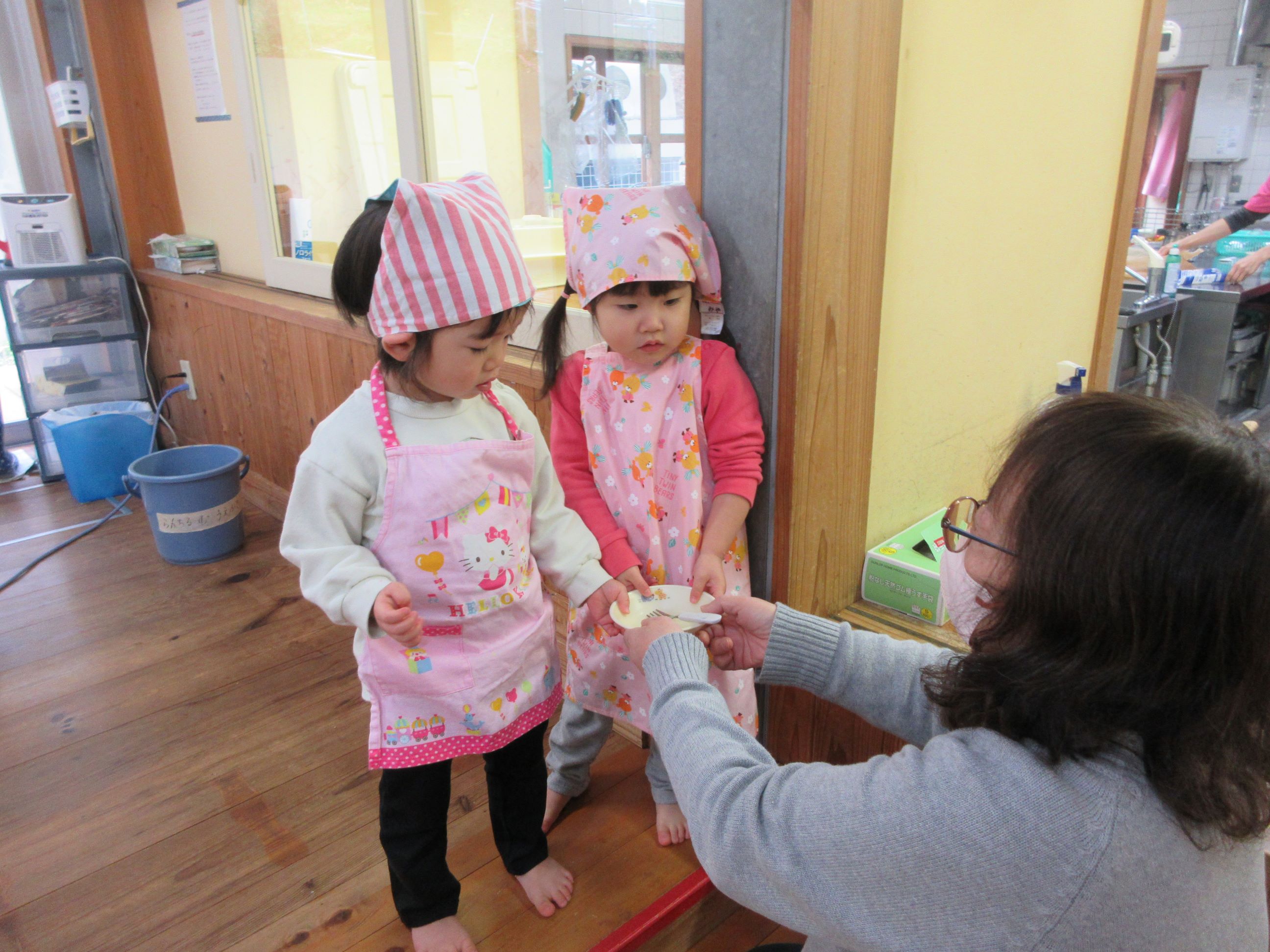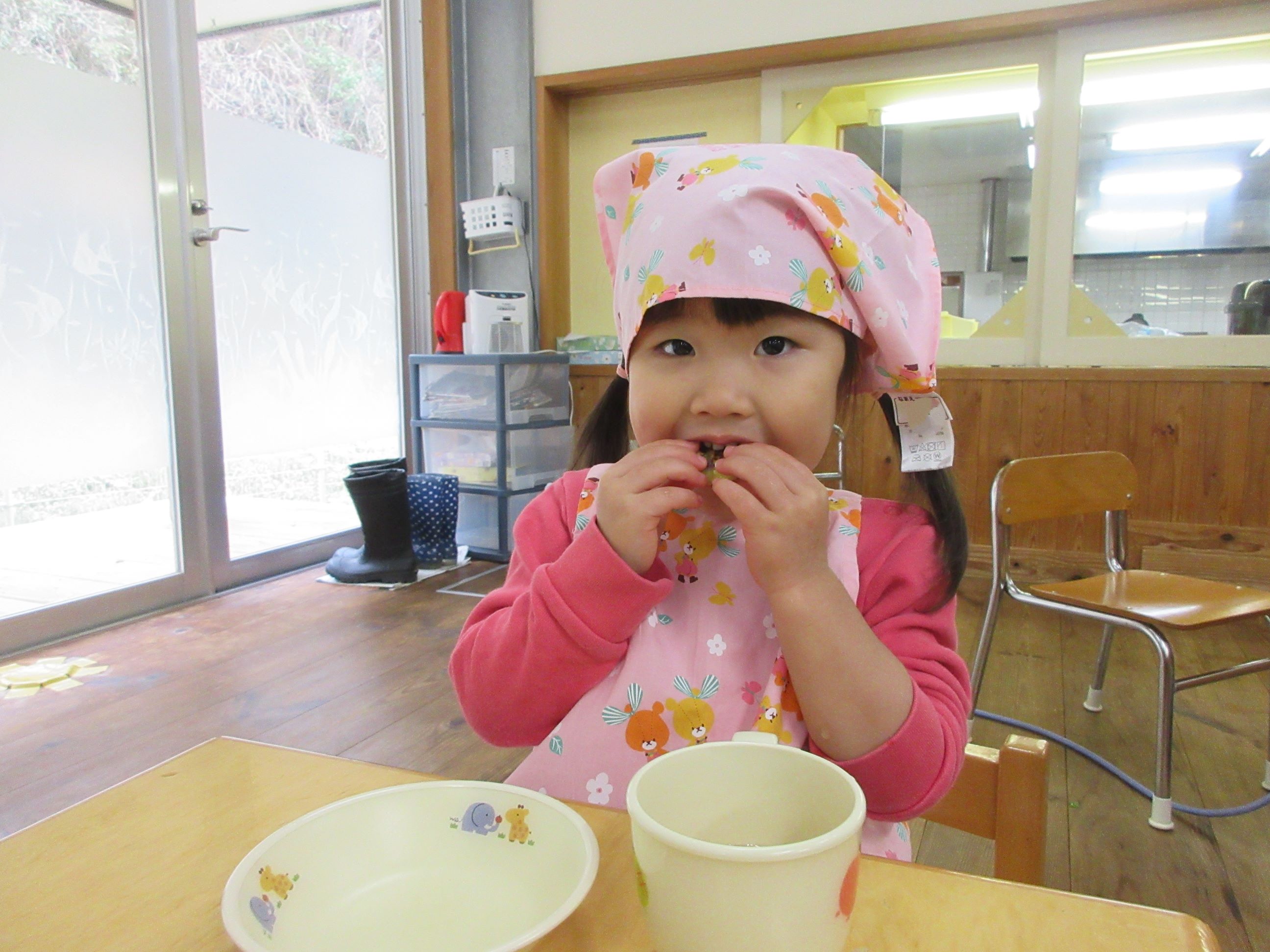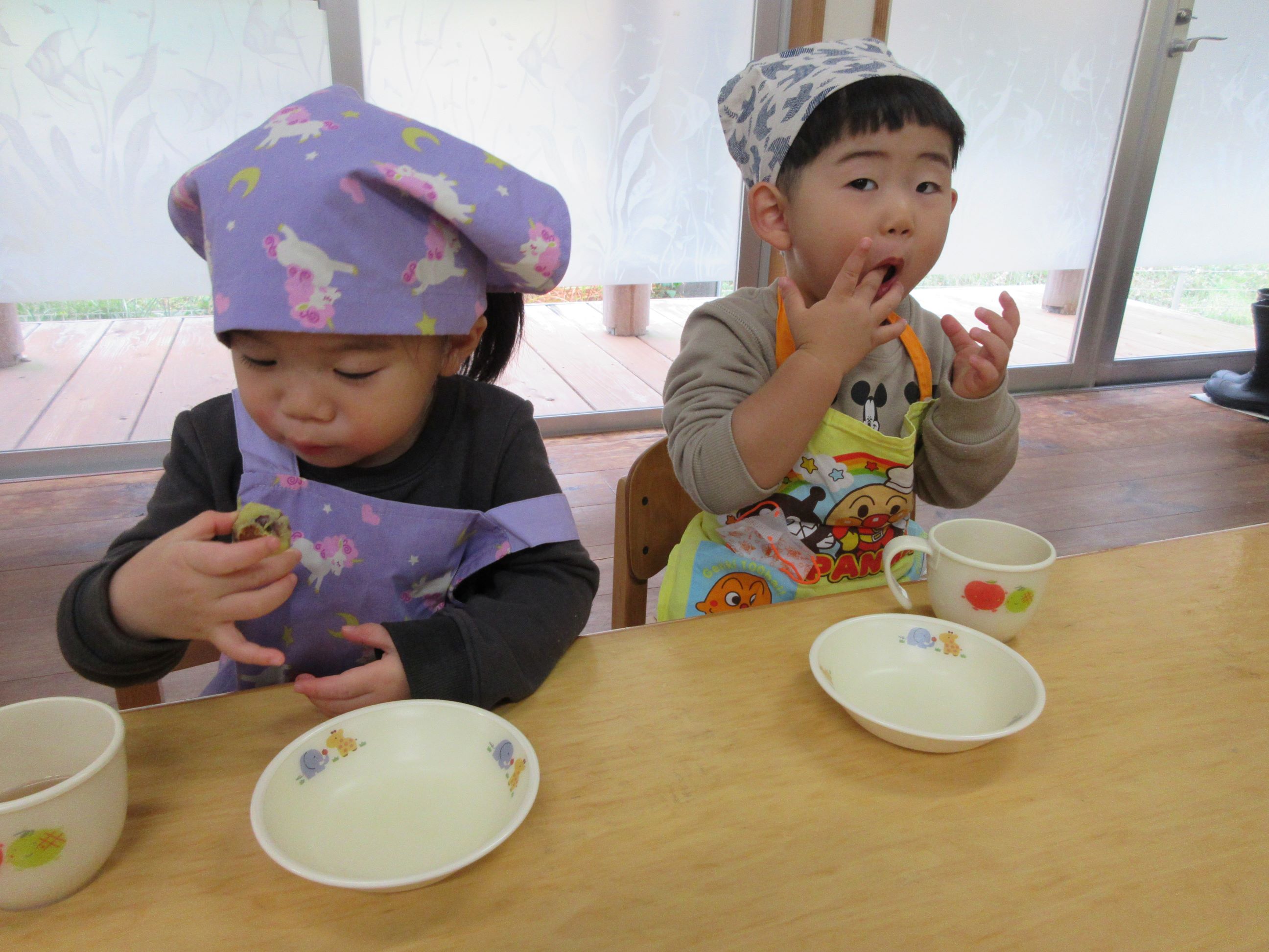 出来上がったのを「あったかい」「おいしい」「おかわりください」と言って頬張っていました。
