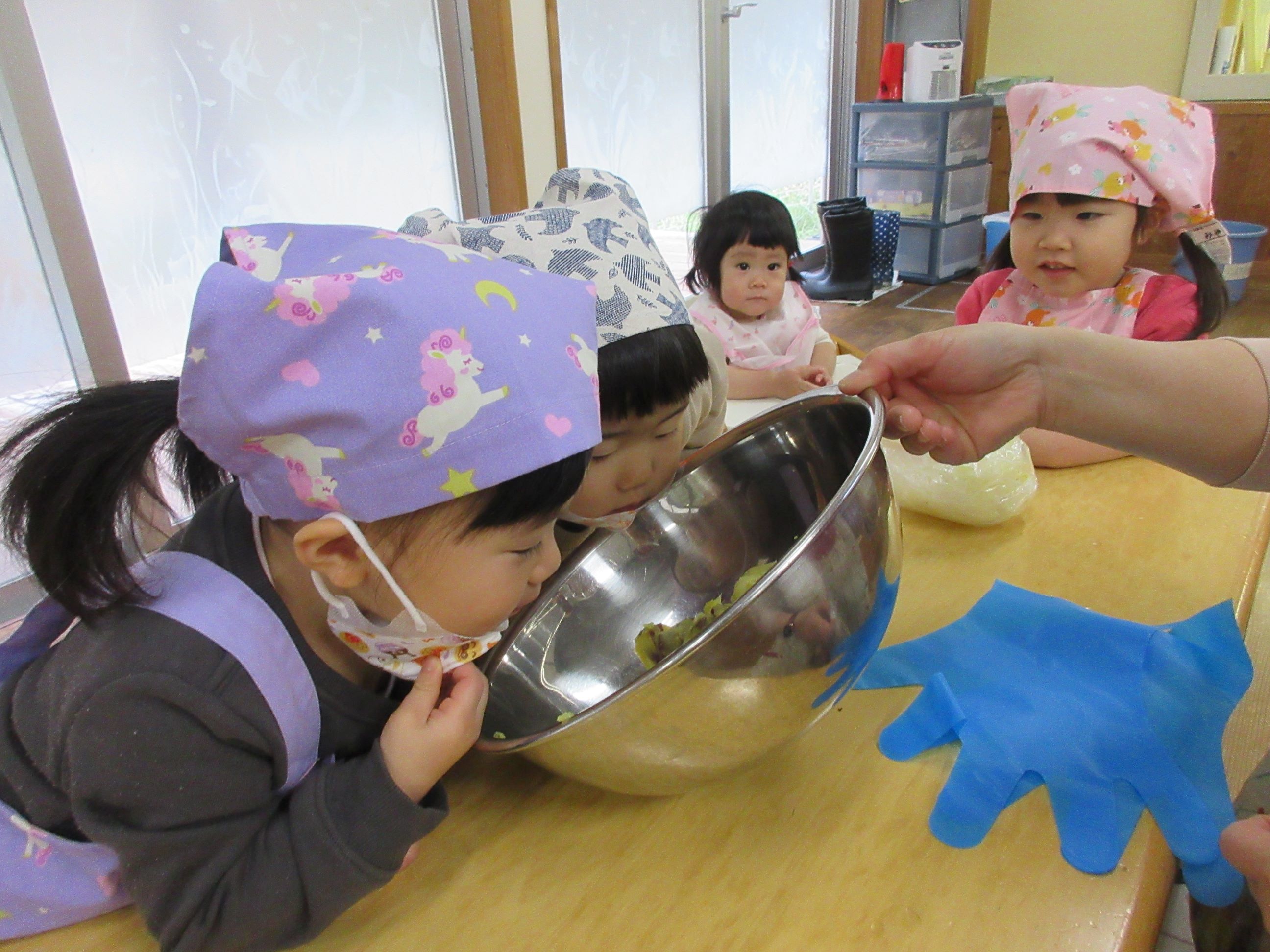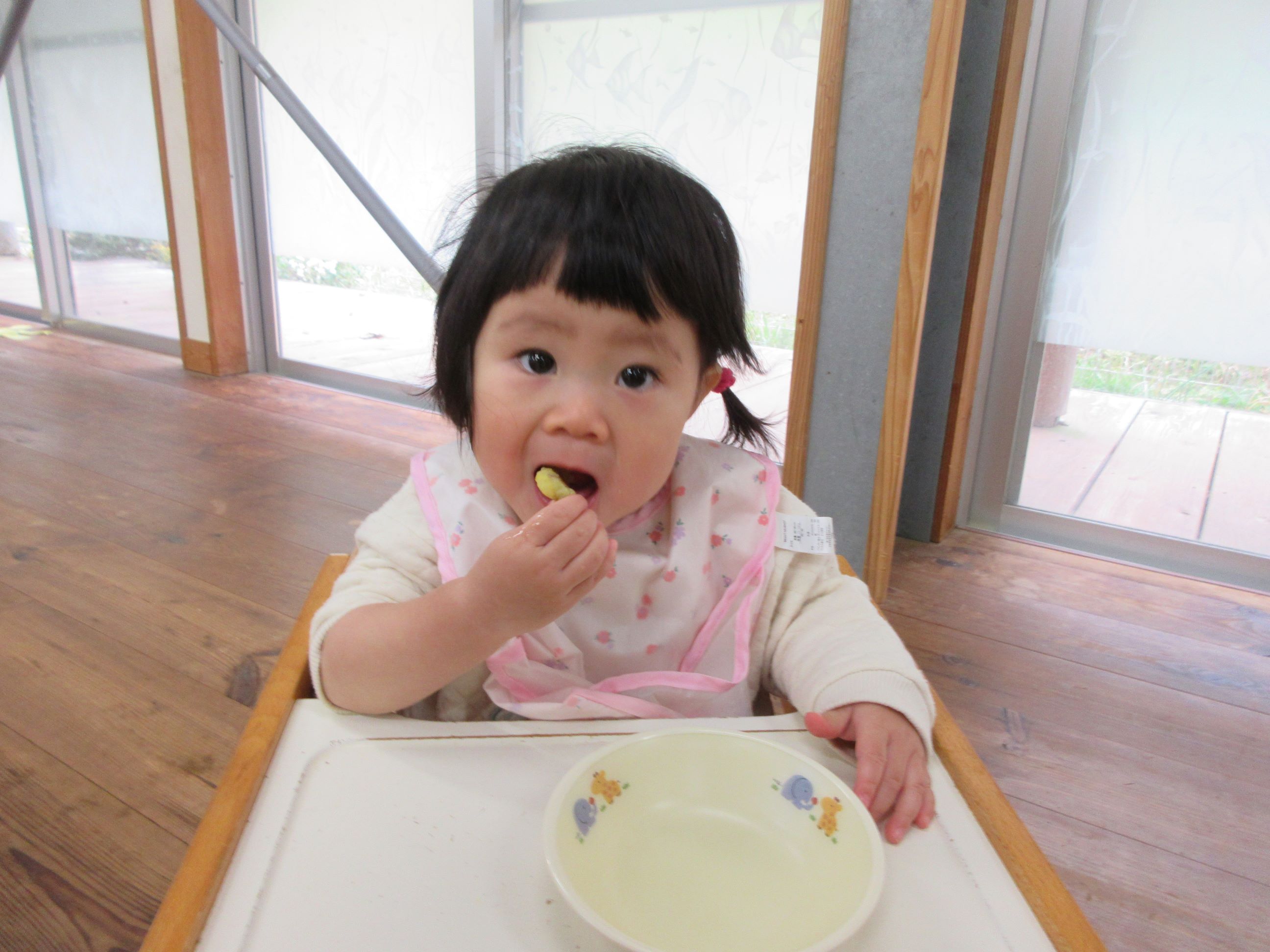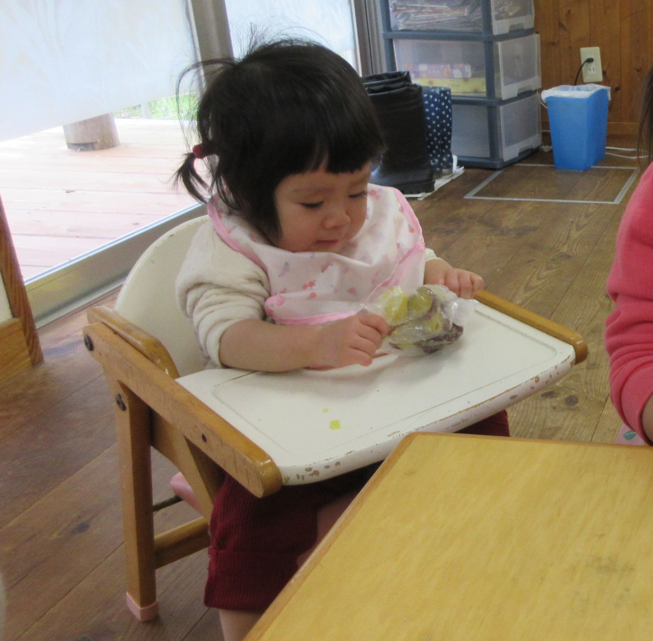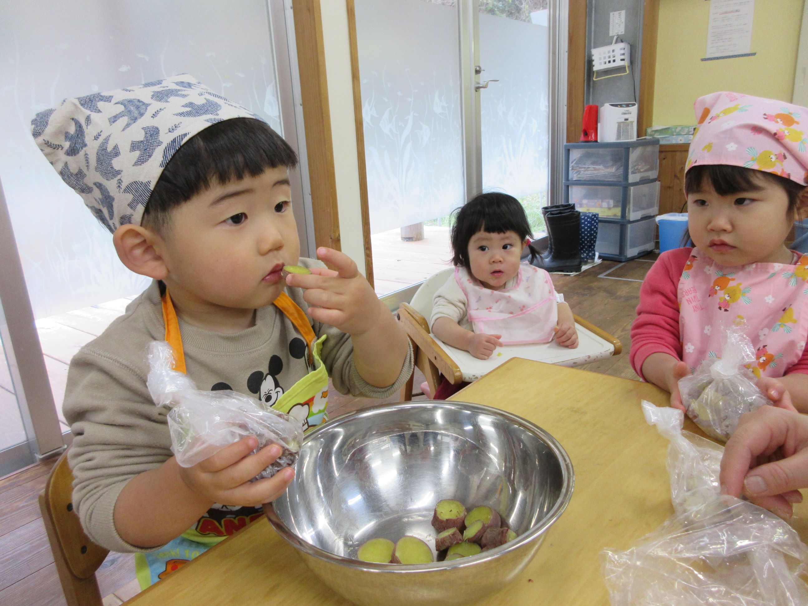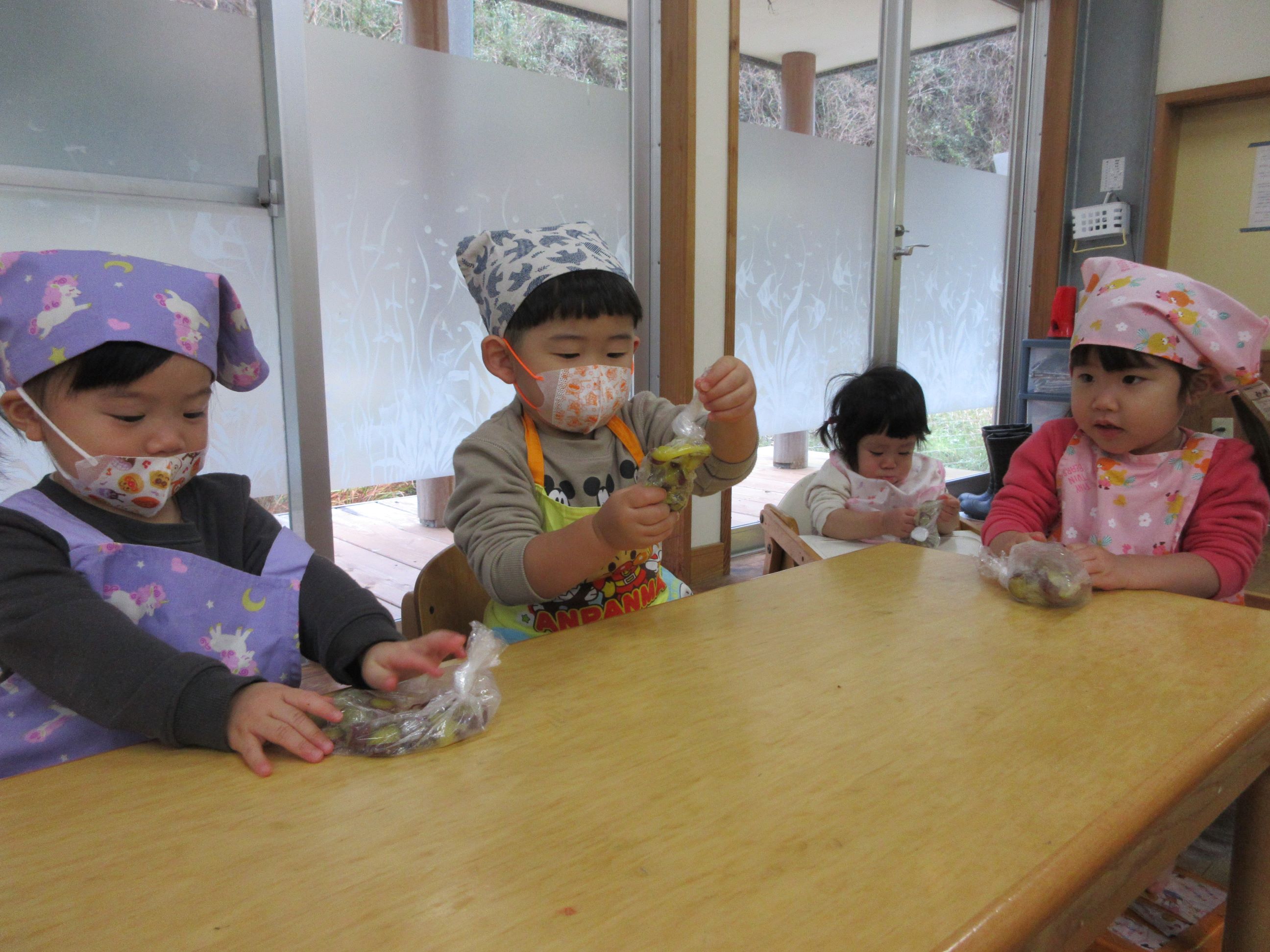 きれいに洗ったさつま芋を給食室で蒸してもらい、袋に入れて“にぎにぎにぎ……”「あったかーい」「みてー(つぶれたー)」とつぶすことを楽しんでしていました。