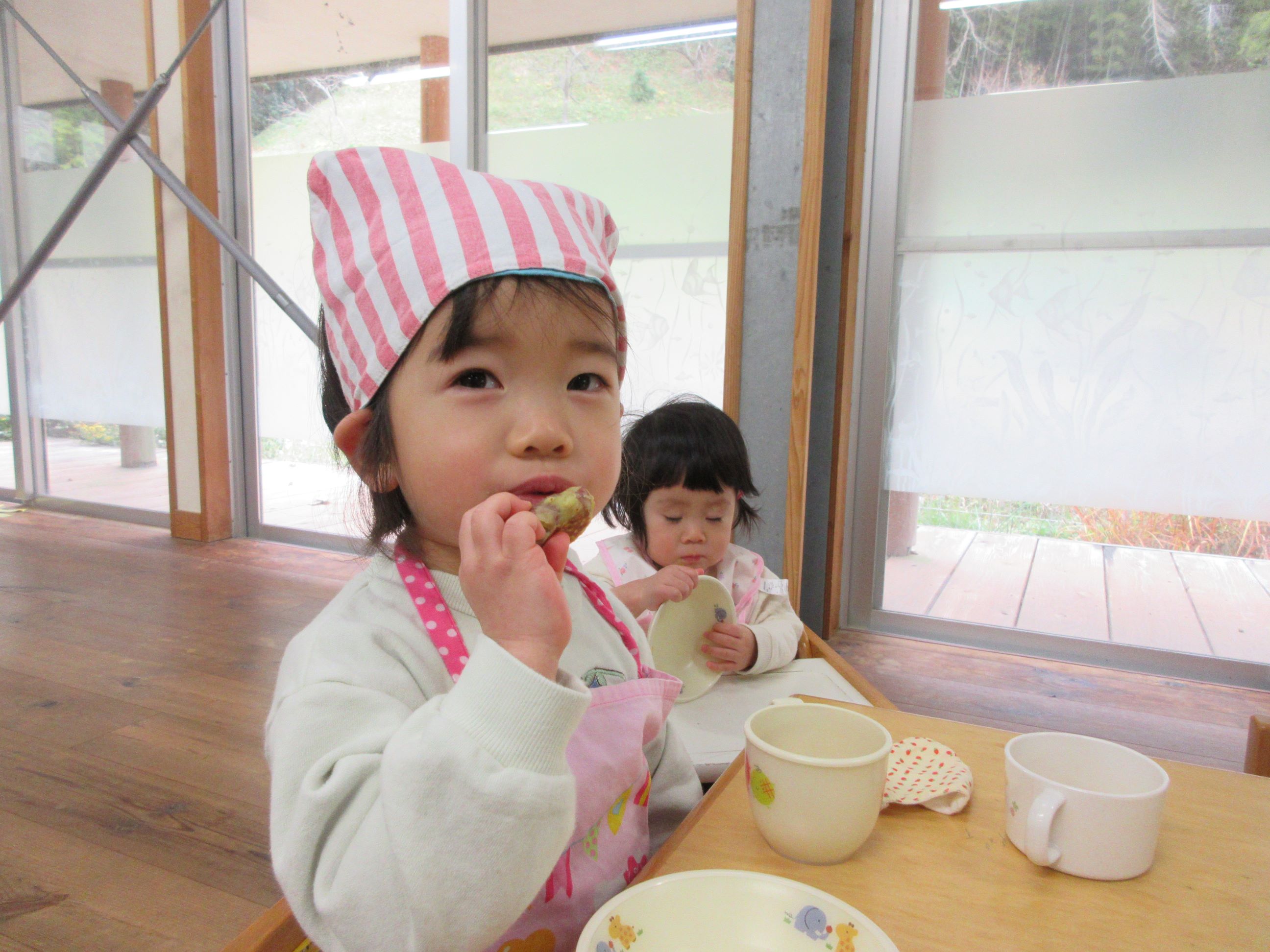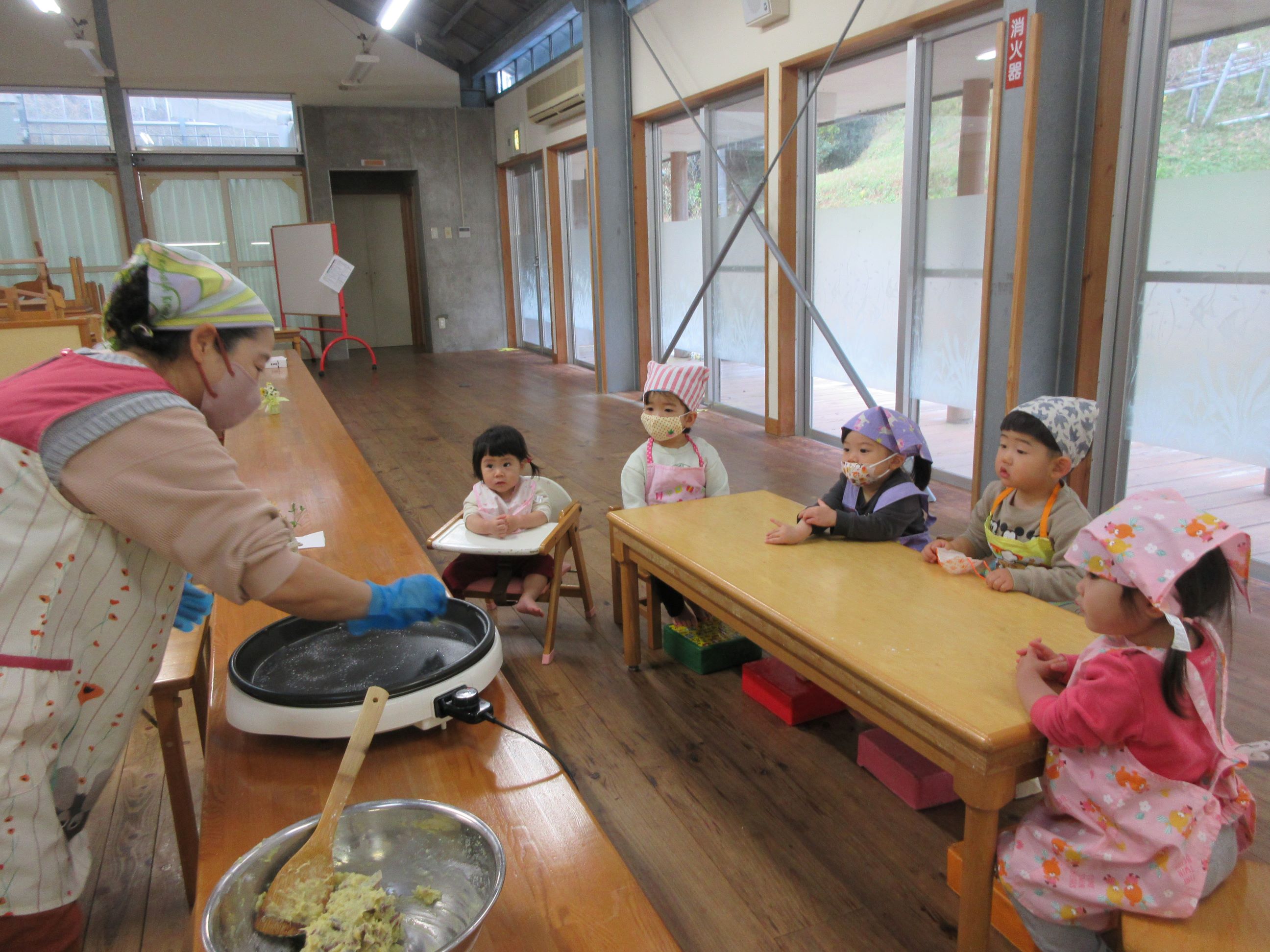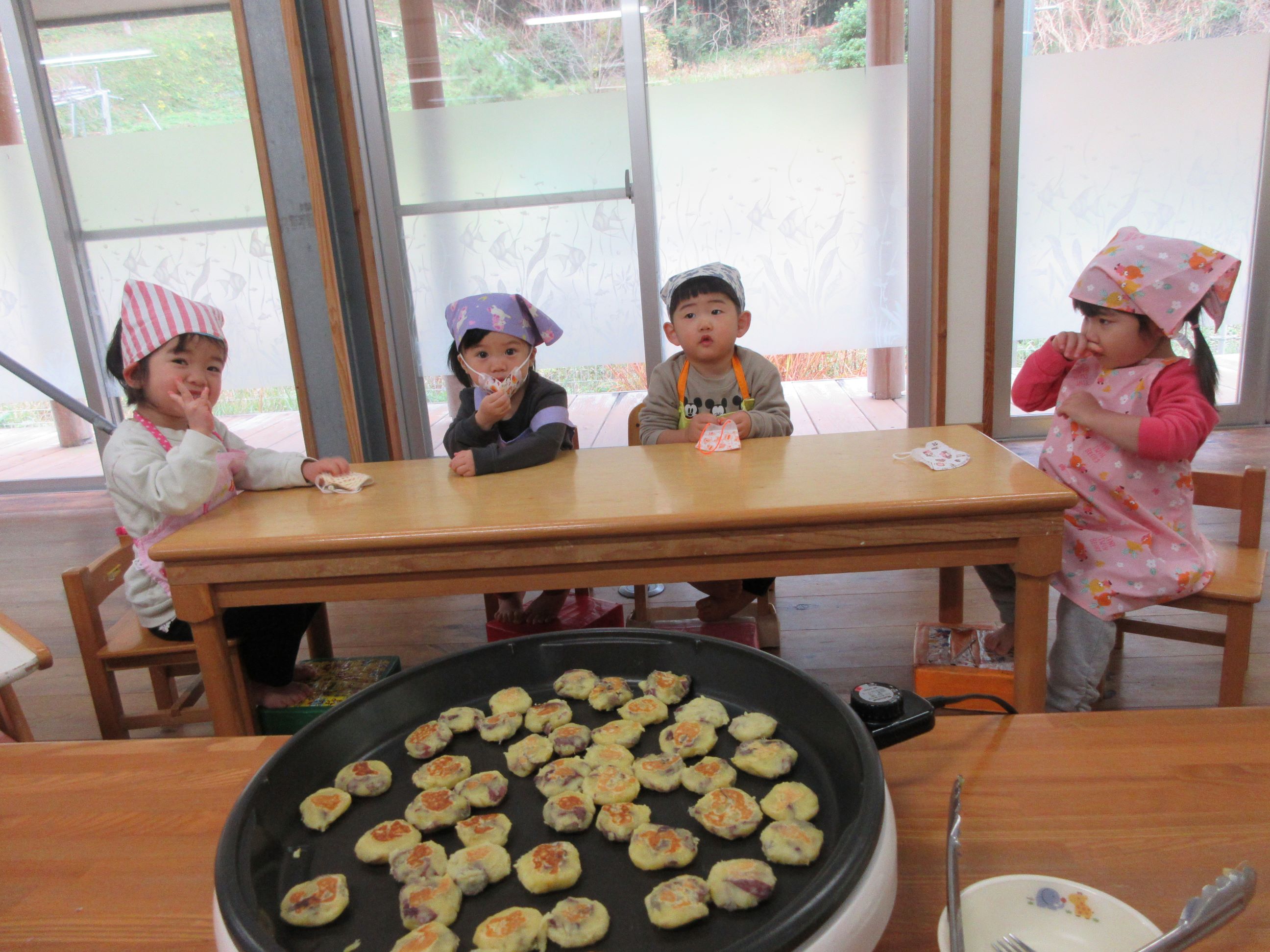 つぶれたところに、牛乳、片栗粉を混ぜてから、焼きました。「おいものにおい」「いいにおい」と焼ける匂いも楽しみました。