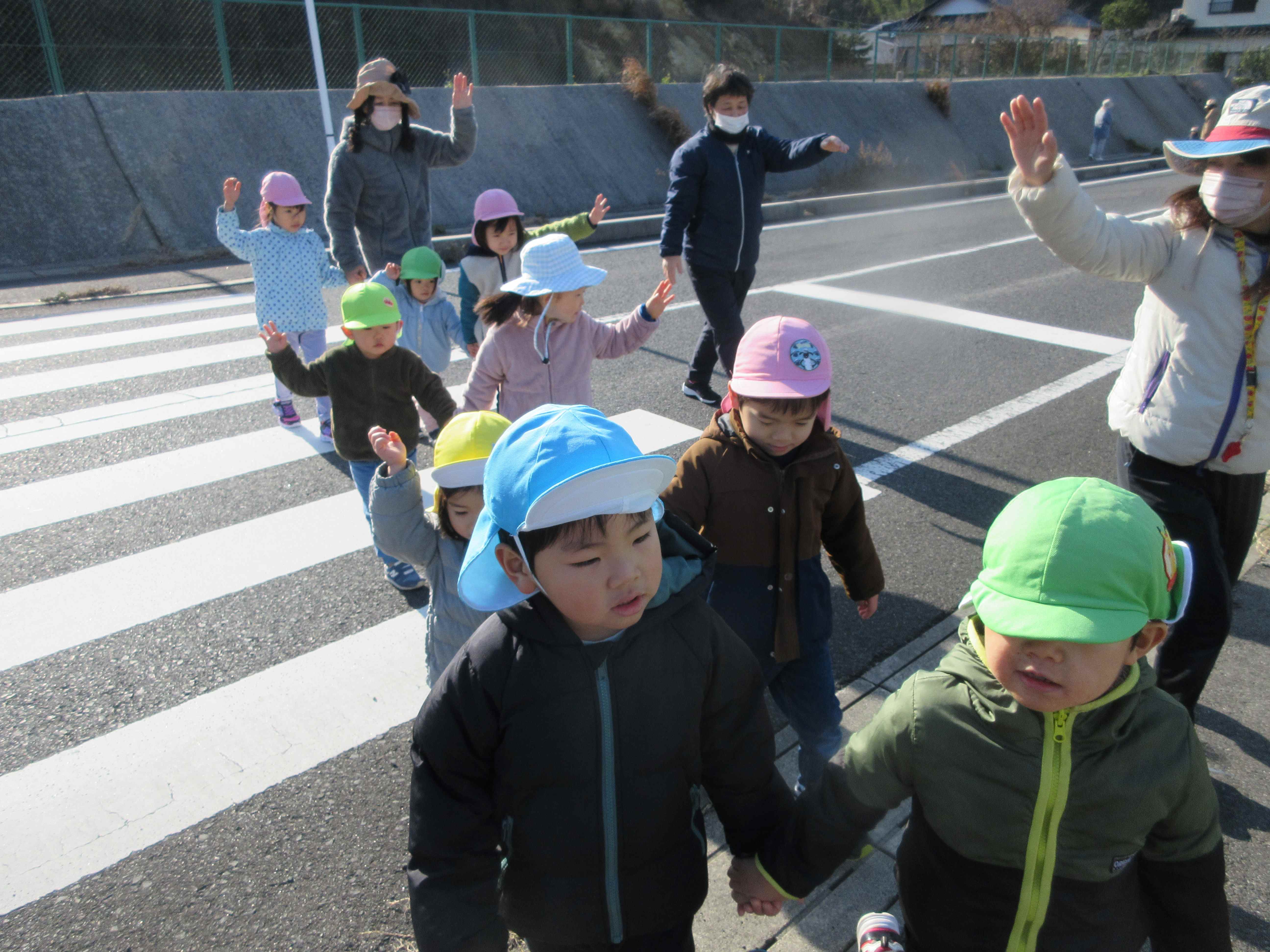 「やなみじんじゃに、しゅっぱーつ!」横断歩道を渡る時は、きちんと手を挙げて渡ります。