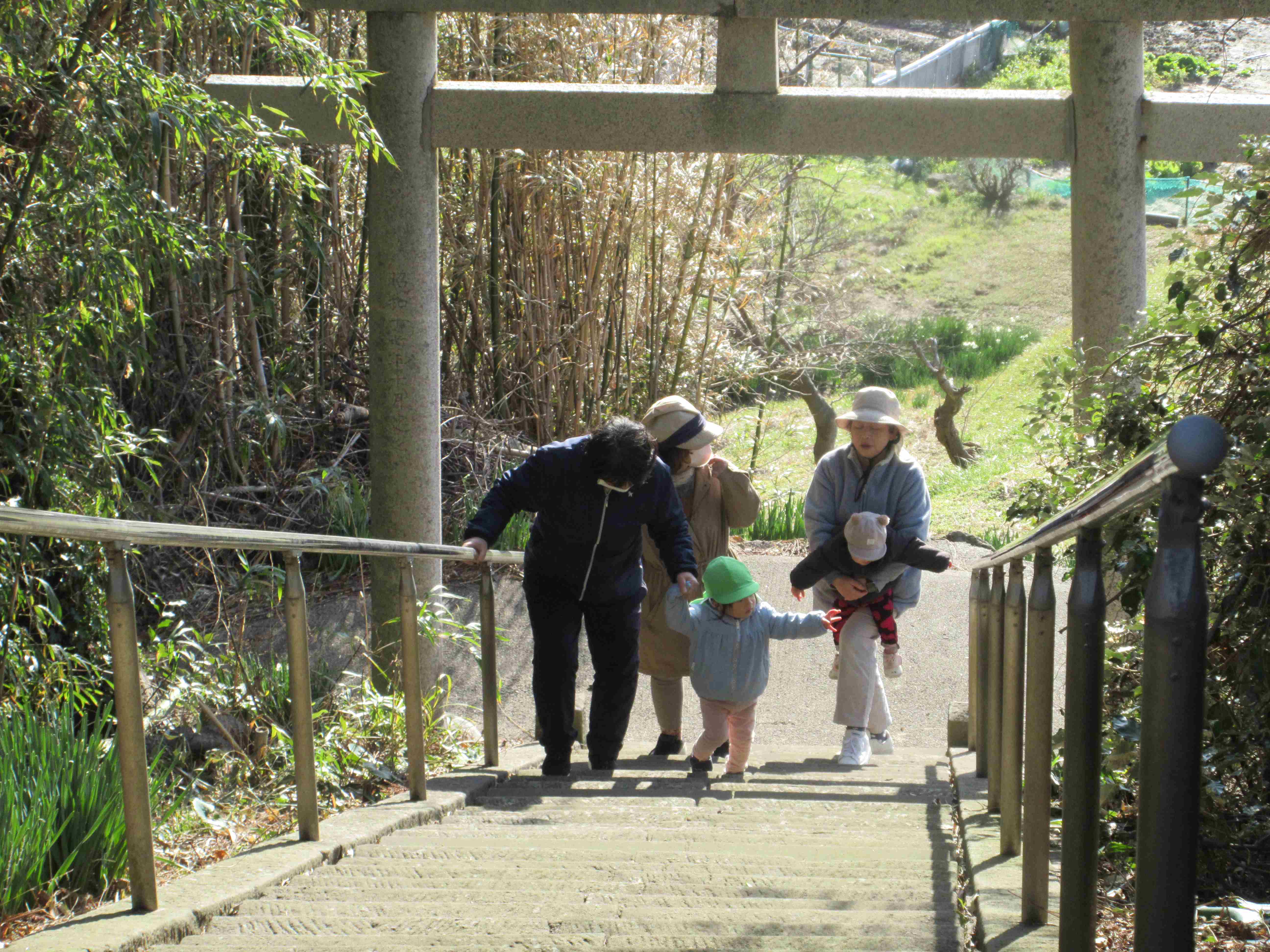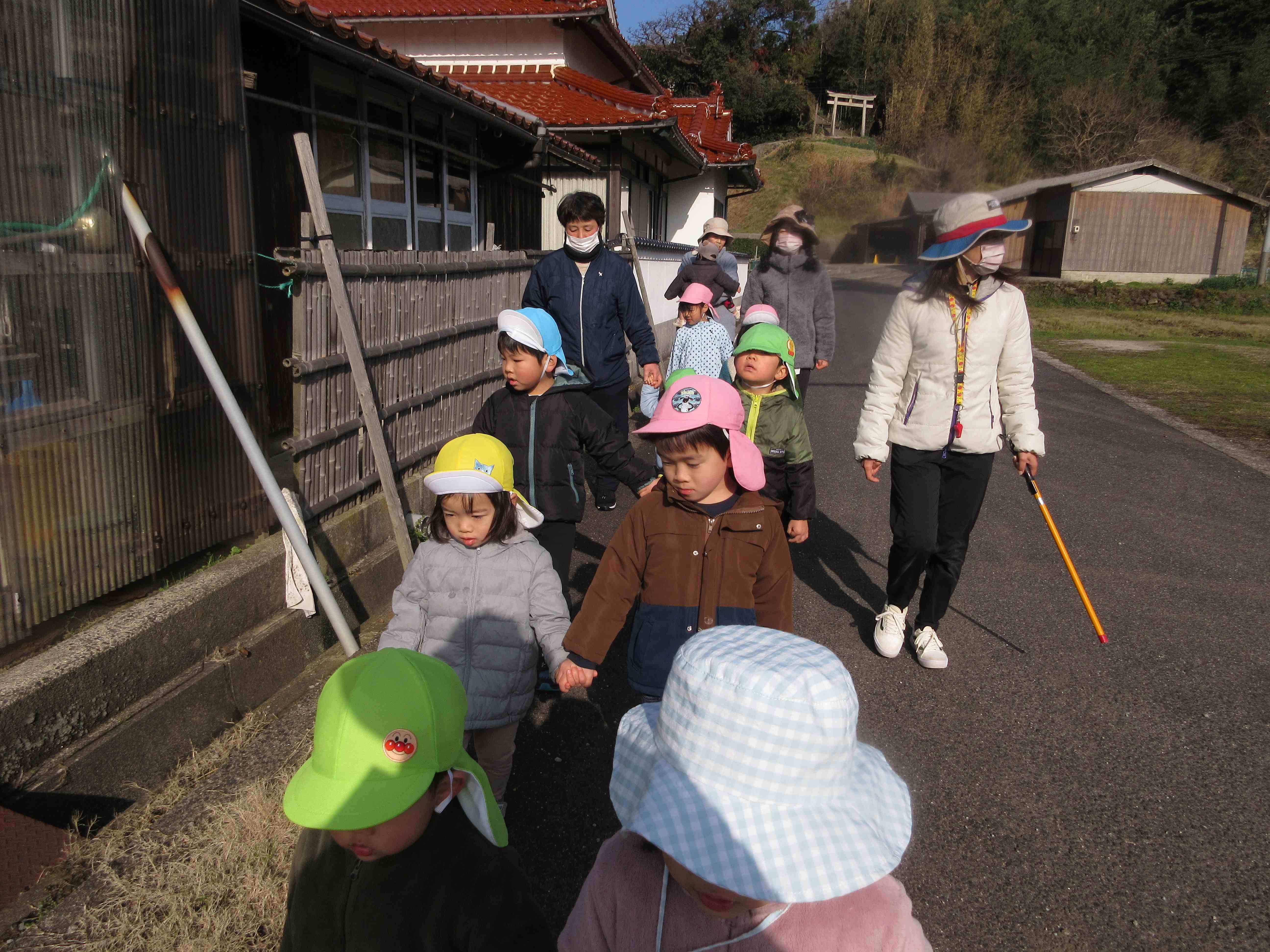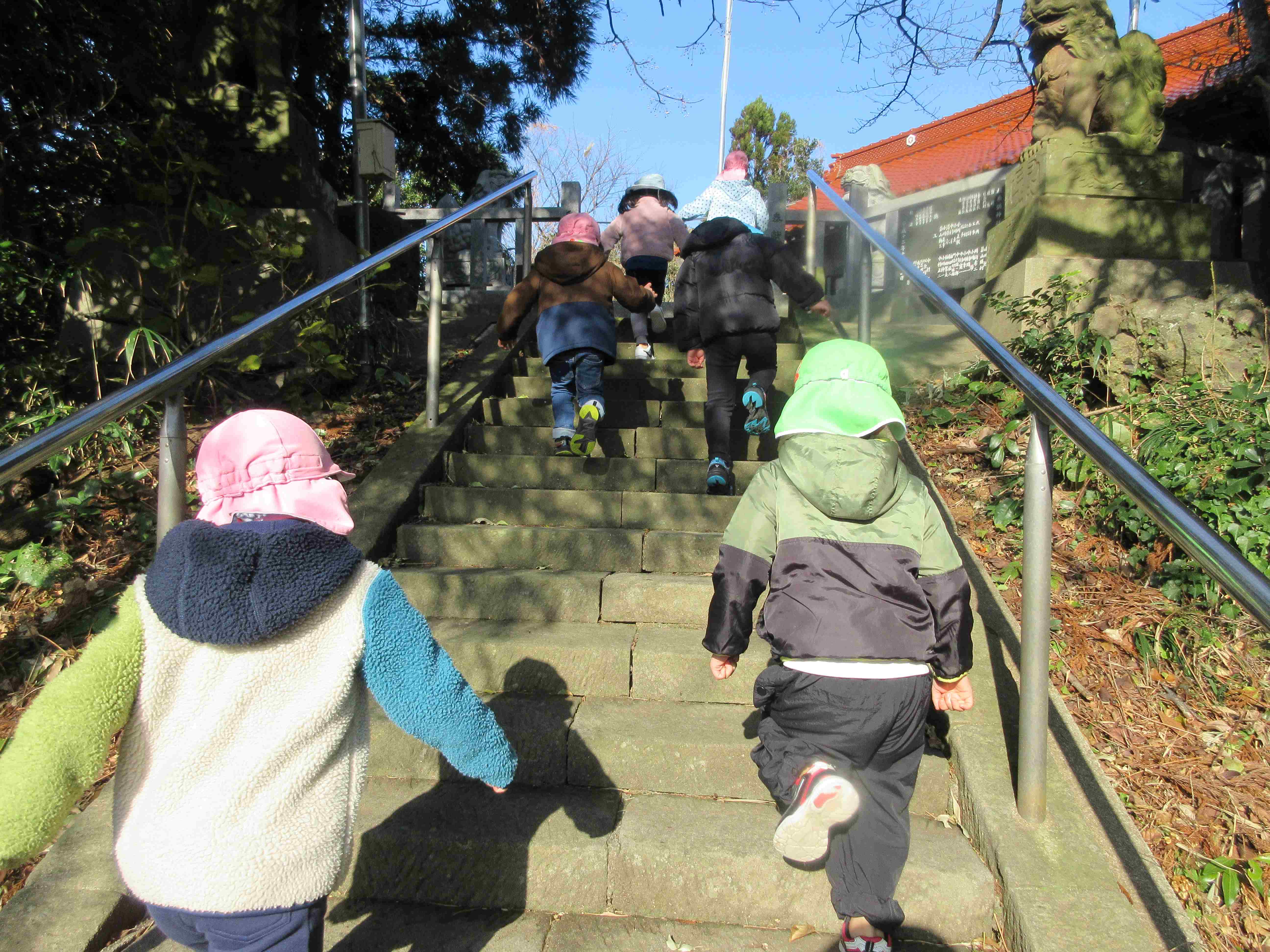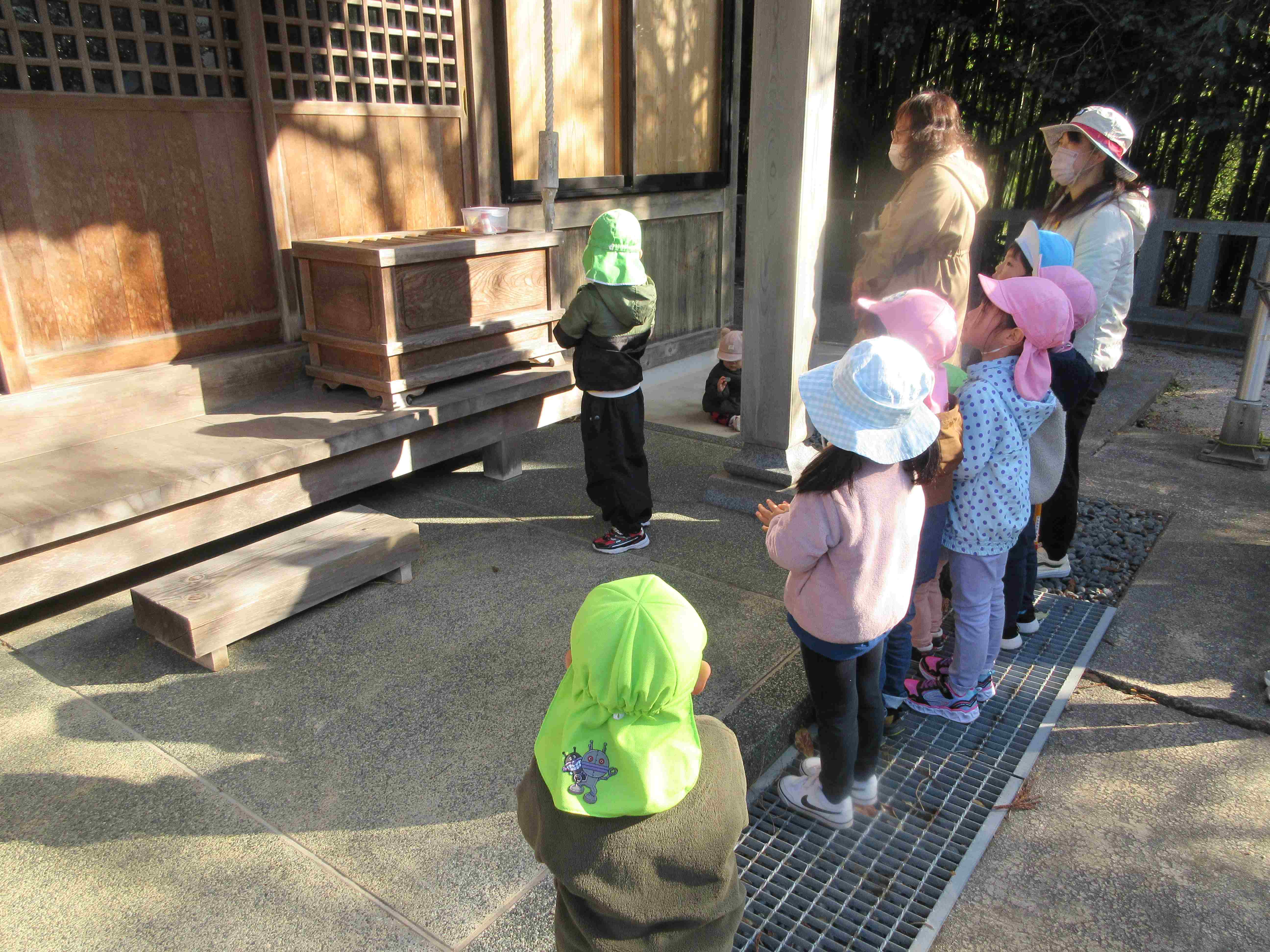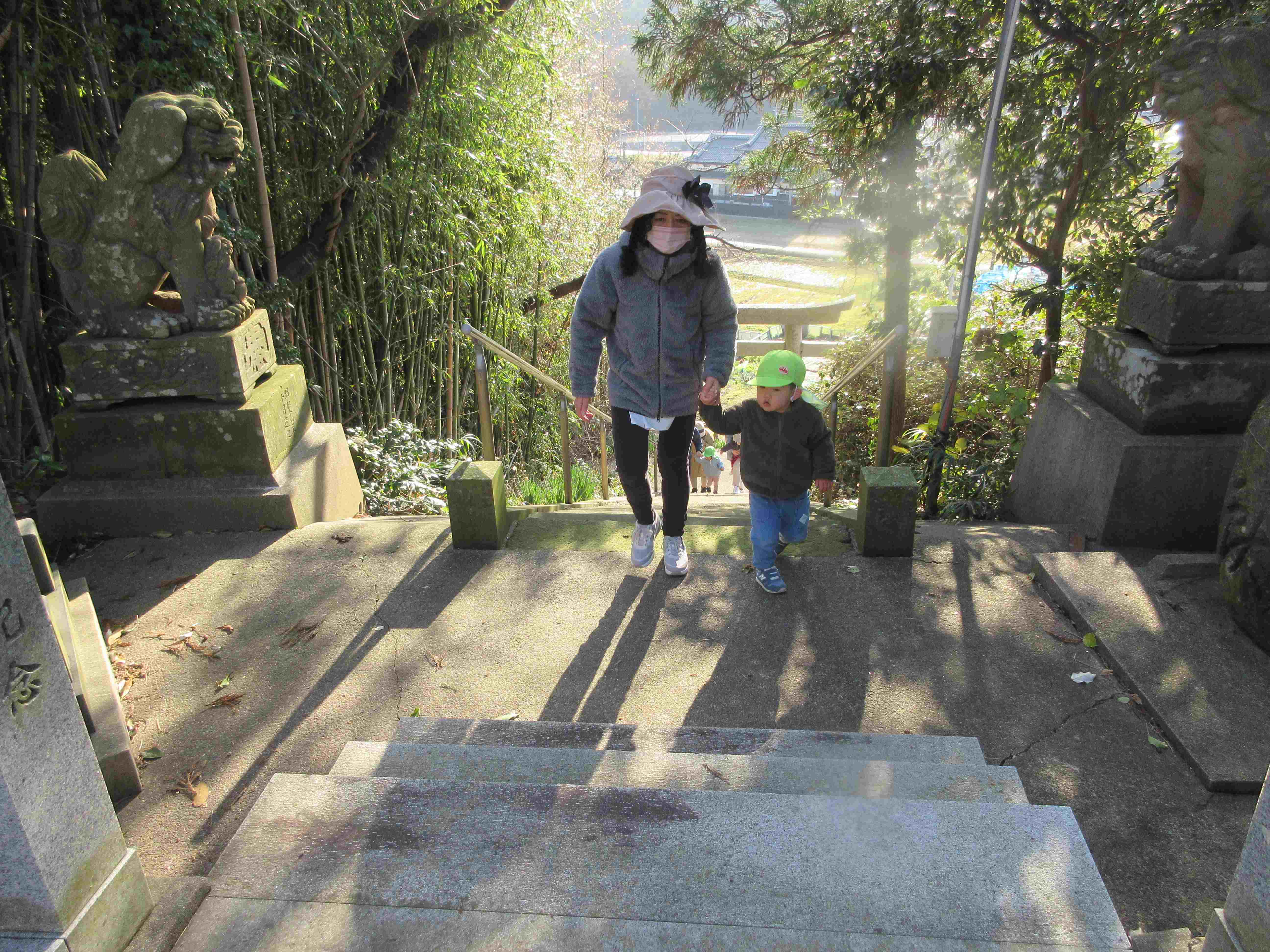 令和6年がスタートしました。気持ちの良い青空の下、全園児で奴奈彌神社へ初詣に行きました。道中は手を繋いで歩き、「そこあぶないよ」「こっちだよ」と声をかけながら歩く姿が見られました。神社ではぎゅっと目をつむり、手を合わせてお祈りをしていました。皆の願いが、神様に届きますように・・・。
