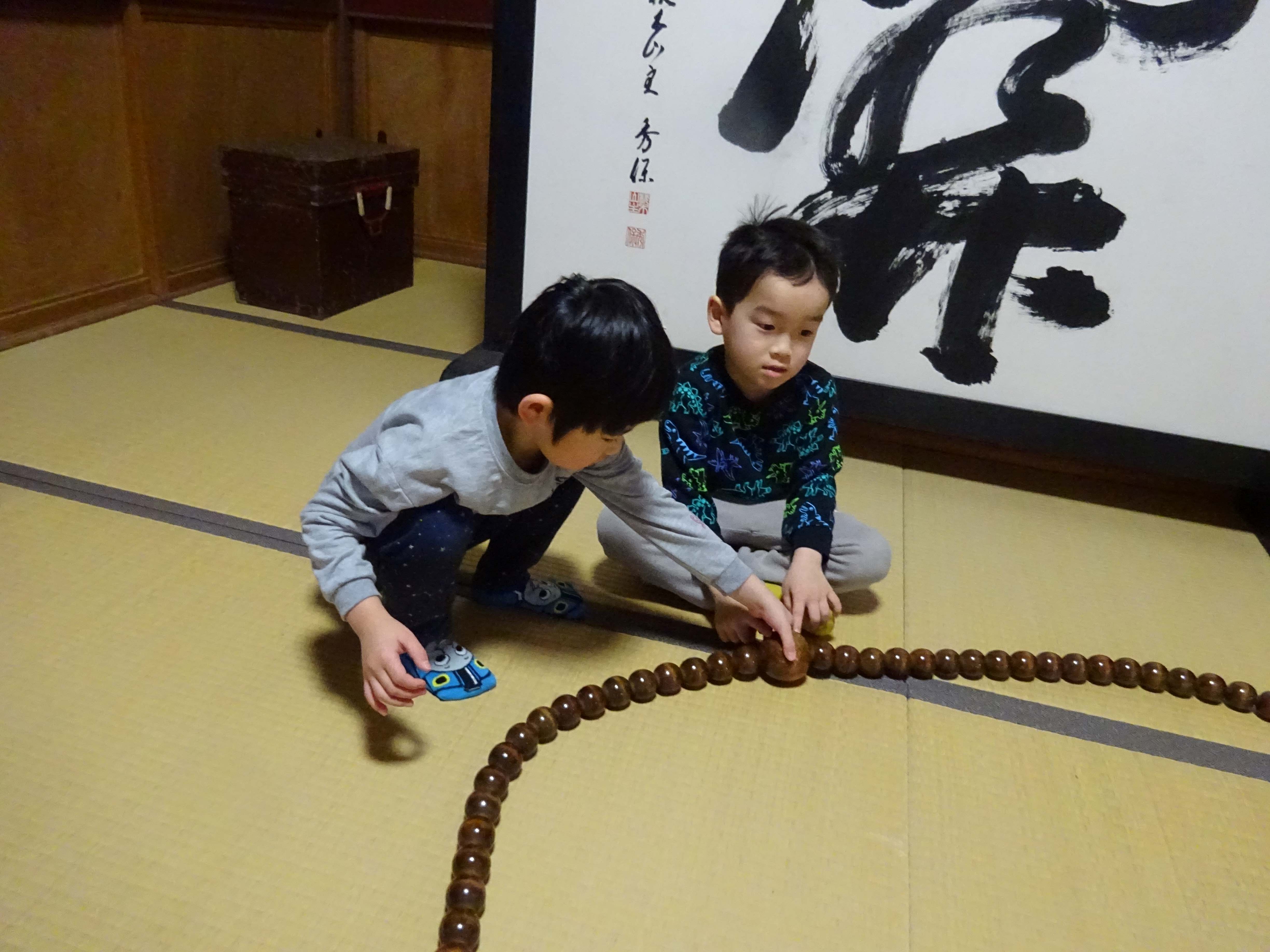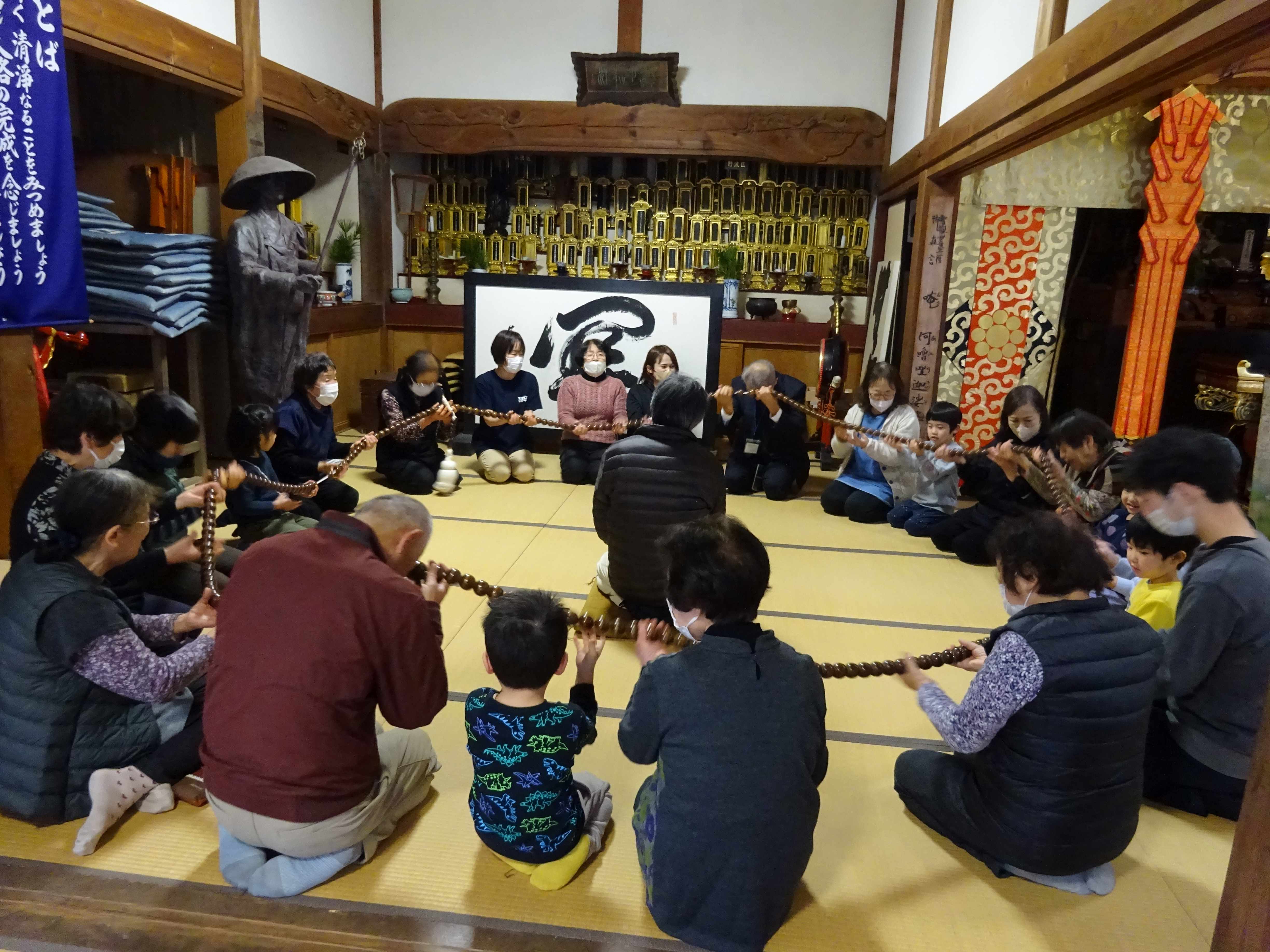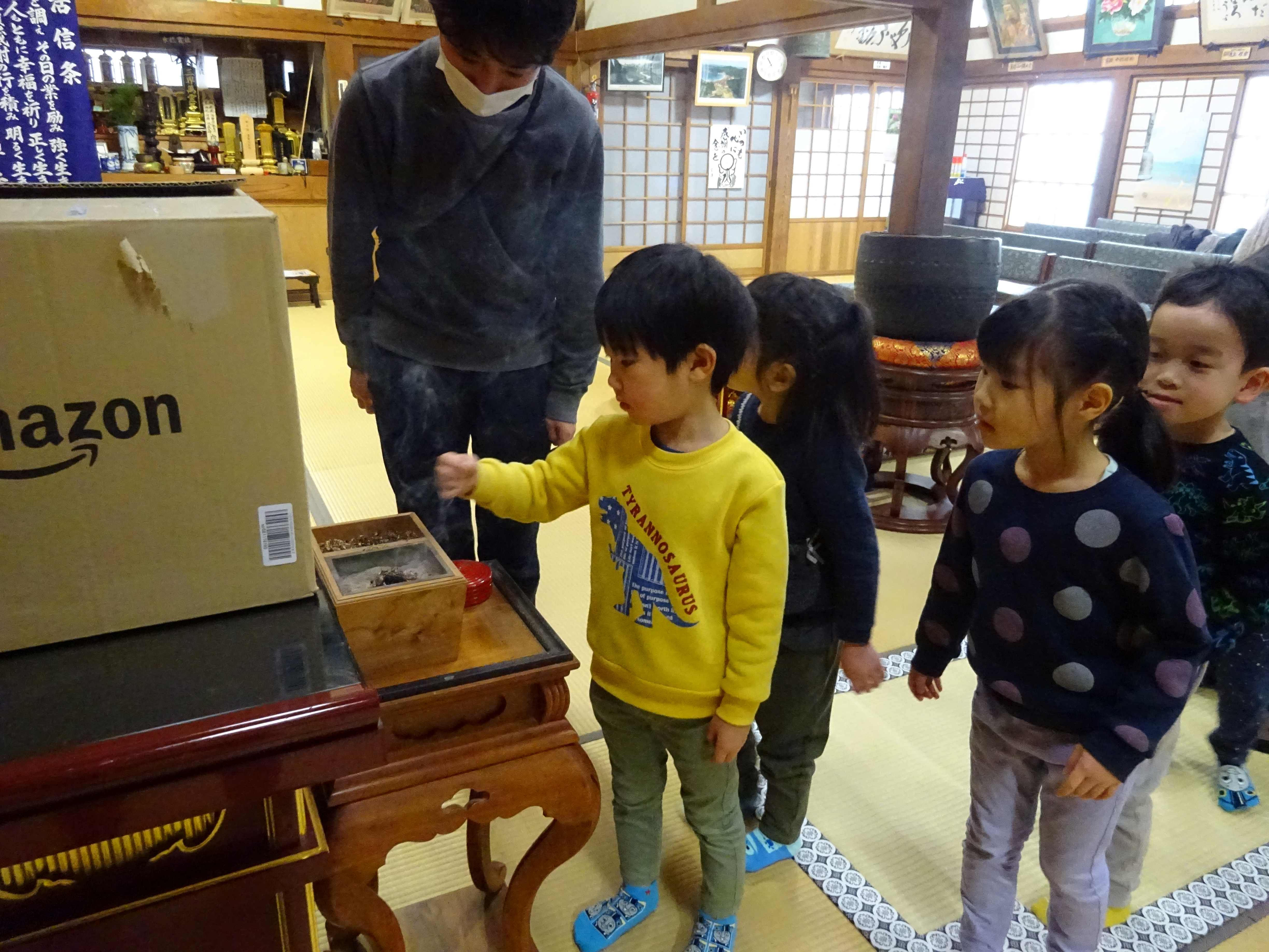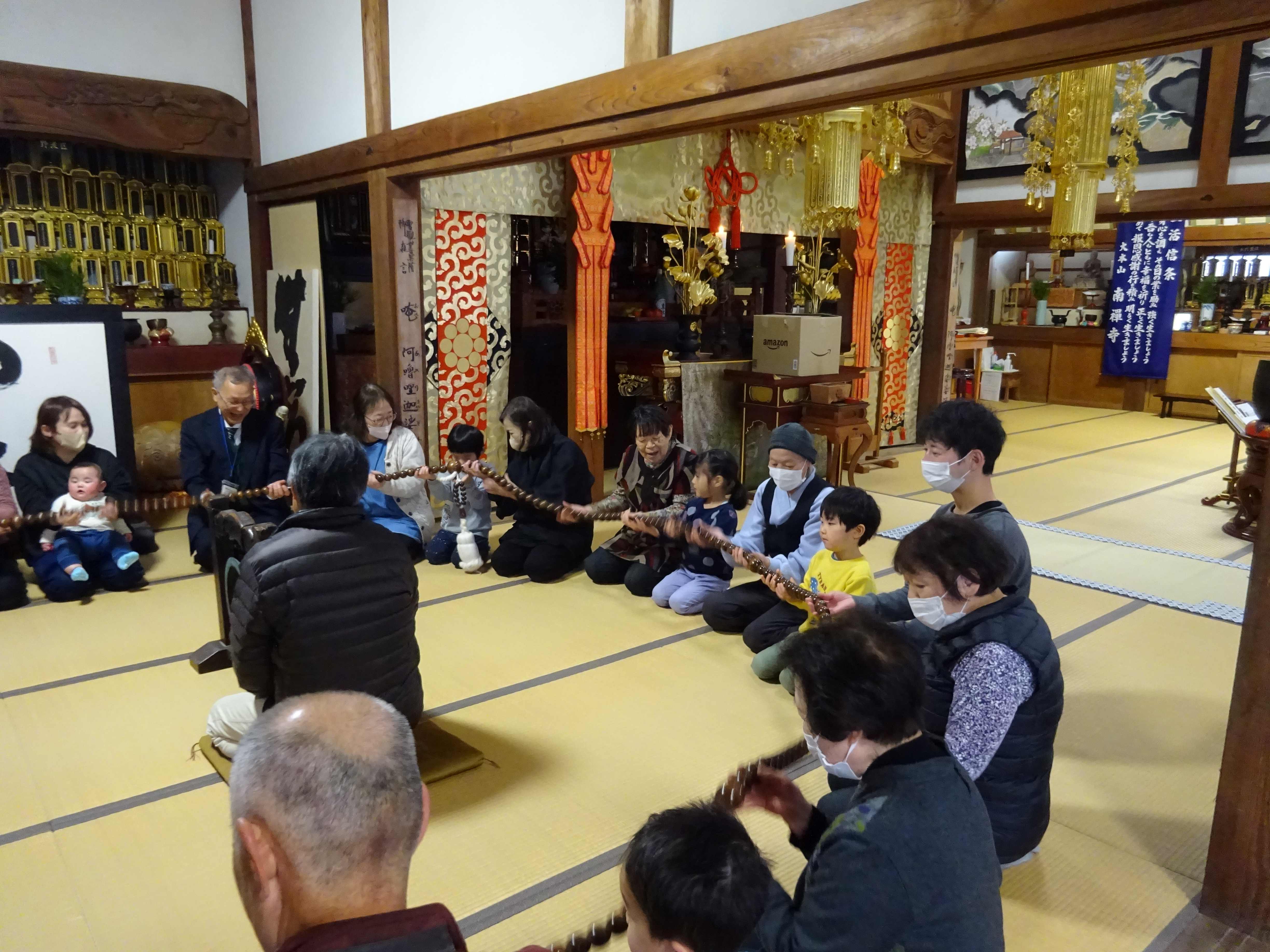 見徳寺で行われた数珠繰りに参加しました。始めにお経文を持って皆でお経を唱えると、「・・・いまどこ?」「このじ、なにってよむの?」と言いながら、必死になって目で追いかけている子ども達の姿が見られました。焼香を終えると、地域の方達と一緒に数珠繰りを行いました。数珠の大きさが大小あり、中くらいや大きな数珠が自分の前に来る時、一年の健康を願いながら額につけます。少し大きな玉が自分の前に来ると、おずおずと額をつける子、通り過ぎてしまう子もいましたが、地域の方に優しくやり方を教えてもらう事で慣れて、笑顔で行っていました。地域の方達との温かな触れ合いの時間となりました。
