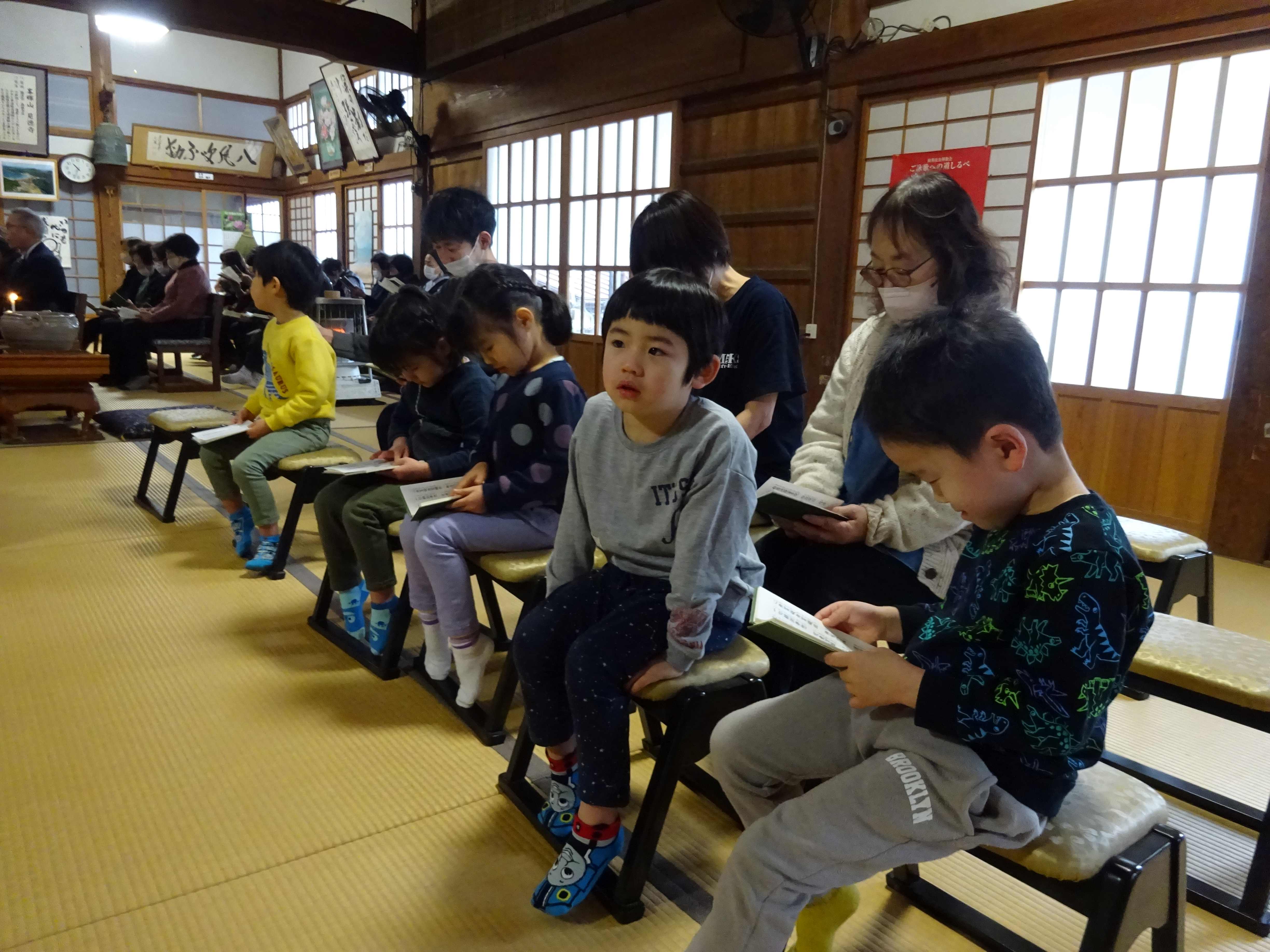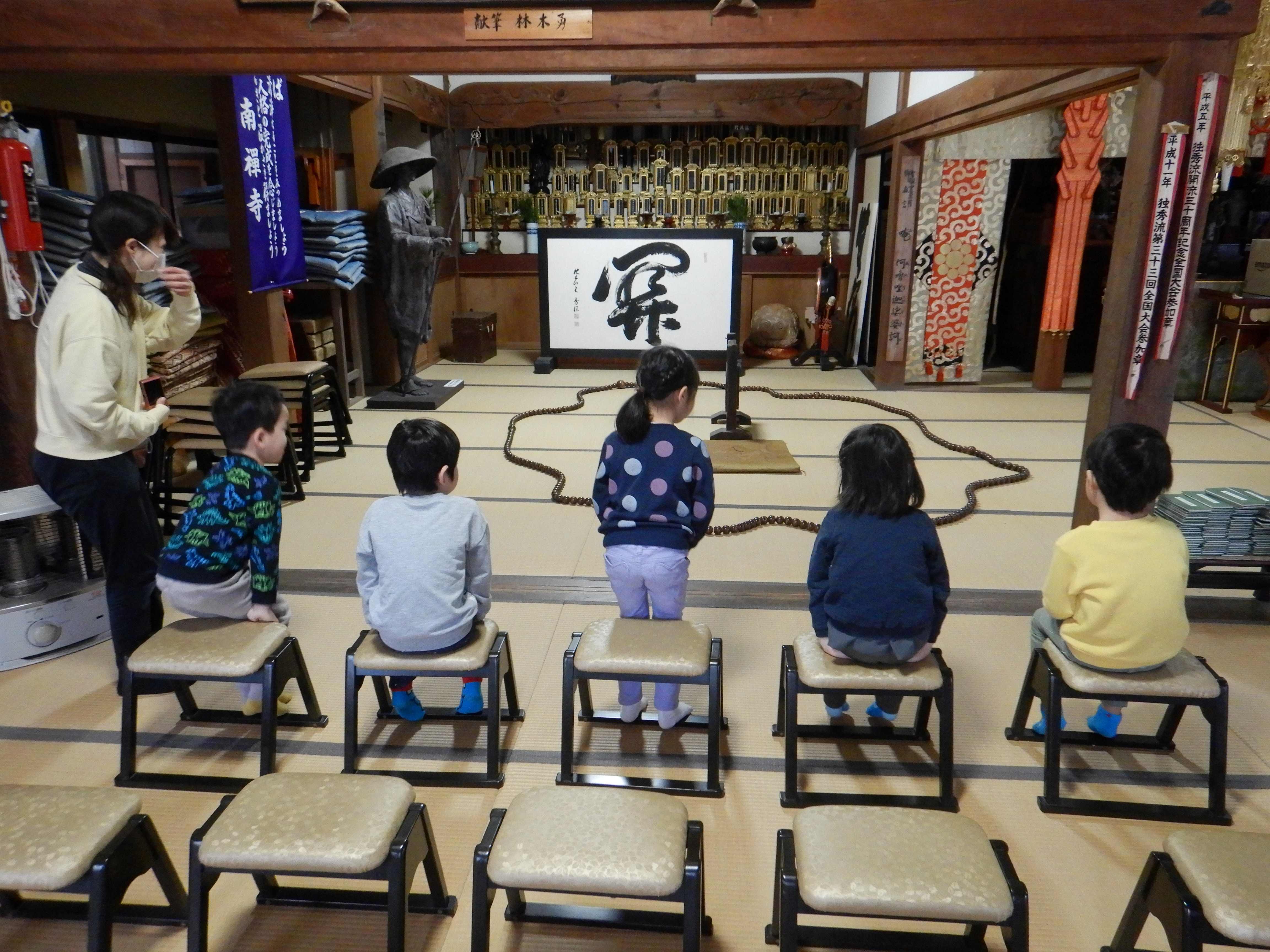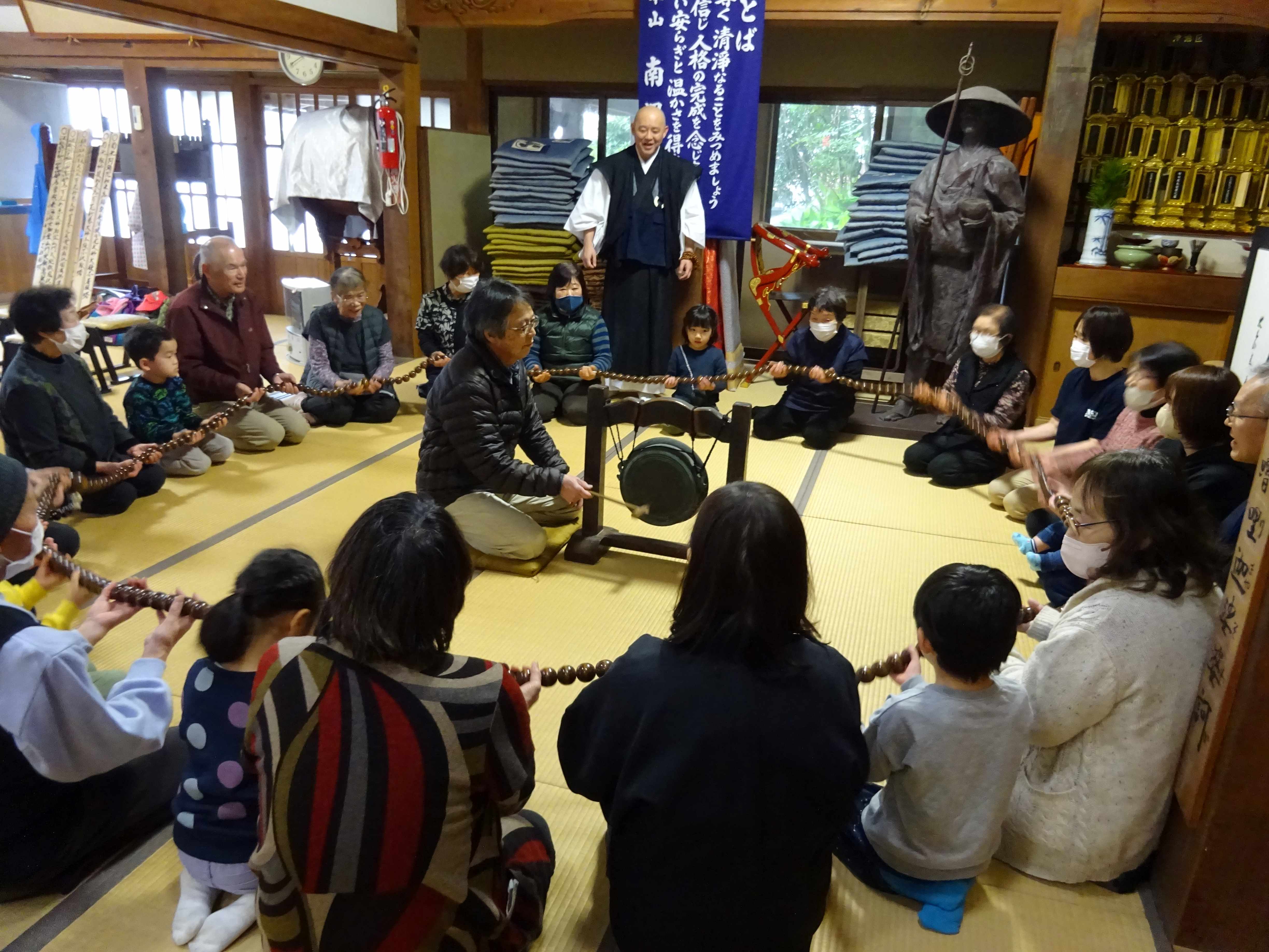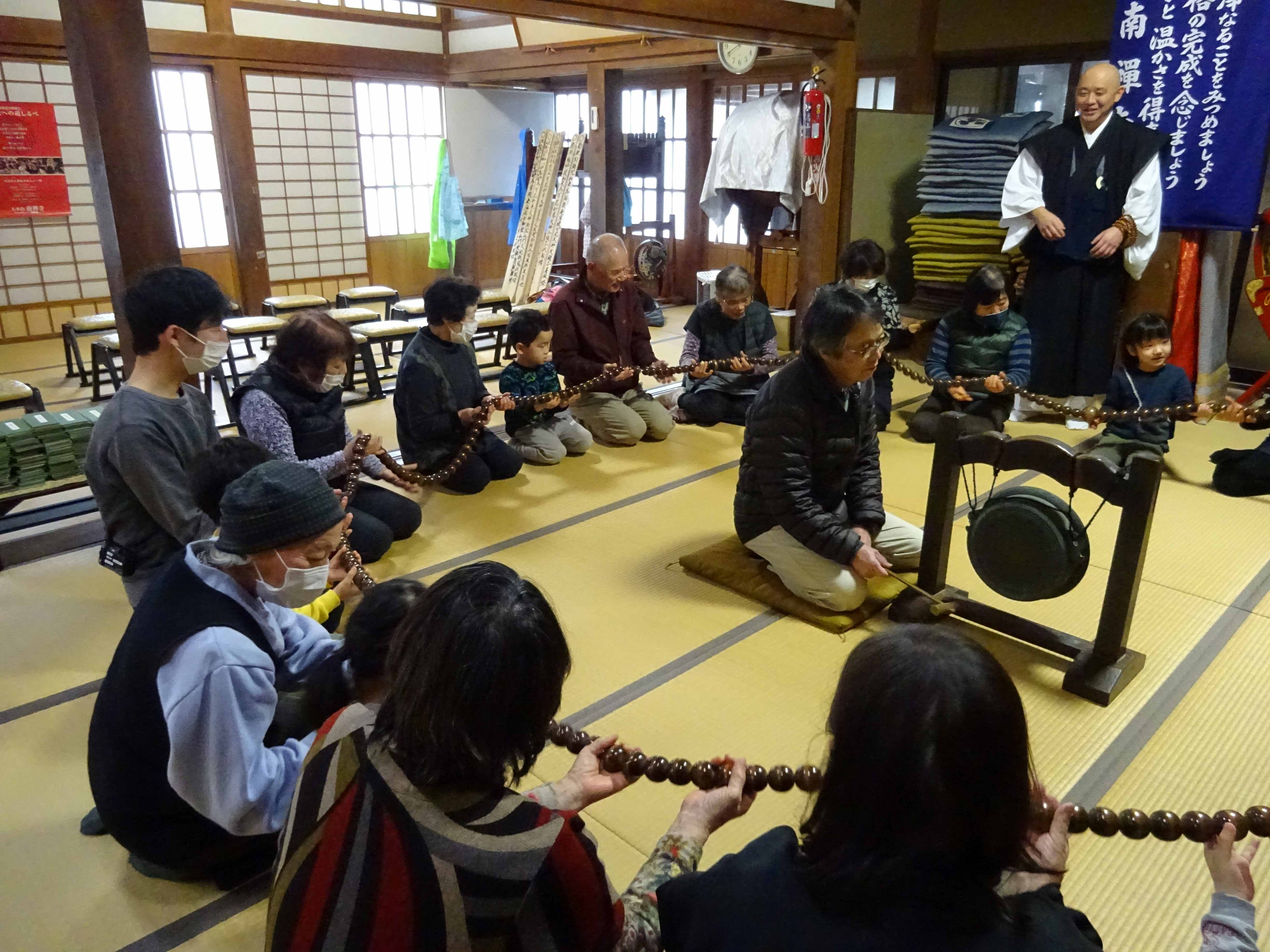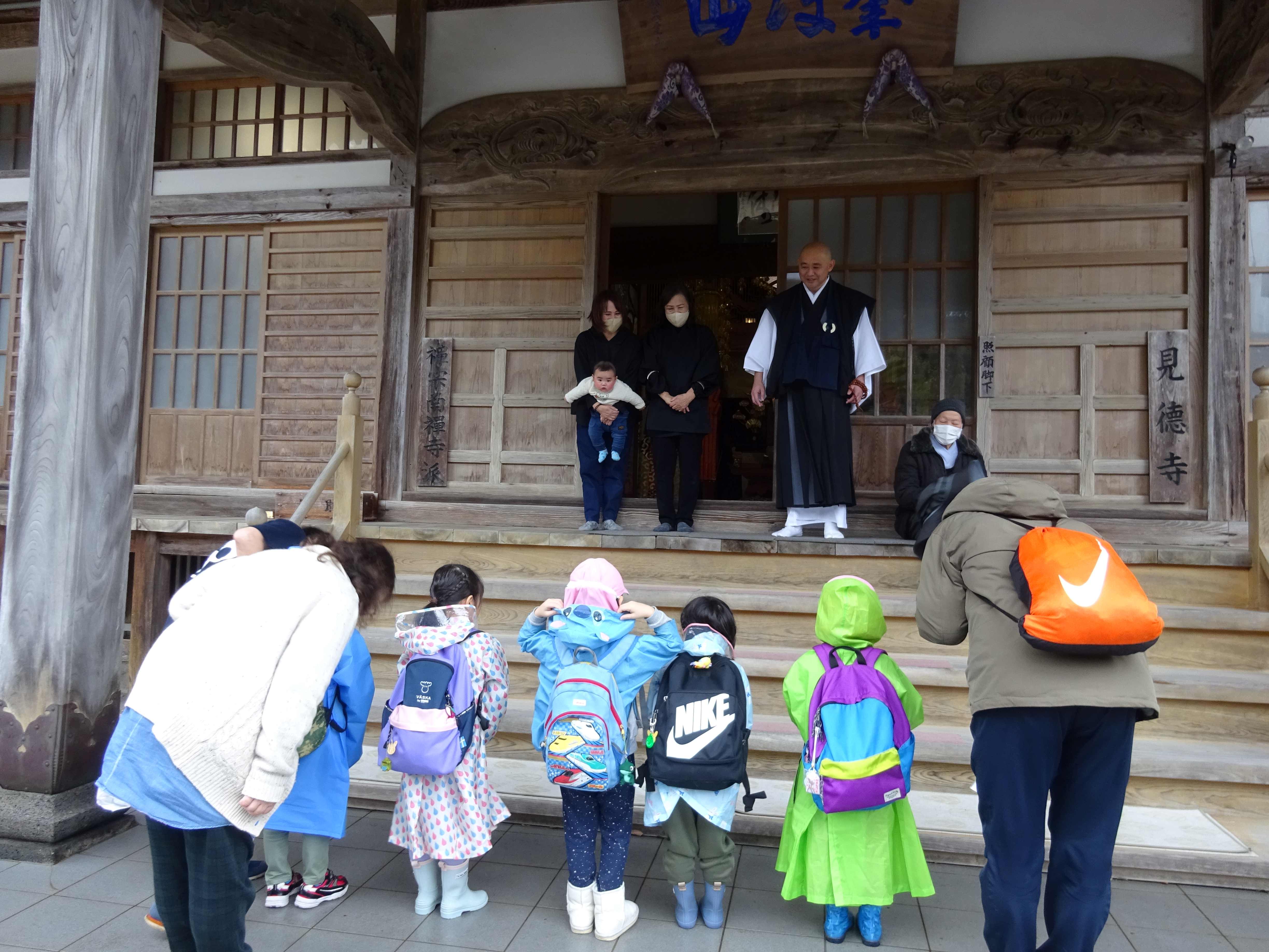 見徳寺で行われた数珠繰りに参加しました。始めにお経文を持って皆でお経を唱えると、「・・・いまどこ?」「このじ、なにってよむの?」と言いながら、必死になって目で追いかけている子ども達の姿が見られました。焼香を終えると、地域の方達と一緒に数珠繰りを行いました。数珠の大きさが大小あり、中くらいや大きな数珠が自分の前に来る時、一年の健康を願いながら額につけます。少し大きな玉が自分の前に来ると、おずおずと額をつける子、通り過ぎてしまう子もいましたが、地域の方に優しくやり方を教えてもらう事で慣れて、笑顔で行っていました。地域の方達との温かな触れ合いの時間となりました。