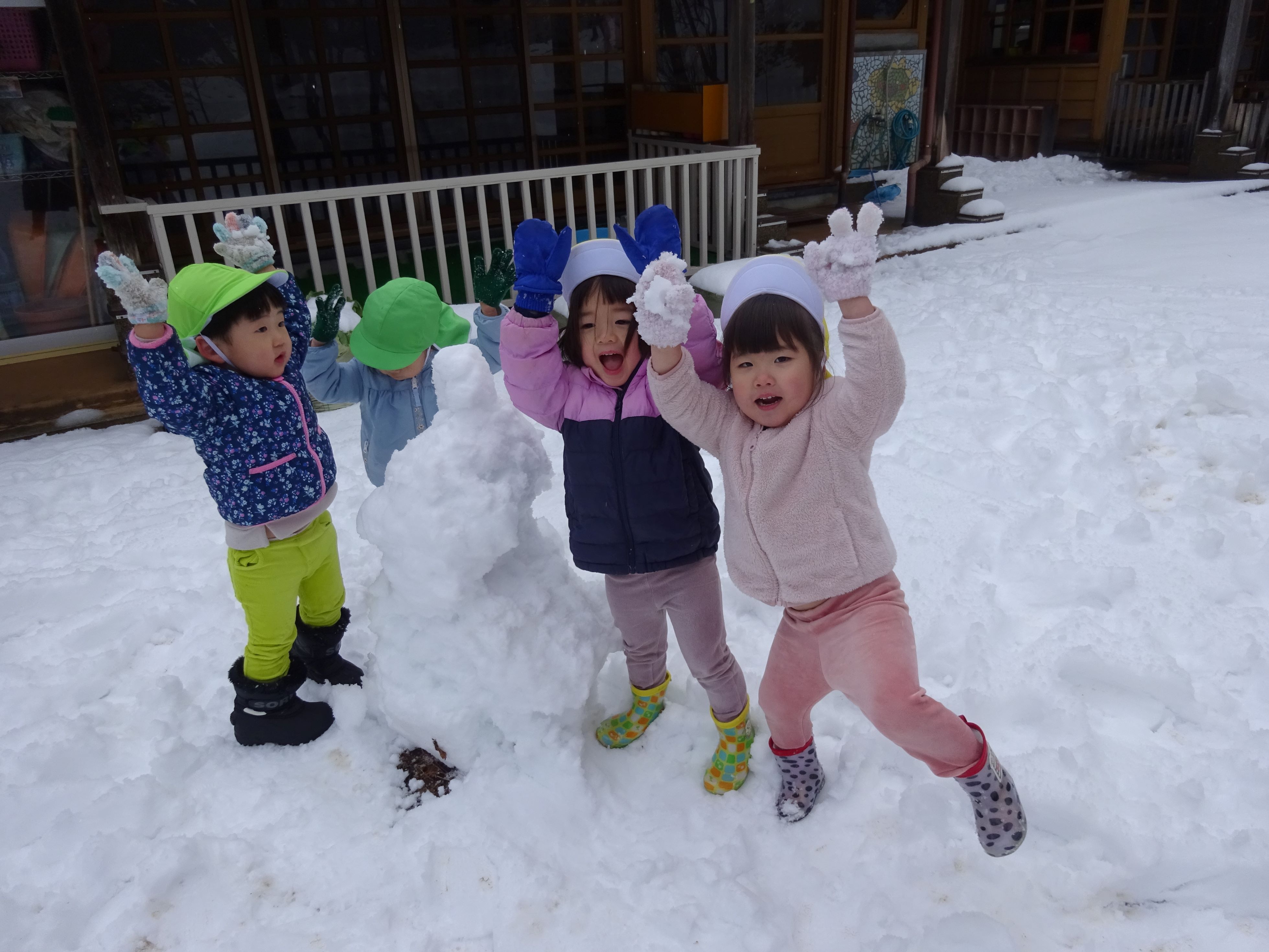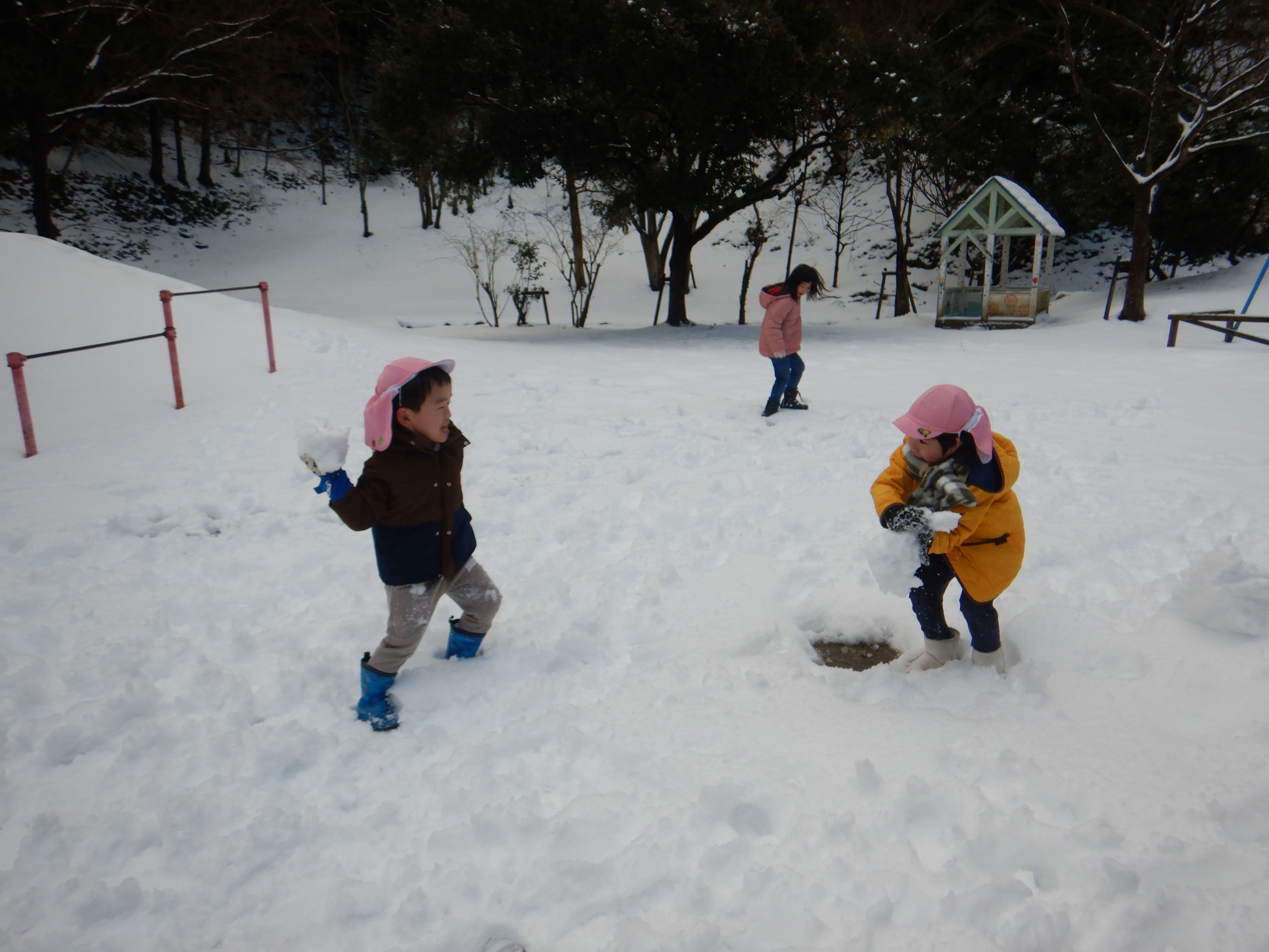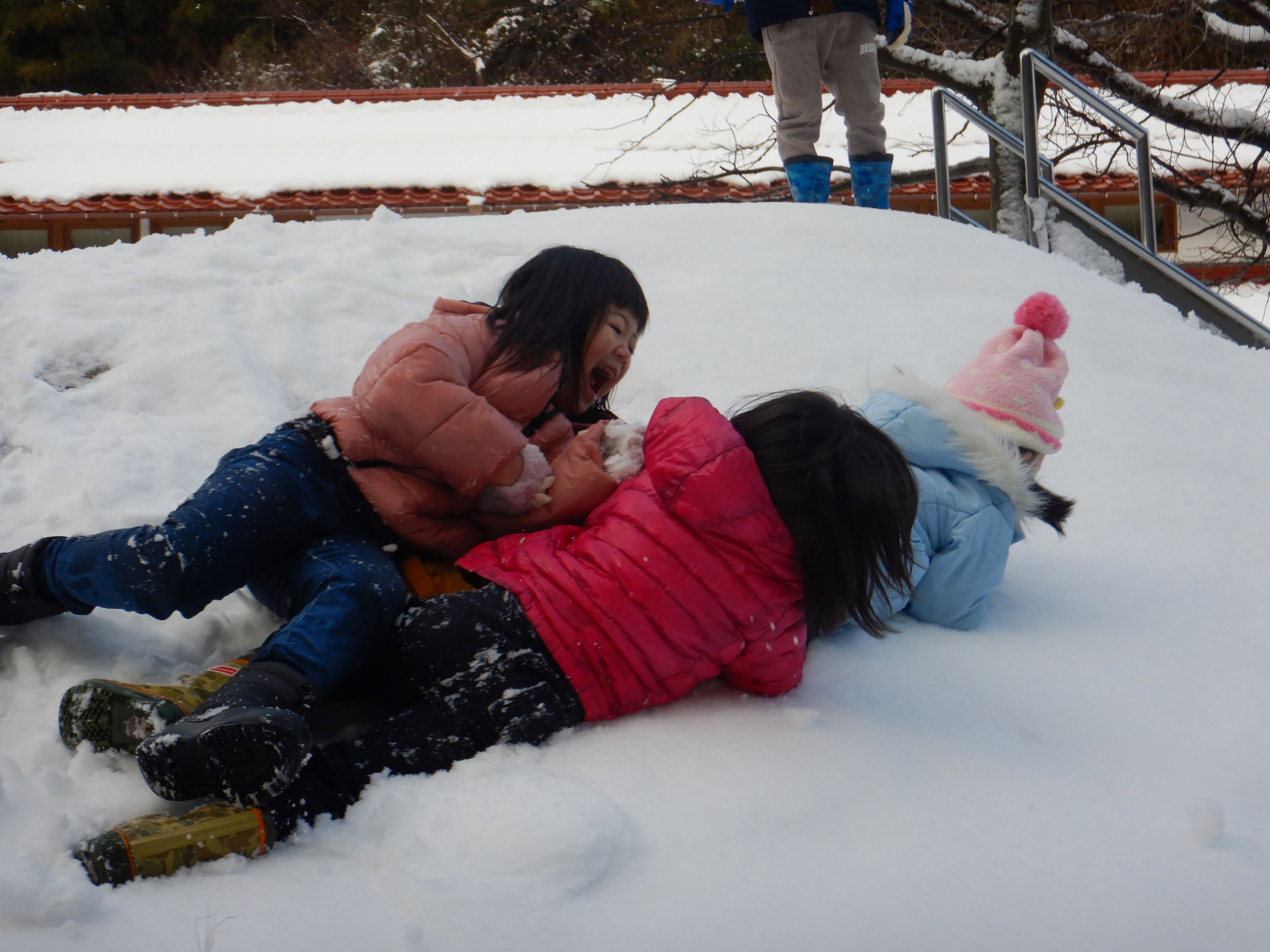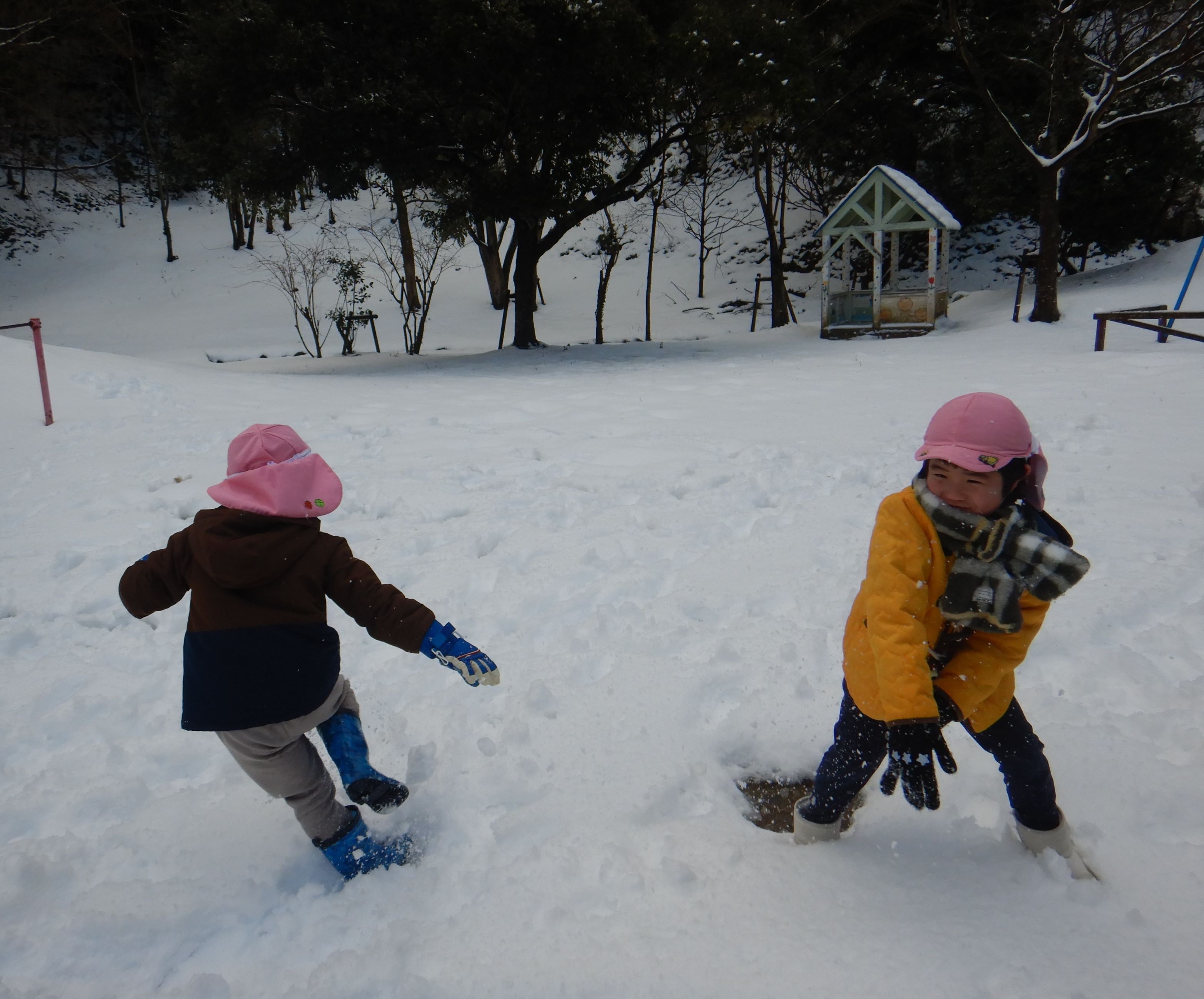 昨日からの雪で、所庭一面が真っ白!サッと朝の準備を済ませ、真っ先に外へ出掛けて行ったにじそらぐみ。まっさらな雪の上に足跡をつけながら「なんかギュッギュッっておとがするね」「ゆきなげしようー」「ゆきだるまもいいねー」と目を輝かせながら、大きな笑い声とともに、目一杯雪の感触やおもしろさを味わっていました。