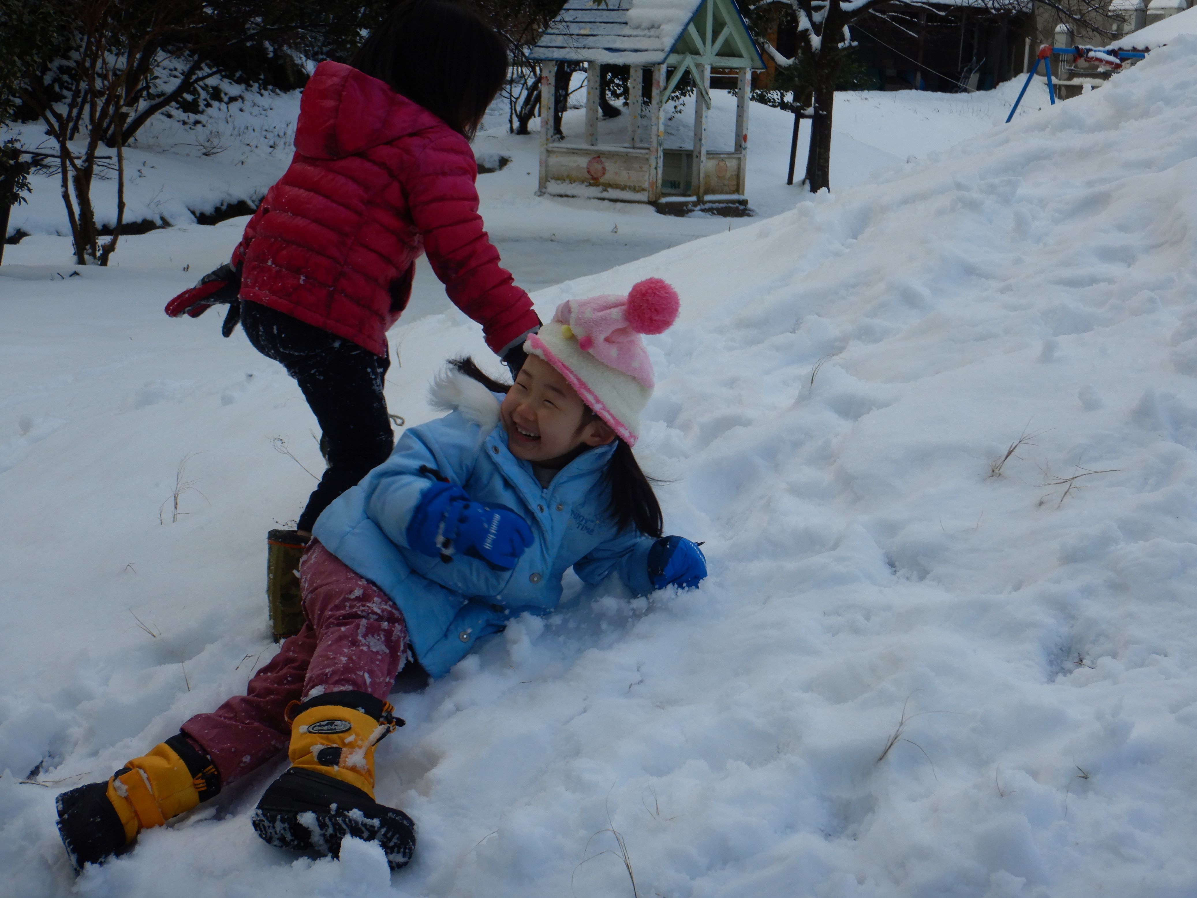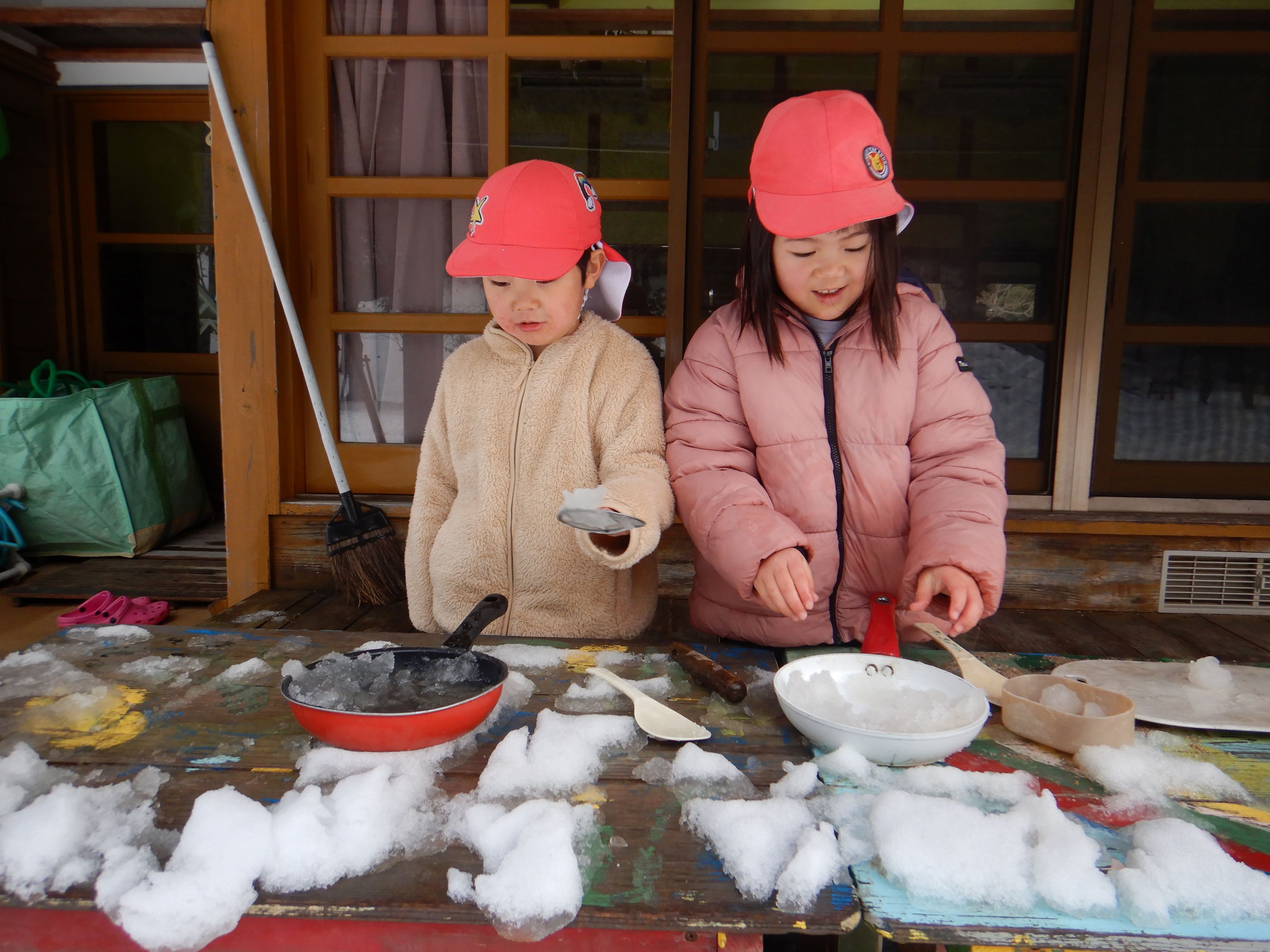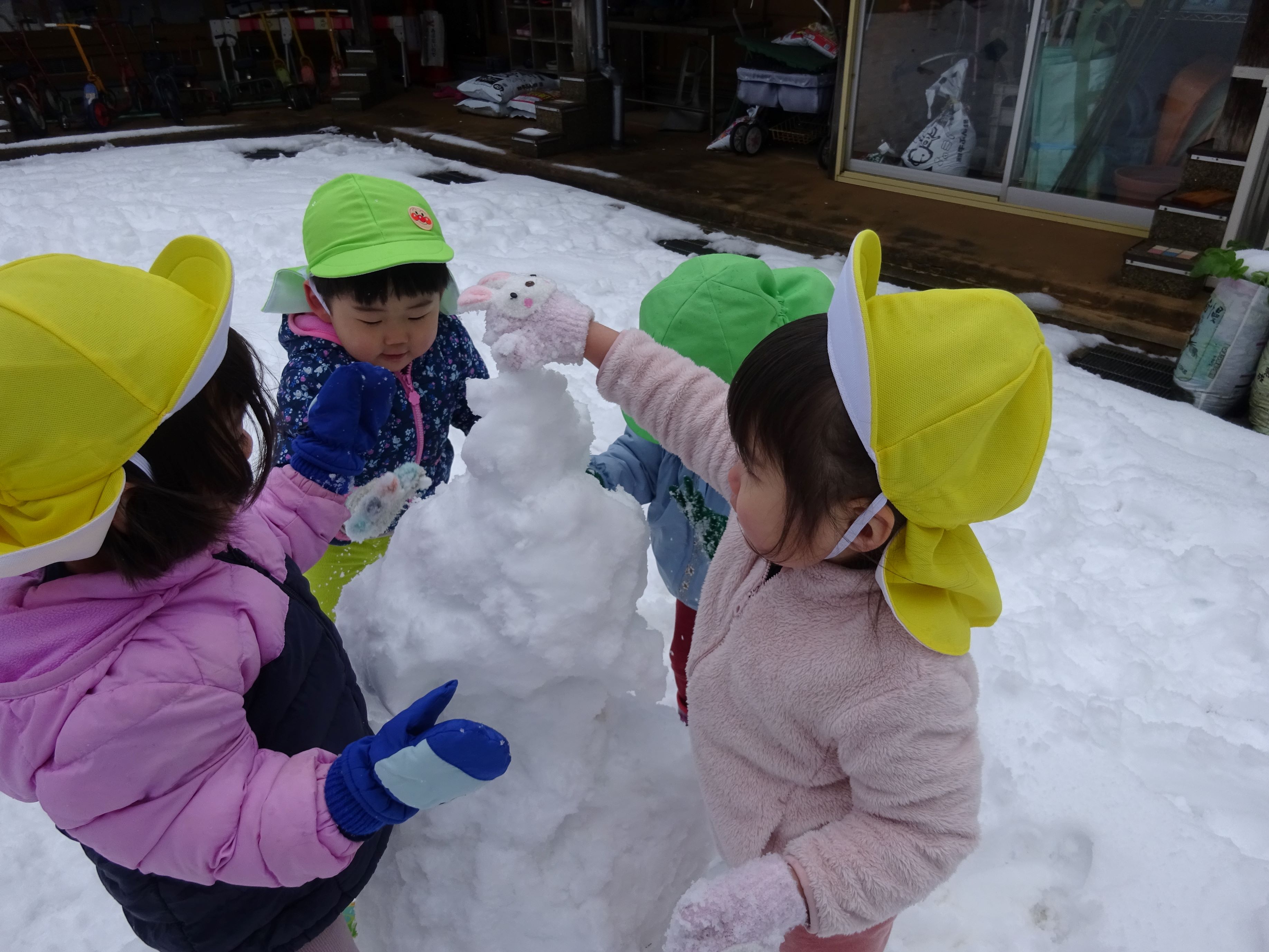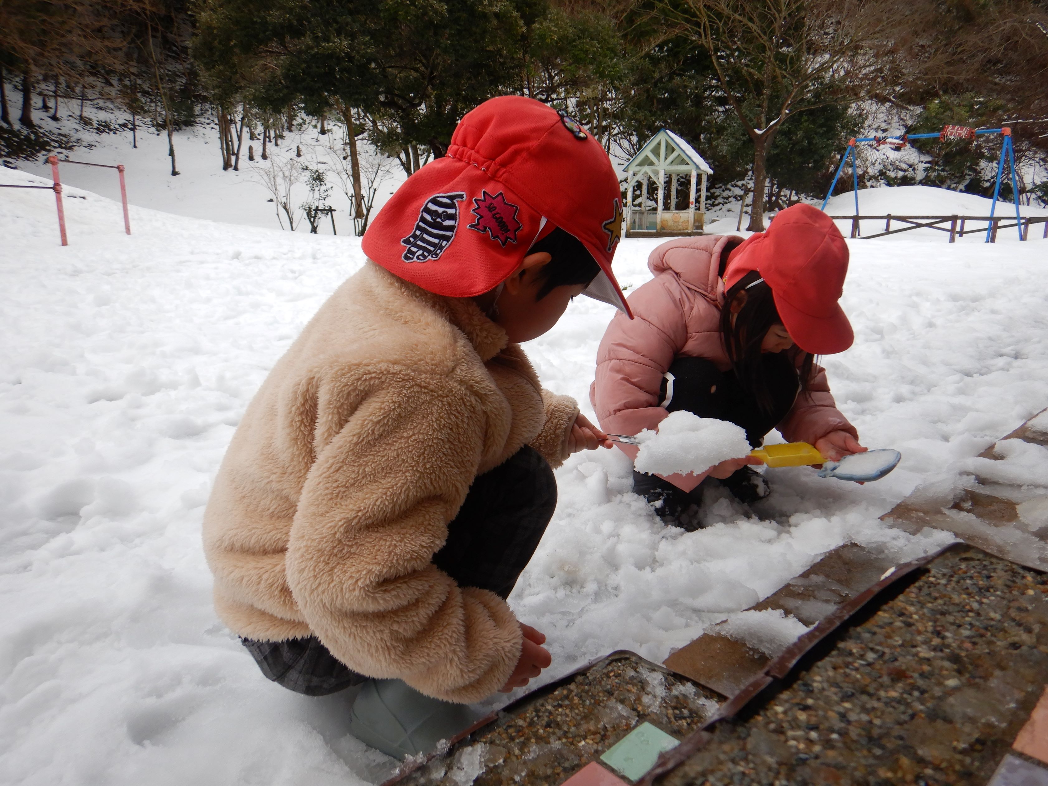 昨日からの雪で、所庭一面が真っ白!サッと朝の準備を済ませ、真っ先に外へ出掛けて行ったにじそらぐみ。まっさらな雪の上に足跡をつけながら「なんかギュッギュッっておとがするね」「ゆきなげしようー」「ゆきだるまもいいねー」と目を輝かせながら、大きな笑い声とともに、目一杯雪の感触やおもしろさを味わっていました。