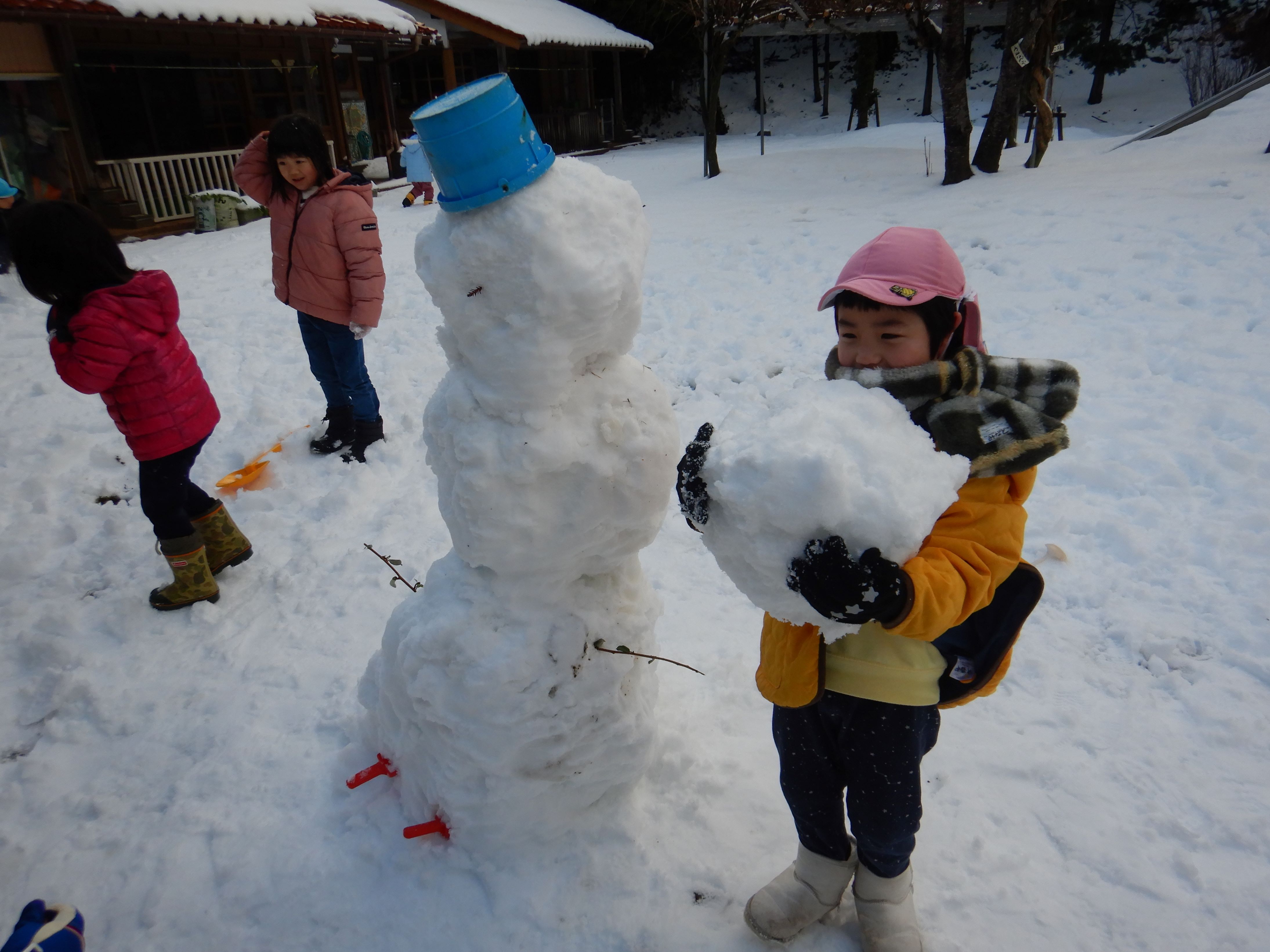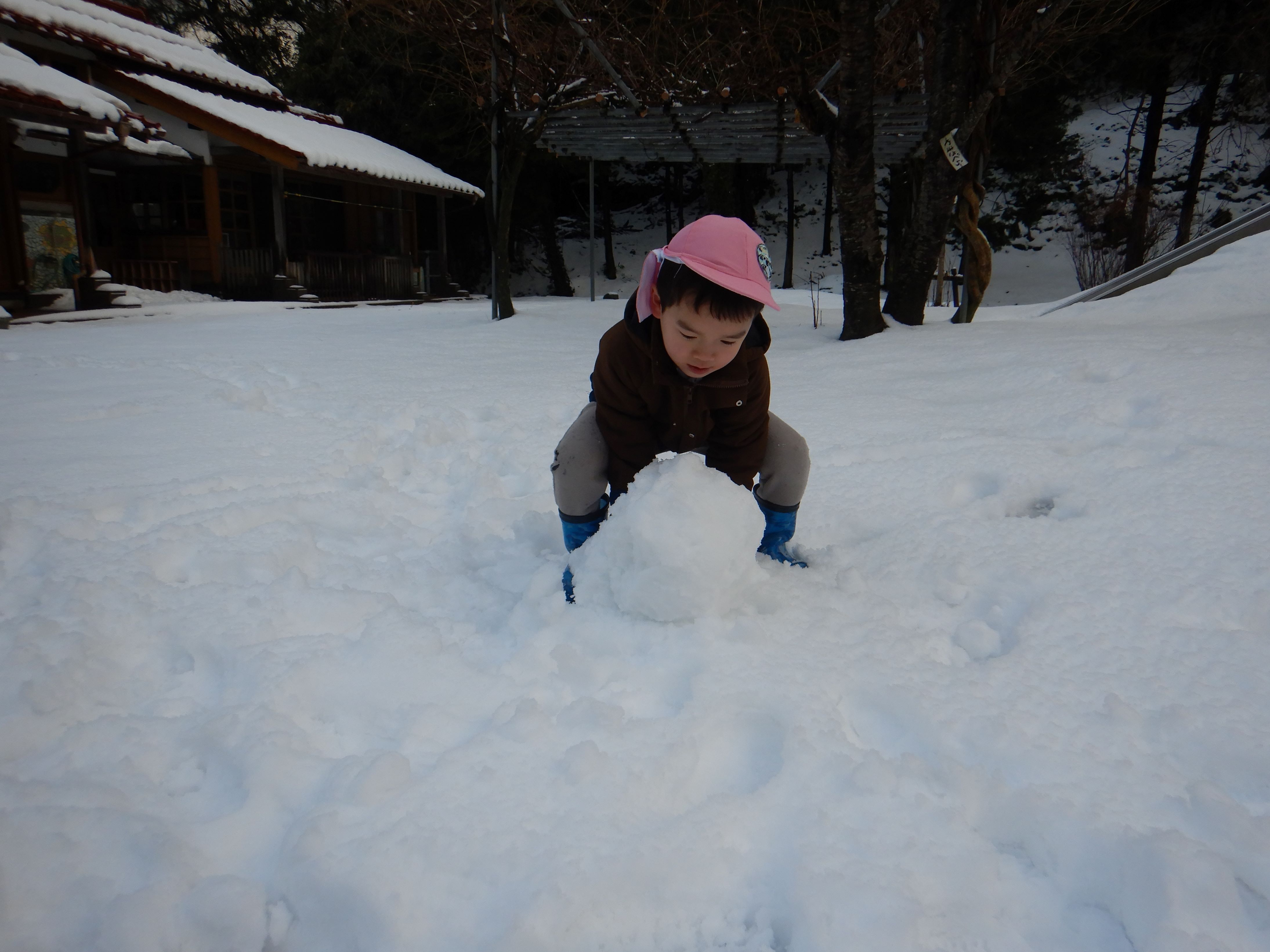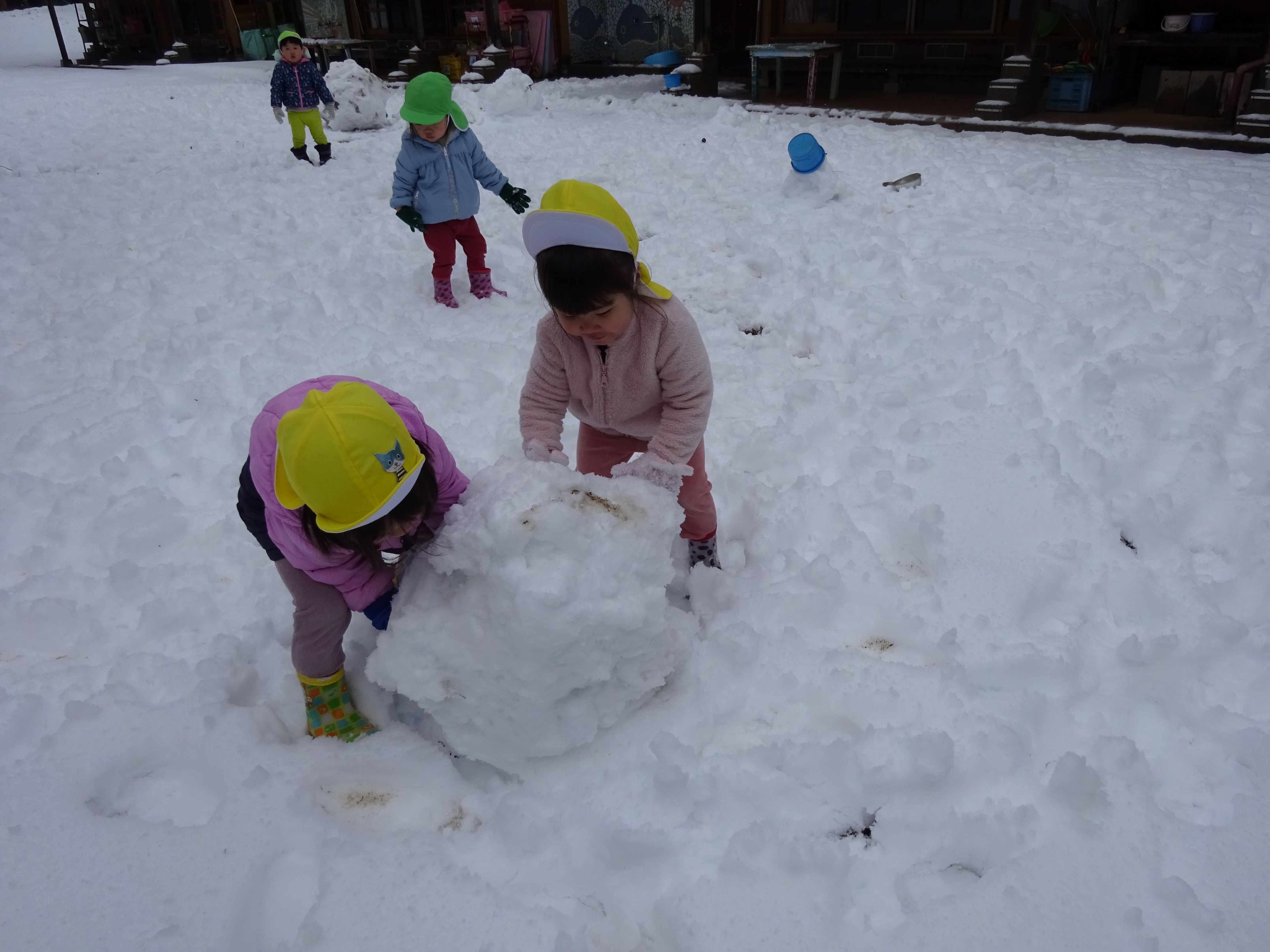 「こんなにおおきなゆきだまができたよ」「おも~い」
