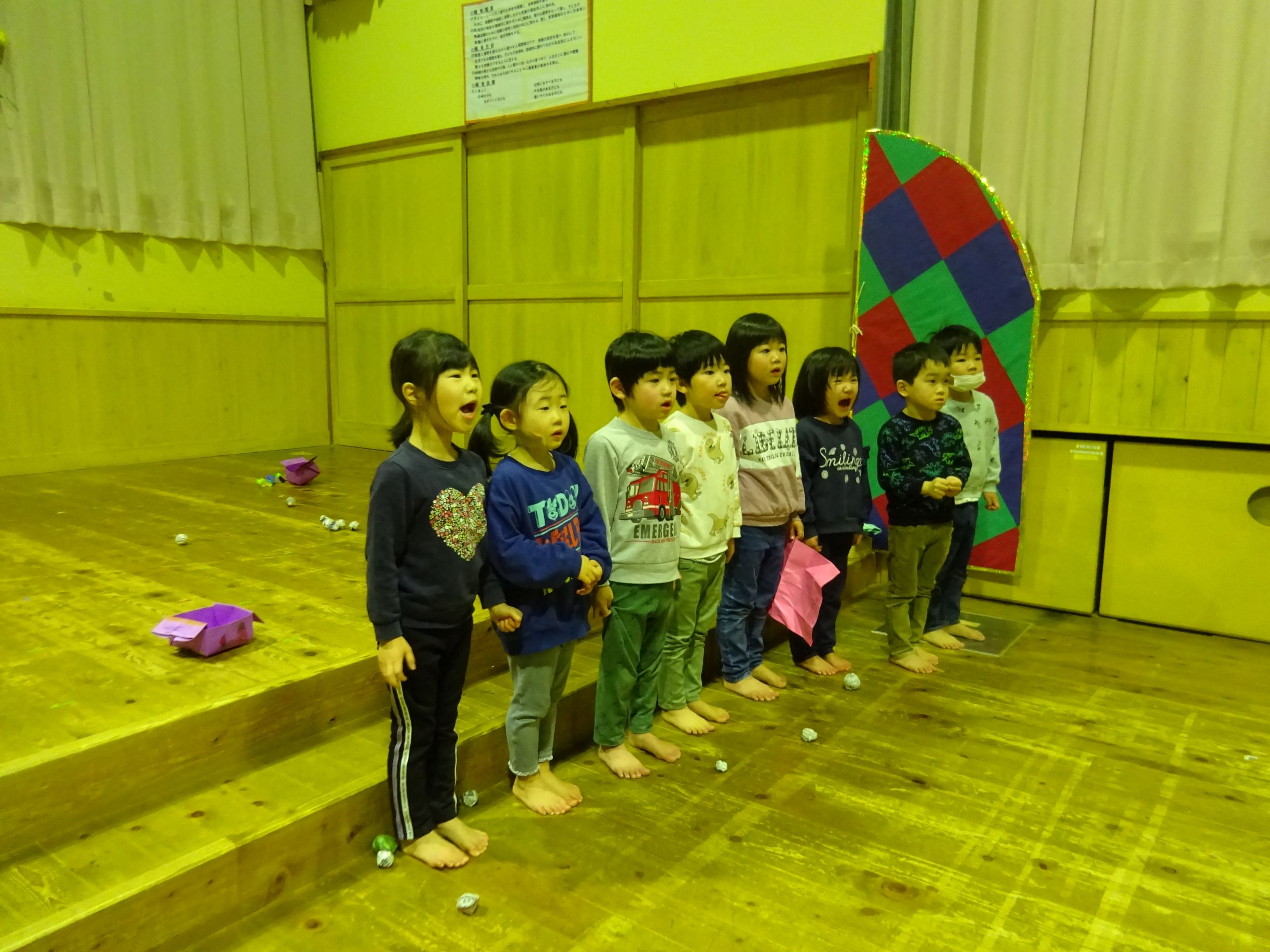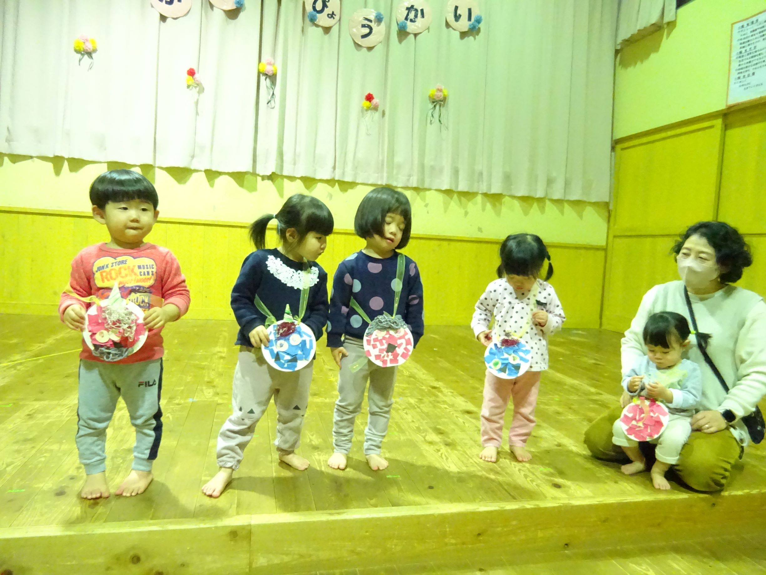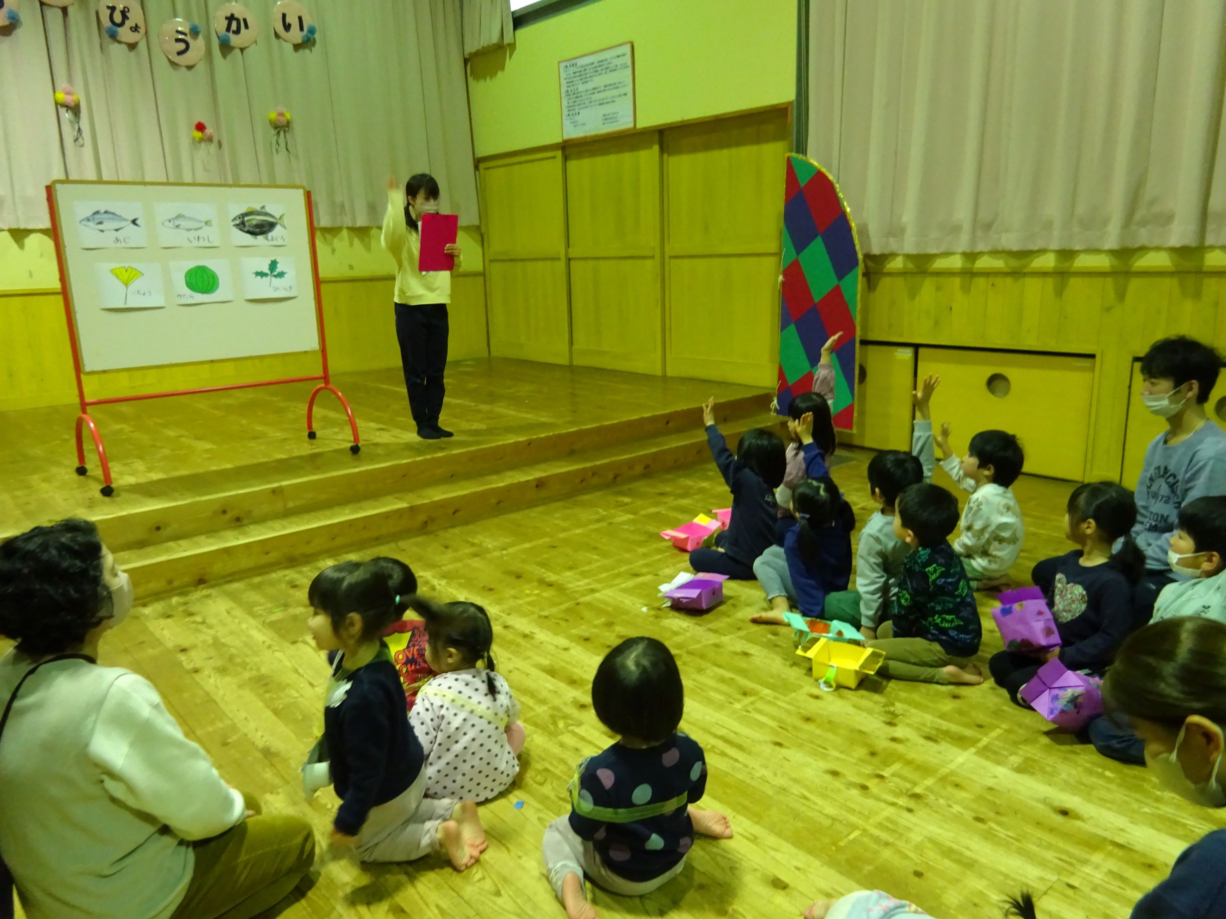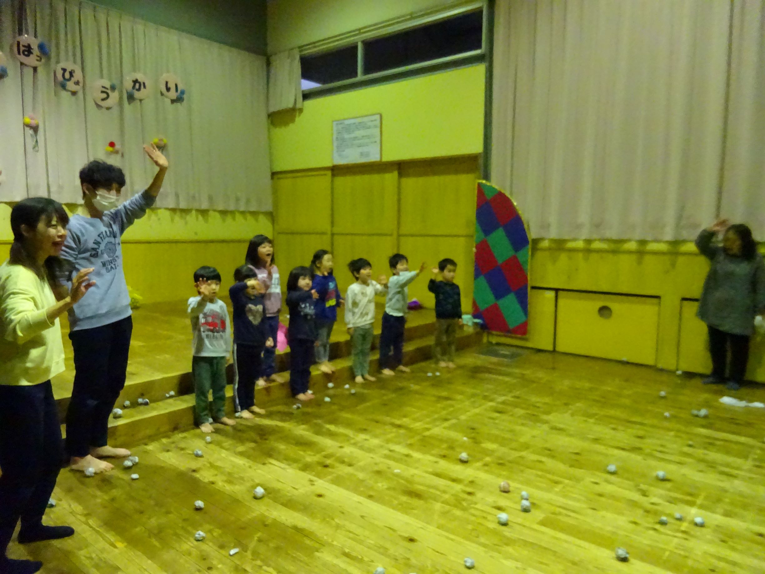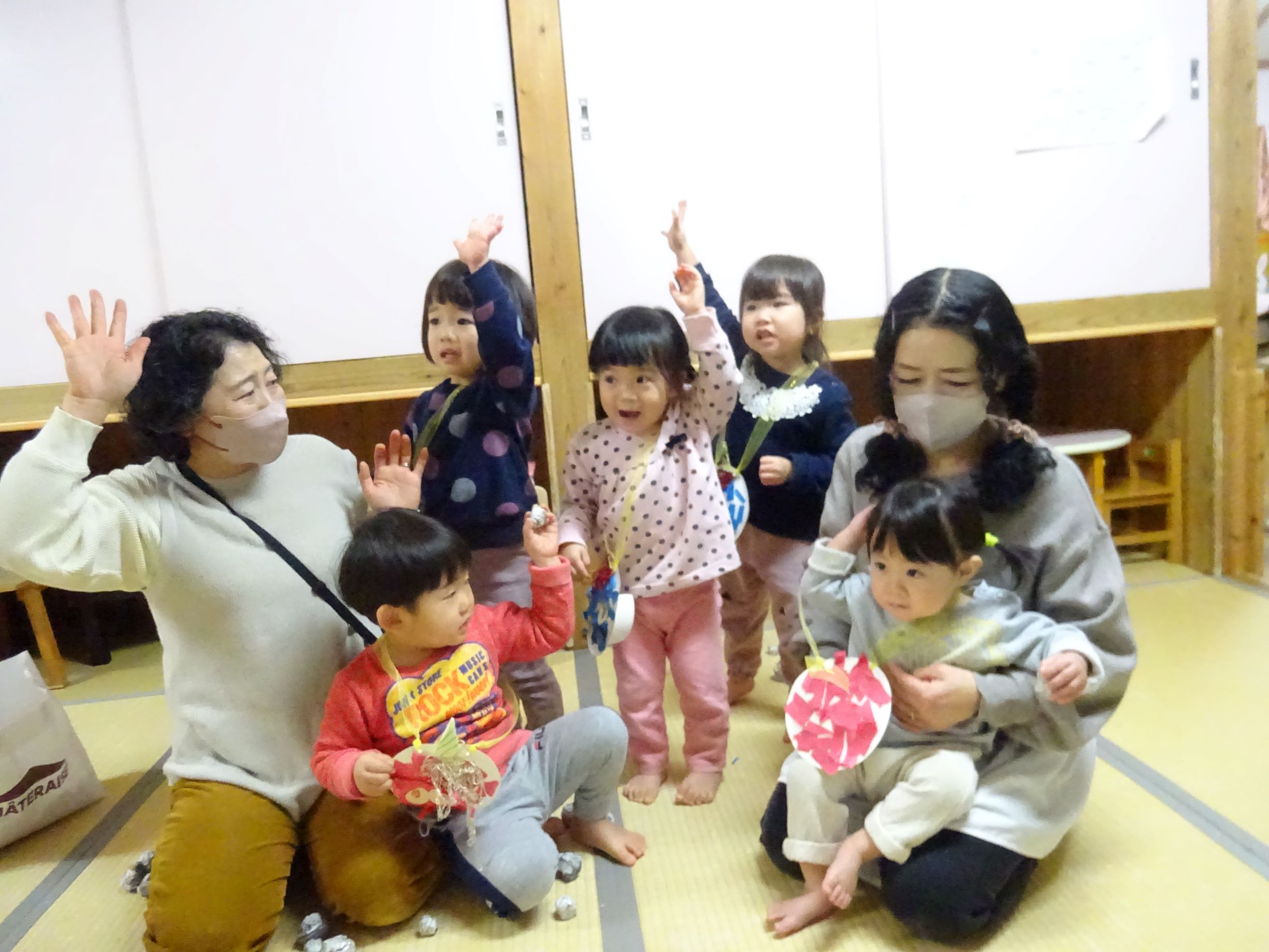 1月半ばから豆まき会に向けて各クラスが豆入れを製作したり、「まめまき」の歌を歌い始めるとこの時期がきたなと思います。豆まき会当日に「今日は豆まきの日」と聞いただけで涙が出そうな子どももいました。会では“節分とは何?”という話を聞いたり、各クラス豆入れを紹介してから自分の中の鬼を1人ずつ発表していきました。年長児は福の神が登場すると一緒に保育所内を回って豆まきをしてくれました。その後、赤鬼がやってきてゆめほし組は保育室、にじそら組は遊戯室で鬼に向かって豆を投げました。鬼が怖くて泣き出し職員の後ろに隠れたりする姿も見られましたが、最後は鬼と「発表会を頑張る!」と約束し、握手を交わしました。