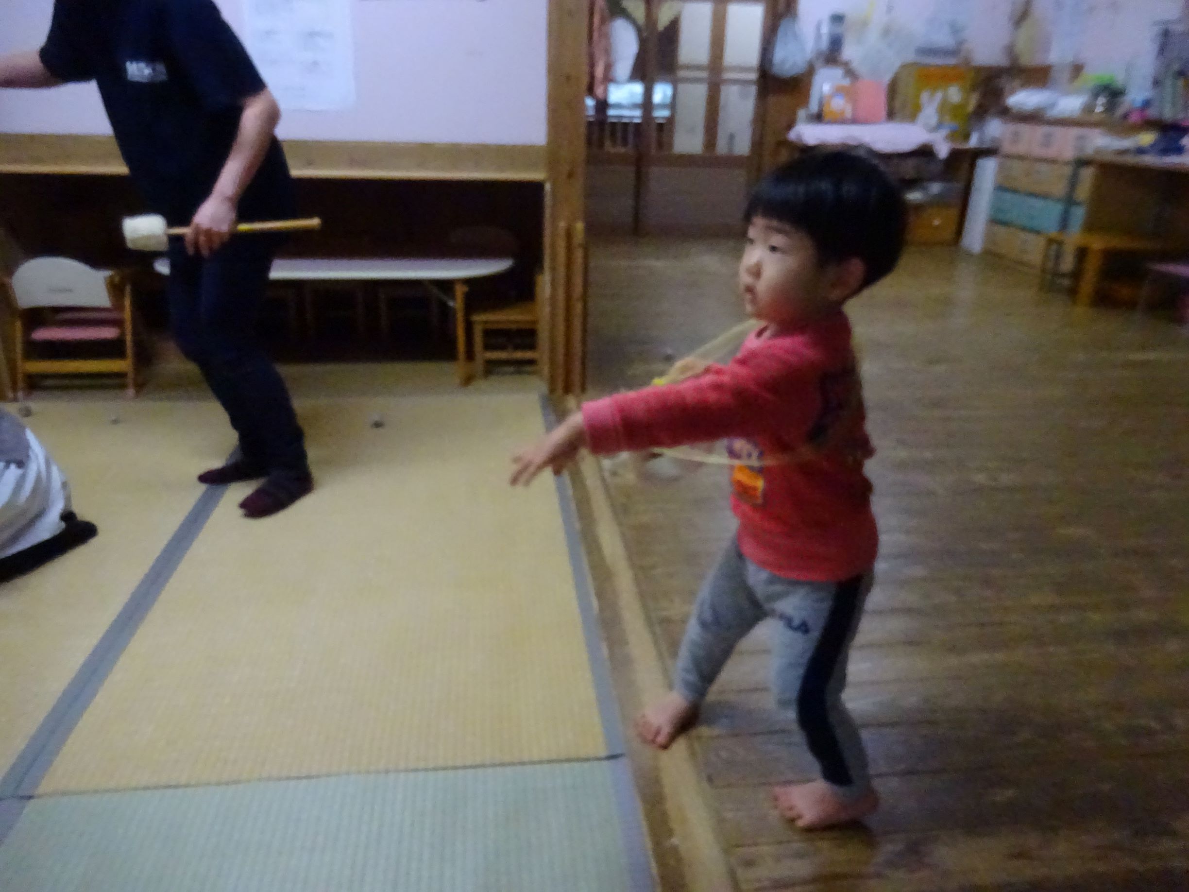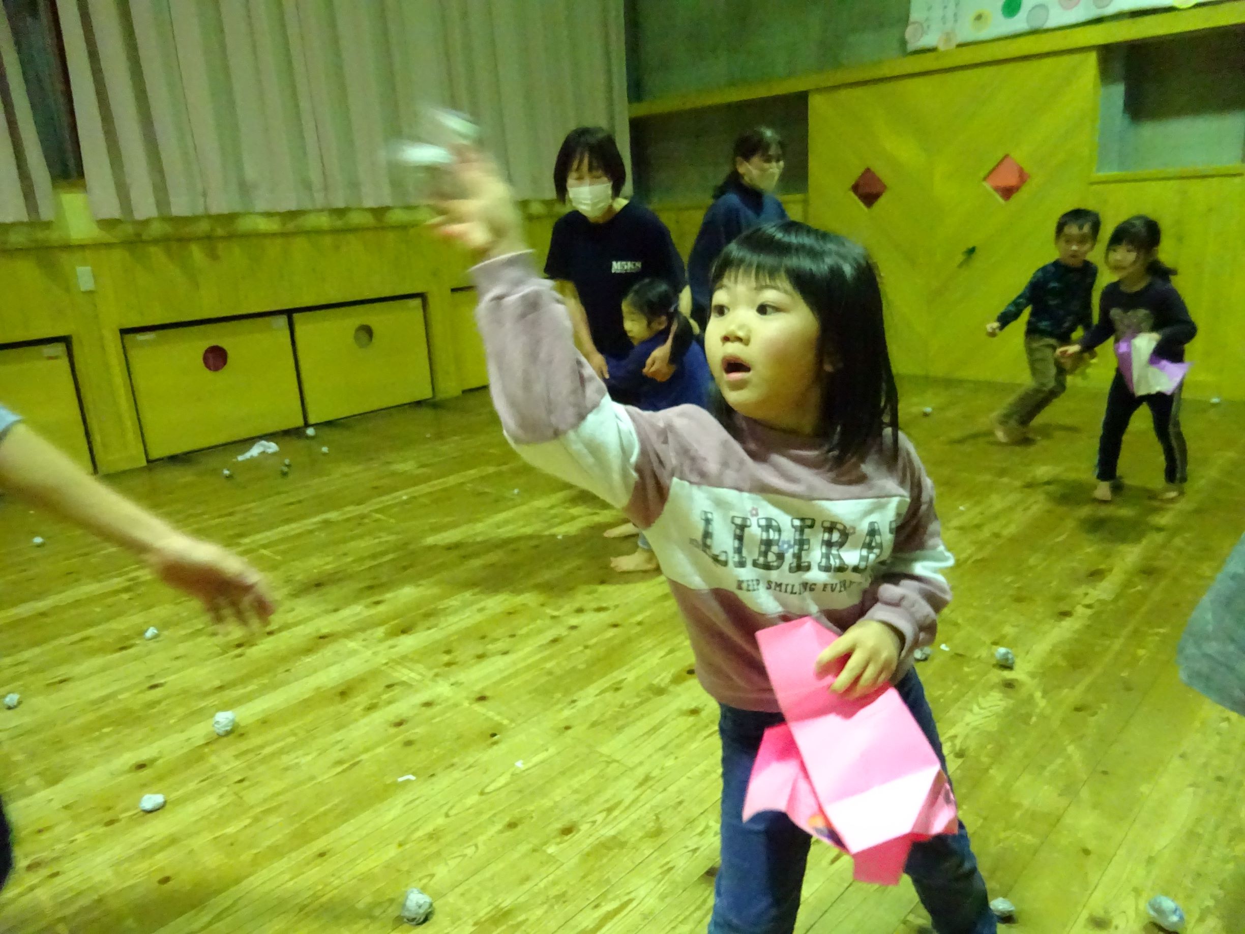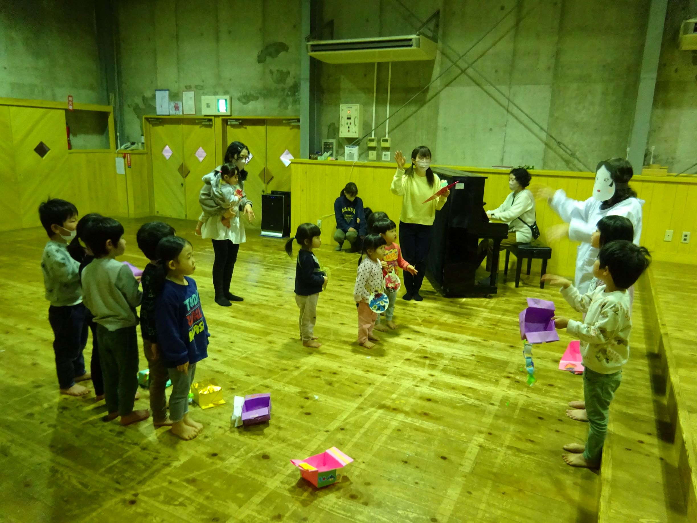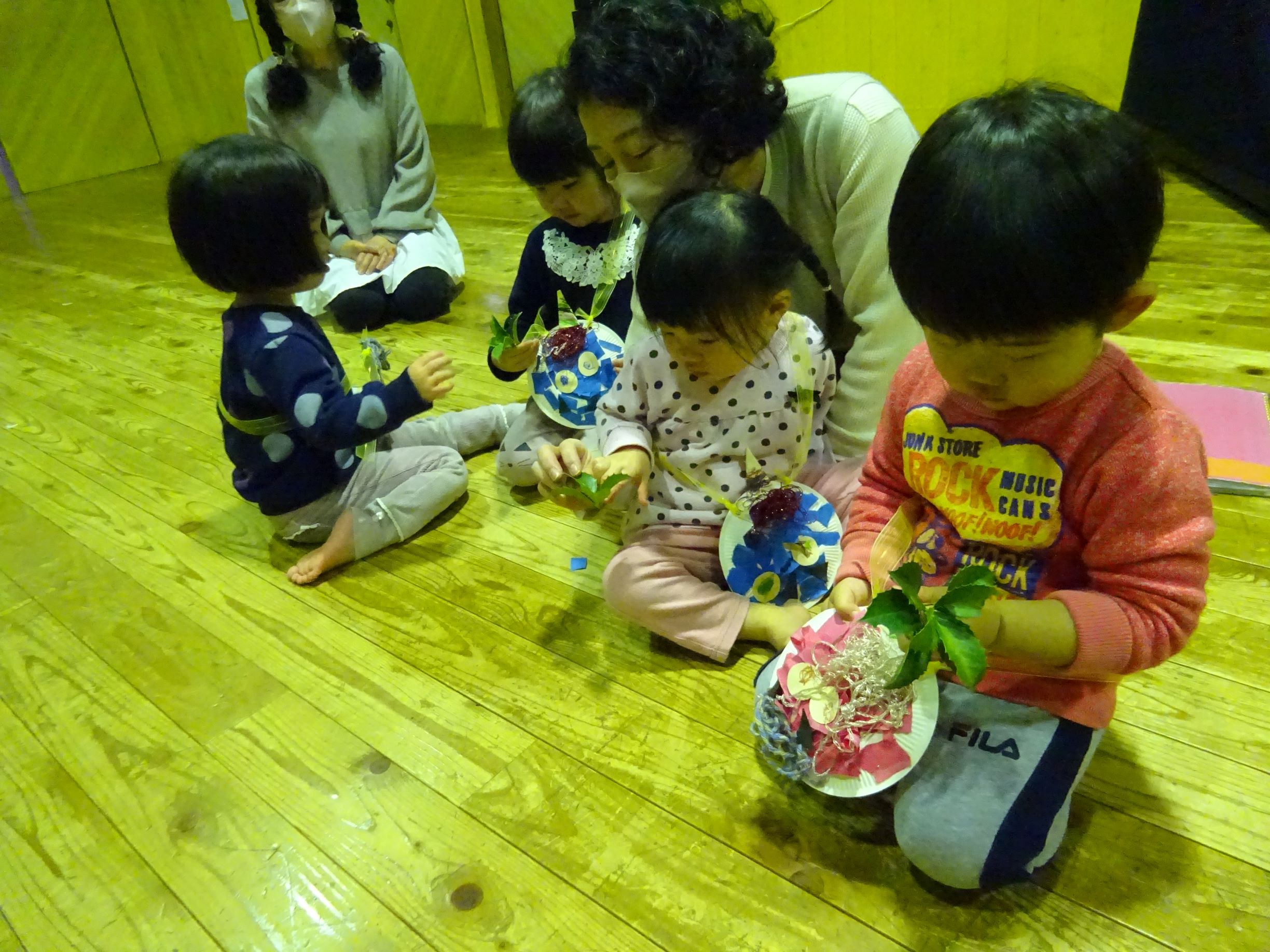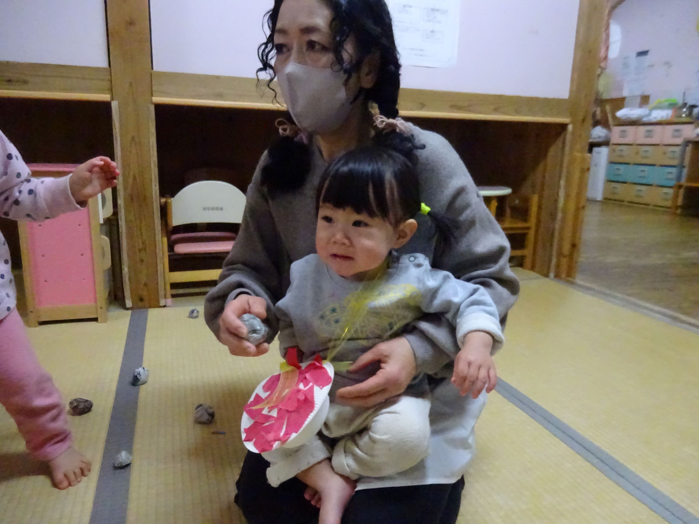 1月半ばから豆まき会に向けて各クラスが豆入れを製作したり、「まめまき」の歌を歌い始めるとこの時期がきたなと思います。豆まき会当日に「今日は豆まきの日」と聞いただけで涙が出そうな子どももいました。会では“節分とは何?”という話を聞いたり、各クラス豆入れを紹介してから自分の中の鬼を1人ずつ発表していきました。年長児は福の神が登場すると一緒に保育所内を回って豆まきをしてくれました。その後、赤鬼がやってきてゆめほし組は保育室、にじそら組は遊戯室で鬼に向かって豆を投げました。鬼が怖くて泣き出し職員の後ろに隠れたりする姿も見られましたが、最後は鬼と「発表会を頑張る!」と約束し、握手を交わしました。