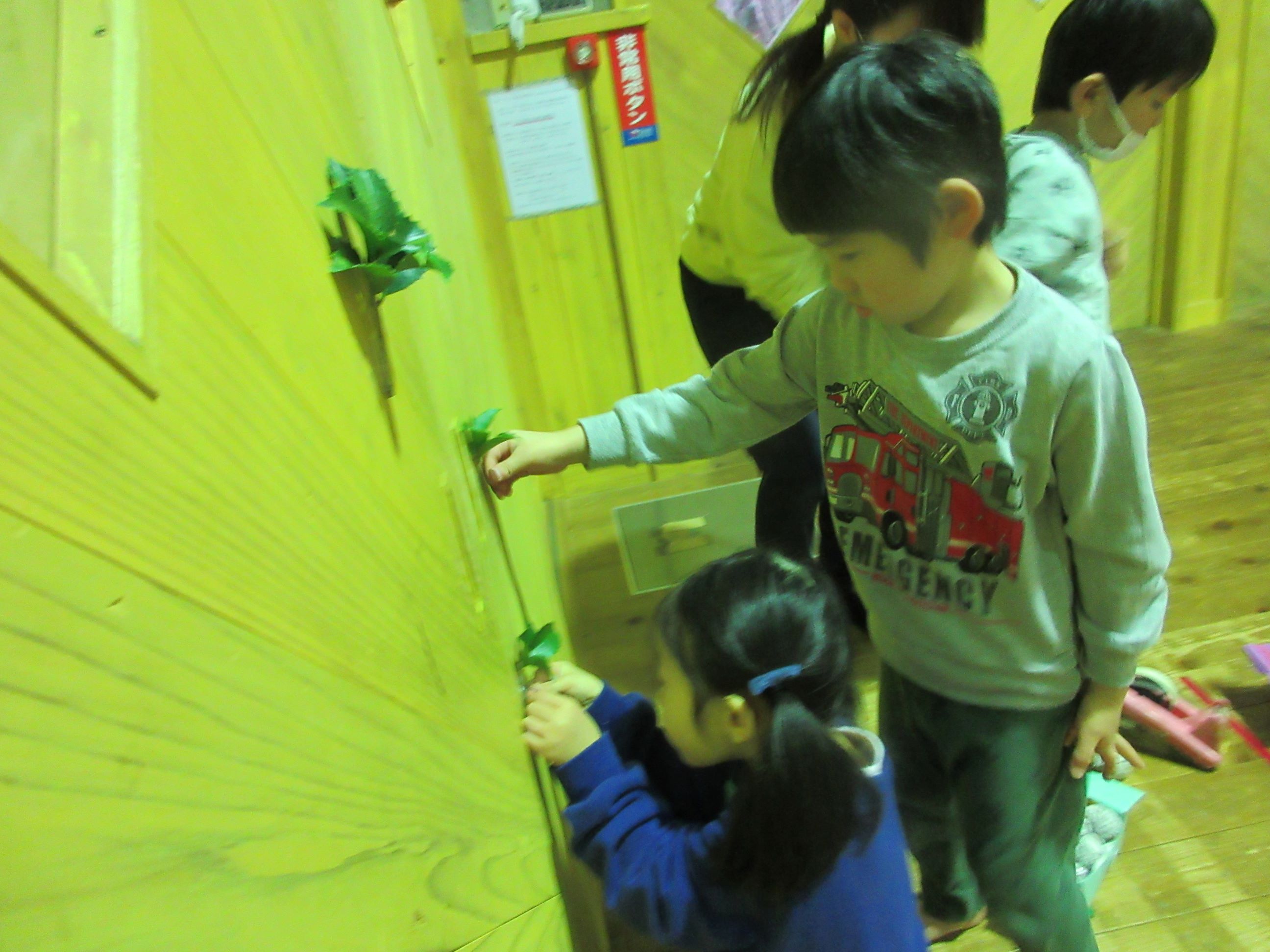 にじそら組は遊戯室の戸口に鬼が入ってこないようにヒイラギをしっかりとつけました