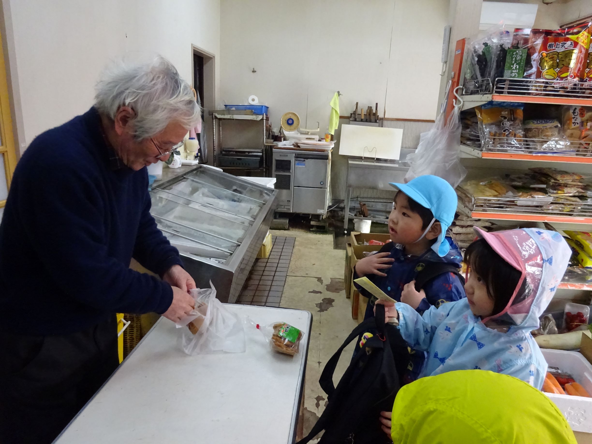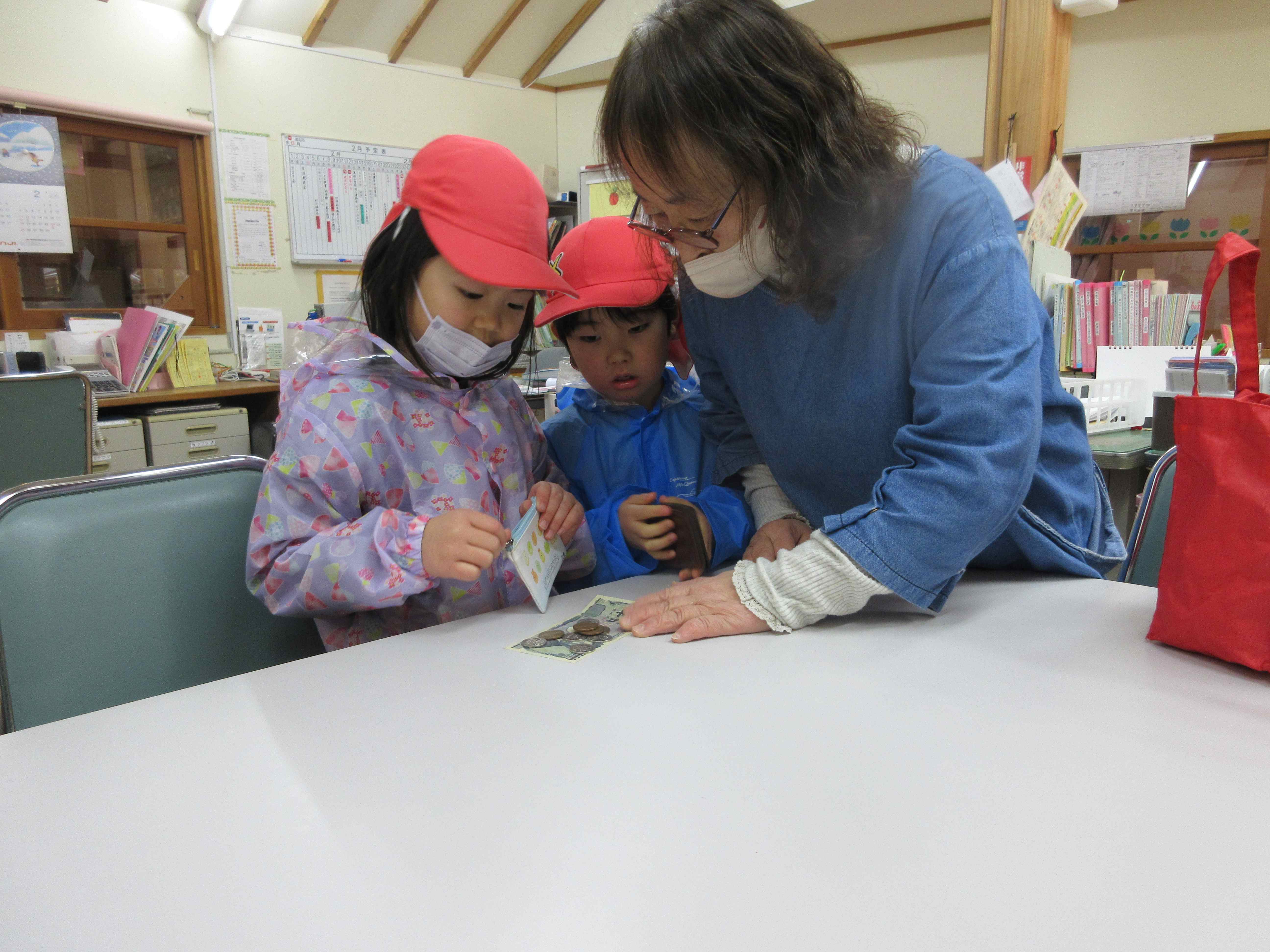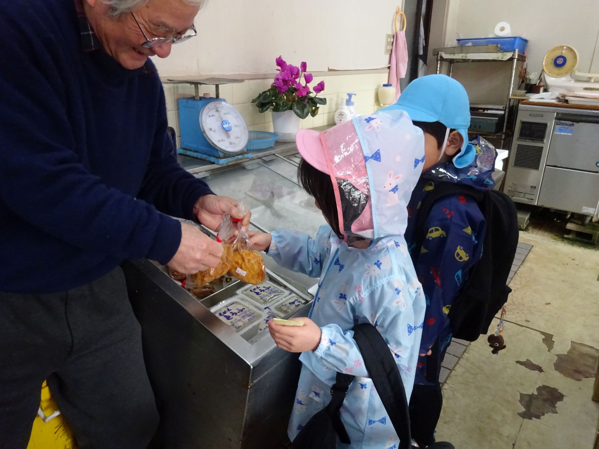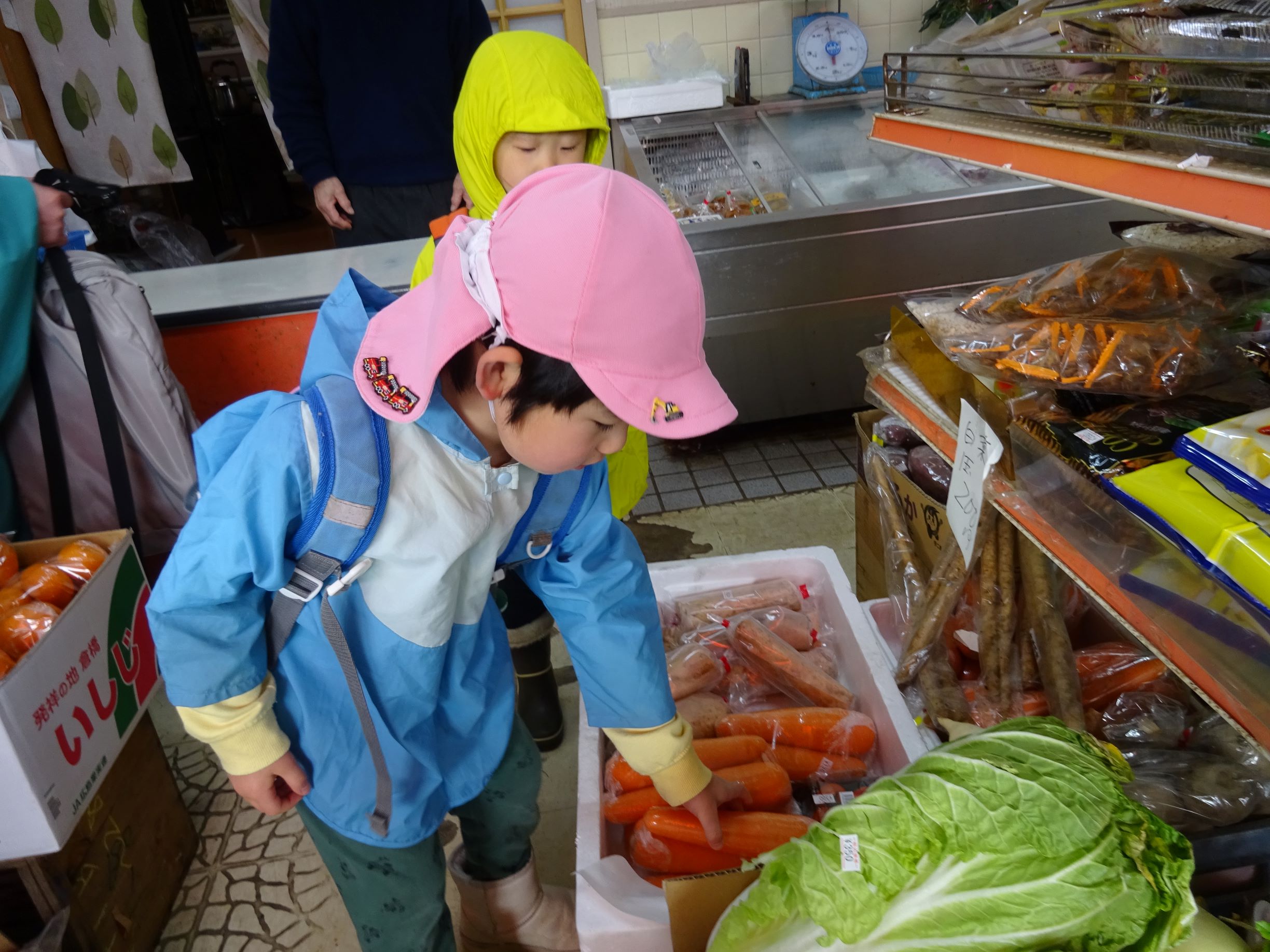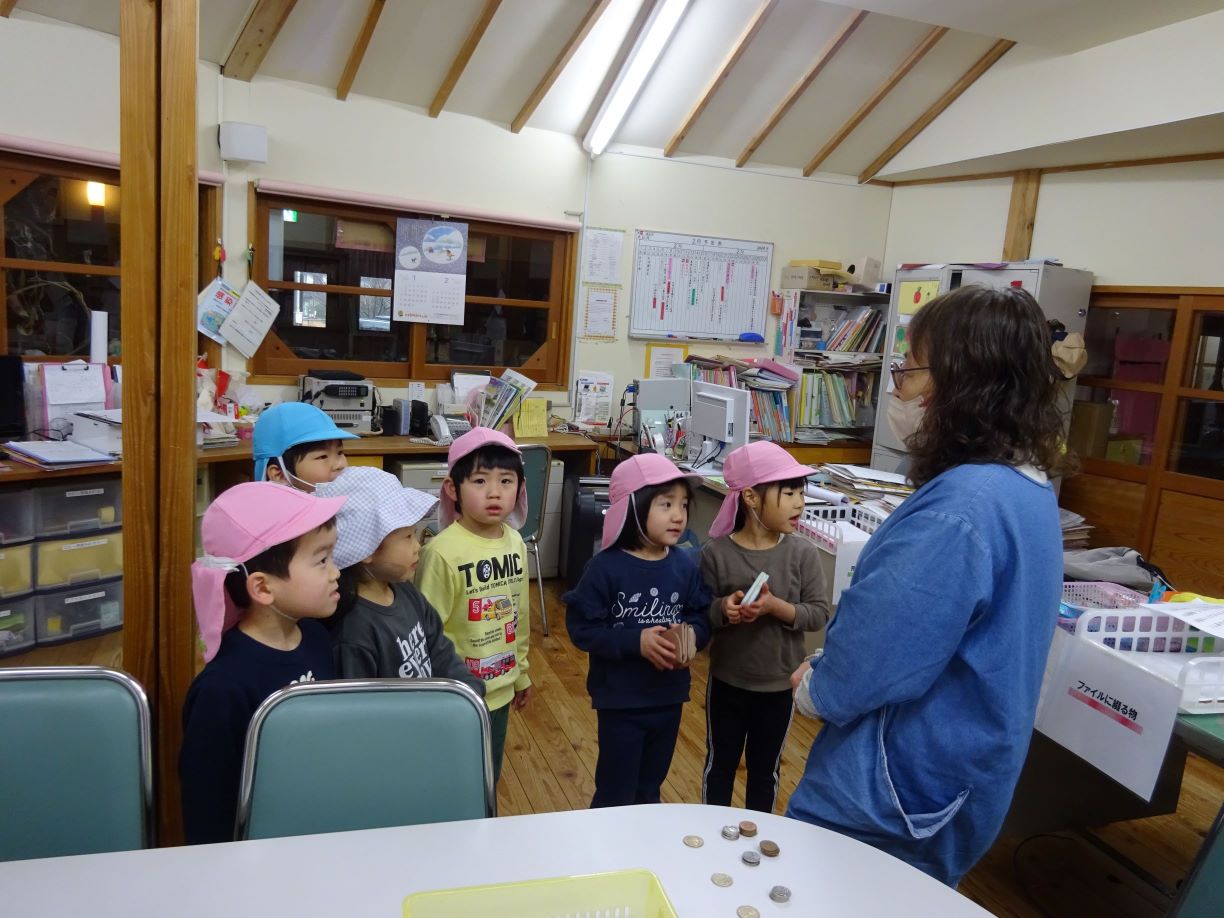 明日はおでんの日。楽しみにしていた子ども達でしたが、給食室の先生から「おでんの具材がなくて・・・買って来てくれない?」とお願いをされました。おでんの具材って何だろう?何を買って来ればよいかな?などを皆で話し合い、買う物を決めました。3,4歳児は津森商店に行きました。津森商店のご夫婦が温かく迎えて下さり、子ども達も安心して買い物が出来ました。5歳児はバスを乗り継いで、まるごうに行きました。自分の買う物を「あっ、あった!」と言って見つけ、嬉しそうにかごに入れていました。買って帰った物は先生方に見てもらい、「ちゃんと買えたね、ありがとう」「皆すごいね」と言ってもらい、とても嬉しそうでした。明日のおでんが楽しみです。