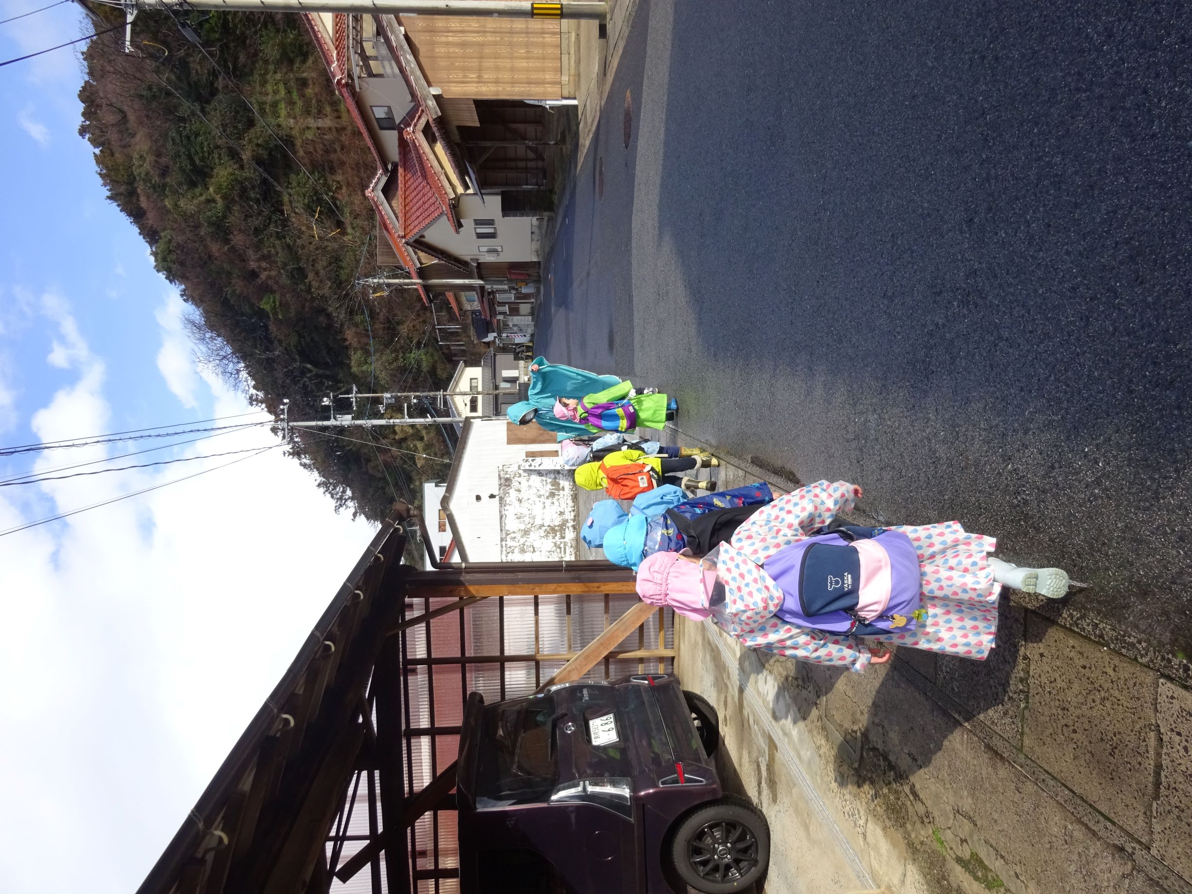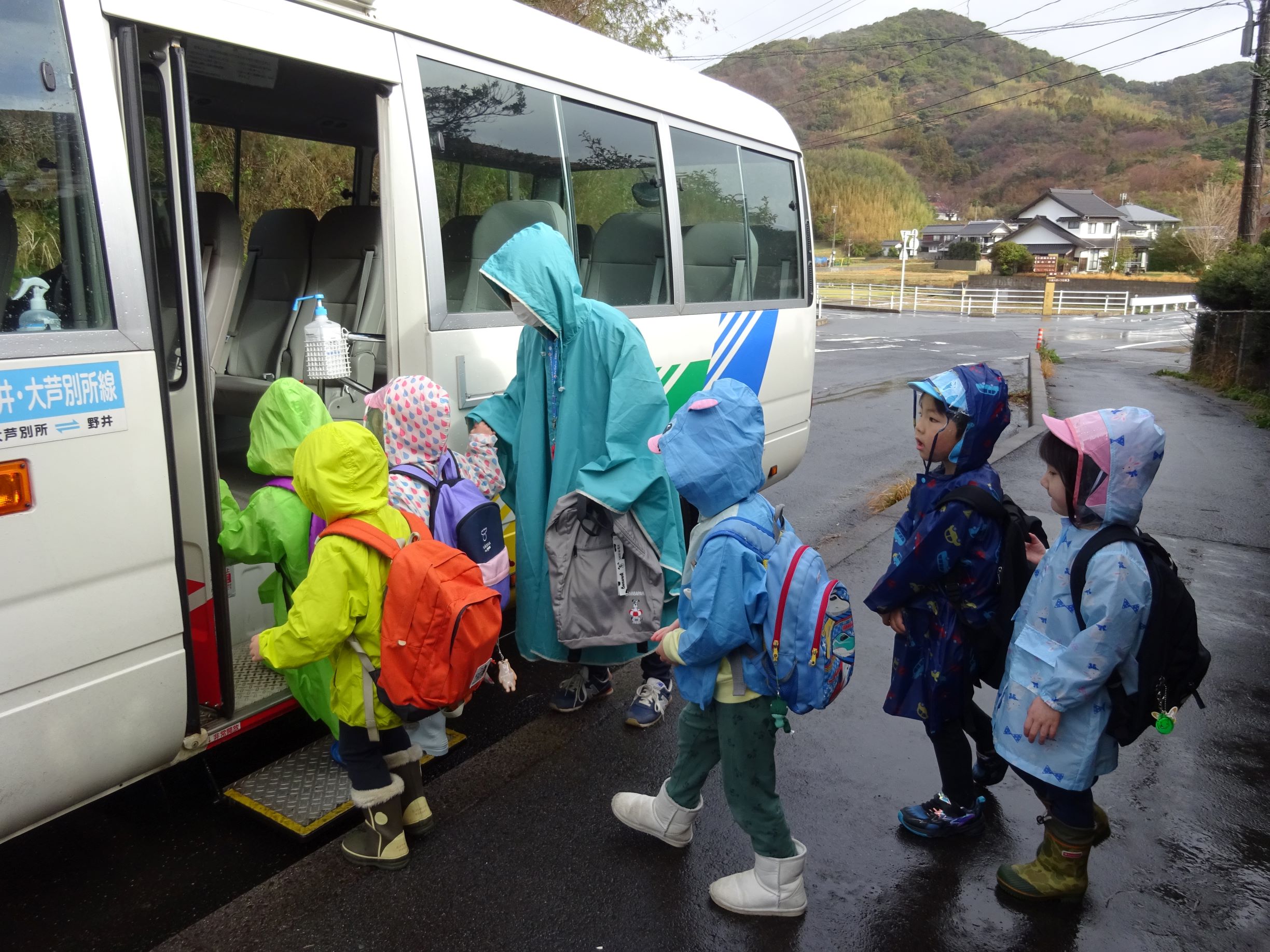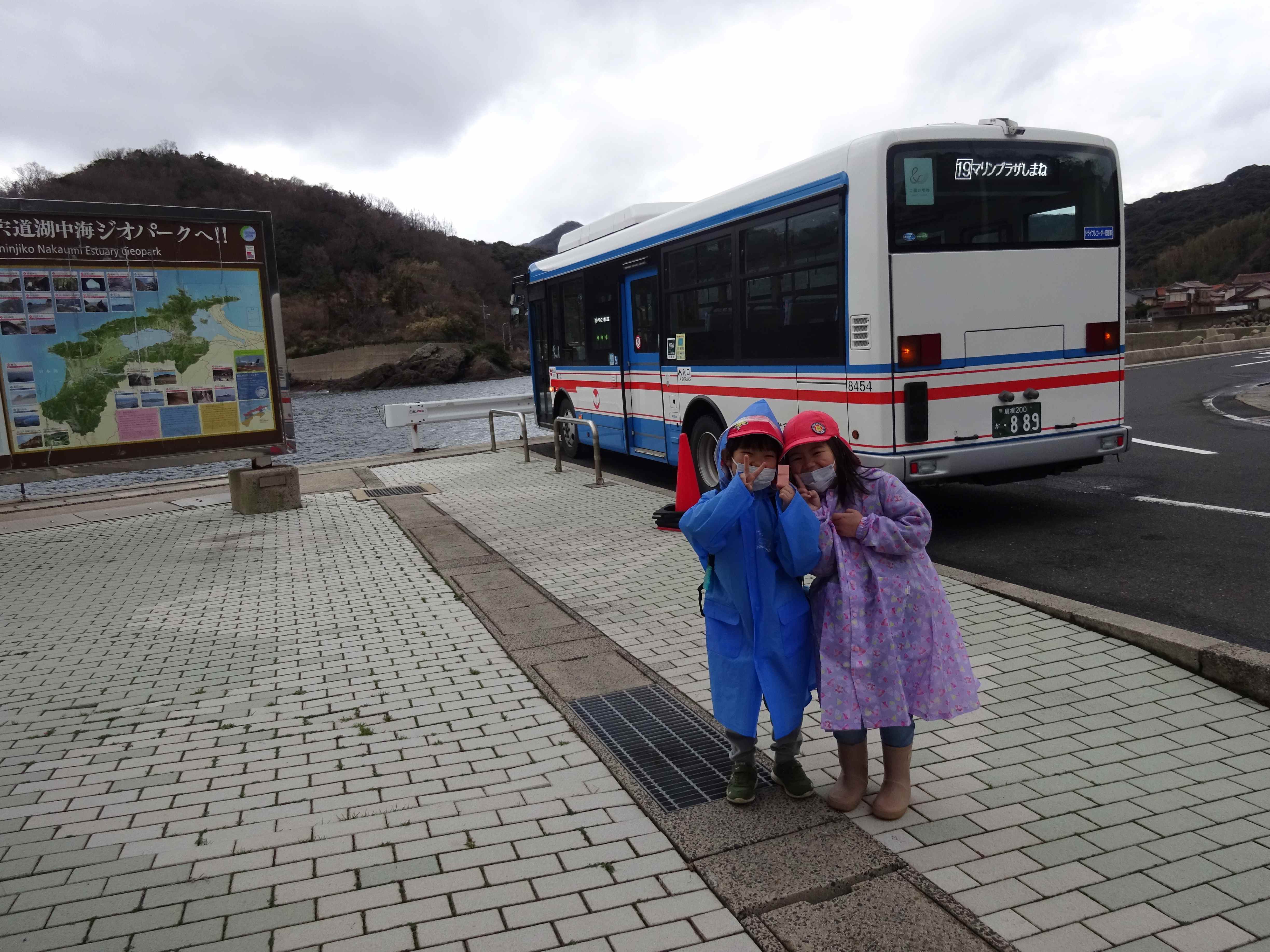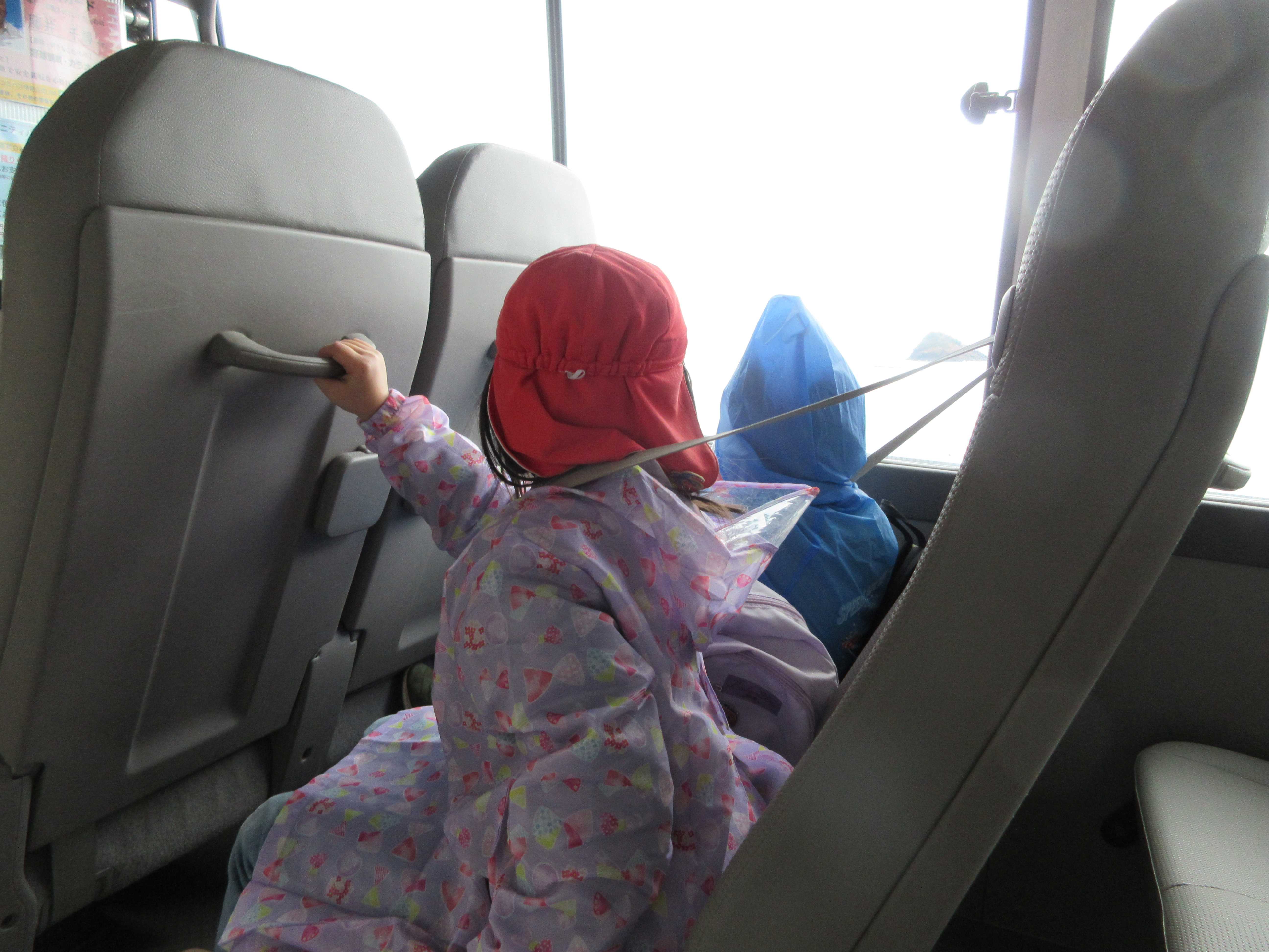 バスで向かいます。「あっ、とりがとんでる」「むこうにふねがみえるー」