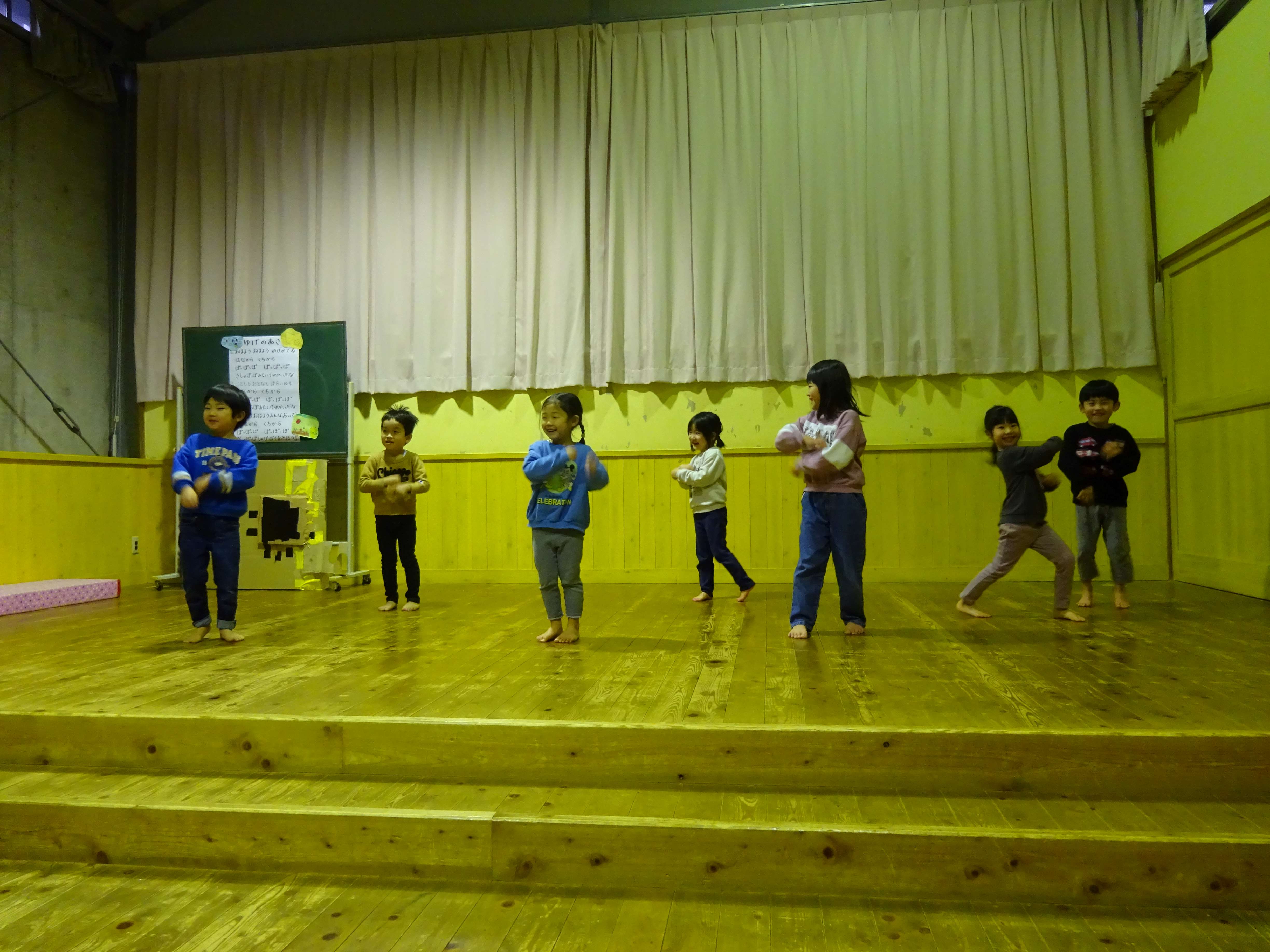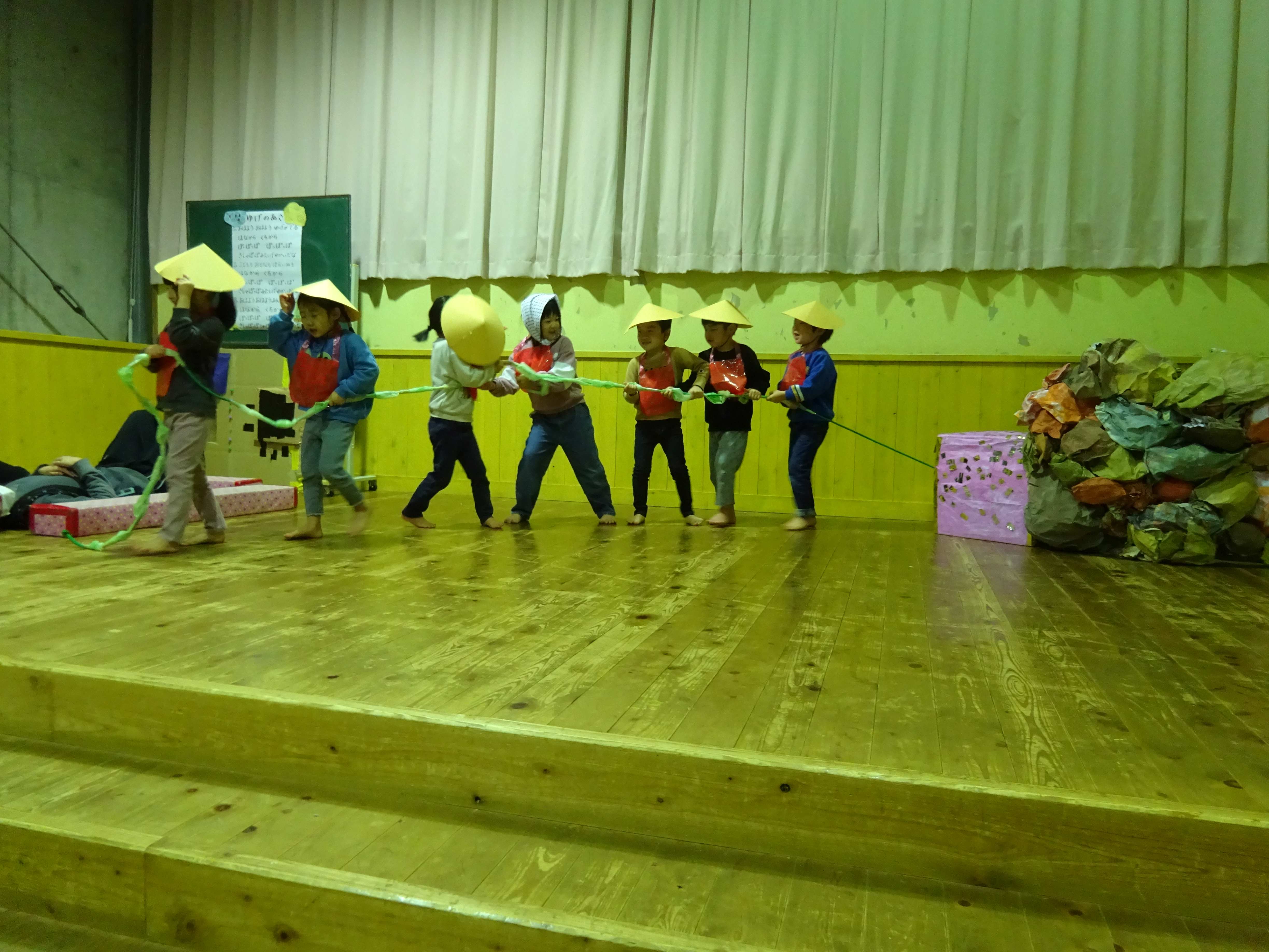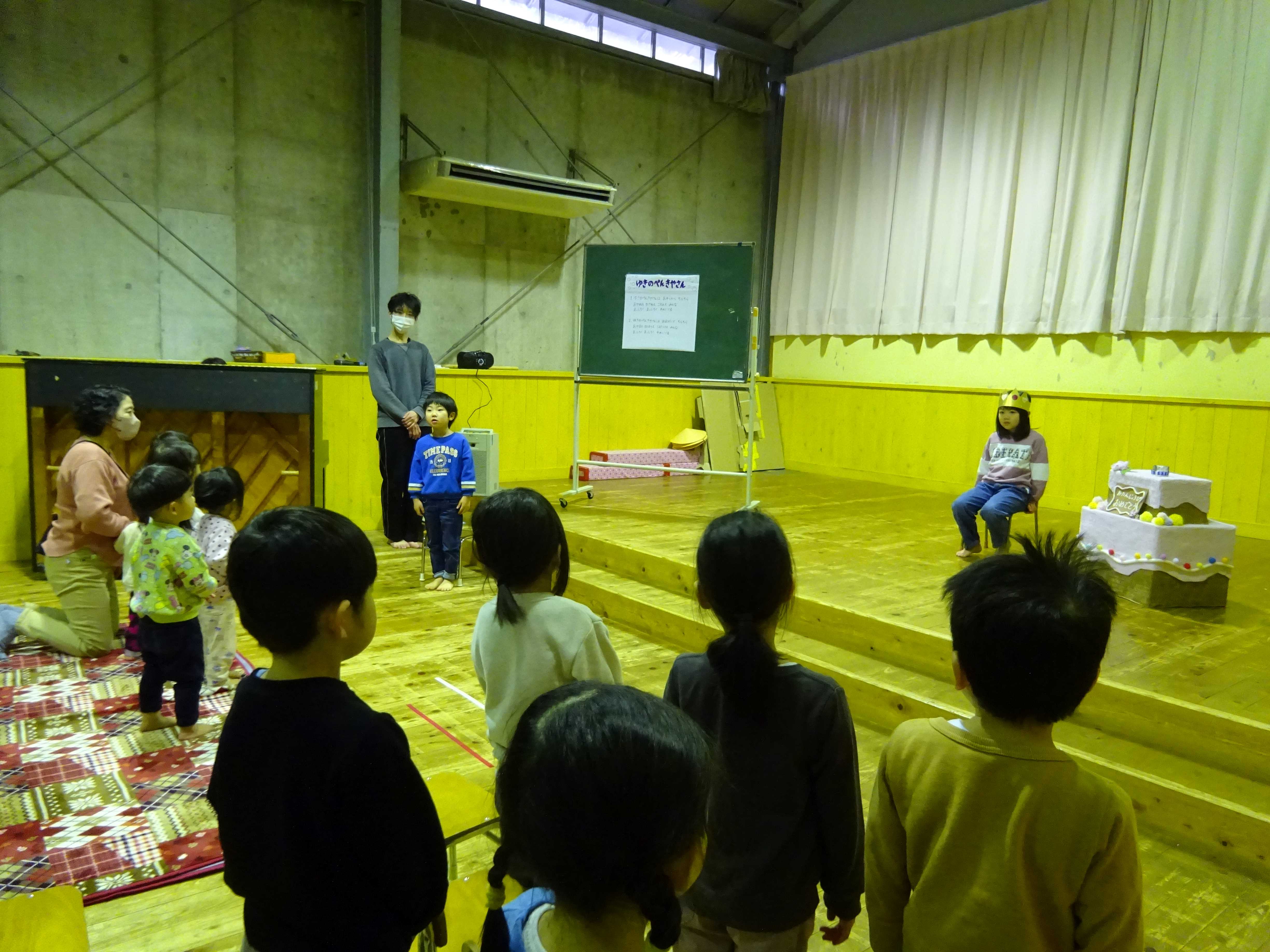 お楽しみ会では、幼児組がお地蔵さんになって登場した「かさじそう」の劇や、皆で踊りを踊って楽しみました。
