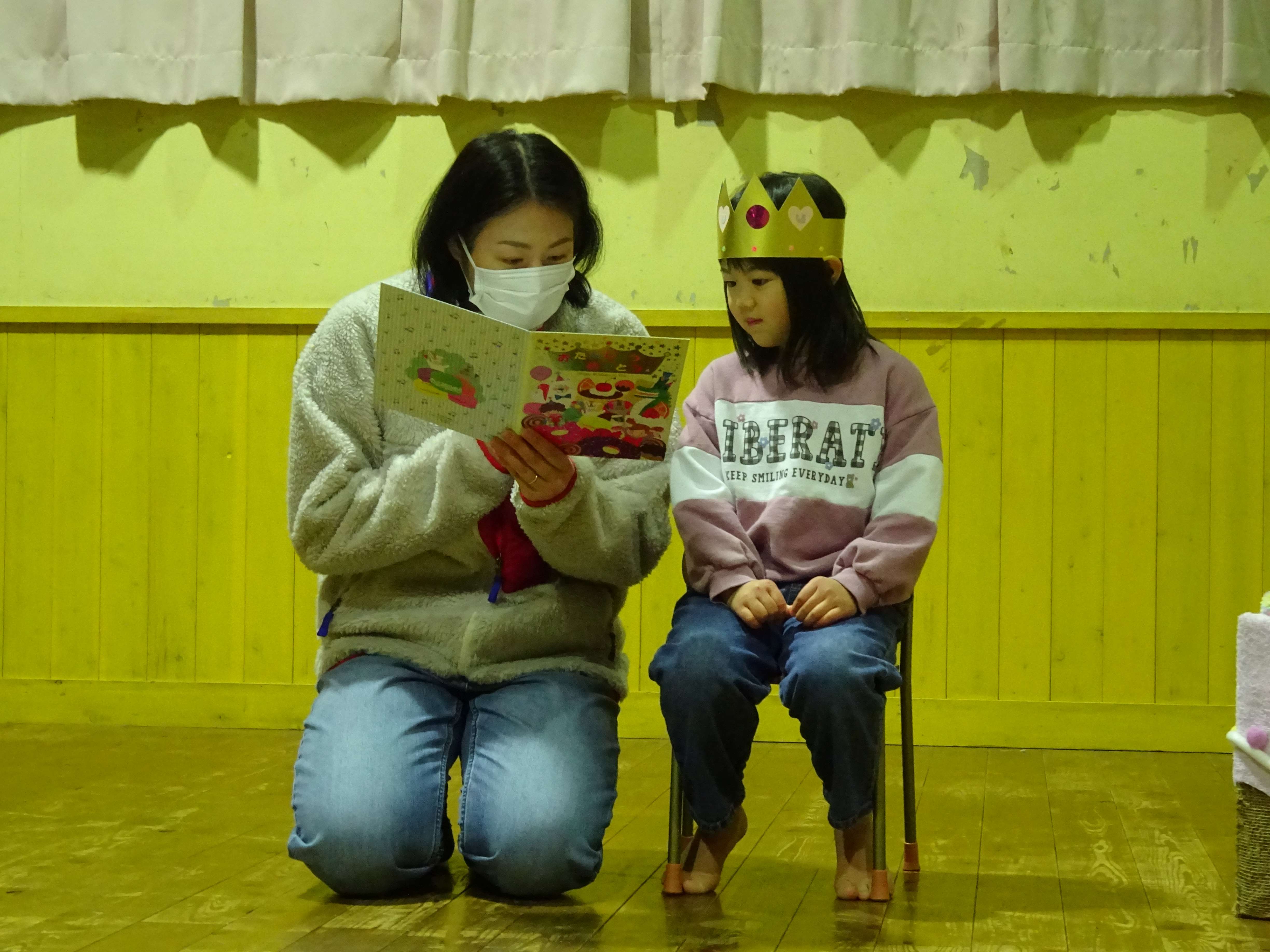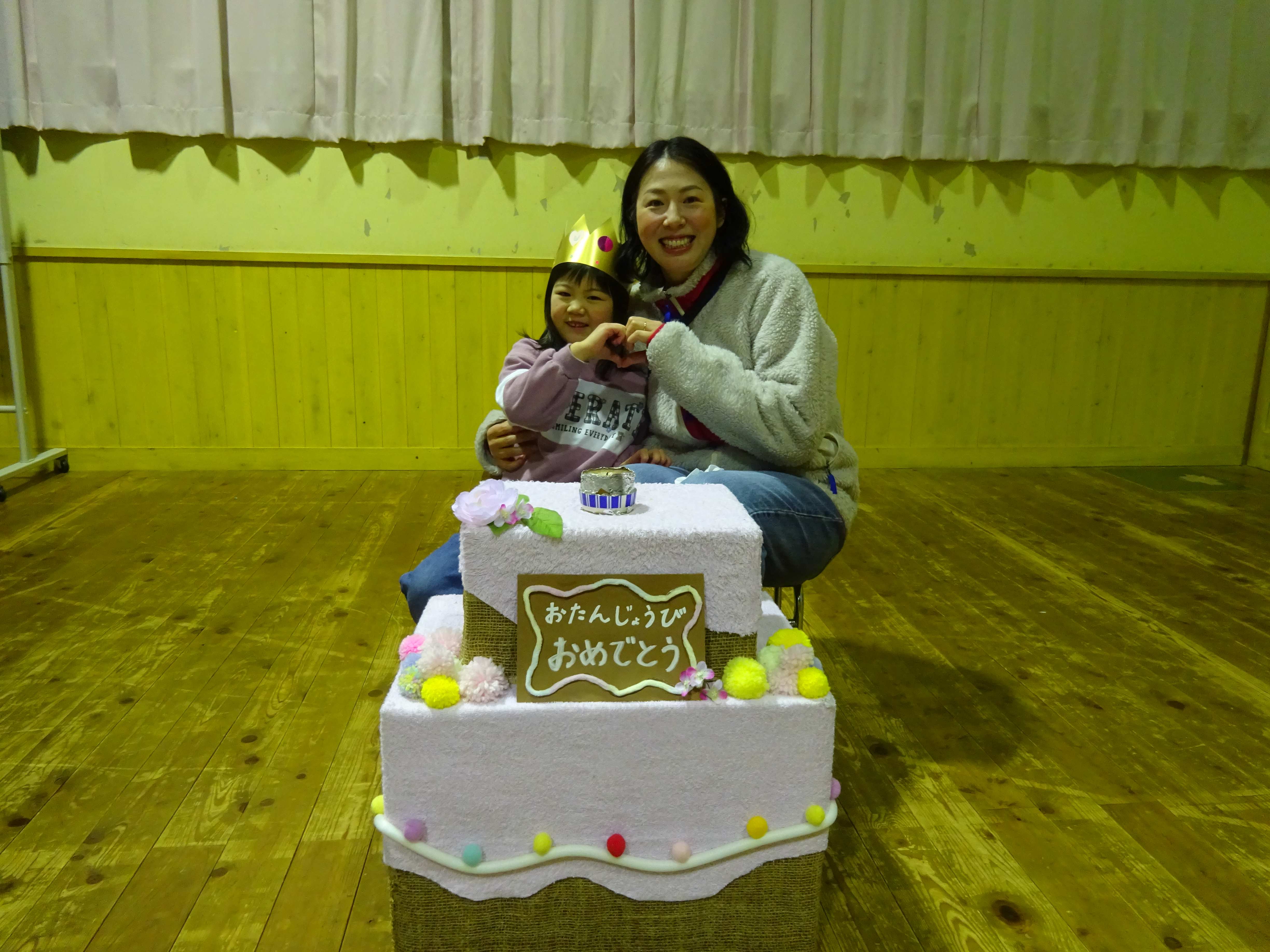 お母さんを招いて、誕生児さんを皆でお祝いしました。今月の誕生児さんは、いよいよ保育所最後の誕生会でした。2月に入ってから「まだこないかなー」と今日の日を楽しみにしていました。司会の友達に冠を被せてもらい、お母さんからメッセージや名前の由来を言ってもらったり、皆から歌のプレゼントをしてもらったりし、少し恥ずかしそうでしたが、とても嬉しそうでした。
