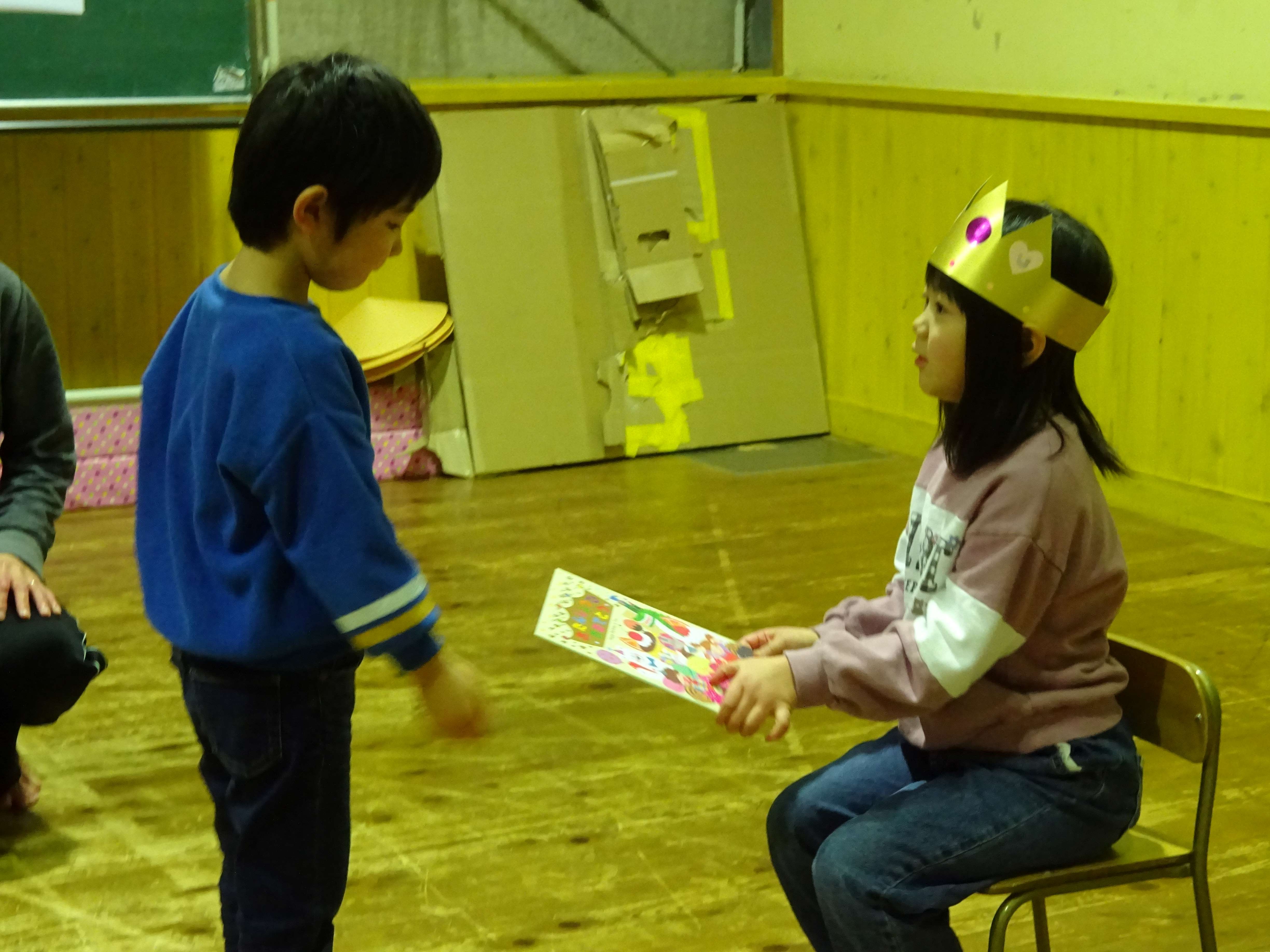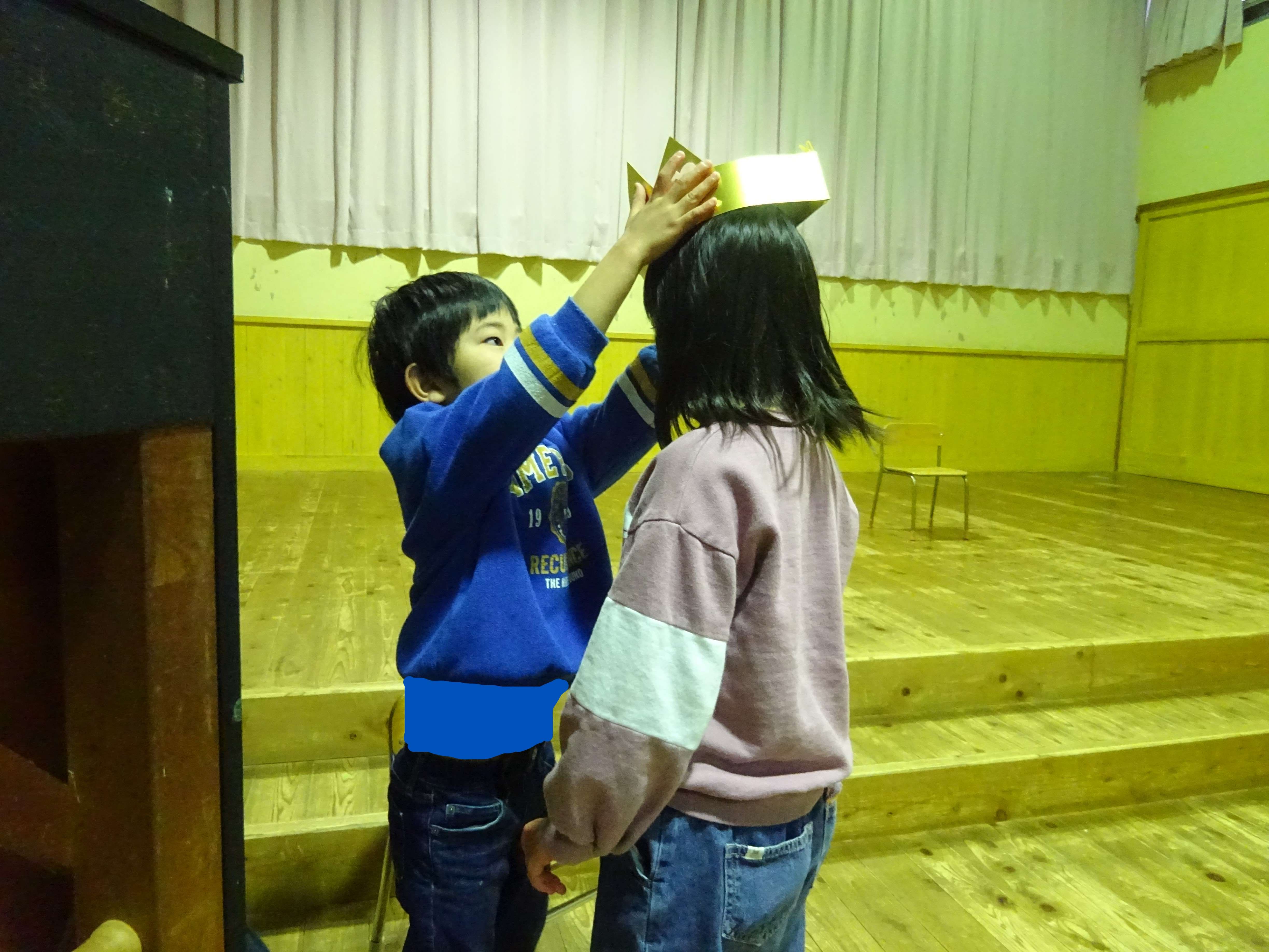 誕生児の友達に、冠を被せます。